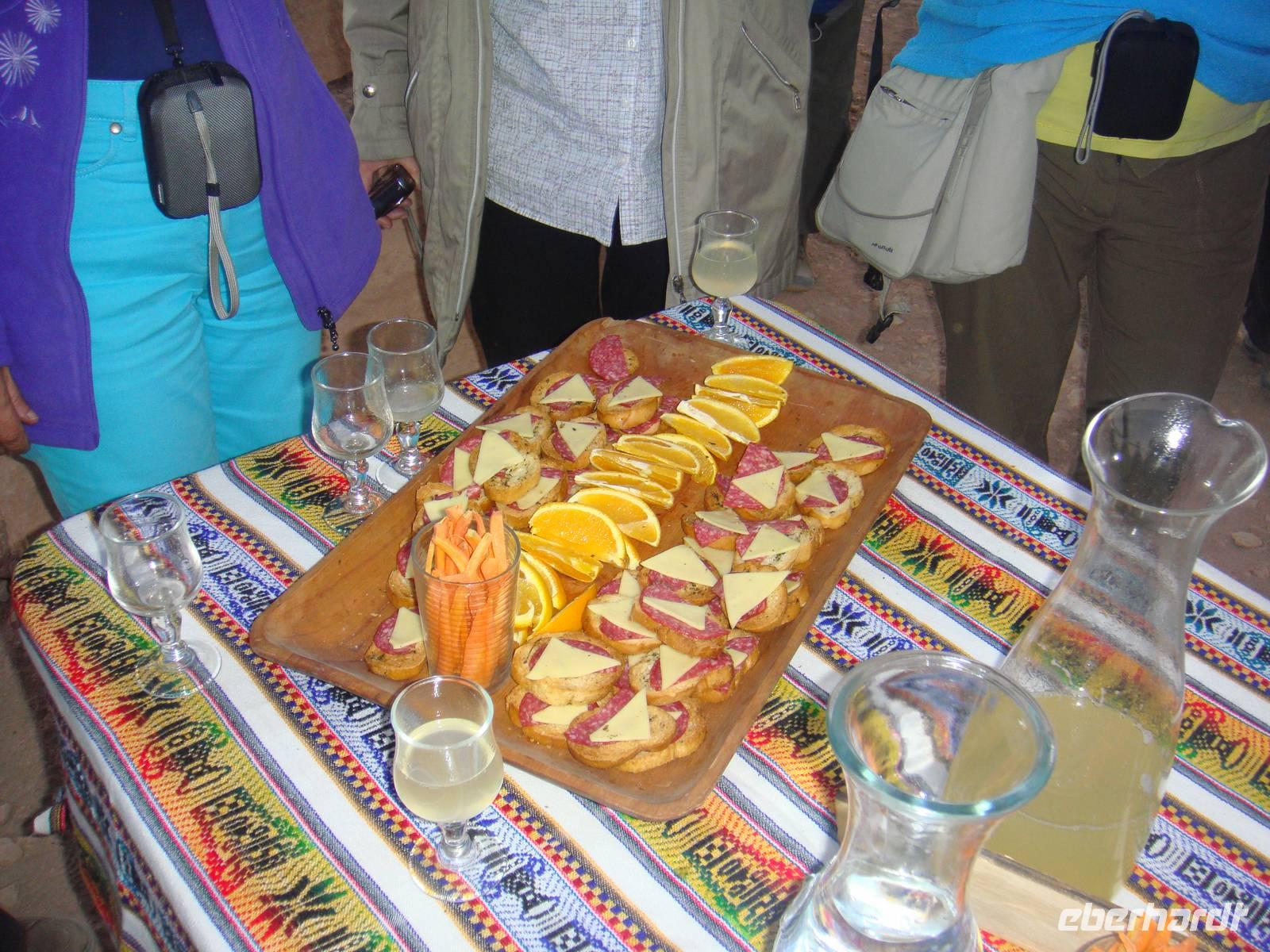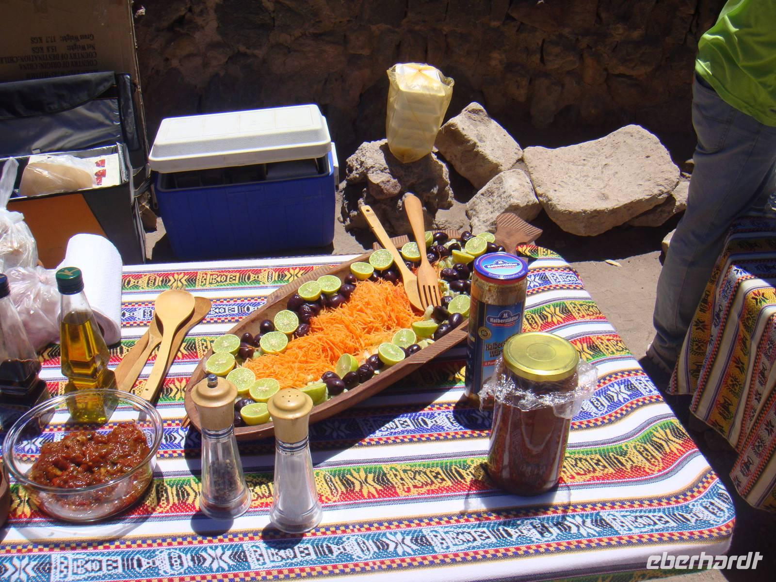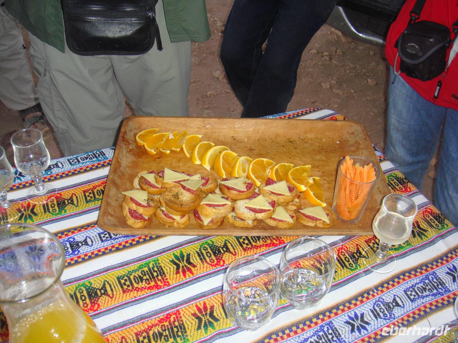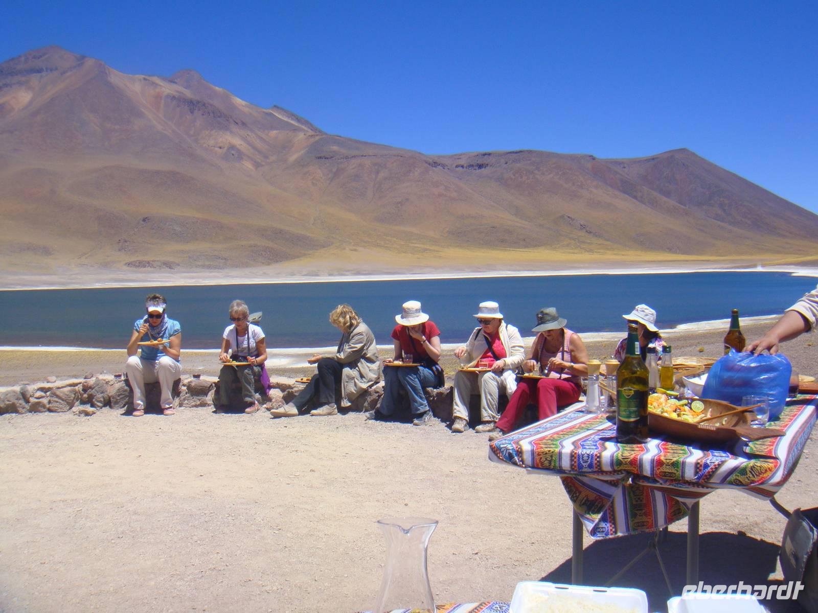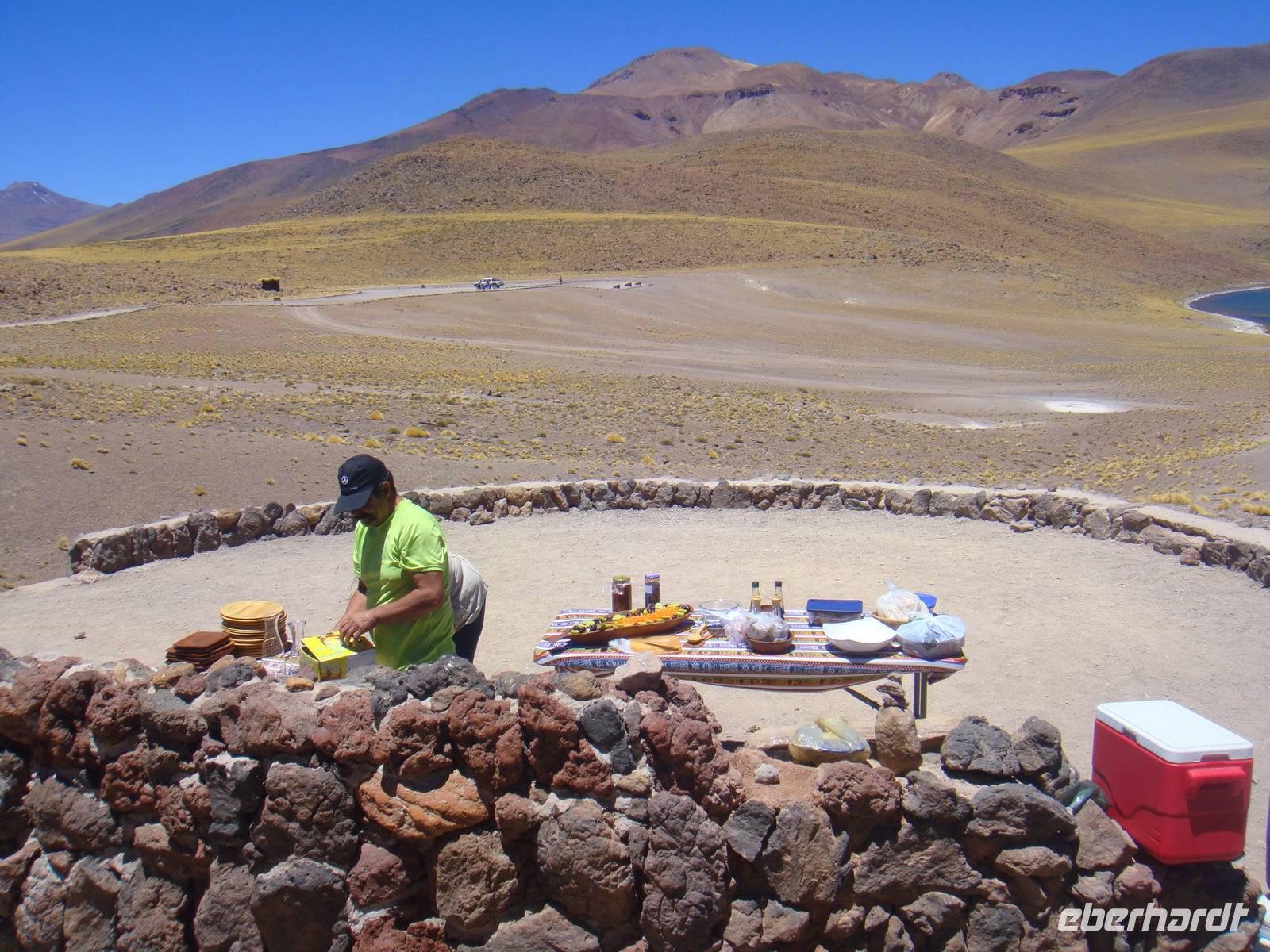 Mit Kuchen, Kaffee, Tee, leckeren Broten und dem Frühstücksei wärmt uns jetzt nicht mehr nur die aufgehende Sonne. Wir nehmen Abschied und fahren weiter zu „Puritama Thermalbädern".