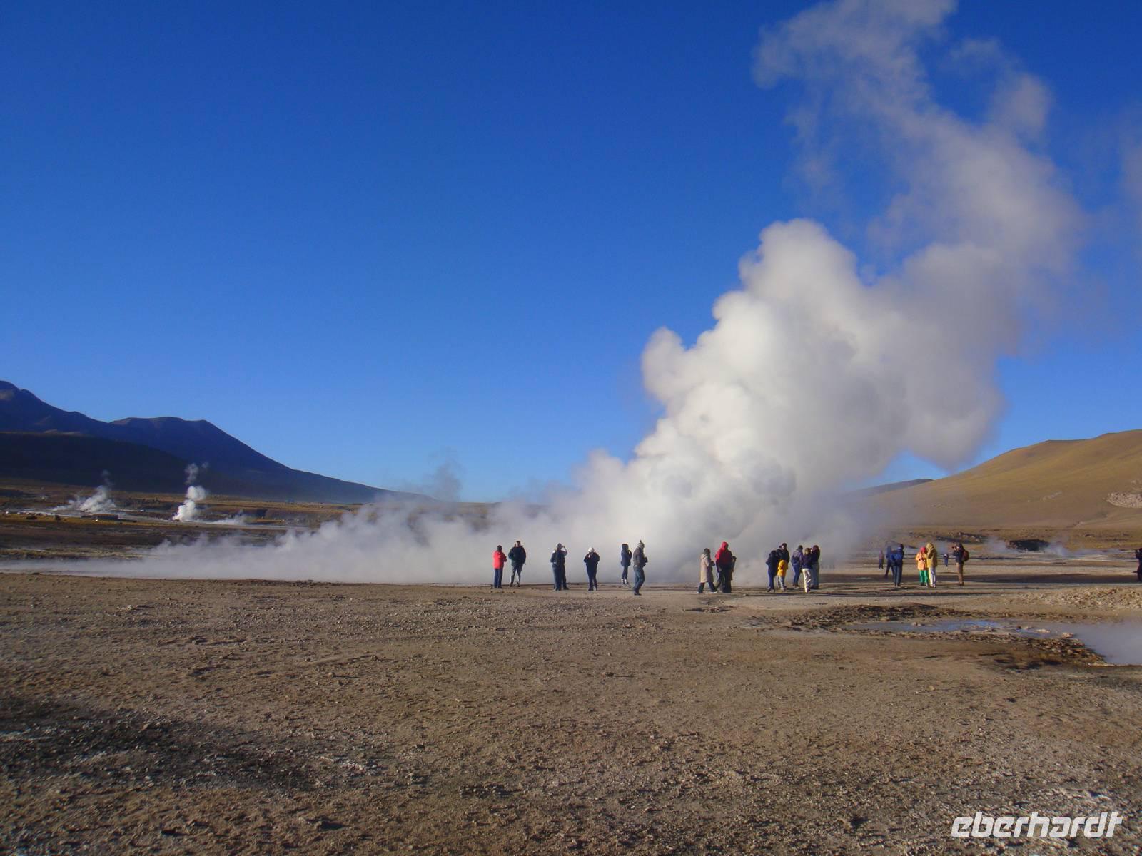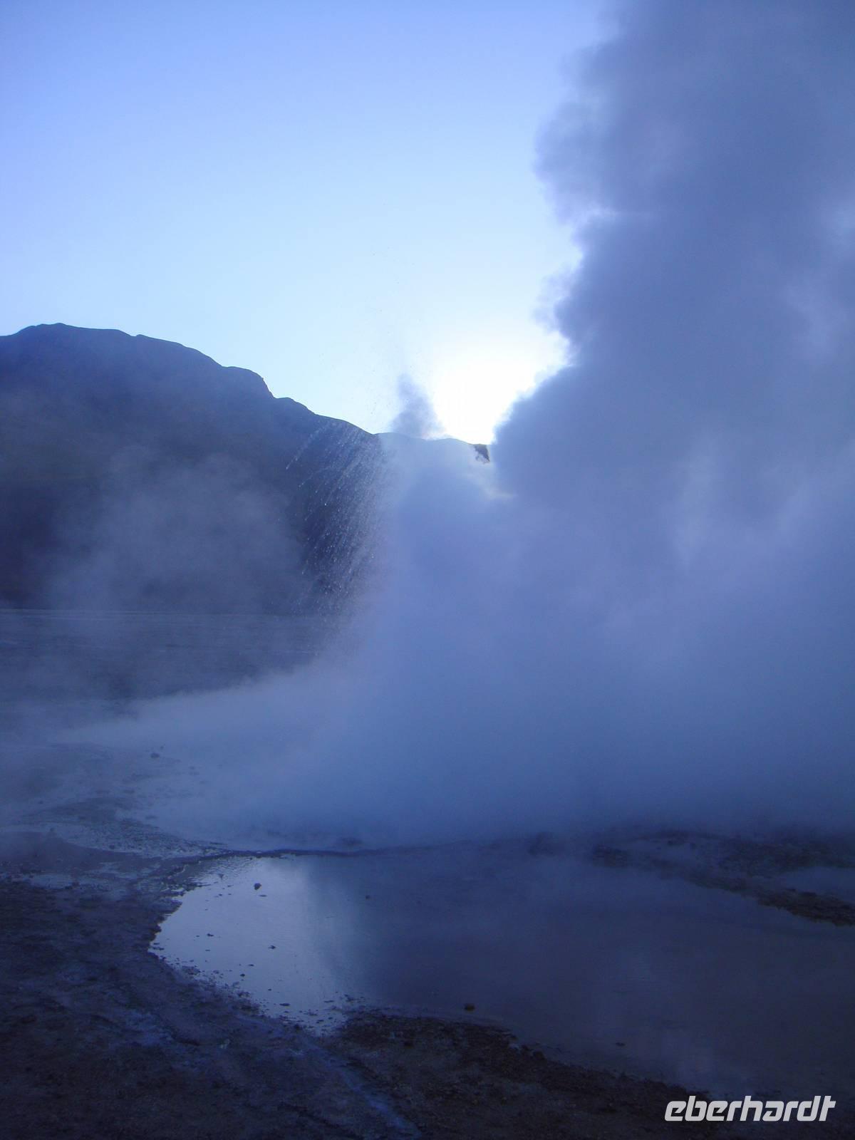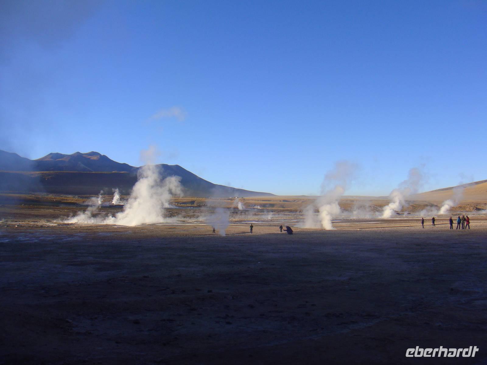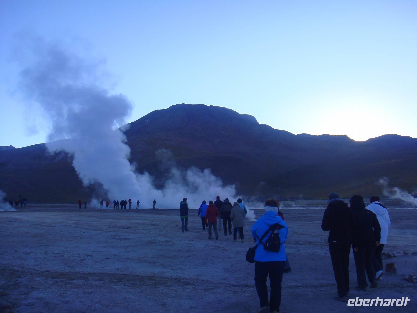 Der Himmel ist sternenklar und dies nutzt Bhavito um uns bei einem kleinen Stopp nochmals einige Sterne zu zeigen. Spannend...Wir steigen wieder in den warmen Bus und erreichen über einige Schotterstraßen und Buckelpisten zum Sonnenaufgang jedoch bei ca. - 3 Grad das Geysir Gebiet „EL Tatio". Durch unseren Zwiebellook sind wir gut vorbereitet und die Kälte macht uns nichts aus.
