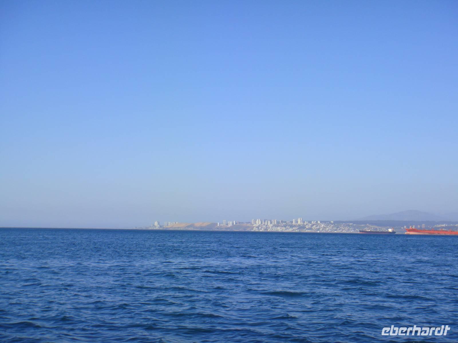 Mit etwas Verspätung starten wir zurück nach Santiago de Chile um dort weiter nach Valparaíso zu fahren. Ein sehr freundlicher Fahrer mit einem wirklich luxuriösen Bus holt uns ab und schon geht es los. Durch die Verspätung unseres Fluges haben wir im Hotel nur eine kurze Verschnaufpause, bevor es zum Stadtrundgang durch Valparaíso geht. Zu Beginn spendiert Astrid eine Hafenrundfahrt. Bei diesem wieder wolkenlosem Himmel ein gute Idee. Und so schippern wir mit der Santa Maria entlang des Hafens von Valparaíso.
