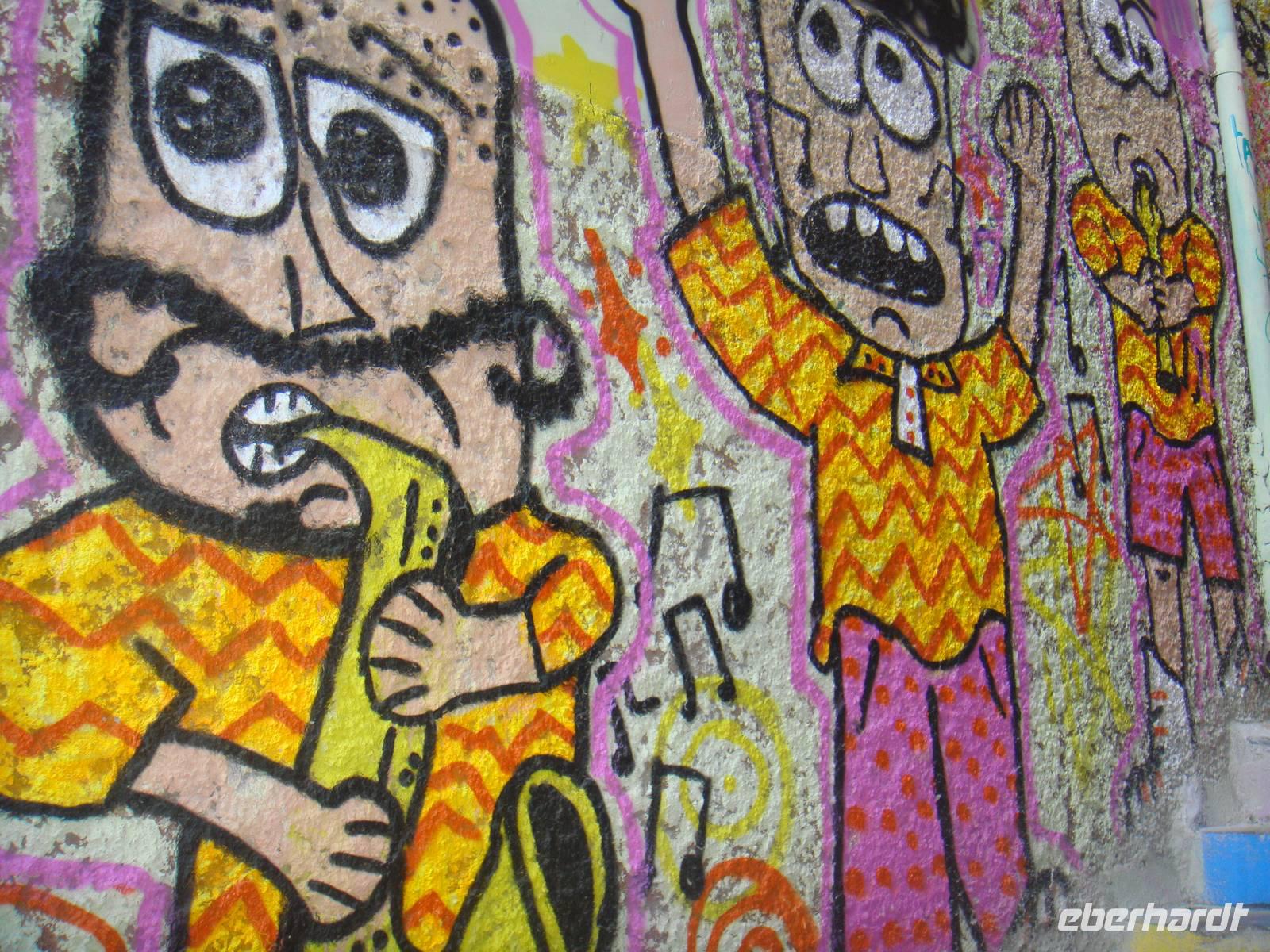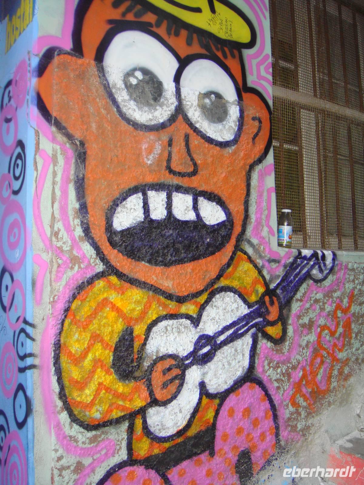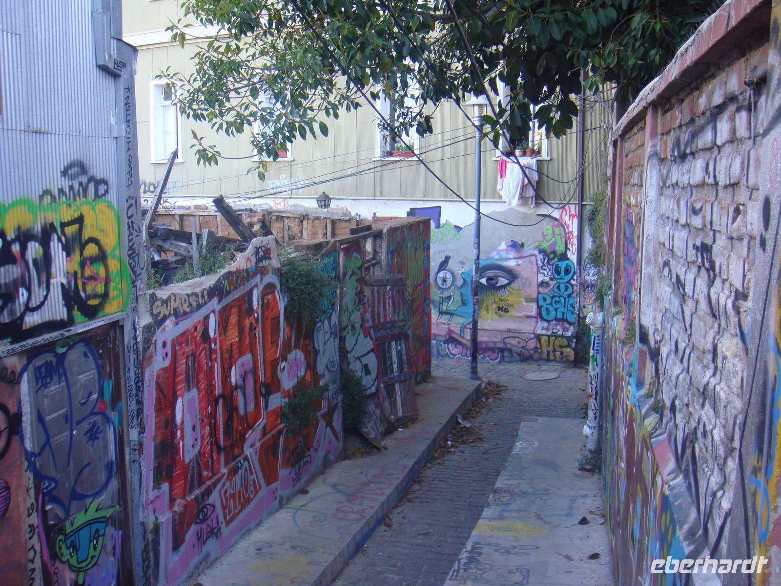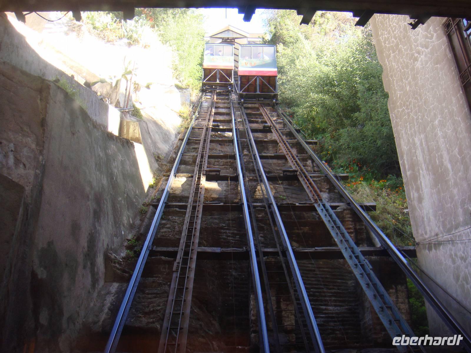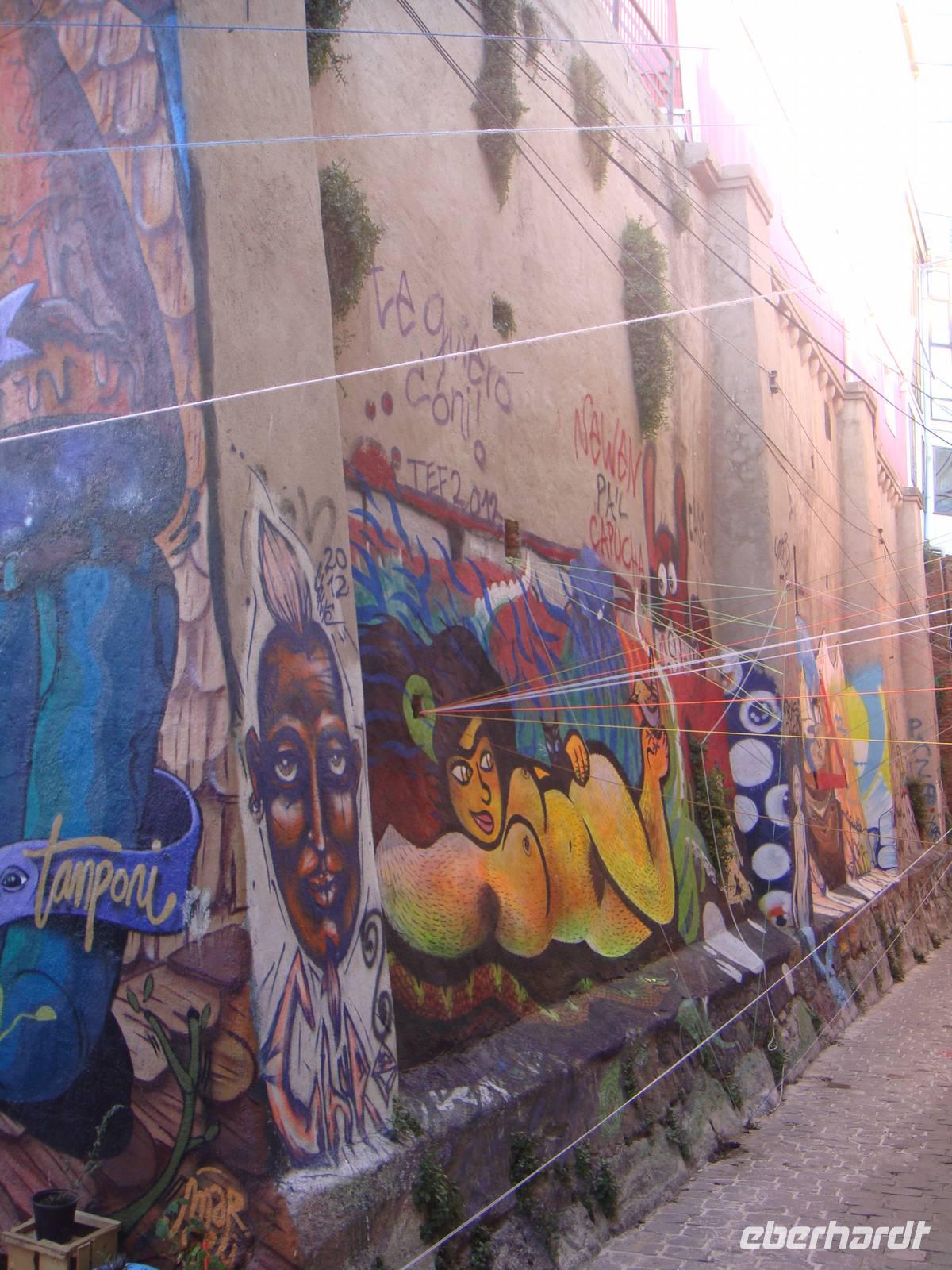 Wieder an Land setzten wir unseren Rundgang per Fuß fort. Natürlich fahren wir auch mit einem dieser kleinen Aufzüge auf einen der kleinen Hügel dieser Stadt. Dort setzten wir unseren Rundgang fort. Überall Graffitis , bunte Häuser und bunt bemalte Treppen.