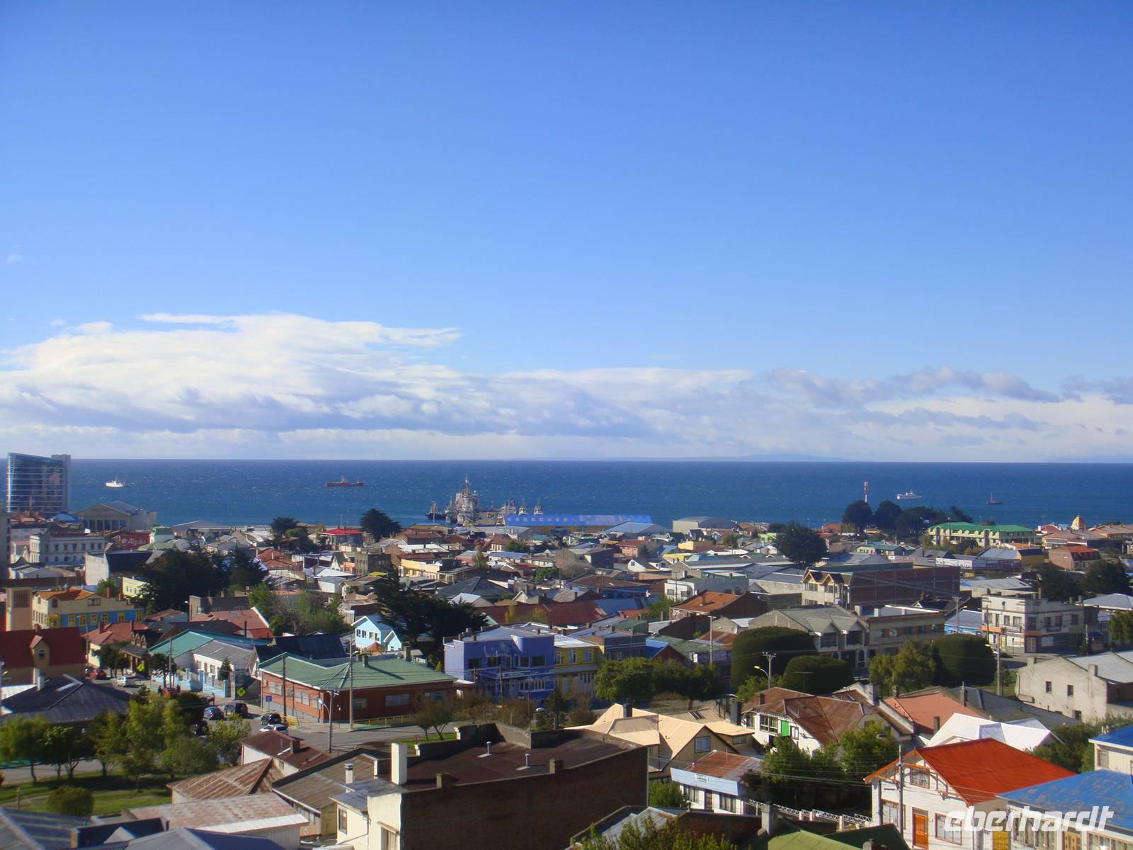 Wir starten mit einer kleinen Stadtrundfahrt durch Punta Arenas. Bei einem ersten Fotostopp am Aussichtspunkt Cerro La Luz haben wir einen tollen Blick Magellanstraße und Feuerland dahinter. Eric erklärt noch einige interessante Dinge über Punta Arenas und seine Bewohner.