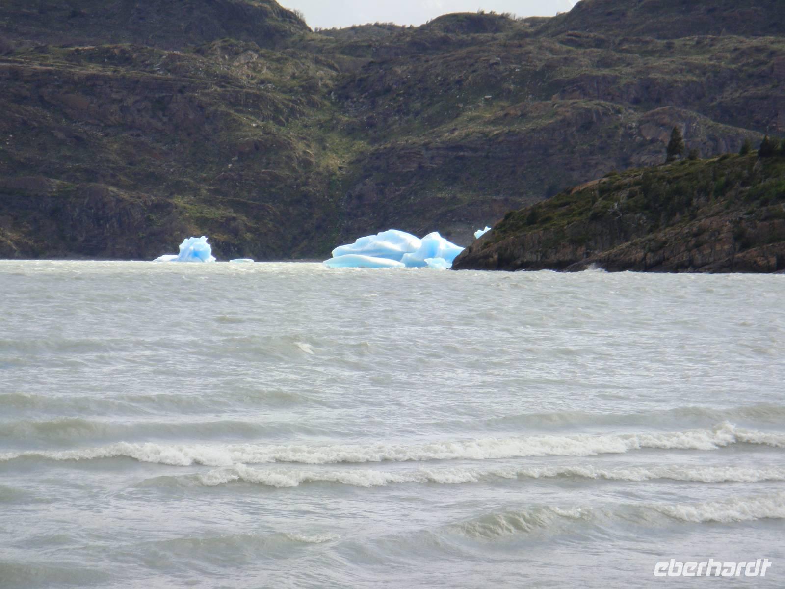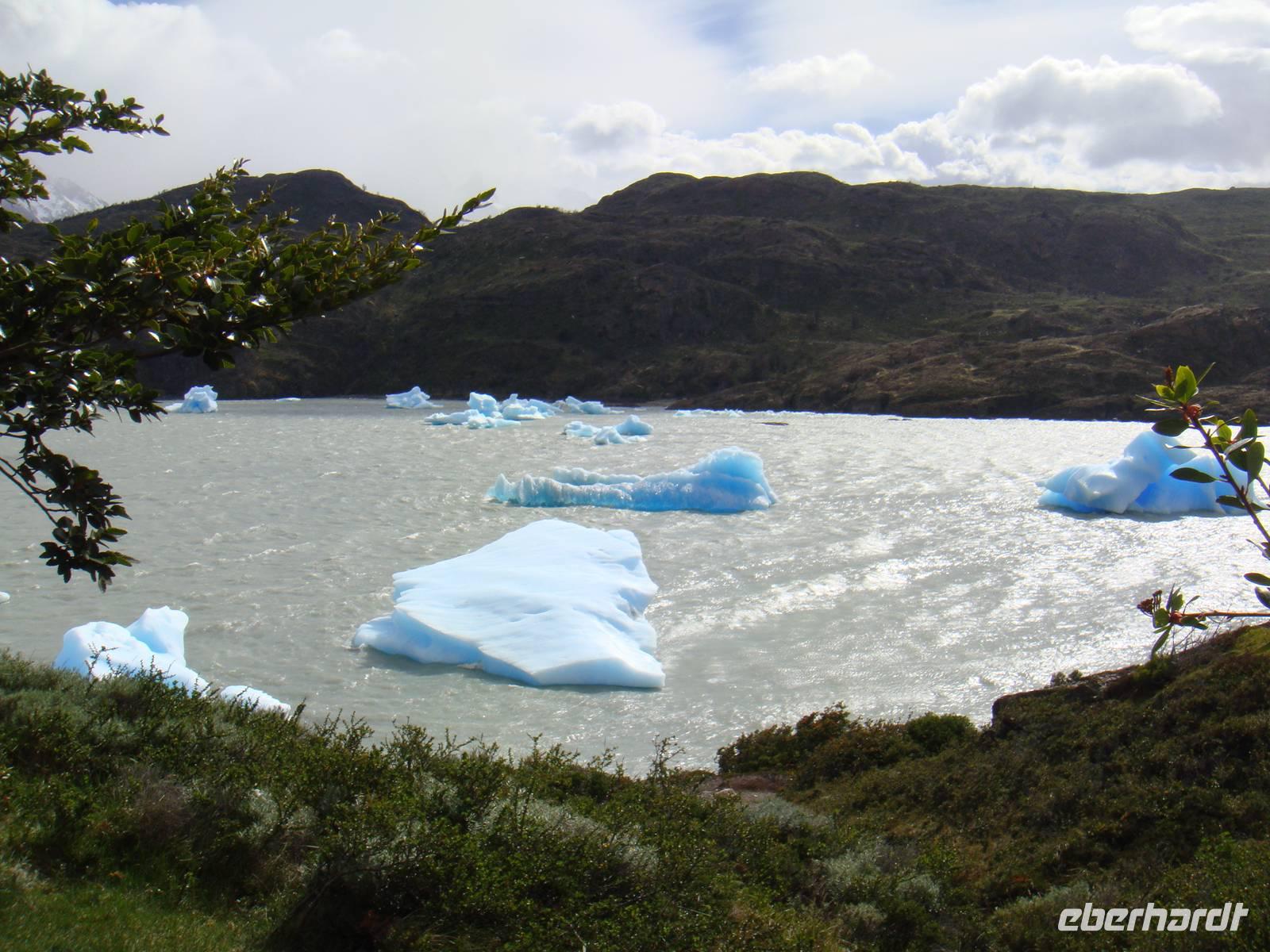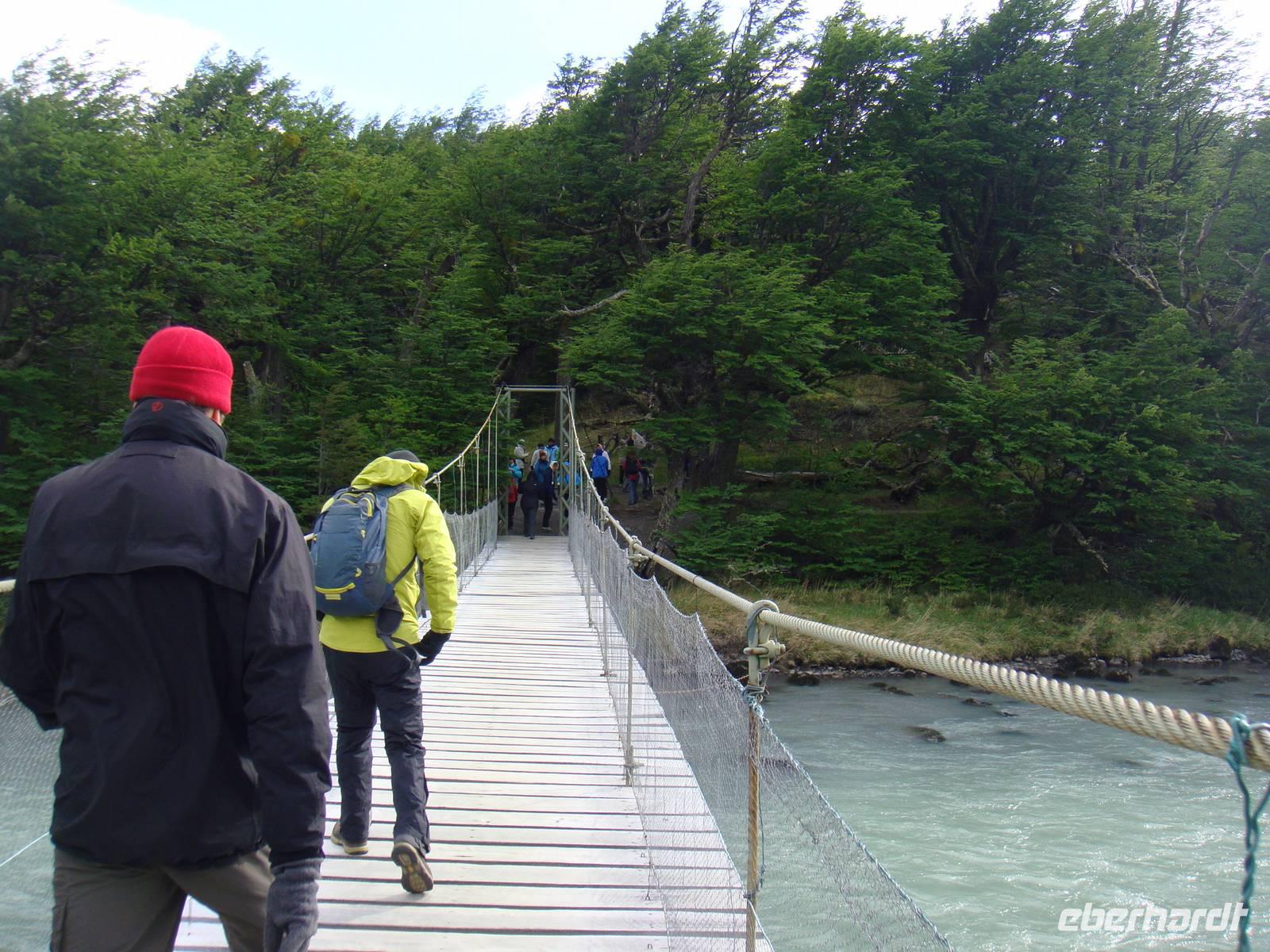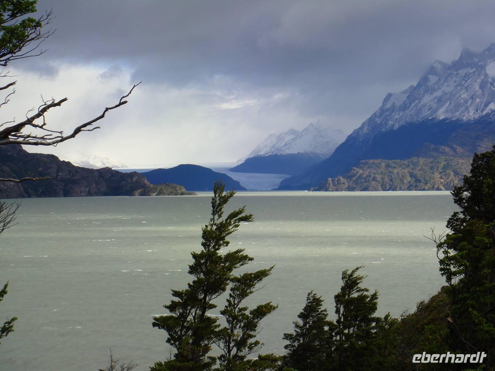 Ausgeruht und gestärkt begeben wir uns nach kurzer Fahrt auf unsere erste Wanderung am Lago Grey. Wir halten mehrere Male an, um Fotos von der beeindruckenden Landschaft um uns herum zu machen. Natürlich beschenkte uns der Wettergott wieder nur mit bestem Wetter. Unser Bus hält in der Nähe des Lago Grey und wir gehen los. Wir überqueren eine schwankende Brücke aus Holzplanken. Nach einem kurzen Weg durch einen Wald sehen wir das Ufer des Lago Grey. Auch dem milchig grauen Wasser schwimmen erste Eisberge, die uns in strahlendem Hellblau sofort ins Auge fallen. Wir machen Schnappschüsse und kämpfen gegen den Wind weiter entlang des Ufers. Am Rand einer Felsformation führt uns der Weg zur Aussichtsplattform von der wir nur wenige Minuten später einen traumhaften Blick auf den Grey Gletscher haben. Wir genießen den Moment und begeben uns auf den Rückweg und kämpfen wieder mit dem kräftigen Wind. Etwas geschafft aber froh über dieses Naturerlebnis kehren wir zum Bus zurück.