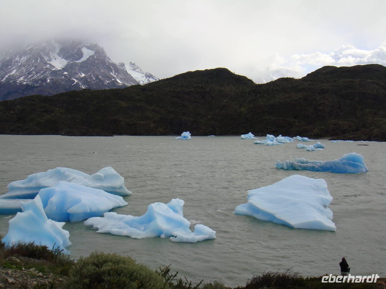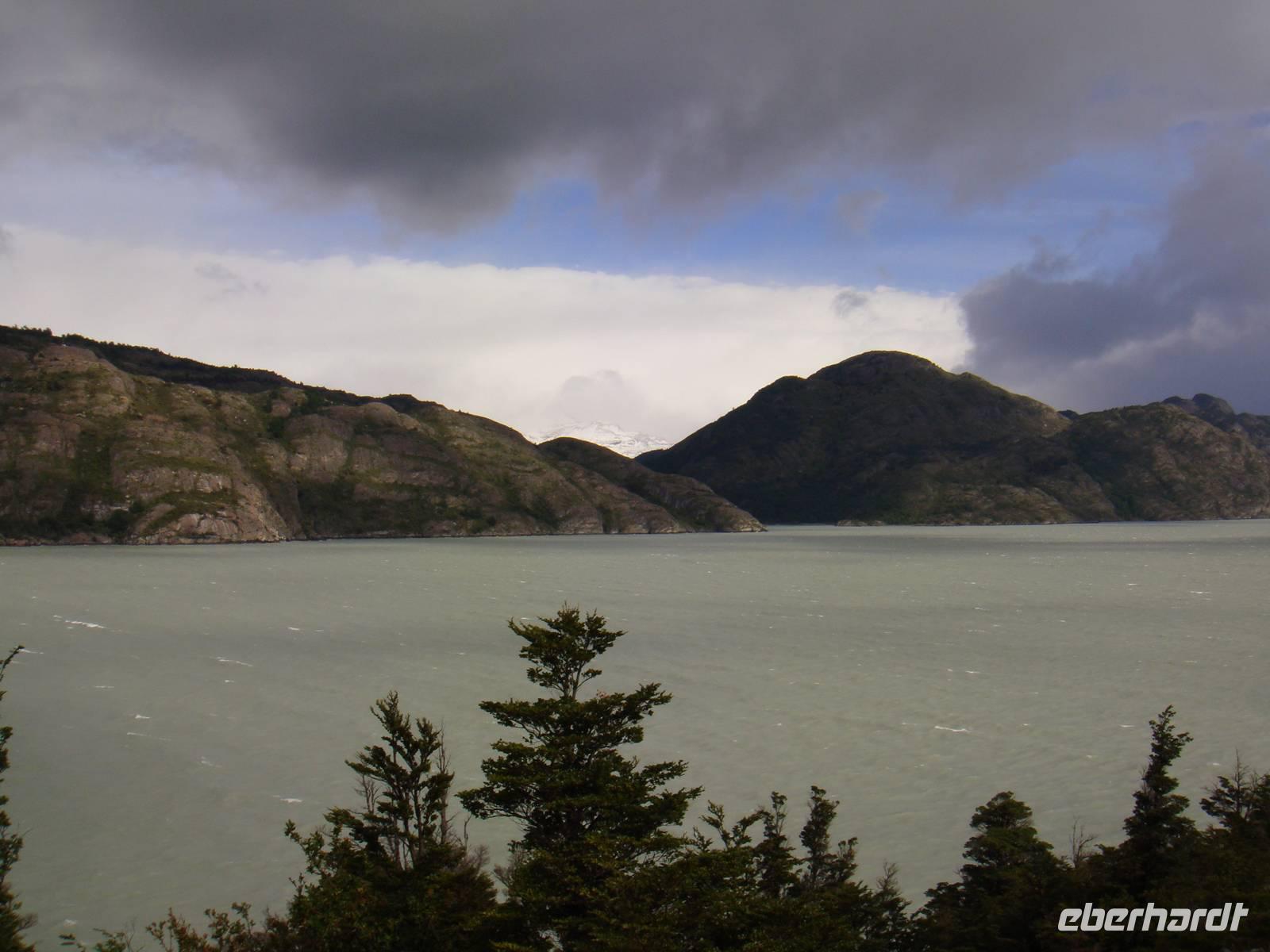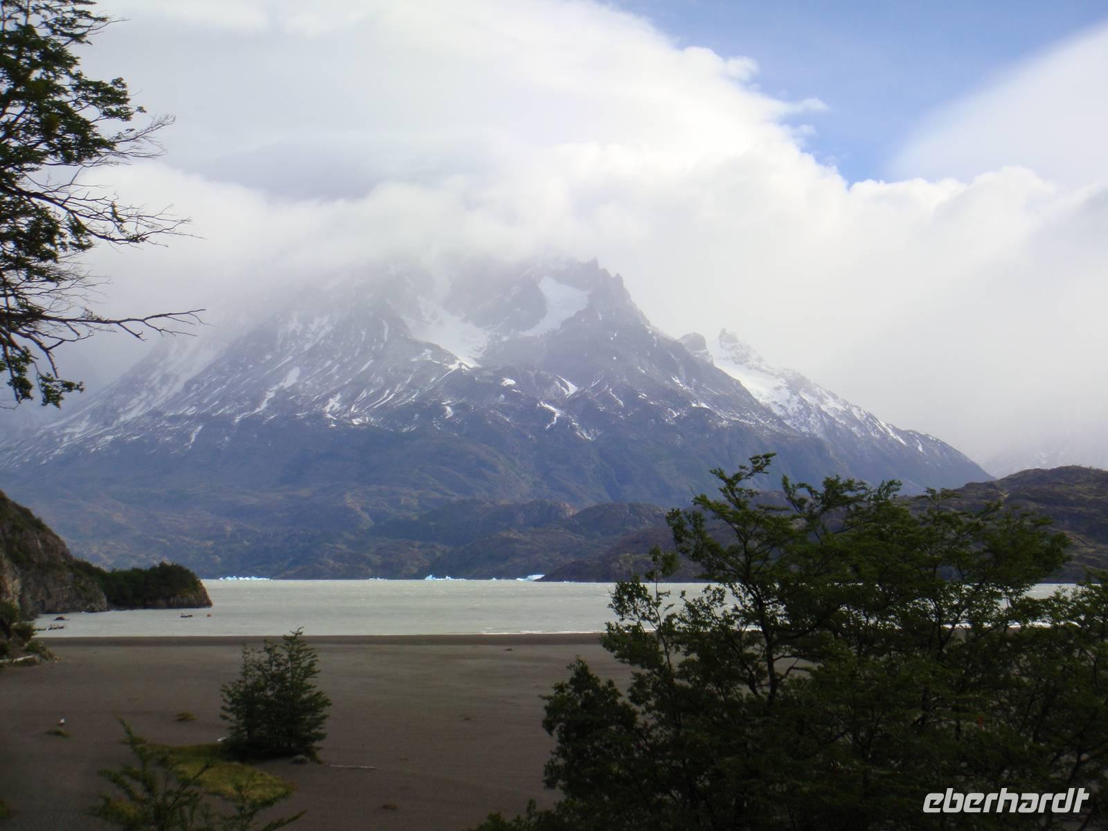 Ausgeruht und gestärkt begeben wir uns nach kurzer Fahrt auf unsere erste Wanderung am Lago Grey. Wir halten mehrere Male an, um Fotos von der beeindruckenden Landschaft um uns herum zu machen. Natürlich beschenkte uns der Wettergott wieder nur mit bestem Wetter. Unser Bus hält in der Nähe des Lago Grey und wir gehen los. Wir überqueren eine schwankende Brücke aus Holzplanken. Nach einem kurzen Weg durch einen Wald sehen wir das Ufer des Lago Grey. Auch dem milchig grauen Wasser schwimmen erste Eisberge, die uns in strahlendem Hellblau sofort ins Auge fallen. Wir machen Schnappschüsse und kämpfen gegen den Wind weiter entlang des Ufers. Am Rand einer Felsformation führt uns der Weg zur Aussichtsplattform von der wir nur wenige Minuten später einen traumhaften Blick auf den Grey Gletscher haben. Wir genießen den Moment und begeben uns auf den Rückweg und kämpfen wieder mit dem kräftigen Wind. Etwas geschafft aber froh über dieses Naturerlebnis kehren wir zum Bus zurück.