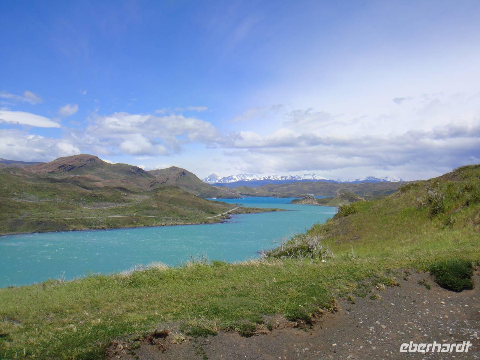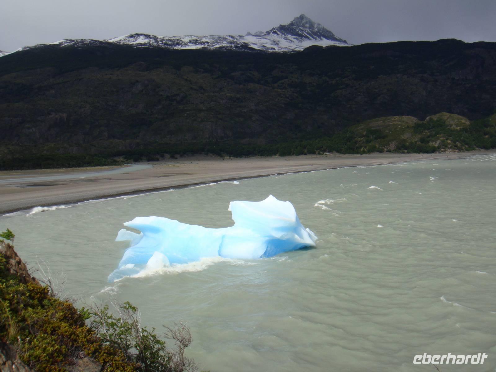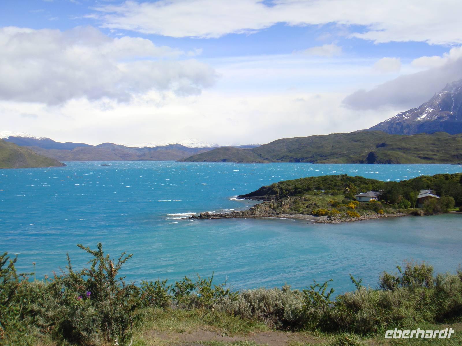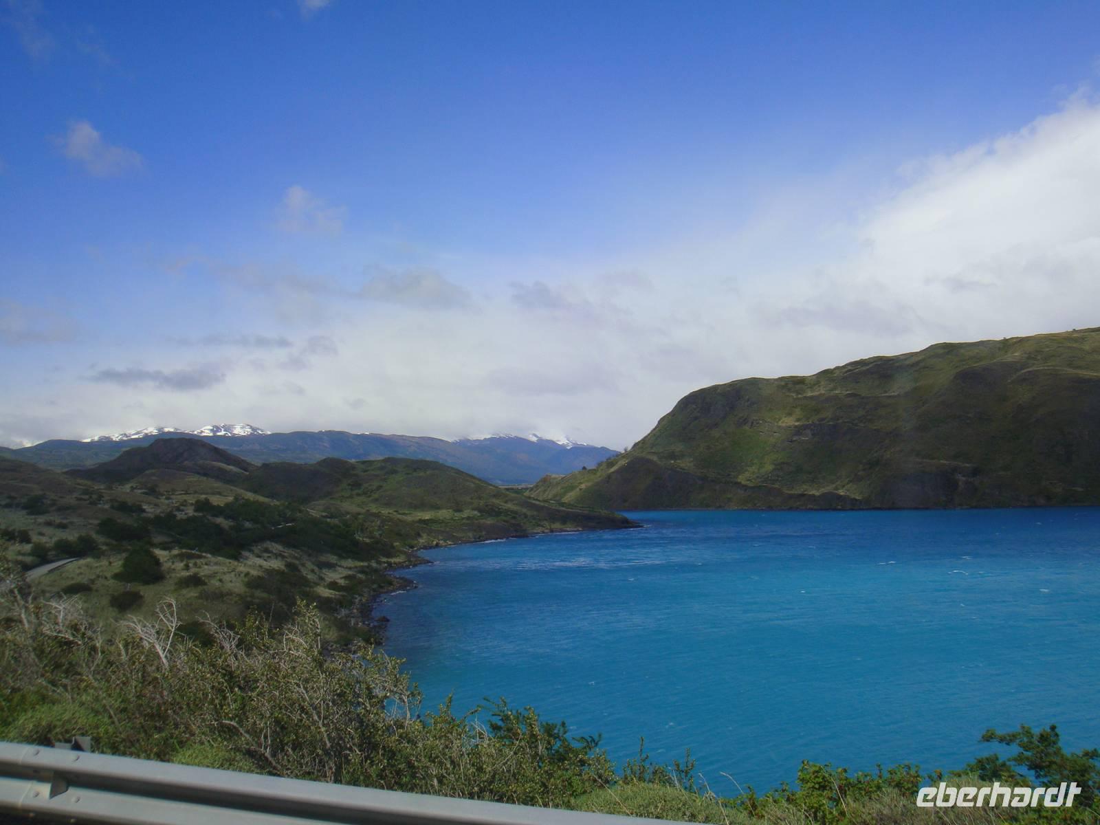 Ausgeruht und gestärkt begeben wir uns nach kurzer Fahrt auf unsere erste Wanderung am Lago Grey. Wir halten mehrere Male an, um Fotos von der beeindruckenden Landschaft um uns herum zu machen. Natürlich beschenkte uns der Wettergott wieder nur mit bestem Wetter. Unser Bus hält in der Nähe des Lago Grey und wir gehen los. Wir überqueren eine schwankende Brücke aus Holzplanken. Nach einem kurzen Weg durch einen Wald sehen wir das Ufer des Lago Grey. Auch dem milchig grauen Wasser schwimmen erste Eisberge, die uns in strahlendem Hellblau sofort ins Auge fallen. Wir machen Schnappschüsse und kämpfen gegen den Wind weiter entlang des Ufers. Am Rand einer Felsformation führt uns der Weg zur Aussichtsplattform von der wir nur wenige Minuten später einen traumhaften Blick auf den Grey Gletscher haben. Wir genießen den Moment und begeben uns auf den Rückweg und kämpfen wieder mit dem kräftigen Wind. Etwas geschafft aber froh über dieses Naturerlebnis kehren wir zum Bus zurück.