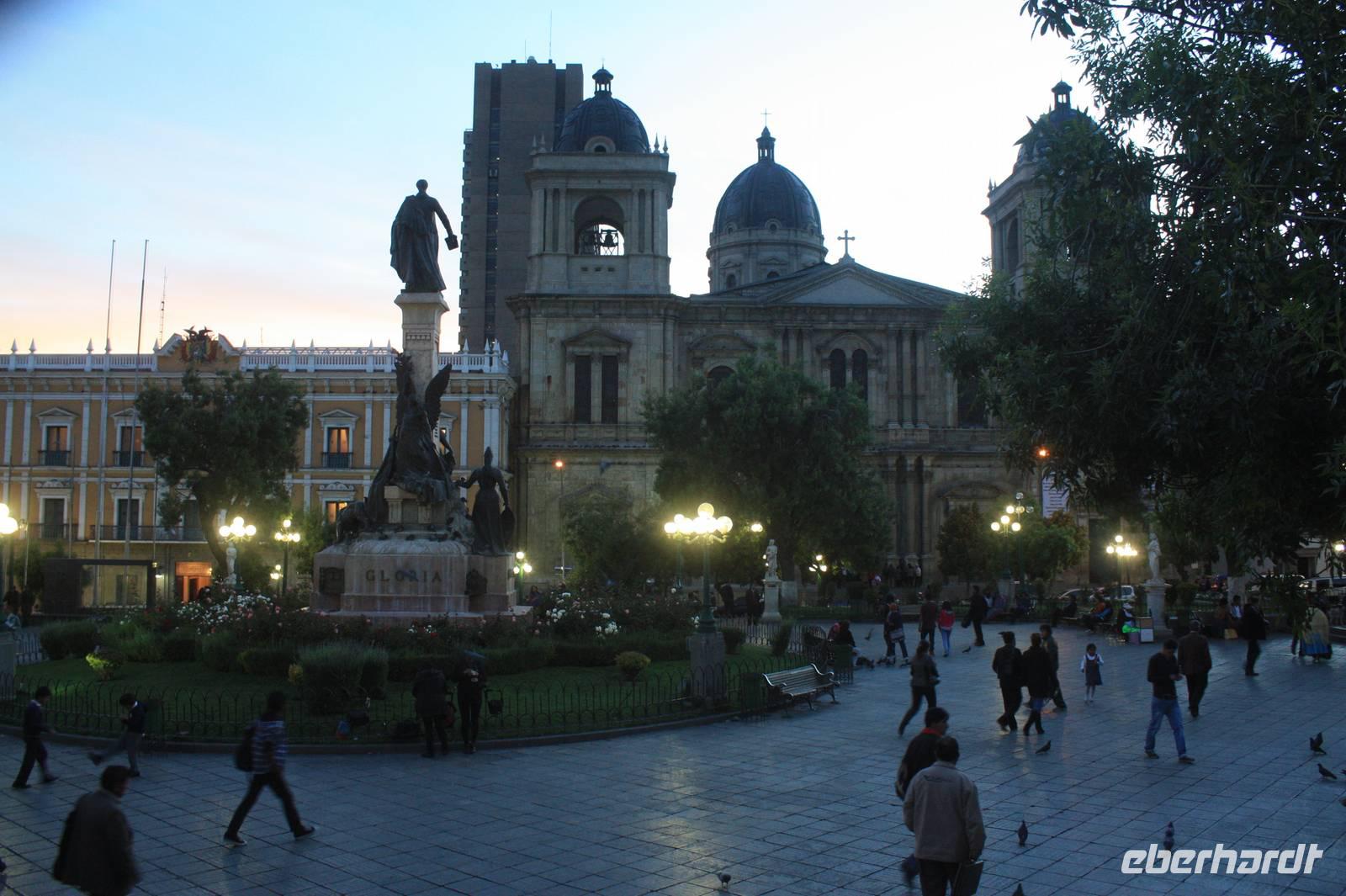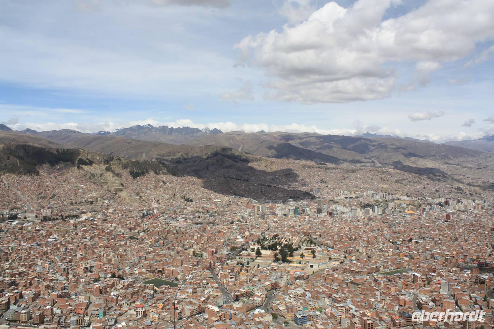 Fast eine Woche waren wir nun schon auf den Spuren Boliviens unterwegs, um dieses uns unbekannte Land zu erkunden. Überwältigt von den bisherigen Eindrücken, waren wir der Meinung, dass uns so schnell nichts mehr sprichwörtlich vom Hocker hauen konnte. Doch wir sollten uns irren! Wir schrieben Montag, den 12.11.2012. Wir verließen die Hauptstadt Sucre mit Ziel La Paz, Regierungssitz Boliviens. In El Alto gelandet näherten wir uns der Stadt von oben. Wahnsinn ... Unfassbar ist schier jeder Millimeter dieser Stadt bebaut. An den Hängen der Stadt kleben die Häuser eines neben dem anderen, aufgereiht wie auf einer Perlenschnur. Natürlich durfte auch hier kein Stadtrundgang fehlen. Gesagt, getan stürzten wir uns ins Getümmel, probierten Api (Maisgetränk mit Kardamom) auf der Straße, staunten als wir auf dem mächtigen Hauptplatz der Stadt standen umringt von prächtigen Kolonialbauten und schlängelten uns durch das Gassenwirrwarr des Mercado hinauf zum Hexenmarkt. Tote Lamaembryos gab es hier ebenso, wie den mittlerweile geschätzten Mate de Coca. Krönender Abschluss des Tages war die Folkloreshow im Restaurant Pan de Oro. Müde und geschafft vom Tag sanken wir in unsere luxuriösen Betten im 5*-Sterne-Ritz Apart Hotel.