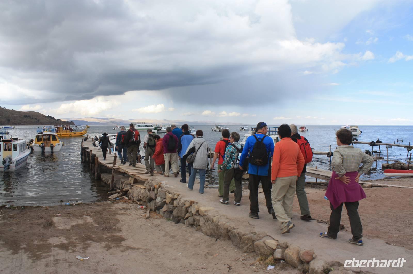 Unseren letzten Tag in Bolivien begonnen wir mit einer Bootsfahrt. Ziel waren erst die Mondinsel und anschließend die Inkatreppe der Sonneninsel. In der Inkakultur galt stets das Prinzip der Parität. Frau & Mann, Mond & Sonne, ... Dieses Prinzip hörten wir an diesem Tag nicht zum letzten Mal. Bevor wir jedoch tiefer in die Geschichte eindrangen, verabschiedeten wir uns von Maribel und auch von Bolivien. Zu Fuß passierten wir die Grenze nach Peru. Adios Bolivia, Holá Peru!