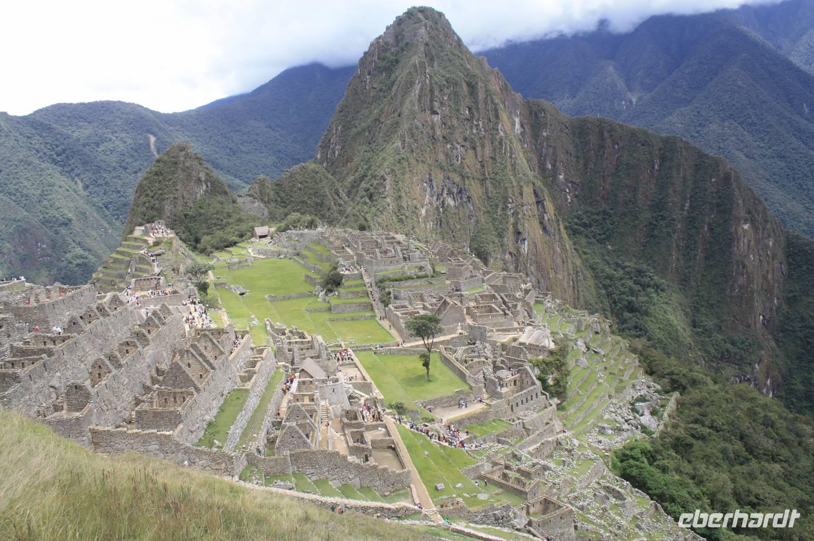 In den Folgetagen ging es Schlag auf Schlag: Titikaka See heute, Cusco - Nabel der Welt morgen und Machu Picchu übermorgen ... Spannende letzte 2 Wochen voller Höhepunkte lagen noch vor uns. Elizabeth, gebürtige Inka, nahm uns freudestrahlend in Empfang. Mit all ihrem Wissen wurden wir die Tage durch das Heilige Tal der Inka auf unserem, persönlichem „Inkatrail" zum Machu Picchu begleitet. Die Köpfe rauchten, die Münder standen vor Staunen offen und doch war Zeit für eigene Erfahrungen und Empfindungen. Ganz zu schweigen von einigen, wenigen, die 240 Aufstiegshöhenmeter zum Huaynapicchu überwinden wollten und schließlich mit dem grandiosen Ausblick über Machu Picchu belohnt wurden. Aber auch der Rest strahlte, wenngleich der Weg zum Sonnentor auch kein Spaziergang war. Unser Erlebnis Machu Picchu endete mit einer furiosen Zugfahrt von Aquas Calientes nach Poroy, bei dem einem selbst der Beifall auf dem Weg zur Toilette sicher war. Umjubelt stiegen wir vom Zug direkt in den Bus, um die letzten Kilometer nach Cusco Stadt trockenen Fußes zu absolvieren. Leider blieb für Cusco und deren historisches Zentrum nur wenig Zeit, da es am nächsten Tag schon wieder weiter Richtung Süden ging.