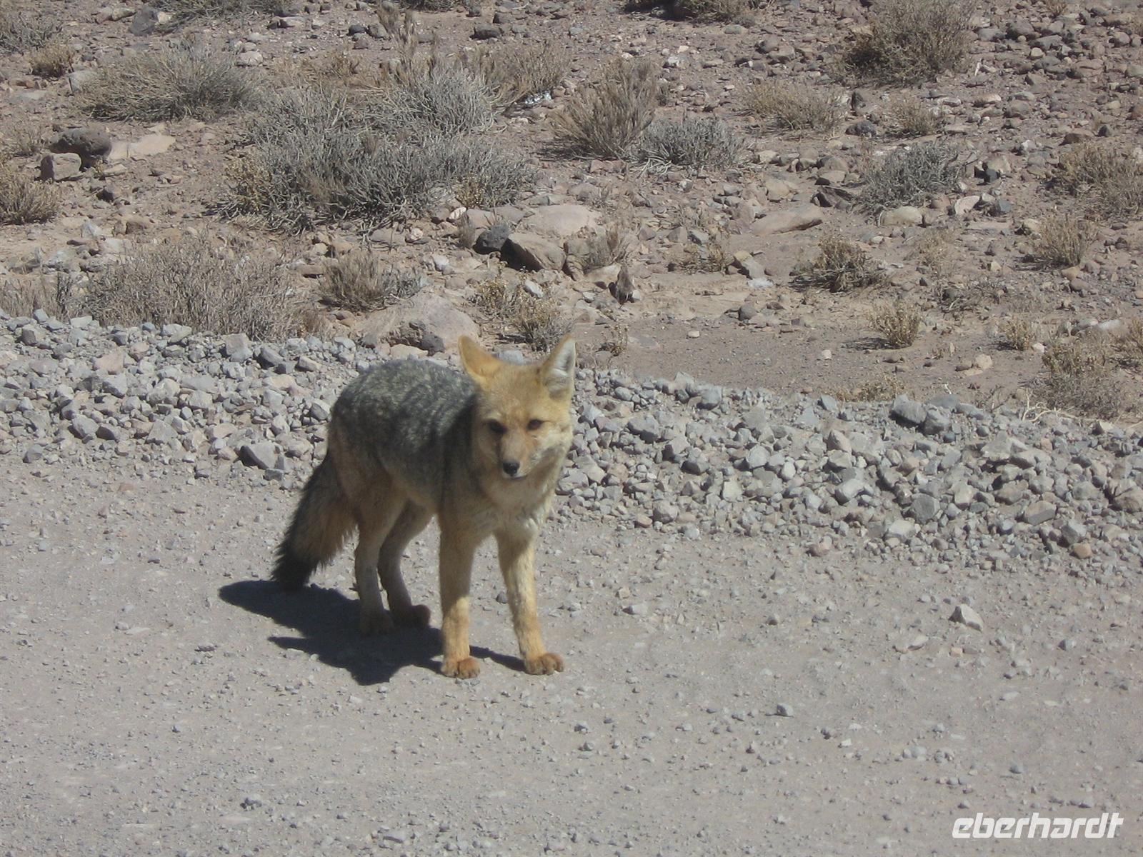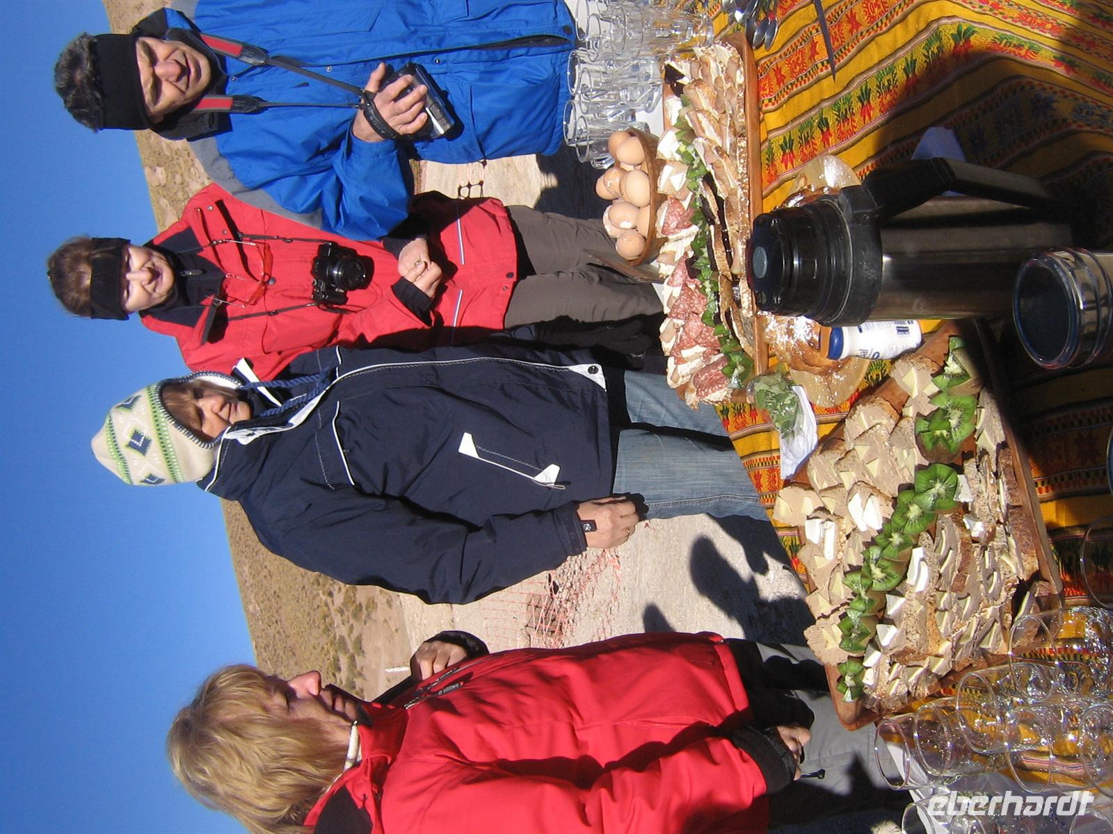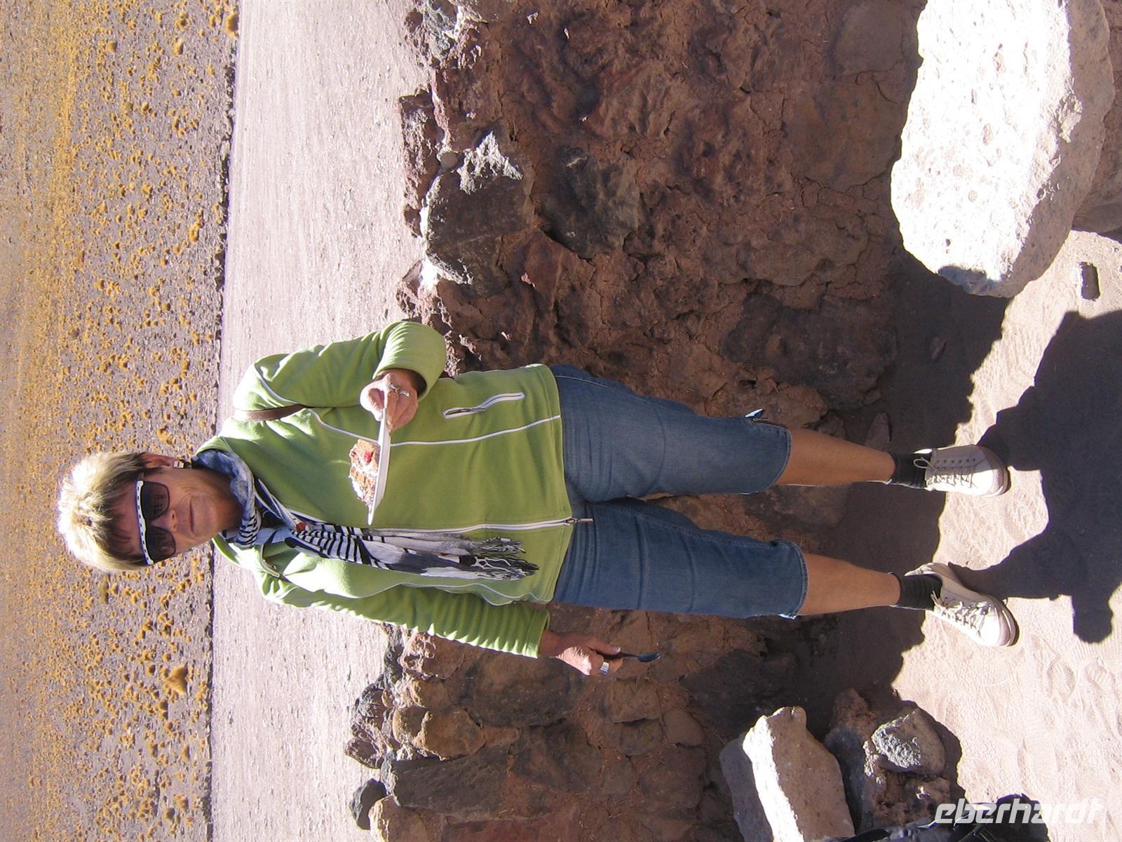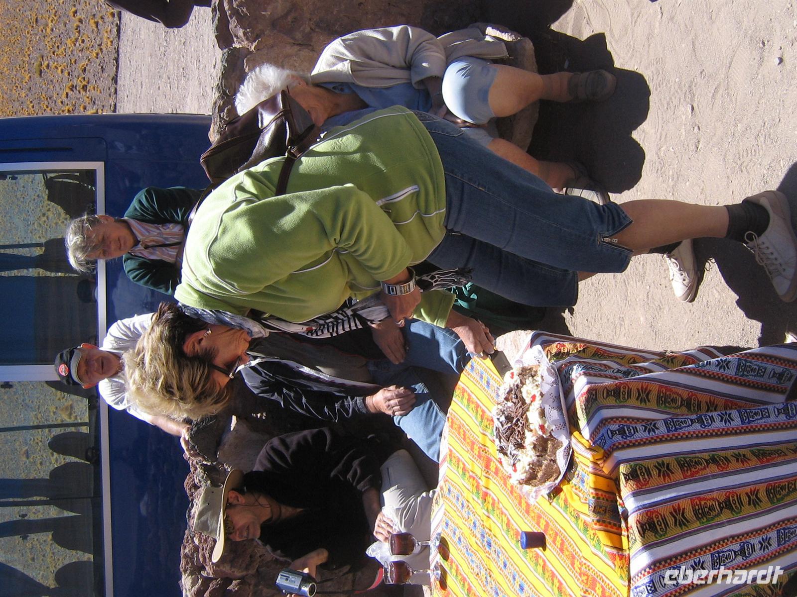 Der Ausflug führt uns zu den Lagunen Meniques und Miscanti. Wir fahren an kleinen Oasen vorbei. In einer der Oasen erfahren wir, dass hier auch Holzkohle angefertigt wird. Es wurden wieder die schönsten Foto-Motive gesucht und dabei nicht bemerkt, dass sehr starke Dornen auf dem Boden lagen. Gisela mussten wir mit vereinten Kräften helfen und die Dornen aus den Schuhsohlen entfernen. Eine der schönsten Oasen ist die Querbrada de Jerez. Der Fluss schuf in einer Schlucht ein kleines Paradies. In den natürlichen Becken gedeihen prächtige Obstbäume. Wir besuchen den kleinen Ort Toconao. Besonders sehenswert ist die kleine Kolonialkirche mit ihrem freistehenden Glockenturm und der Tür aus Kakteen-Holz. Die Straße steigt an und wir fuhren über den Pass Paso de Sico (4.079 Meter) - das Bergpanorama wurde immer fantastischer. Die Gipfel des Cerro Miscanti (5.622 Meter) und des Cerro Meniques (5.910 Meter) kamen zum Vorschein. Zwischendrin liegen die beiden gleichnamigen Lagunen mit tiefblauem Wasser, umgeben mit zum Teil noch schneebedeckten Gipfeln und weißen Salzkristallen am Rand der Lagunen. Wir konnten Lamas und Flamingos beobachten. Nach einer Wanderung war die Überraschung groß, als ein Picknick schon auf uns wartete. Es gab auch einen sehr guten Rotwein mit dem wir auf unser Geburtstagskind Isolde anstießen. Und zur großen Freude gab es eine echte Schwarzwälder Kirchtorte zum Geburtstag. Auf dem Weg zum Salzsee hatten wir Glück, denn ein Wüstenfuchs stand an der Straße und beobachtete uns. Ich glaube, er ist Touristen gewöhnt, denn er stellte sich immer in die richtige Pose. Es geht wieder abwärts und wir erreichten den Salar de Atacama (2.300 Meter), der sich auf einer Fläche von 3.000 Quadratkilometern erstreckt. Die krustige Oberfläche ist nur stellenweise weiß, meistens aber gräulich, da sich das Salz auch mit Lehm vermischt. Die einzelnen Lagunen geben den Flamingos einen Lebensraum. Die größte Lagune ist die Lago Chaxa, wo wir die Flamingos am besten beobachten konnten. Nach der Rückkehr im Hotel freuten wir uns auf die Geburtstagsfeier, denn Isolde hatte uns auf die Terrasse zu einem Snack, Bier und Wein eingeladen. Wieder ging ein erlebnisreicher Tag in gemütlicher Runde zu Ende.