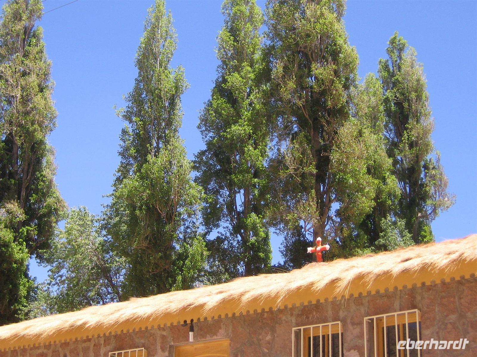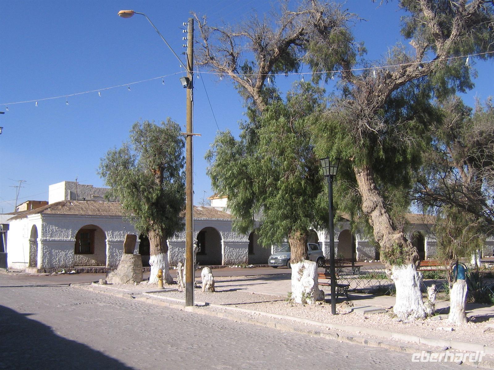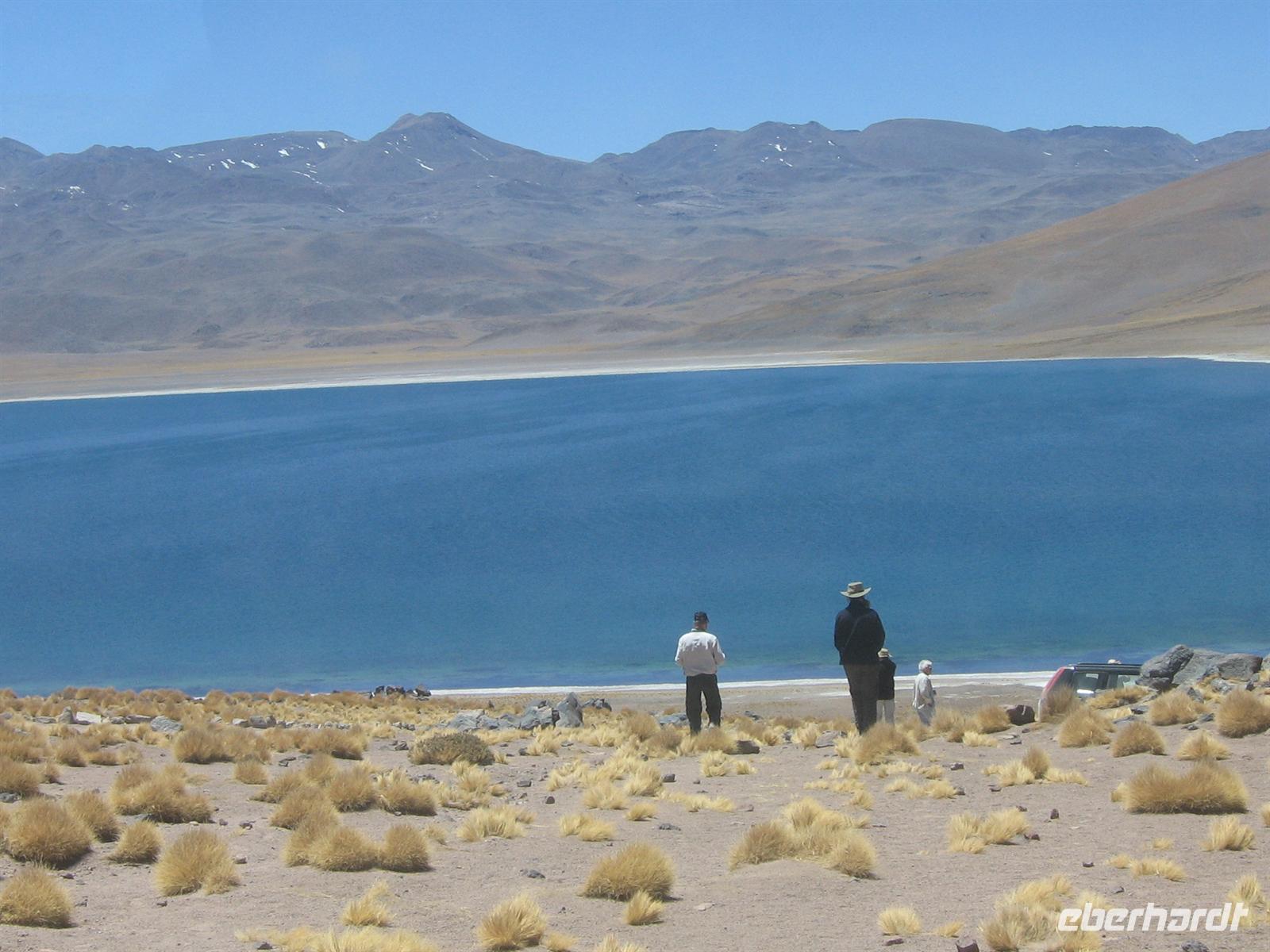 Der Ausflug führt uns zu den Lagunen Meniques und Miscanti. Wir fahren an kleinen Oasen vorbei. In einer der Oasen erfahren wir, dass hier auch Holzkohle angefertigt wird. Es wurden wieder die schönsten Foto-Motive gesucht und dabei nicht bemerkt, dass sehr starke Dornen auf dem Boden lagen. Gisela mussten wir mit vereinten Kräften helfen und die Dornen aus den Schuhsohlen entfernen. Eine der schönsten Oasen ist die Querbrada de Jerez. Der Fluss schuf in einer Schlucht ein kleines Paradies. In den natürlichen Becken gedeihen prächtige Obstbäume. Wir besuchen den kleinen Ort Toconao. Besonders sehenswert ist die kleine Kolonialkirche mit ihrem freistehenden Glockenturm und der Tür aus Kakteen-Holz. Die Straße steigt an und wir fuhren über den Pass Paso de Sico (4.079 Meter) - das Bergpanorama wurde immer fantastischer. Die Gipfel des Cerro Miscanti (5.622 Meter) und des Cerro Meniques (5.910 Meter) kamen zum Vorschein. Zwischendrin liegen die beiden gleichnamigen Lagunen mit tiefblauem Wasser, umgeben mit zum Teil noch schneebedeckten Gipfeln und weißen Salzkristallen am Rand der Lagunen. Wir konnten Lamas und Flamingos beobachten. Nach einer Wanderung war die Überraschung groß, als ein Picknick schon auf uns wartete. Es gab auch einen sehr guten Rotwein mit dem wir auf unser Geburtstagskind Isolde anstießen. Und zur großen Freude gab es eine echte Schwarzwälder Kirchtorte zum Geburtstag. Auf dem Weg zum Salzsee hatten wir Glück, denn ein Wüstenfuchs stand an der Straße und beobachtete uns. Ich glaube, er ist Touristen gewöhnt, denn er stellte sich immer in die richtige Pose. Es geht wieder abwärts und wir erreichten den Salar de Atacama (2.300 Meter), der sich auf einer Fläche von 3.000 Quadratkilometern erstreckt. Die krustige Oberfläche ist nur stellenweise weiß, meistens aber gräulich, da sich das Salz auch mit Lehm vermischt. Die einzelnen Lagunen geben den Flamingos einen Lebensraum. Die größte Lagune ist die Lago Chaxa, wo wir die Flamingos am besten beobachten konnten. Nach der Rückkehr im Hotel freuten wir uns auf die Geburtstagsfeier, denn Isolde hatte uns auf die Terrasse zu einem Snack, Bier und Wein eingeladen. Wieder ging ein erlebnisreicher Tag in gemütlicher Runde zu Ende.