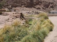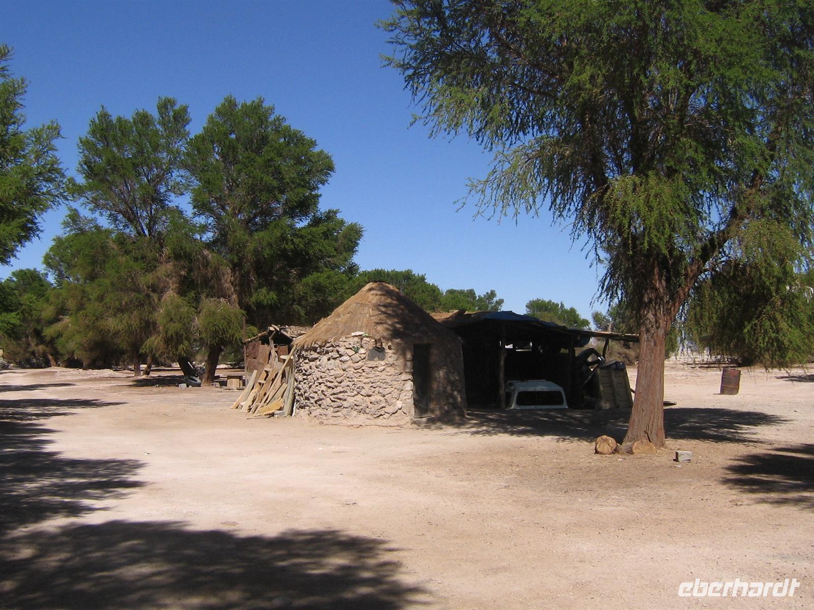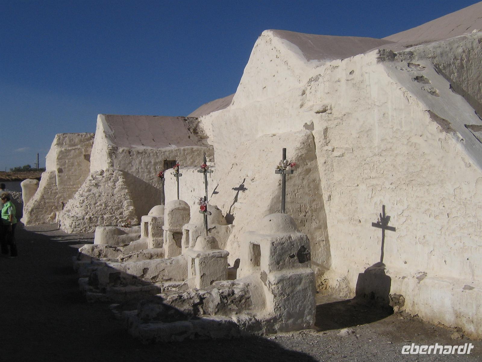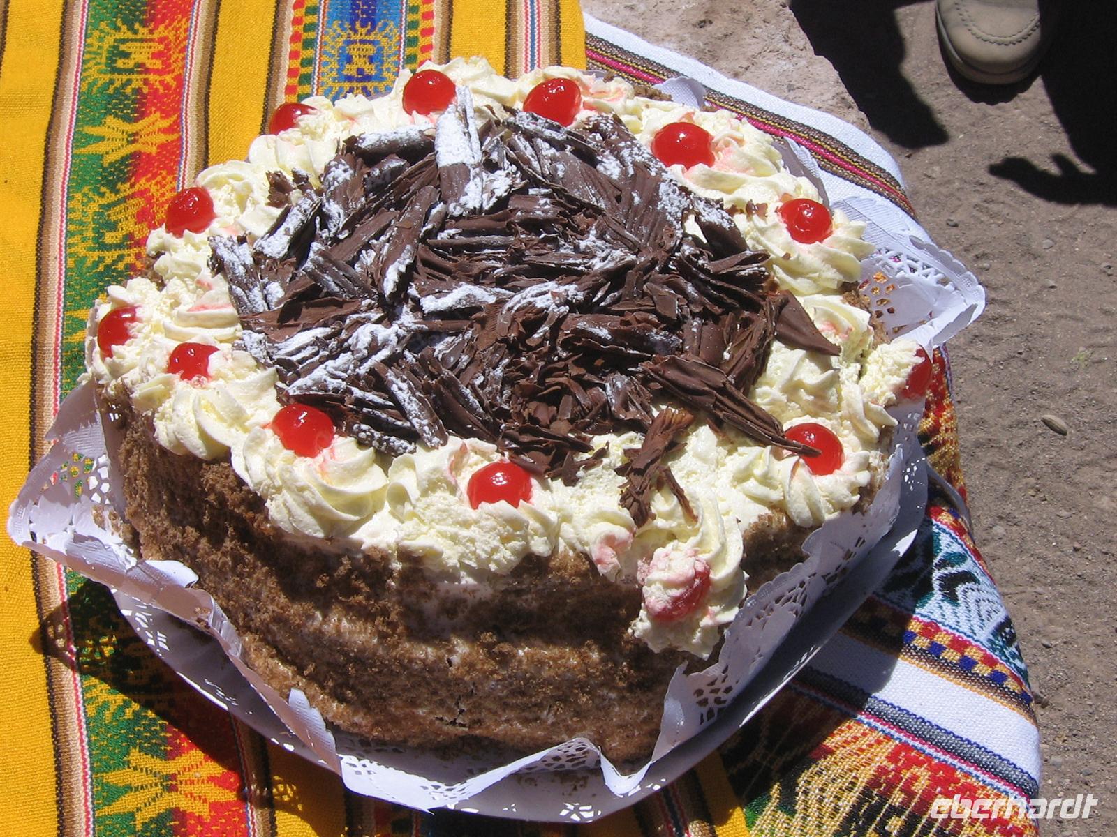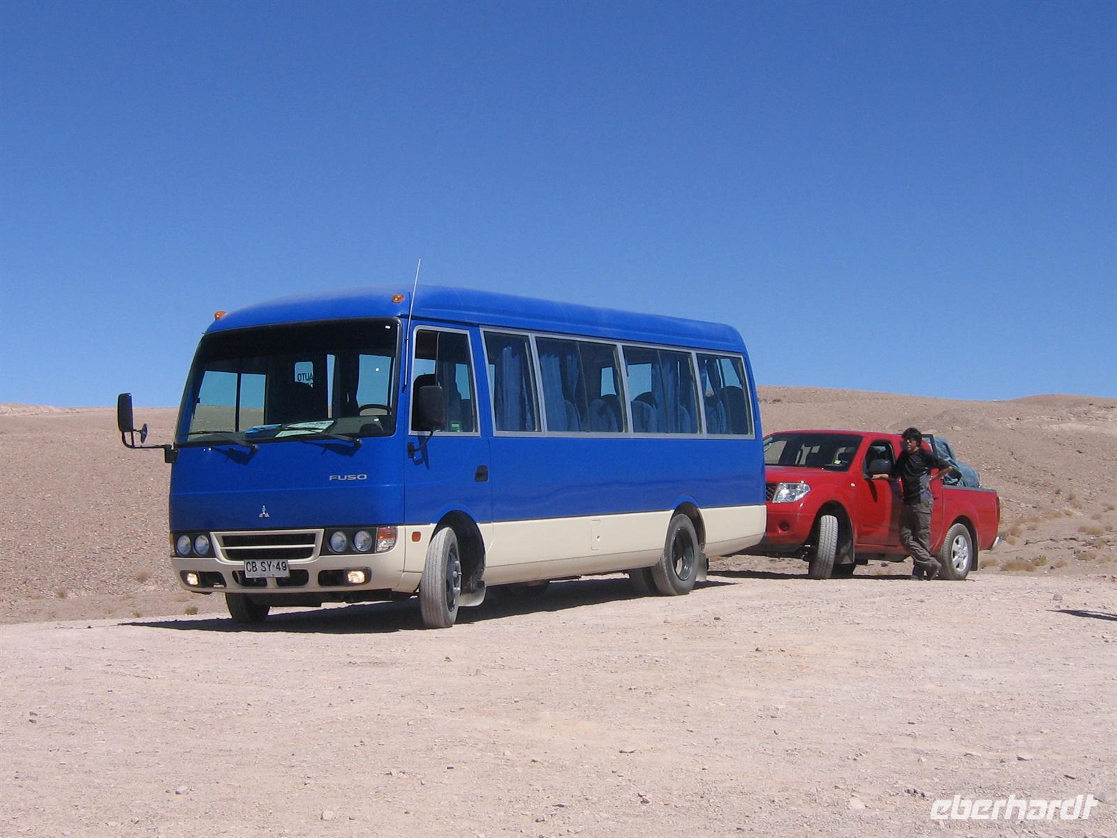 Der Ausflug führt uns zu den Lagunen Meniques und Miscanti. Wir fahren an kleinen Oasen vorbei. In einer der Oasen erfahren wir, dass hier auch Holzkohle angefertigt wird. Es wurden wieder die schönsten Foto-Motive gesucht und dabei nicht bemerkt, dass sehr starke Dornen auf dem Boden lagen. Gisela mussten wir mit vereinten Kräften helfen und die Dornen aus den Schuhsohlen entfernen. Eine der schönsten Oasen ist die Querbrada de Jerez. Der Fluss schuf in einer Schlucht ein kleines Paradies. In den natürlichen Becken gedeihen prächtige Obstbäume. Wir besuchen den kleinen Ort Toconao. Besonders sehenswert ist die kleine Kolonialkirche mit ihrem freistehenden Glockenturm und der Tür aus Kakteen-Holz. Die Straße steigt an und wir fuhren über den Pass Paso de Sico (4.079 Meter) - das Bergpanorama wurde immer fantastischer. Die Gipfel des Cerro Miscanti (5.622 Meter) und des Cerro Meniques (5.910 Meter) kamen zum Vorschein. Zwischendrin liegen die beiden gleichnamigen Lagunen mit tiefblauem Wasser, umgeben mit zum Teil noch schneebedeckten Gipfeln und weißen Salzkristallen am Rand der Lagunen. Wir konnten Lamas und Flamingos beobachten. Nach einer Wanderung war die Überraschung groß, als ein Picknick schon auf uns wartete. Es gab auch einen sehr guten Rotwein mit dem wir auf unser Geburtstagskind Isolde anstießen. Und zur großen Freude gab es eine echte Schwarzwälder Kirchtorte zum Geburtstag. Auf dem Weg zum Salzsee hatten wir Glück, denn ein Wüstenfuchs stand an der Straße und beobachtete uns. Ich glaube, er ist Touristen gewöhnt, denn er stellte sich immer in die richtige Pose. Es geht wieder abwärts und wir erreichten den Salar de Atacama (2.300 Meter), der sich auf einer Fläche von 3.000 Quadratkilometern erstreckt. Die krustige Oberfläche ist nur stellenweise weiß, meistens aber gräulich, da sich das Salz auch mit Lehm vermischt. Die einzelnen Lagunen geben den Flamingos einen Lebensraum. Die größte Lagune ist die Lago Chaxa, wo wir die Flamingos am besten beobachten konnten. Nach der Rückkehr im Hotel freuten wir uns auf die Geburtstagsfeier, denn Isolde hatte uns auf die Terrasse zu einem Snack, Bier und Wein eingeladen. Wieder ging ein erlebnisreicher Tag in gemütlicher Runde zu Ende.