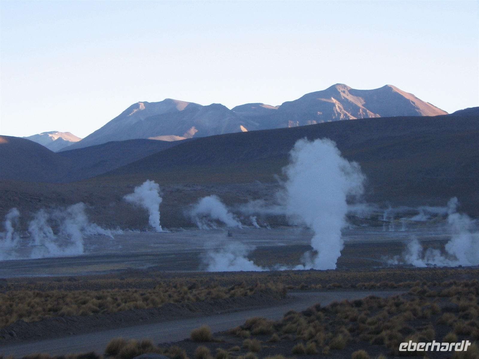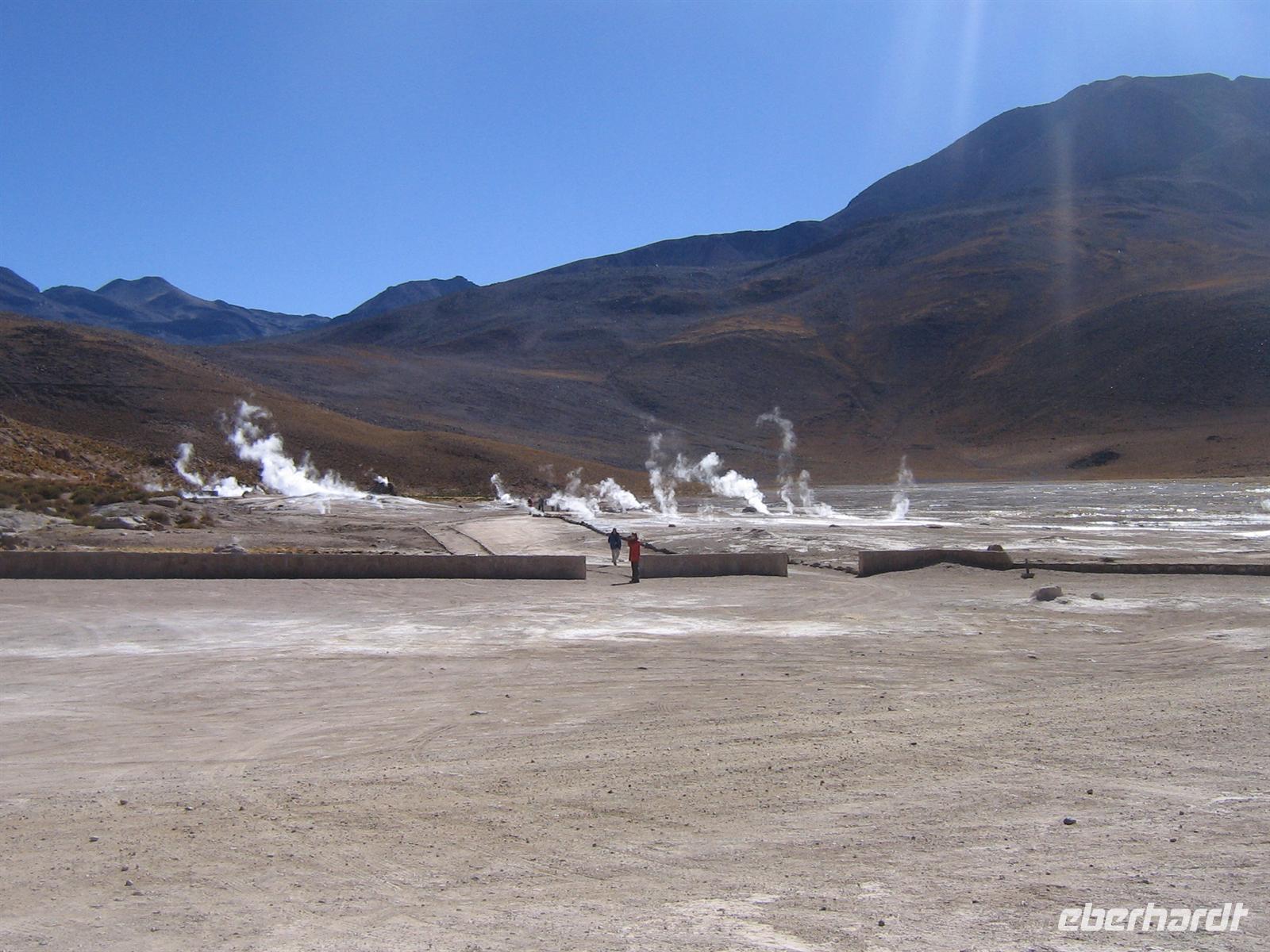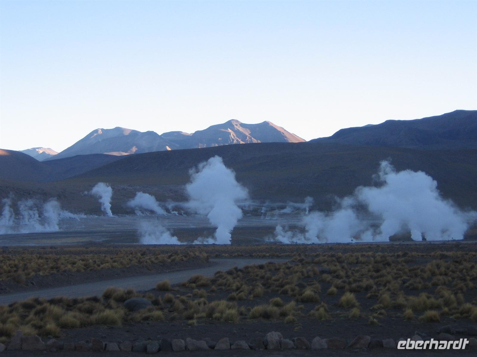 Wer die Tatio Geysire sehen möchte, auf 4.000 Metern Höhe, die höchstgelegen der Welt, muss zeitig aufstehen, so auch wir. Das weite Feld der Geysire bietet bei Tagesanbruch den schönsten Anblick. Die unterirdisch warmen Quellen gefrieren in der Nacht und ziehen sich in kleine Mulden zurück, denen die Kälte dünne Eishauben überstreift. Schmilzt das Eis in der starken Höhensonne, explodiert das gestaute, warme Wasser und zischt seinen Dampf in die Höhe. Das ganze Tal pfeift, grollt und faucht, während die dünnen Eisschichten zerbrechen. Bei Ankunft war es mit -14 C° sehr kalt. Doch je weiter die Sonne zum Vorschein kam, wurde es immer wärmer. Ein gutes Frühstück an den Geysiren mit warmem Tee und Kaffee wärmte uns wieder auf. Höhepunkt waren unsere im Geysir gekochten Eier. Alle Touristen waren schon weg und wir konnten das mit Liebe zubereitete Frühstück genießen. Wir beobachten das Farbenspiel der Geysir-Löcher. Wir fuhren zu einem Naturpool mit Thermalwasser und die Hälfte unserer Gruppe wagte es und nahm ein warmes Bad - in dieser Höhe ein besonderes Erlebnis! Anschließend fuhren wir in das Aymara-Dorf Caspana. Dieses Dorf lebt von Lama-Zucht und Terrassenfeldanbau. Wir erreichen Lasana, wo wir zu einem typischen Eintopf der Region mit Mais und Lama-Fleisch erwartet wurden. Gut gestärkt besichtigten wir die Ruinen einer Atacamenos-Festung. Jetzt aber schnell zum Flughafen nach Calama, wo unsere Maschine nach Santiago startete. Etwas müde von dem langen Tag vielen wir alle gleich ins Bett.