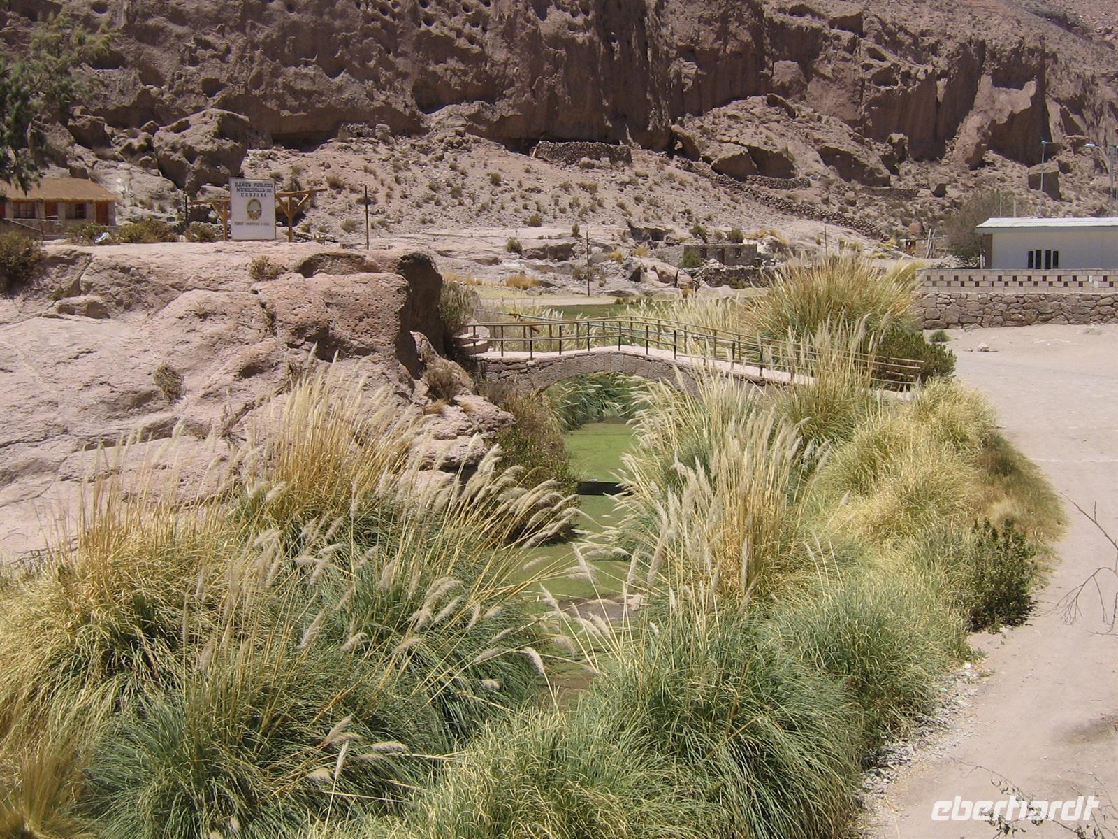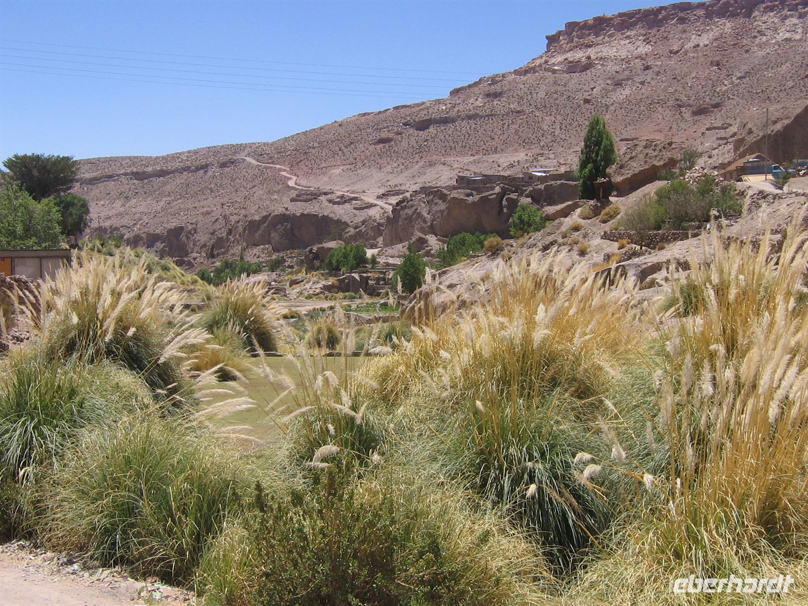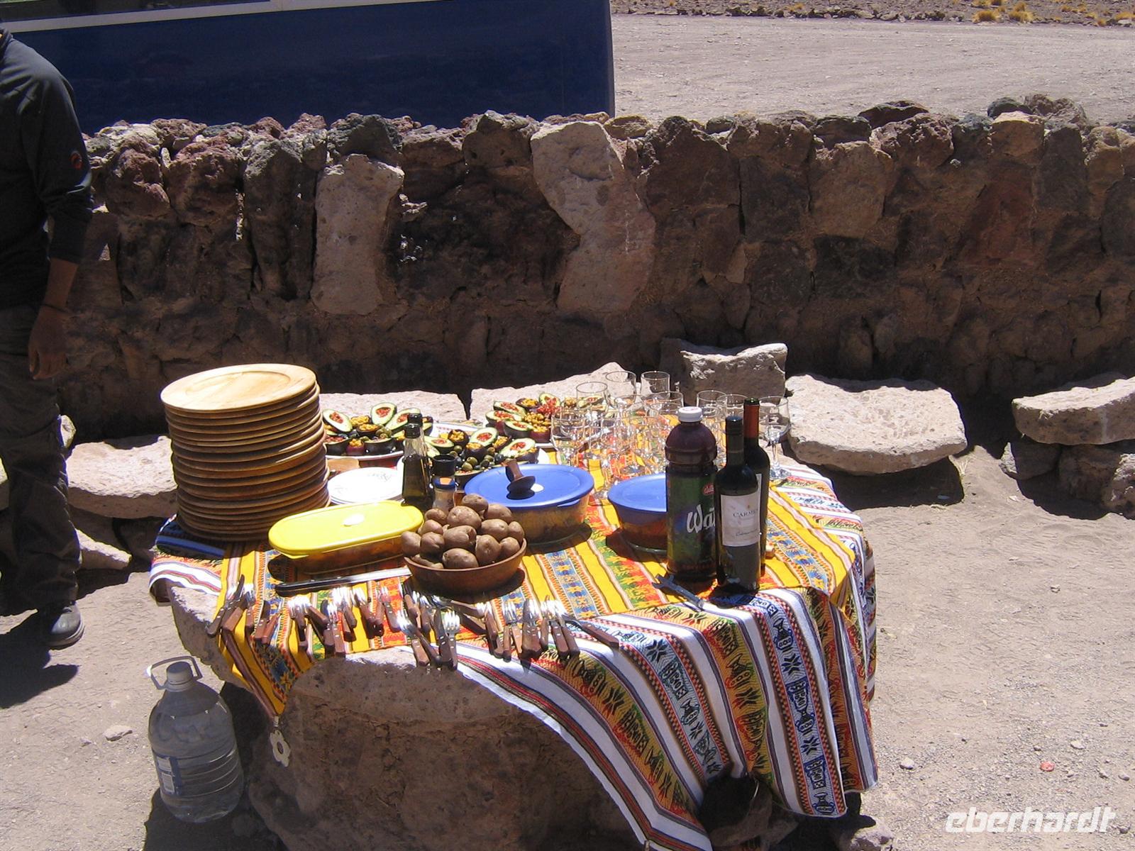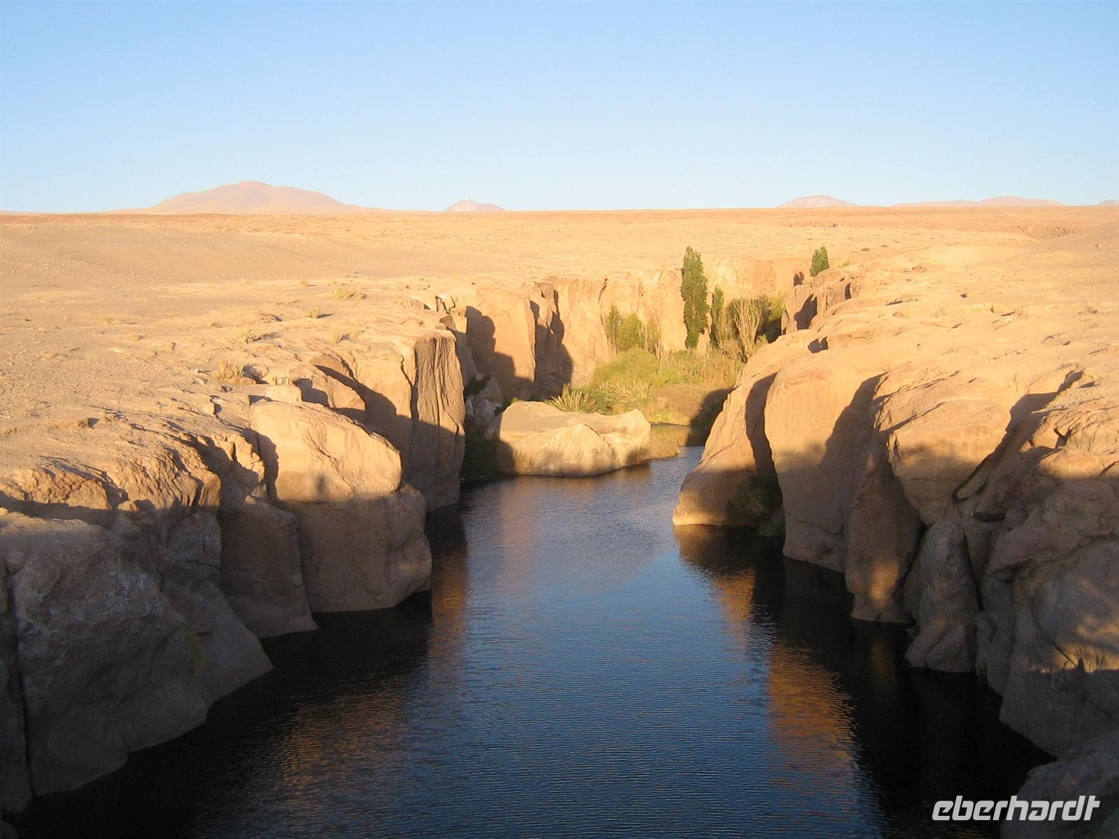 Wer die Tatio Geysire sehen möchte, auf 4.000 Metern Höhe, die höchstgelegen der Welt, muss zeitig aufstehen, so auch wir. Das weite Feld der Geysire bietet bei Tagesanbruch den schönsten Anblick. Die unterirdisch warmen Quellen gefrieren in der Nacht und ziehen sich in kleine Mulden zurück, denen die Kälte dünne Eishauben überstreift. Schmilzt das Eis in der starken Höhensonne, explodiert das gestaute, warme Wasser und zischt seinen Dampf in die Höhe. Das ganze Tal pfeift, grollt und faucht, während die dünnen Eisschichten zerbrechen. Bei Ankunft war es mit -14 C° sehr kalt. Doch je weiter die Sonne zum Vorschein kam, wurde es immer wärmer. Ein gutes Frühstück an den Geysiren mit warmem Tee und Kaffee wärmte uns wieder auf. Höhepunkt waren unsere im Geysir gekochten Eier. Alle Touristen waren schon weg und wir konnten das mit Liebe zubereitete Frühstück genießen. Wir beobachten das Farbenspiel der Geysir-Löcher. Wir fuhren zu einem Naturpool mit Thermalwasser und die Hälfte unserer Gruppe wagte es und nahm ein warmes Bad - in dieser Höhe ein besonderes Erlebnis! Anschließend fuhren wir in das Aymara-Dorf Caspana. Dieses Dorf lebt von Lama-Zucht und Terrassenfeldanbau. Wir erreichen Lasana, wo wir zu einem typischen Eintopf der Region mit Mais und Lama-Fleisch erwartet wurden. Gut gestärkt besichtigten wir die Ruinen einer Atacamenos-Festung. Jetzt aber schnell zum Flughafen nach Calama, wo unsere Maschine nach Santiago startete. Etwas müde von dem langen Tag vielen wir alle gleich ins Bett.