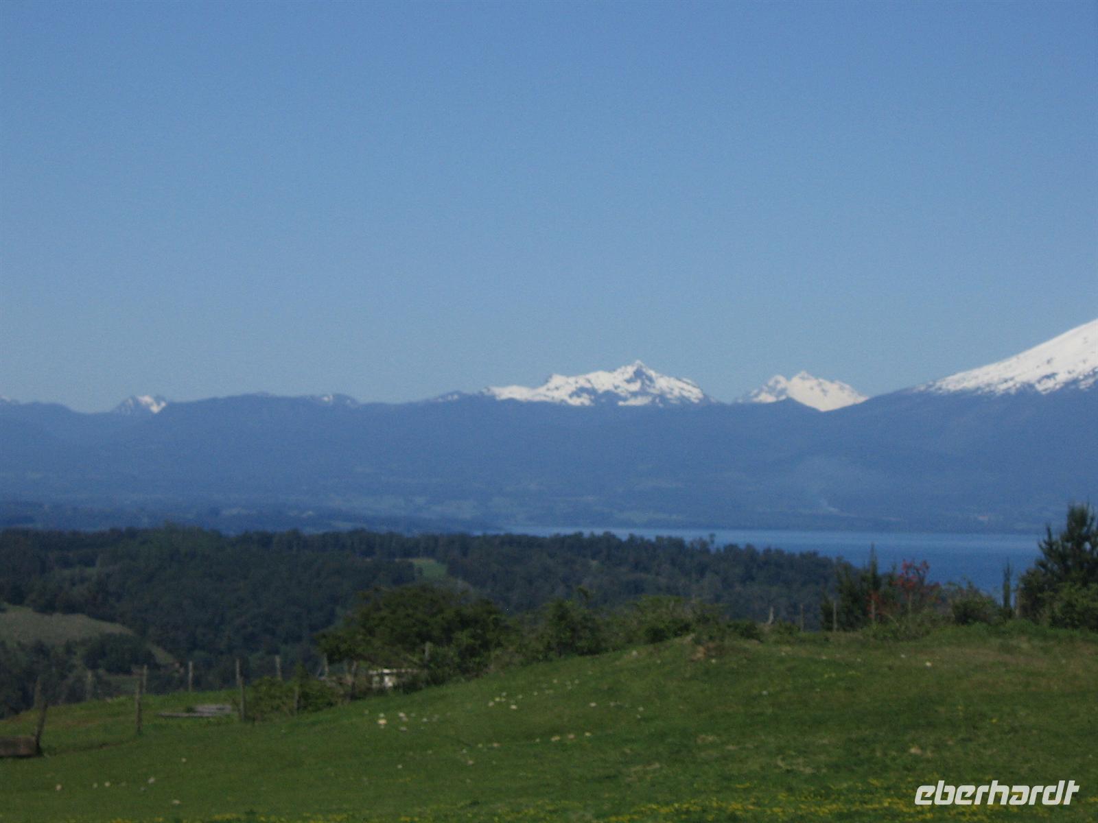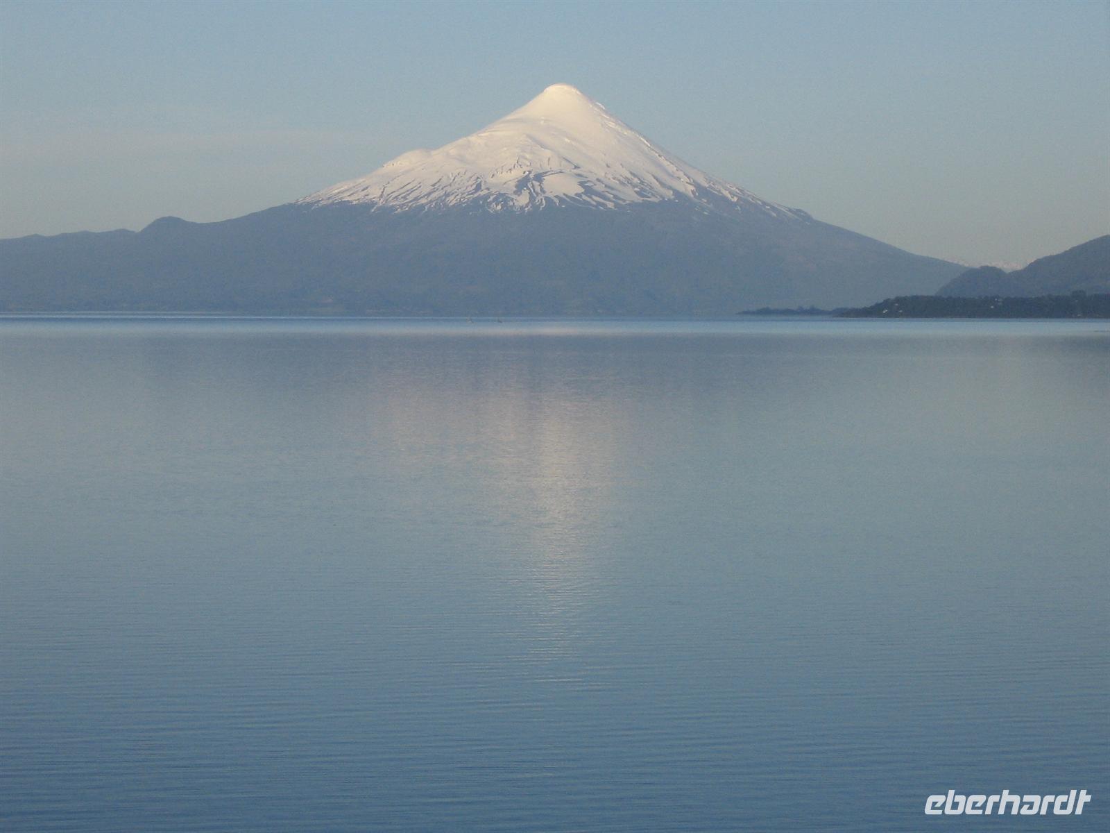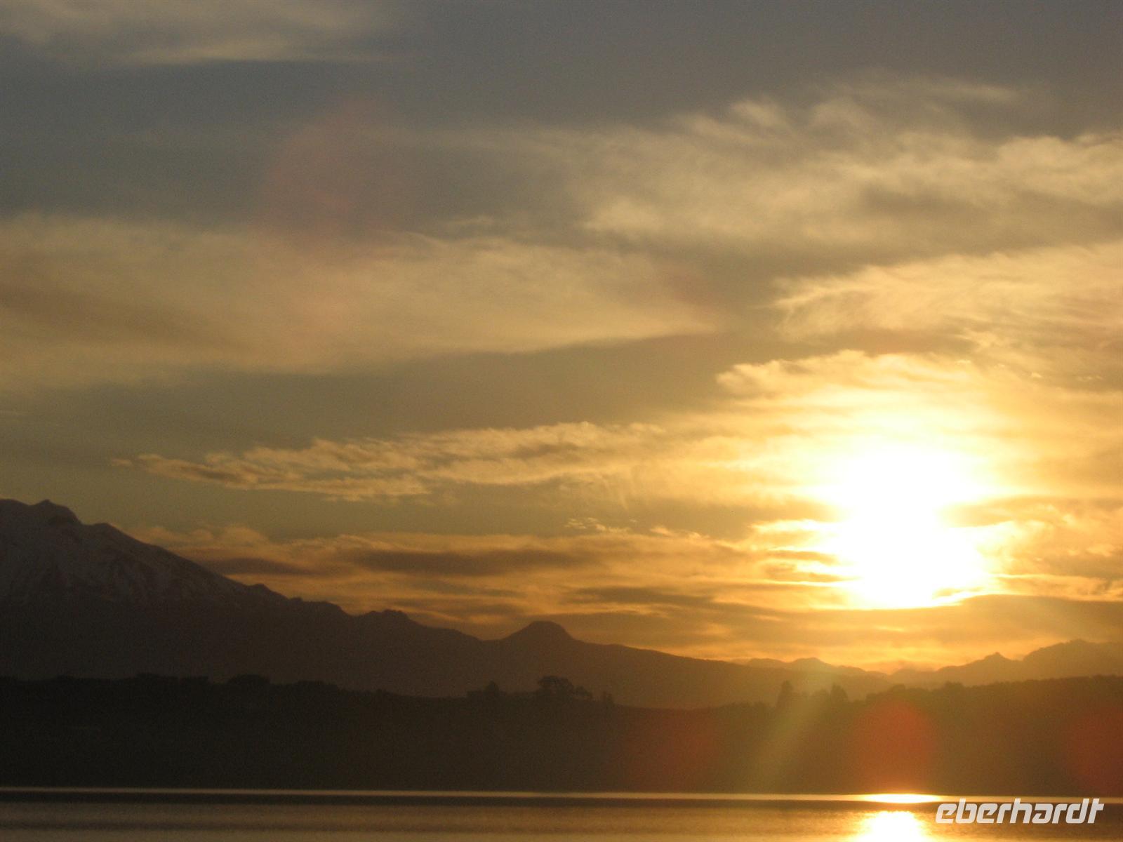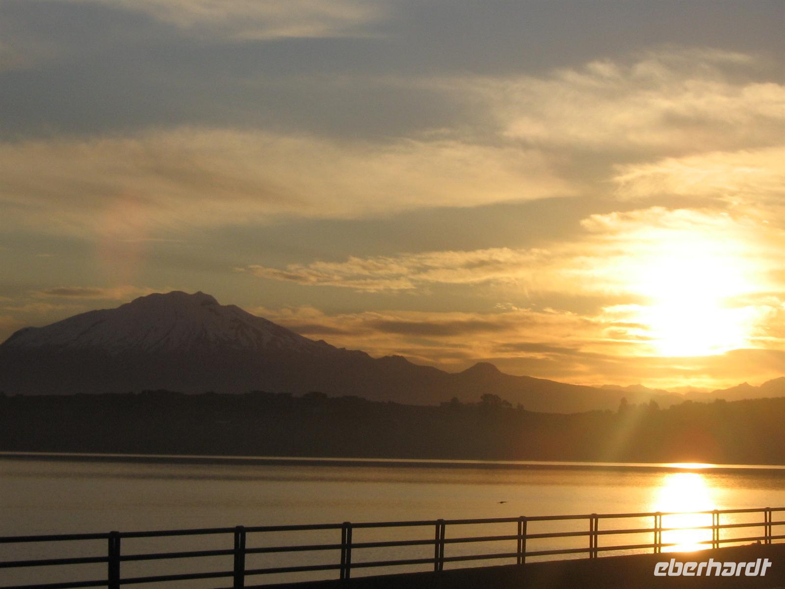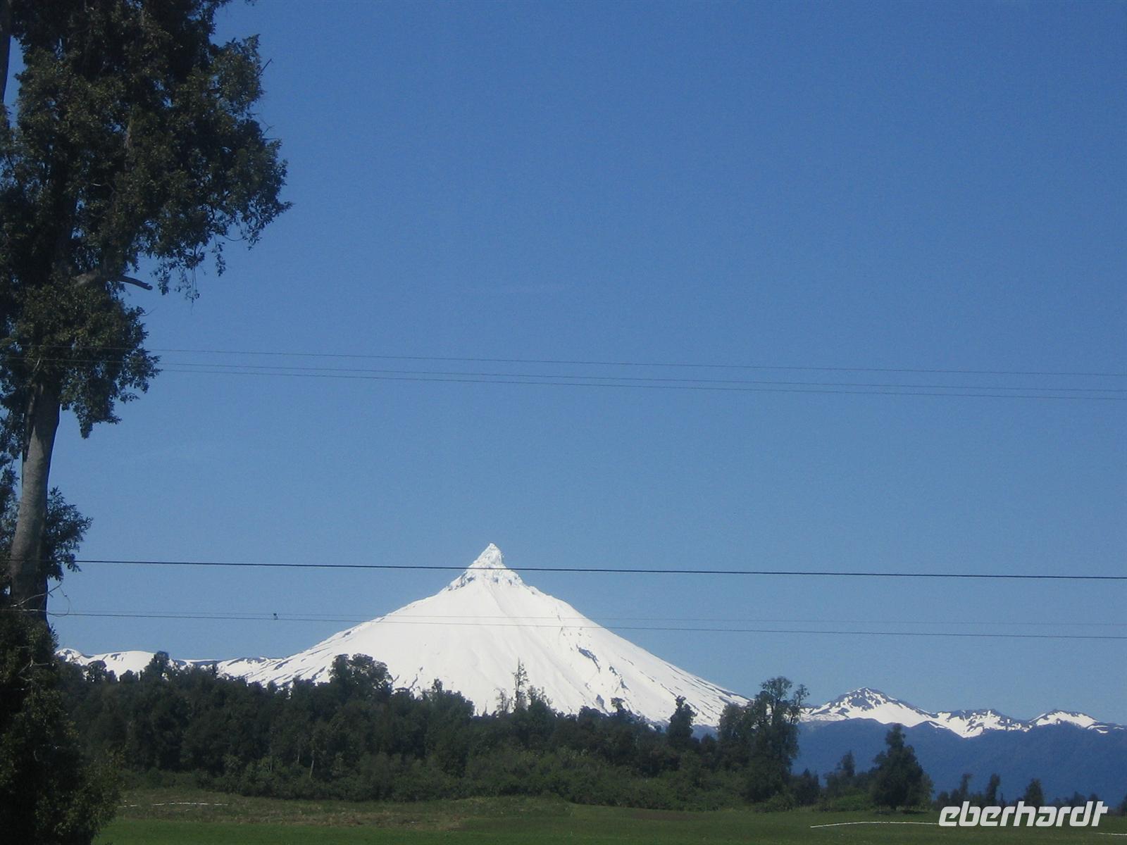 Heute fuhren wir bei strahlend blauem Himmel zur argentinischen Grenze. Es verlief alles reibungslos. Wir erreichten den Pass und befanden uns an der Schneegrenze. Einige konnten es nicht lassen und veranstalteten eine Schneeballschlacht. Auch an der chilenischen Grenze hatten wir Glück. Das ganze Gepäck wurde durchleuchtet. Wir setzten unser schönstes Lächeln auf und ohne Probleme konnten wir die Grenze passieren. Oh Schreck auf einmal war unsere Isolde weg. Nach einigen hundert Metern wurde Sie vermisst. Schnell fuhren wir zurück zur Grenze und nahmen eine glückliche Isolde wieder auf. Wir nutzten das schöne Wetter und legten bei jeder sich bietenden Gelegenheit einen Fotostopp ein. Es boten sich uns sehr schöne Ausblicke auf die Vulkane und die Seen. Etwas spät erreichten wir das Restaurant „Vogelscheuche“. Von außen sah es eigentlich nicht wie ein gemütliches Lokal aus. Aber wir wurden eines Besseren belehrt. Besitzer des Restaurants sind deutsche Auswandern. Es gab ein sehr gutes Buffet mit verschiedenen Salaten, Beilagen und als Spezialität am Spieß gebratenes Wildschein. Ein leckeres Dessertbuffet mit frischem Kaffee rundete das sehr gute Essen ab. Zur Verdauung luden wir die Gäste zu einem argentinischen Whisky mit sehr schönem Blick auf die Vulkane ein. Wir erreichen Porte Verde - unser Hotel lag direkt am Llanquihue-See und war nicht weit vom Zentrum entfernt. Wir hatten Zeit für einen Bummel und suchten schöne Fotomotive. Einige Gäste trafen sich am Abend zu einem Pisco. Ein sehr schöner Tag ging zu Ende.