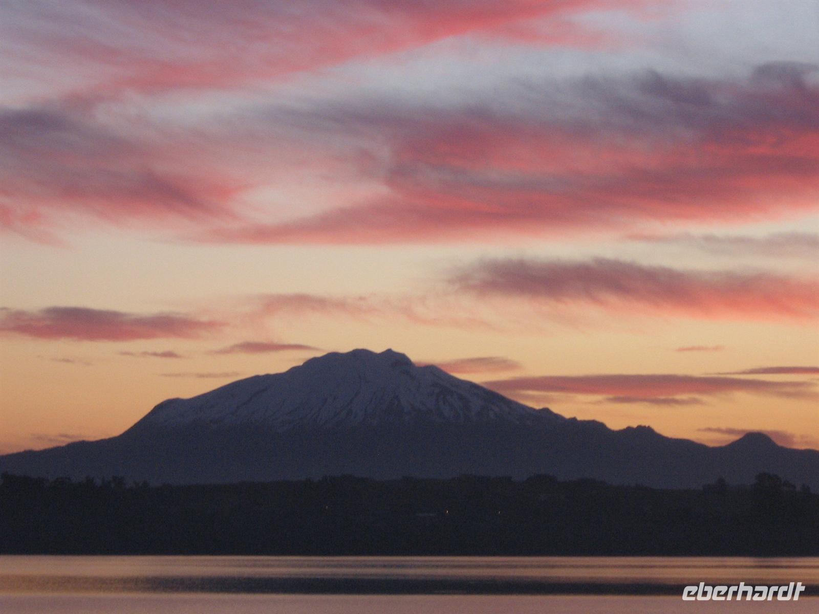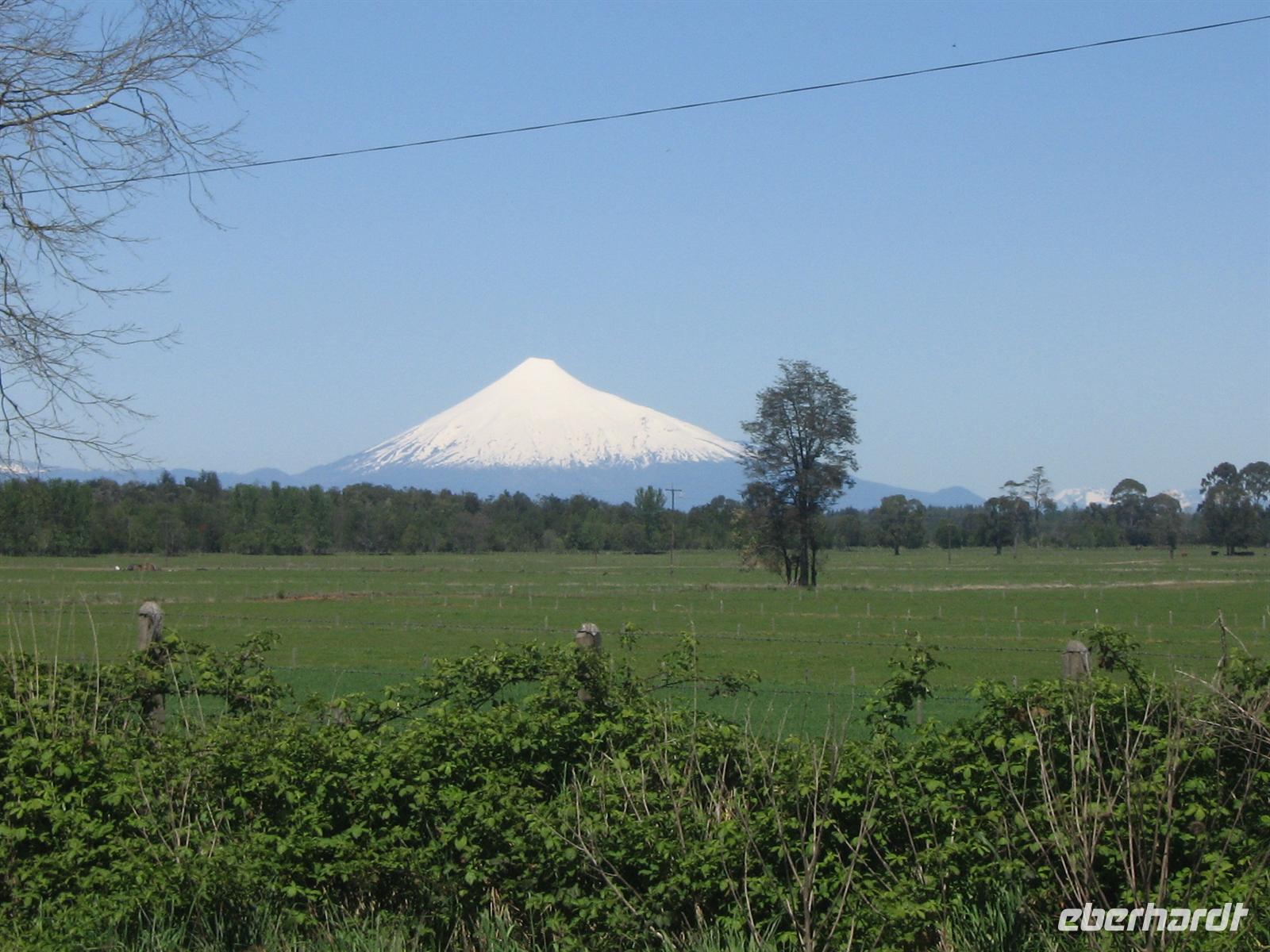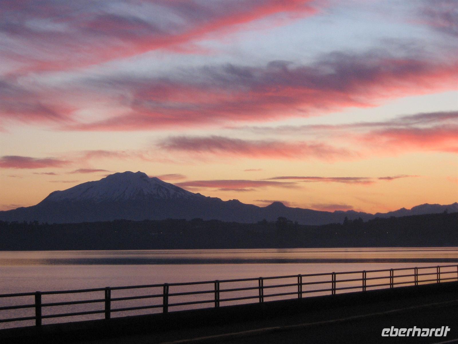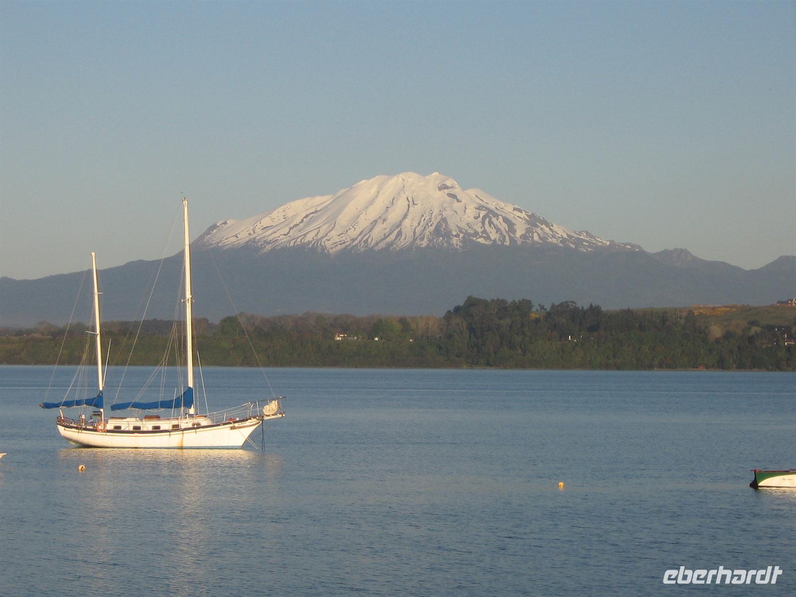 Heute fuhren wir bei strahlend blauem Himmel zur argentinischen Grenze. Es verlief alles reibungslos. Wir erreichten den Pass und befanden uns an der Schneegrenze. Einige konnten es nicht lassen und veranstalteten eine Schneeballschlacht. Auch an der chilenischen Grenze hatten wir Glück. Das ganze Gepäck wurde durchleuchtet. Wir setzten unser schönstes Lächeln auf und ohne Probleme konnten wir die Grenze passieren. Oh Schreck auf einmal war unsere Isolde weg. Nach einigen hundert Metern wurde Sie vermisst. Schnell fuhren wir zurück zur Grenze und nahmen eine glückliche Isolde wieder auf. Wir nutzten das schöne Wetter und legten bei jeder sich bietenden Gelegenheit einen Fotostopp ein. Es boten sich uns sehr schöne Ausblicke auf die Vulkane und die Seen. Etwas spät erreichten wir das Restaurant „Vogelscheuche“. Von außen sah es eigentlich nicht wie ein gemütliches Lokal aus. Aber wir wurden eines Besseren belehrt. Besitzer des Restaurants sind deutsche Auswandern. Es gab ein sehr gutes Buffet mit verschiedenen Salaten, Beilagen und als Spezialität am Spieß gebratenes Wildschein. Ein leckeres Dessertbuffet mit frischem Kaffee rundete das sehr gute Essen ab. Zur Verdauung luden wir die Gäste zu einem argentinischen Whisky mit sehr schönem Blick auf die Vulkane ein. Wir erreichen Porte Verde - unser Hotel lag direkt am Llanquihue-See und war nicht weit vom Zentrum entfernt. Wir hatten Zeit für einen Bummel und suchten schöne Fotomotive. Einige Gäste trafen sich am Abend zu einem Pisco. Ein sehr schöner Tag ging zu Ende.