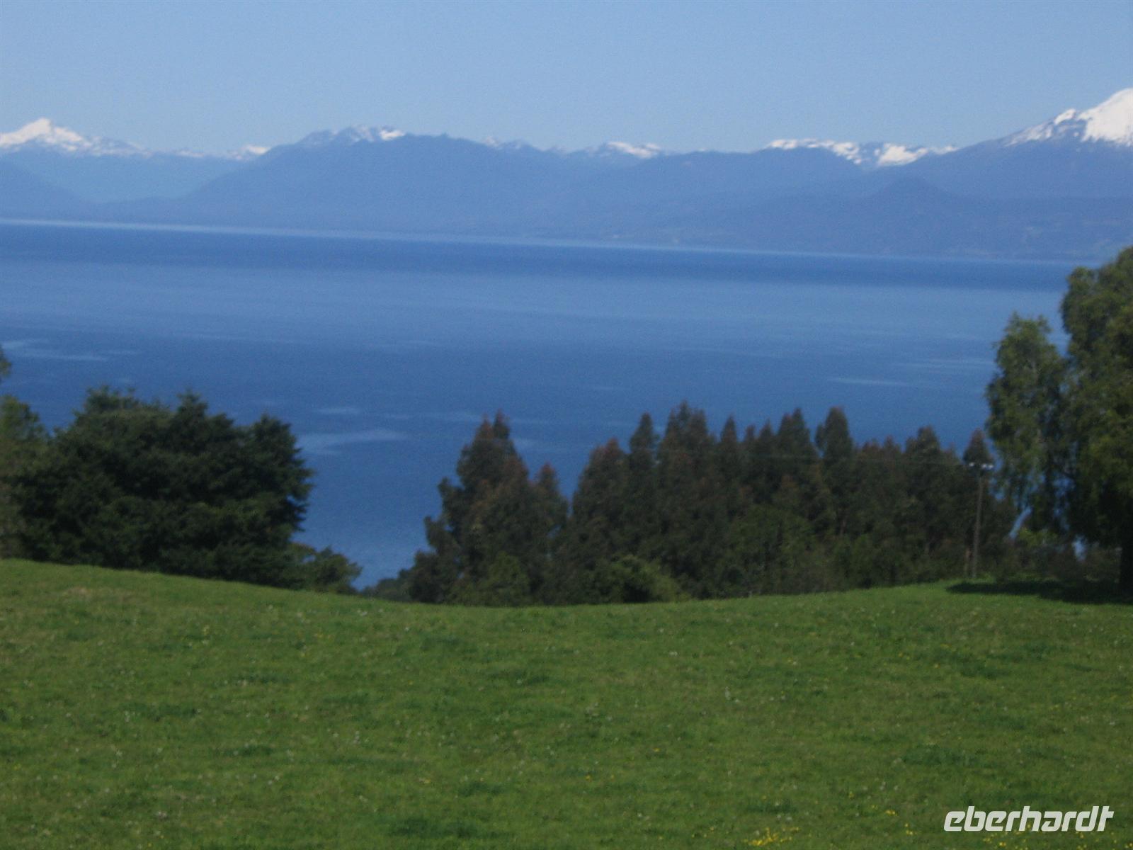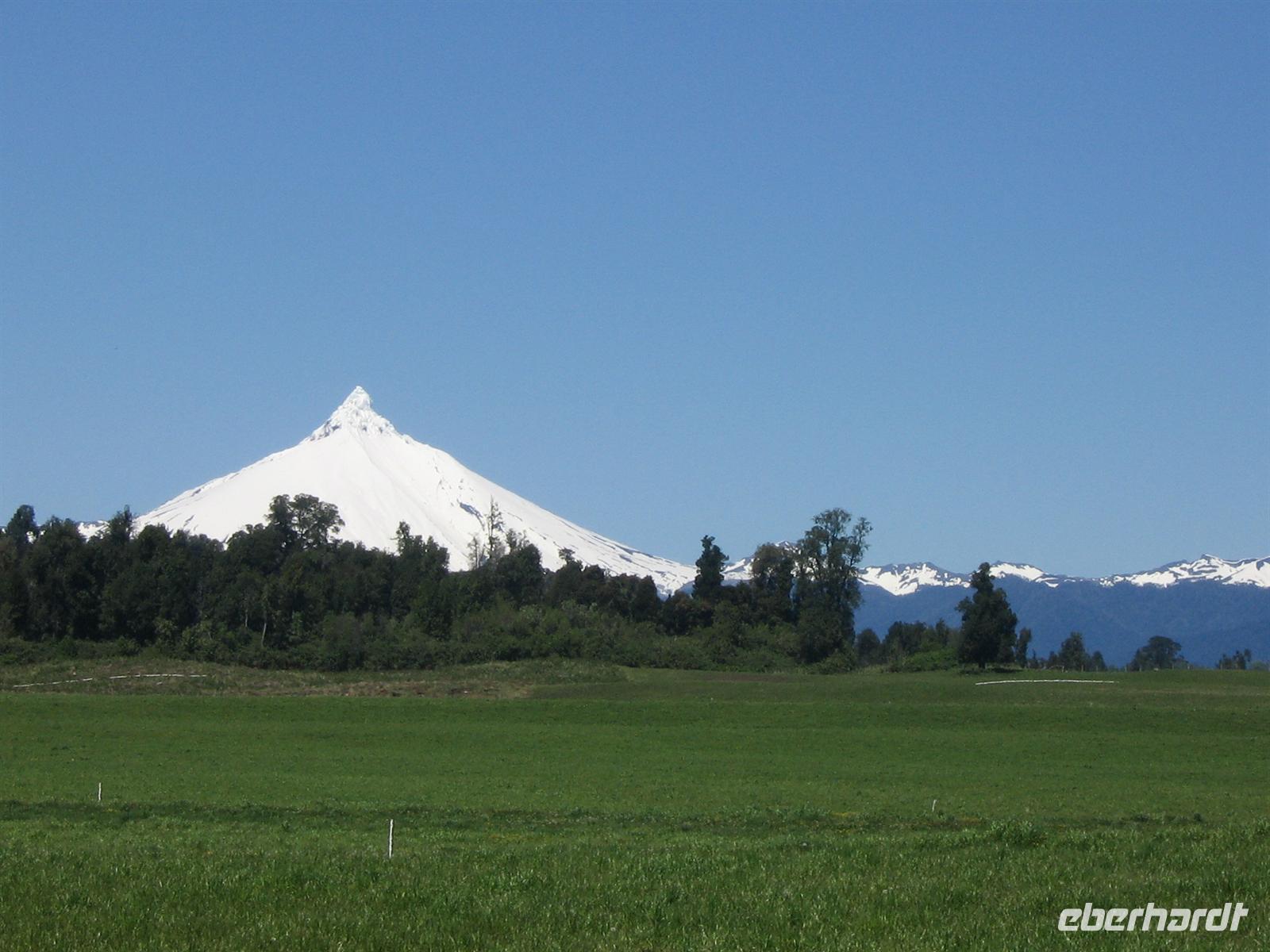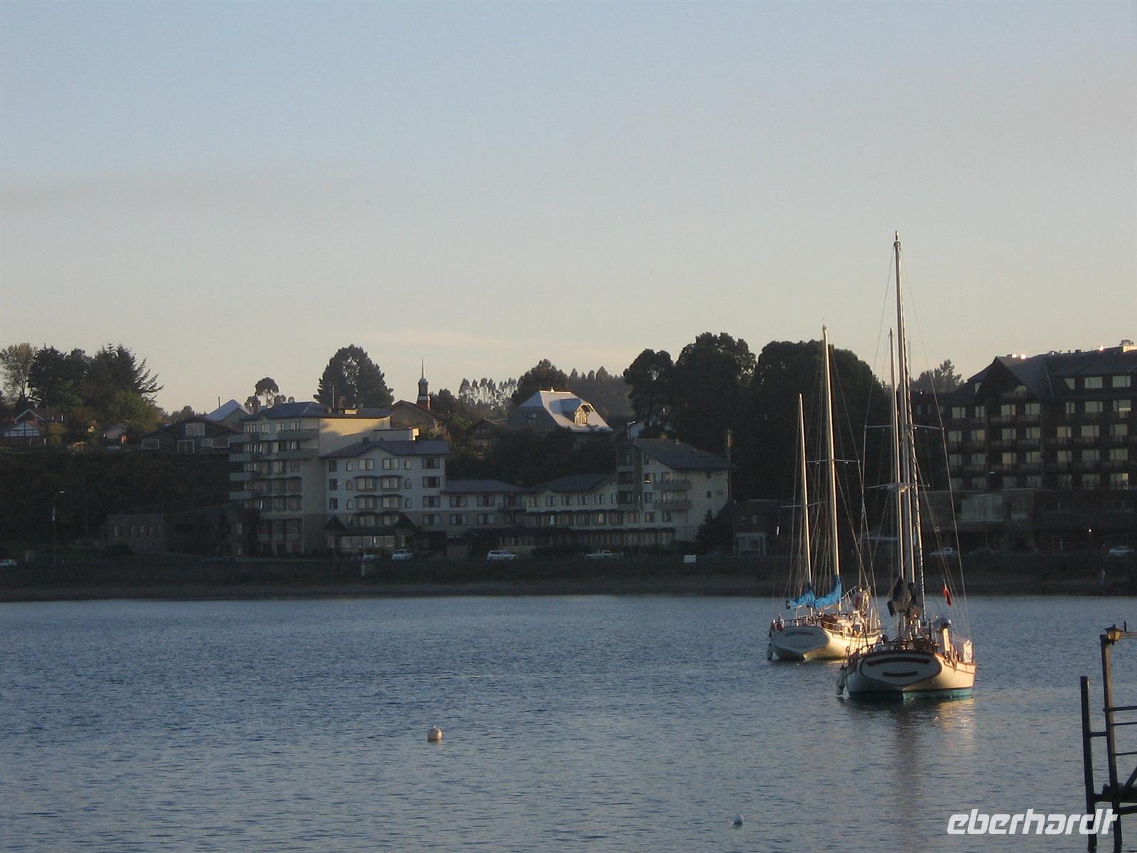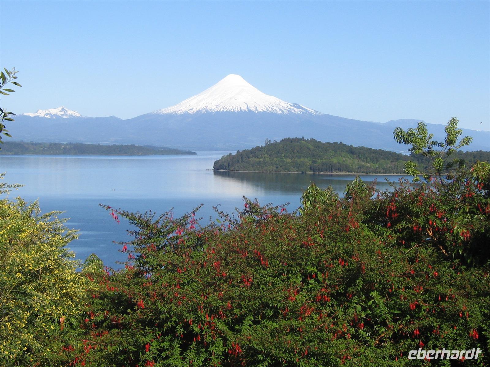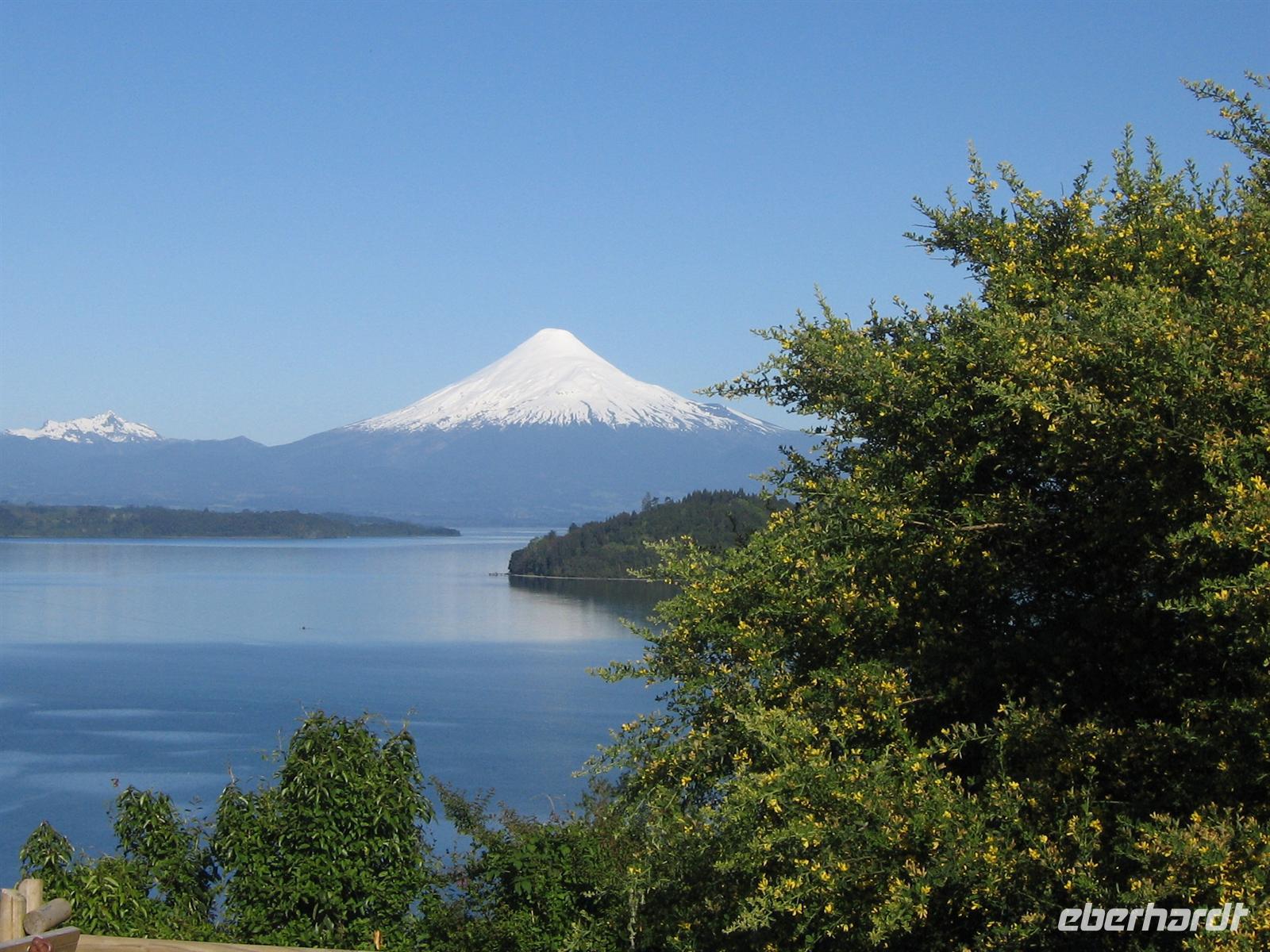 Heute fuhren wir bei strahlend blauem Himmel zur argentinischen Grenze. Es verlief alles reibungslos. Wir erreichten den Pass und befanden uns an der Schneegrenze. Einige konnten es nicht lassen und veranstalteten eine Schneeballschlacht. Auch an der chilenischen Grenze hatten wir Glück. Das ganze Gepäck wurde durchleuchtet. Wir setzten unser schönstes Lächeln auf und ohne Probleme konnten wir die Grenze passieren. Oh Schreck auf einmal war unsere Isolde weg. Nach einigen hundert Metern wurde Sie vermisst. Schnell fuhren wir zurück zur Grenze und nahmen eine glückliche Isolde wieder auf. Wir nutzten das schöne Wetter und legten bei jeder sich bietenden Gelegenheit einen Fotostopp ein. Es boten sich uns sehr schöne Ausblicke auf die Vulkane und die Seen. Etwas spät erreichten wir das Restaurant „Vogelscheuche“. Von außen sah es eigentlich nicht wie ein gemütliches Lokal aus. Aber wir wurden eines Besseren belehrt. Besitzer des Restaurants sind deutsche Auswandern. Es gab ein sehr gutes Buffet mit verschiedenen Salaten, Beilagen und als Spezialität am Spieß gebratenes Wildschein. Ein leckeres Dessertbuffet mit frischem Kaffee rundete das sehr gute Essen ab. Zur Verdauung luden wir die Gäste zu einem argentinischen Whisky mit sehr schönem Blick auf die Vulkane ein. Wir erreichen Porte Verde - unser Hotel lag direkt am Llanquihue-See und war nicht weit vom Zentrum entfernt. Wir hatten Zeit für einen Bummel und suchten schöne Fotomotive. Einige Gäste trafen sich am Abend zu einem Pisco. Ein sehr schöner Tag ging zu Ende.