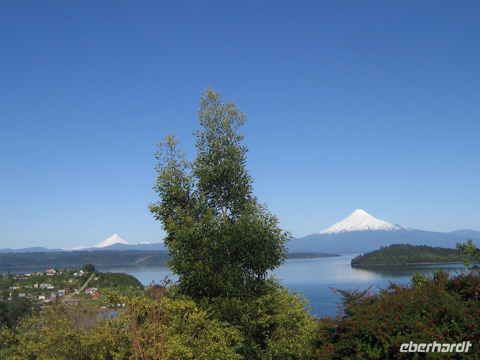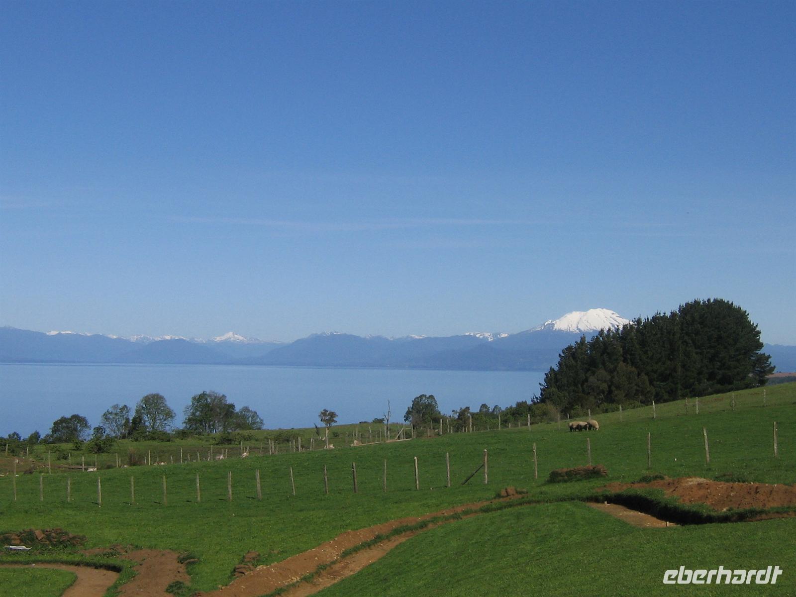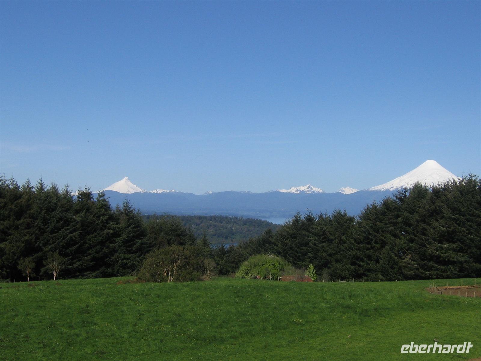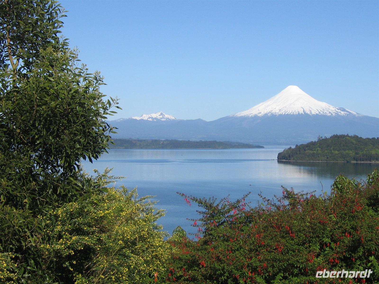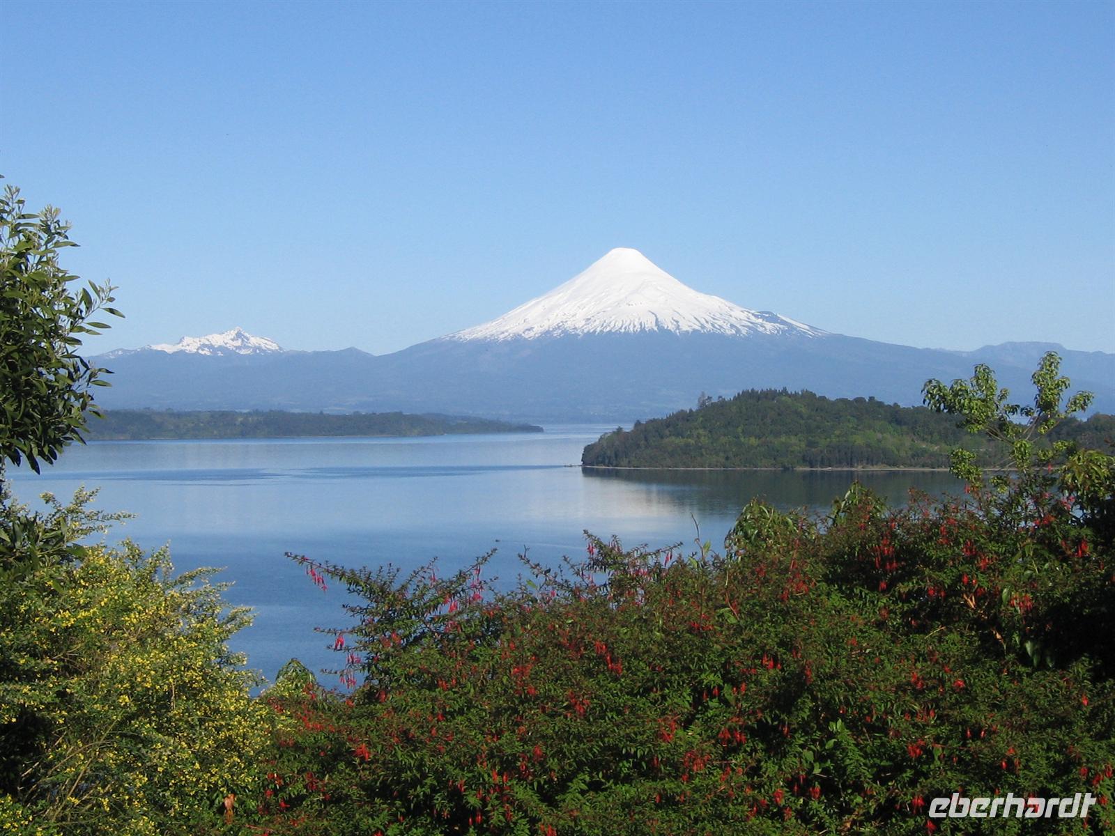 Heute fuhren wir bei strahlend blauem Himmel zur argentinischen Grenze. Es verlief alles reibungslos. Wir erreichten den Pass und befanden uns an der Schneegrenze. Einige konnten es nicht lassen und veranstalteten eine Schneeballschlacht. Auch an der chilenischen Grenze hatten wir Glück. Das ganze Gepäck wurde durchleuchtet. Wir setzten unser schönstes Lächeln auf und ohne Probleme konnten wir die Grenze passieren. Oh Schreck auf einmal war unsere Isolde weg. Nach einigen hundert Metern wurde Sie vermisst. Schnell fuhren wir zurück zur Grenze und nahmen eine glückliche Isolde wieder auf. Wir nutzten das schöne Wetter und legten bei jeder sich bietenden Gelegenheit einen Fotostopp ein. Es boten sich uns sehr schöne Ausblicke auf die Vulkane und die Seen. Etwas spät erreichten wir das Restaurant „Vogelscheuche“. Von außen sah es eigentlich nicht wie ein gemütliches Lokal aus. Aber wir wurden eines Besseren belehrt. Besitzer des Restaurants sind deutsche Auswandern. Es gab ein sehr gutes Buffet mit verschiedenen Salaten, Beilagen und als Spezialität am Spieß gebratenes Wildschein. Ein leckeres Dessertbuffet mit frischem Kaffee rundete das sehr gute Essen ab. Zur Verdauung luden wir die Gäste zu einem argentinischen Whisky mit sehr schönem Blick auf die Vulkane ein. Wir erreichen Porte Verde - unser Hotel lag direkt am Llanquihue-See und war nicht weit vom Zentrum entfernt. Wir hatten Zeit für einen Bummel und suchten schöne Fotomotive. Einige Gäste trafen sich am Abend zu einem Pisco. Ein sehr schöner Tag ging zu Ende.