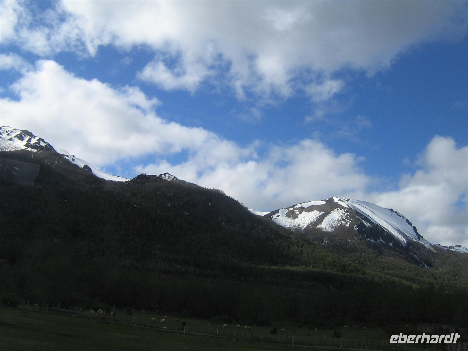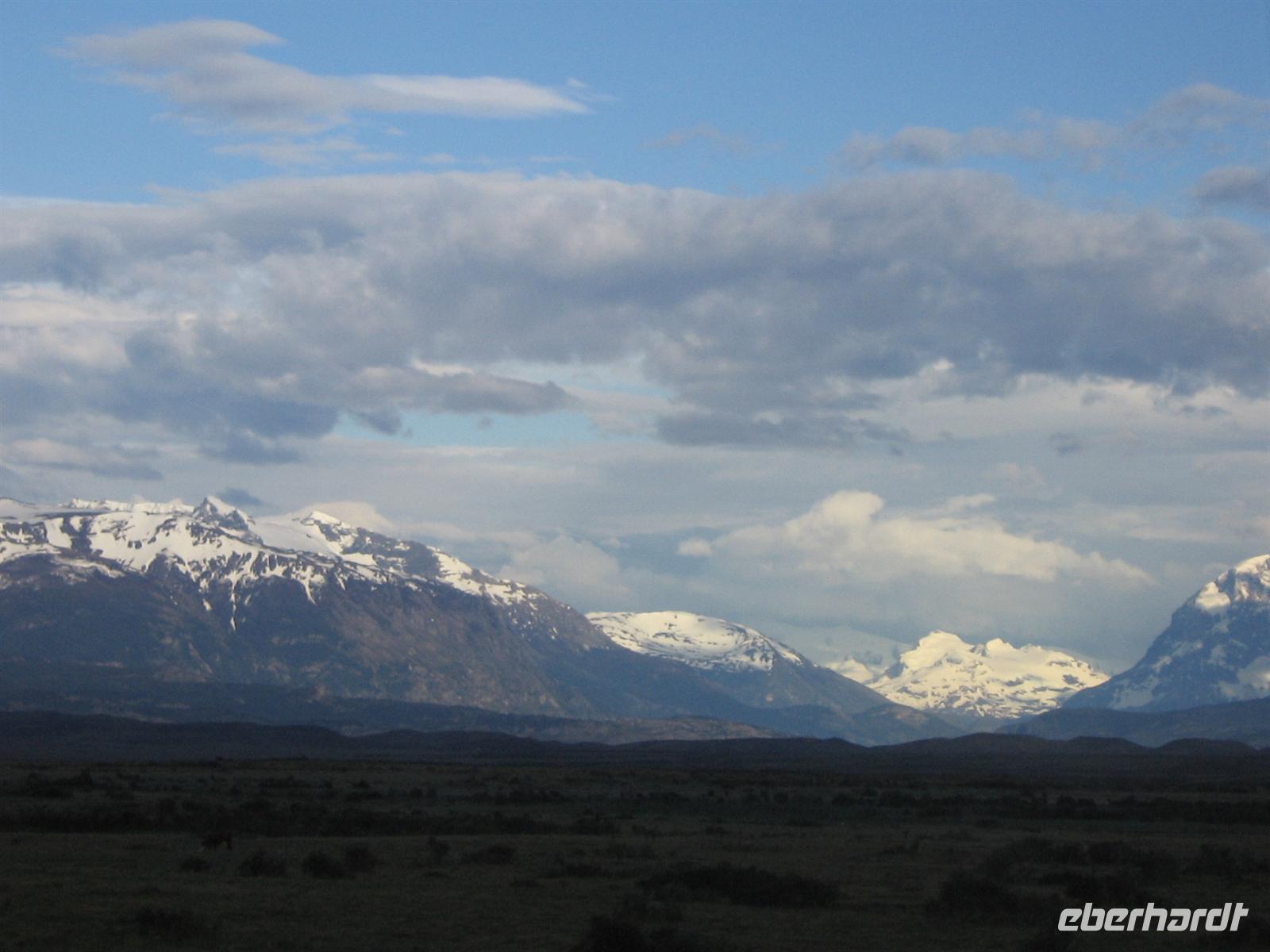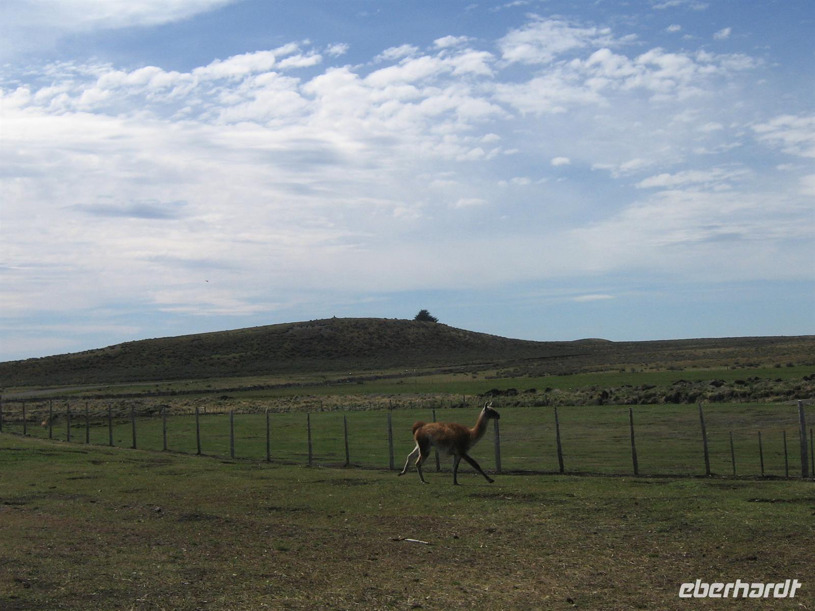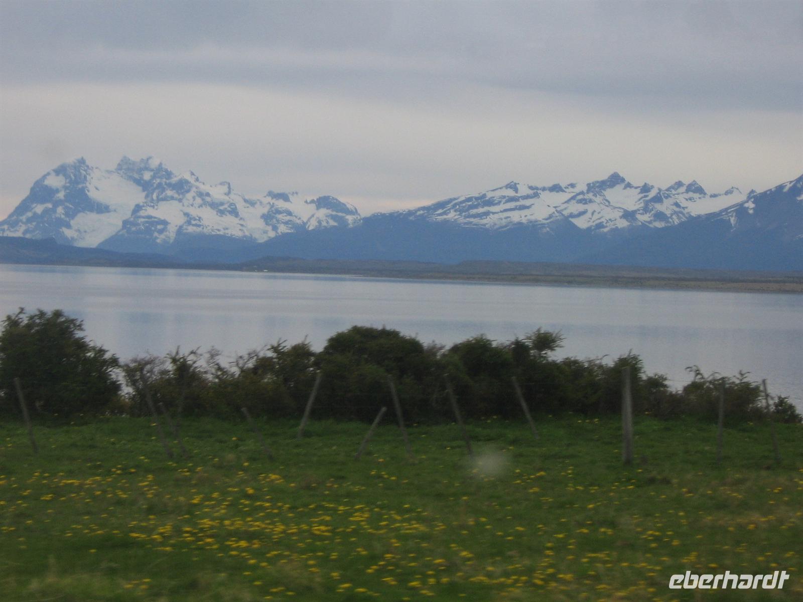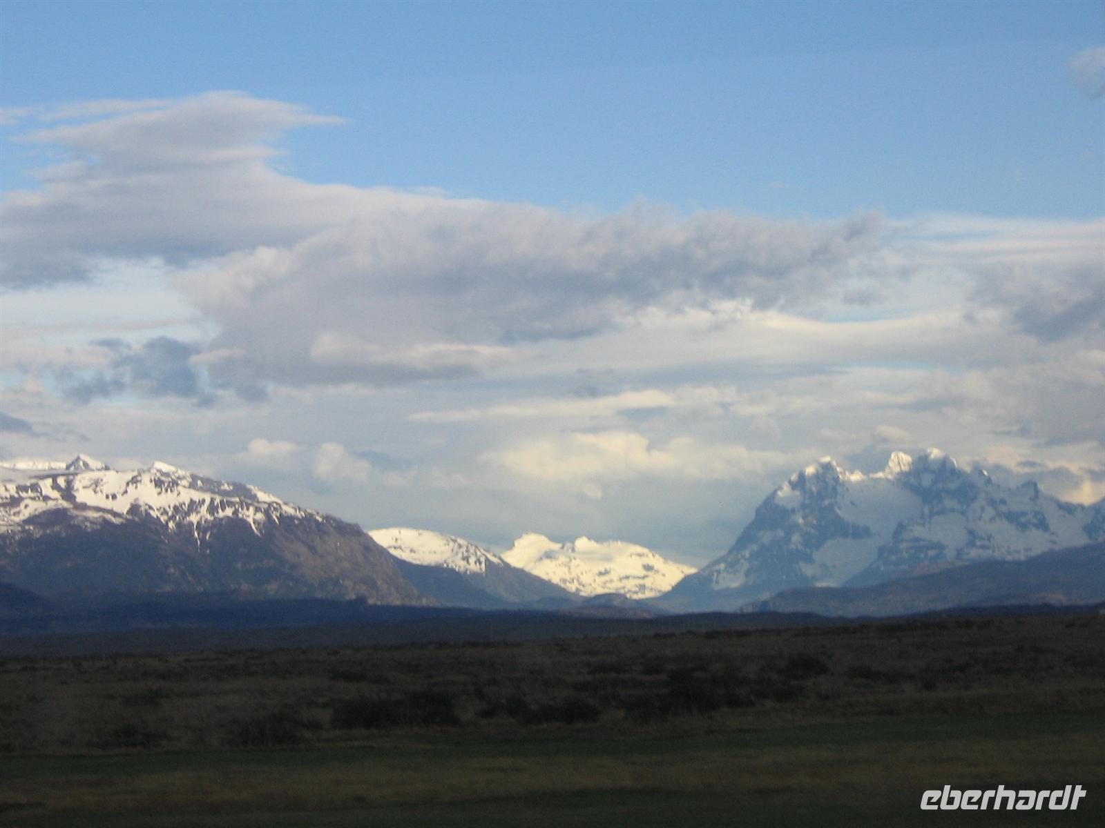 Wieder hieß es Koffer packen. Vom Flughafen Porte Mont flogen wir nach Punte Arenas. Es erwartete uns ein sehr schöner Flug, besonders für alle, die einen Fensterplatz hatten. Wir flogen über schneebedeckte Berge und verschiedene Gletscher. Sehr schön konnte man die Gletscherzungen sehen. Kristin musste gleich an das Lied von Reinhard May denken „Über den Wolken muss die Freiheit wohl Grenzenlos sein“. Die letzten Tage hatte es hier geregnet, doch heute wurden wir mit schönem Wetter begrüßt. Unser Besuch bei den Pinguinen musste leider ausfallen. Irgendwie hatten Sie noch keine Landeerlaubnis, sie sind noch nicht angekommen und so war der Park noch geschlossen. Deshalb fuhren wir zu einer Nandu-Farm. Hier konnten wir auch weitere Tierarten beobachten. Zur Überraschung gab es für alle einen kleinen Snack. Eine gefüllte Teigtasche, Limonade und Bier. Danach setzten wir unsere Fahrt nach Puerto Natales fort. Es lagen 250 Kilometer vor uns. Nach den Anden mit schönen schneebedeckten Bergen sahen wir auf dieser Fahrt eine ganz andere Landschaft - Steppe mit Schafen und Magelan-Gänsen. Je näher wir unserem Ziel kamen so freier wurde unser Blick auf die Cordilera Riesco. Wir erreichten den kleinen Ort Puerto Natales, der sich in den letzten Jahren gemausert hat. Er liegt an der Bucht der Hoffnung und gilt als Ausgangsort für den Besuch des Park Torres del Paine.
