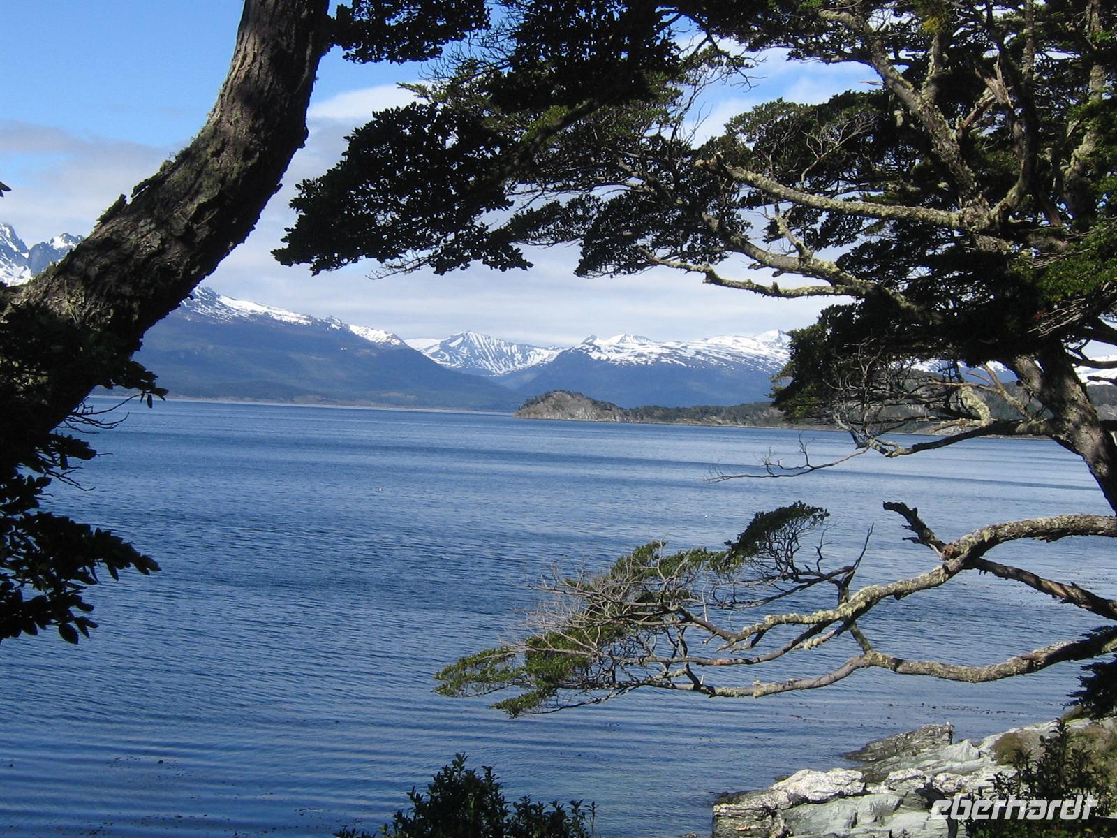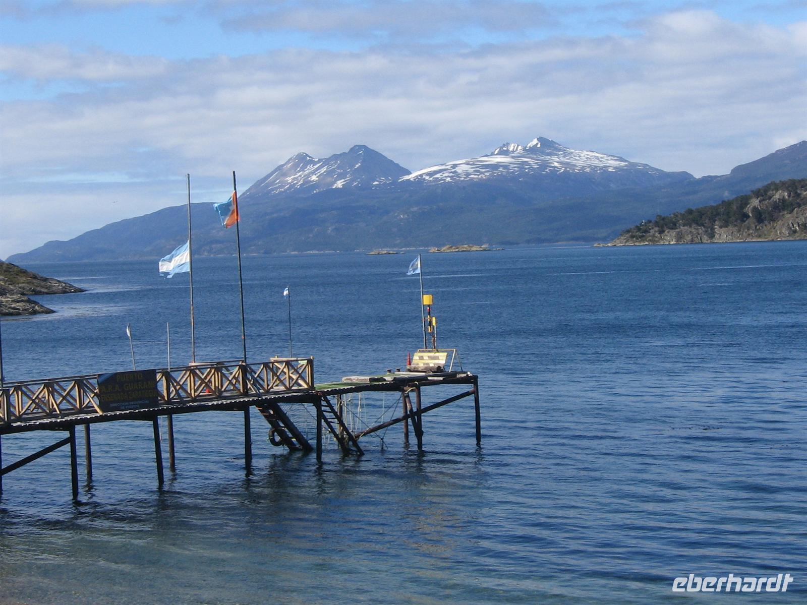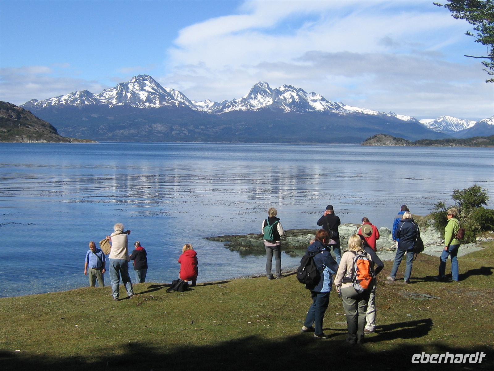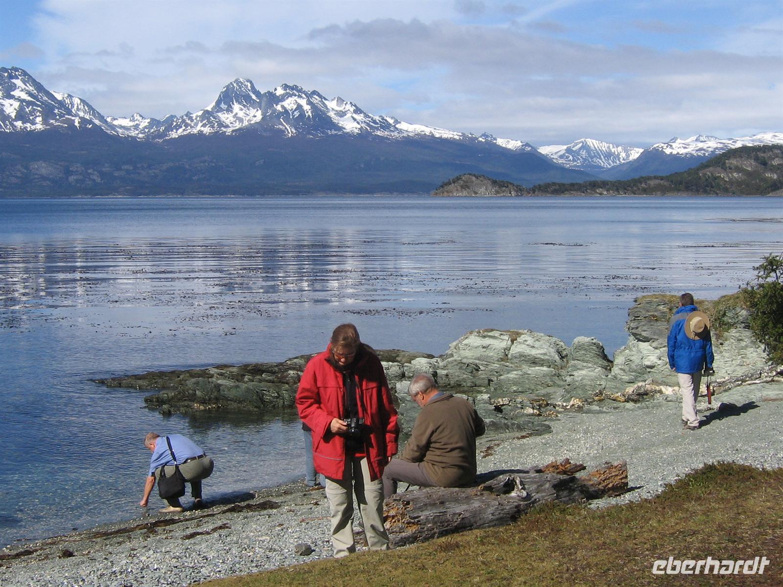 Heute klingelte der Wecker sehr zeitig. Wir fuhren nach Puente Arena zum Hafen. Unterwegs improvisierten wir ein kleines Frühstück im Bus. Mit der Fähre überquerten wir die Magelan-Straße, bei ruhiger See und schönem Wetter, und erreichten Porvenir. Jetzt war es nicht mehr weit bis zur chilenischen Grenze in San Sebastian. Vorher präsentierten wir unser organisiertes Picknick direkt am Atlantik. Neben Wurst und Käse wurden auch selbst hergestellte Sushi gereicht. Da wir gestern wunderschönes Wetter im Nationalpark vorfanden, löste Jürgen seine Wette ein und spendierte die Getränke. Wir erreichen Feuerland, das seinen Namen von seinem Entdecker Magellan bei der Umseglung der Meerenge hat. Er sah in der Dunkelheit die Ufer sehr erhellt von flackernden Feuern. Wir erreichen Rio Grande am Atlantischen Ozean. Jetzt liegen bis nach Ushuaia noch 200 Kilometer vor uns. Es sind alles Asphaltstraßen, jedoch darf man an einigen Stellen nur mit einer Geschwindigkeit von 40 bzw. 60 Kilometer pro Stunde fahren. Wir verließen die Steppenlandschaft und sahen wieder schneebedeckte Berge und tiefe Schluchten. Viele tote Bäume sind ein Zeichen dafür, dass hier Biber ganze Arbeit geleistet haben. Sie wurden aus Kanada mitgebracht. Von ehemals 25 Bibern ist die Population heute auf ca. 3.000 angewachsen. Da sie keine natürlichen Feinde haben, können sie sich schnell vermehren. Nach einer langen Fahrt erreichten wir endlich Ushuaia. Wir waren alle sehr müde und so gingen wir nach dem Abendessen gleich schlafen.