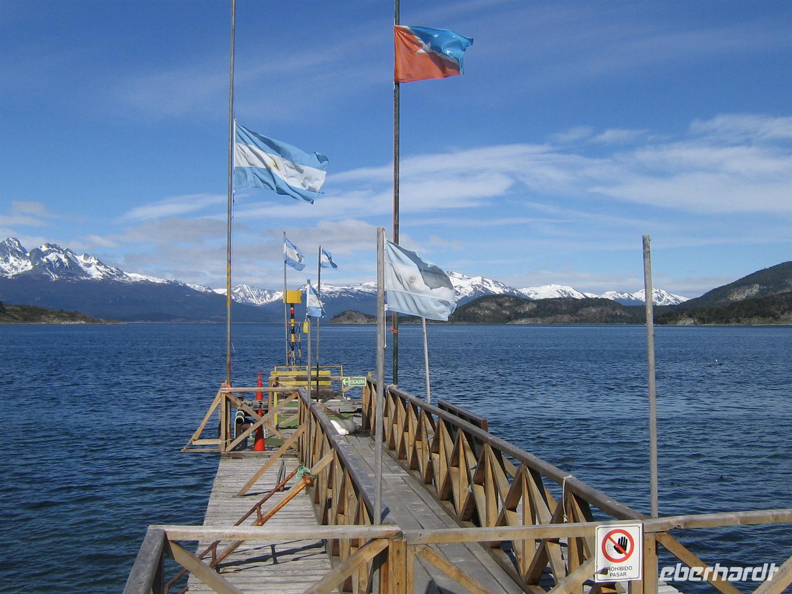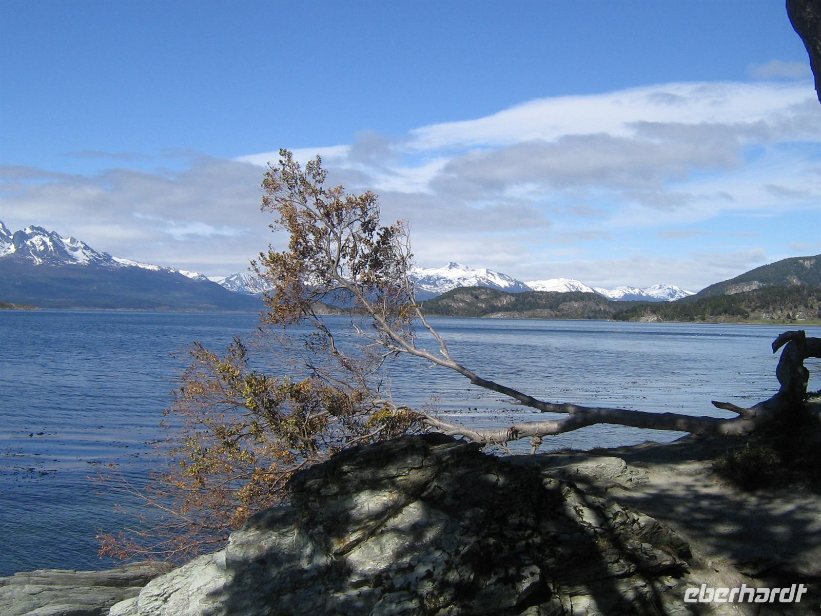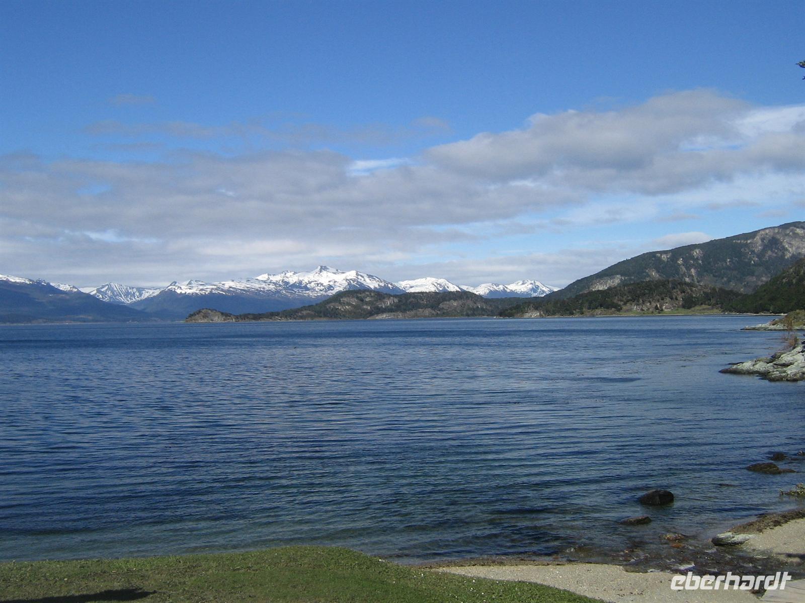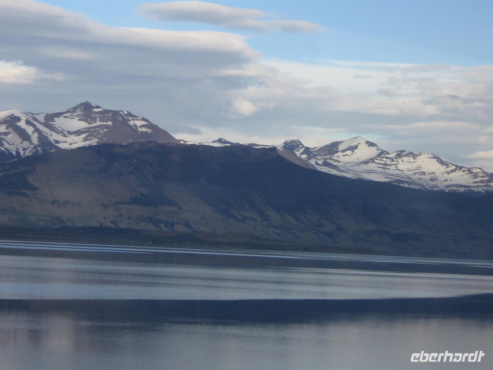 Heute klingelte der Wecker sehr zeitig. Wir fuhren nach Puente Arena zum Hafen. Unterwegs improvisierten wir ein kleines Frühstück im Bus. Mit der Fähre überquerten wir die Magelan-Straße, bei ruhiger See und schönem Wetter, und erreichten Porvenir. Jetzt war es nicht mehr weit bis zur chilenischen Grenze in San Sebastian. Vorher präsentierten wir unser organisiertes Picknick direkt am Atlantik. Neben Wurst und Käse wurden auch selbst hergestellte Sushi gereicht. Da wir gestern wunderschönes Wetter im Nationalpark vorfanden, löste Jürgen seine Wette ein und spendierte die Getränke. Wir erreichen Feuerland, das seinen Namen von seinem Entdecker Magellan bei der Umseglung der Meerenge hat. Er sah in der Dunkelheit die Ufer sehr erhellt von flackernden Feuern. Wir erreichen Rio Grande am Atlantischen Ozean. Jetzt liegen bis nach Ushuaia noch 200 Kilometer vor uns. Es sind alles Asphaltstraßen, jedoch darf man an einigen Stellen nur mit einer Geschwindigkeit von 40 bzw. 60 Kilometer pro Stunde fahren. Wir verließen die Steppenlandschaft und sahen wieder schneebedeckte Berge und tiefe Schluchten. Viele tote Bäume sind ein Zeichen dafür, dass hier Biber ganze Arbeit geleistet haben. Sie wurden aus Kanada mitgebracht. Von ehemals 25 Bibern ist die Population heute auf ca. 3.000 angewachsen. Da sie keine natürlichen Feinde haben, können sie sich schnell vermehren. Nach einer langen Fahrt erreichten wir endlich Ushuaia. Wir waren alle sehr müde und so gingen wir nach dem Abendessen gleich schlafen.