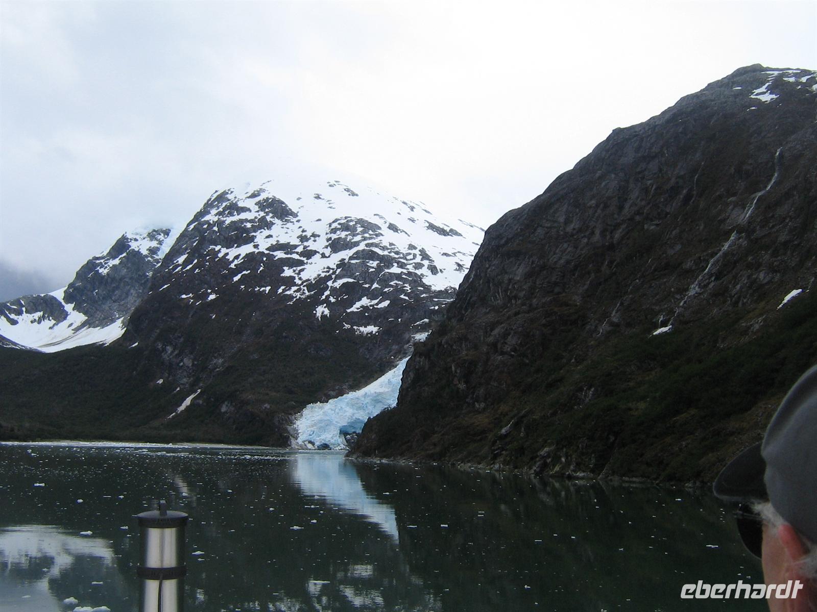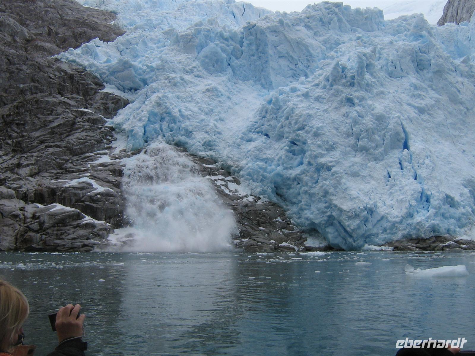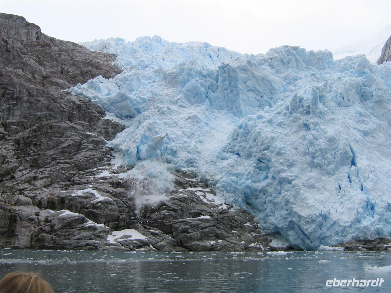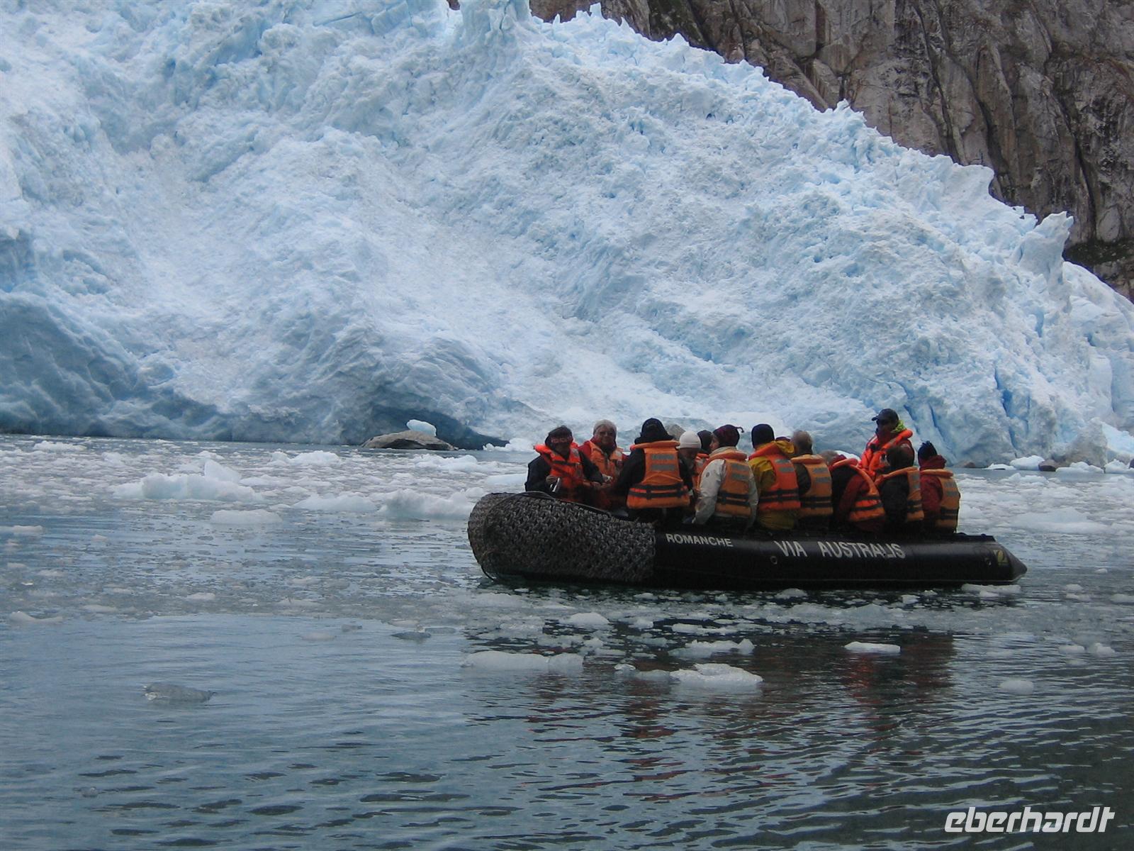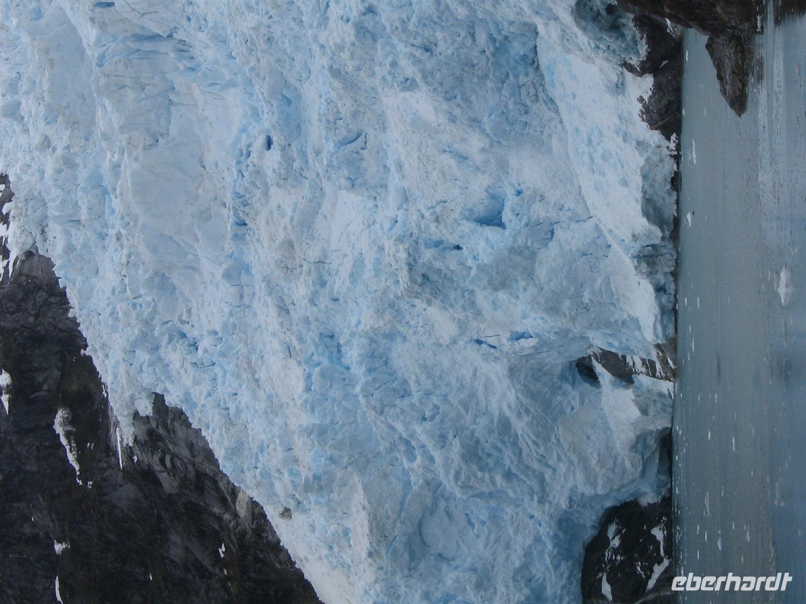 Ein etwas trüber Tag konnte uns die Laune nicht verderben. Wir erreichten den Günter-Plüschow- Gletscher und fuhren mit dem Schiff sehr nah heran. Die Kameras klickten ohne Ende. Jeder wollte das beste Motiv erhaschen. Der Bootsmann versuchte uns die Kunst der Schiffsknoten zu erlernen. Aber die Mühe war vergebens ... Mit vielen Verrenkungen gelang uns zwar der eine oder andere ... Am Nachmittag lauschten wir einem Vortrag über Flora und Fauna Patagoniens und die Magelan-Straße. Der Höhepunkt des Tages war jedoch der Besuch des Piloto-Gletschers. Mit Schlauchbooten fuhren wir in eine Bucht und konnten Blauaugenscharben-Komerane beobachten. Je näher wir dem Gletscher kamen, umso faszinierender wurde der Anblick. Es war zwar bewölkt aber für unsere Fotomotive das ideale Wetter. Dadurch kam das Blau der Gletscher voll zur Geltung. Es war gerade ganz still und alle schauten auf diesen Anblick als wir ein Donnern vernahmen. Die Kameras gingen schnell in Stellung und wir konnten den Gletscher beim Kalben sehen. Eismassen lösten sich vom Gletscher und donnerten in den Fjord. Man konnte erahnen was für eine Wucht dahinter stand. Auch heute hatten wir wieder Glück mit dem Wetter, denn eigentlich regnet es hier fast immer. Zurück an Bord wartete ein Drink auf uns.