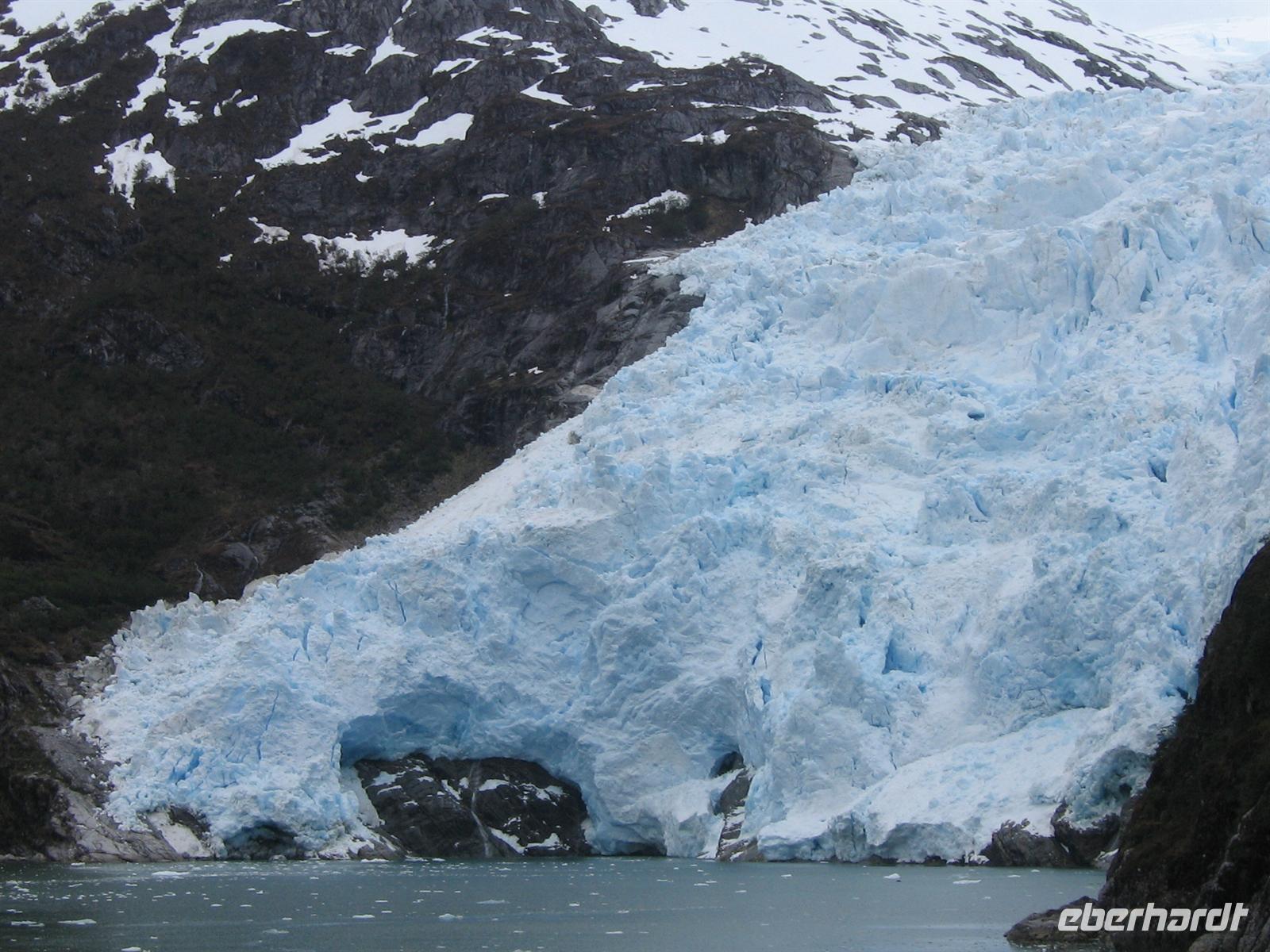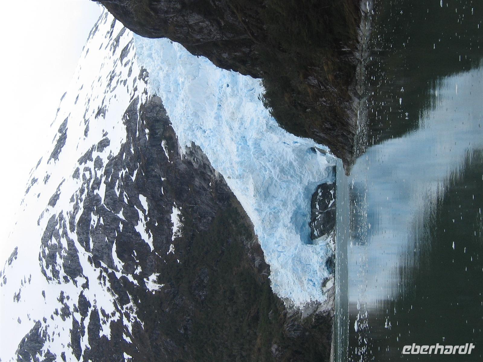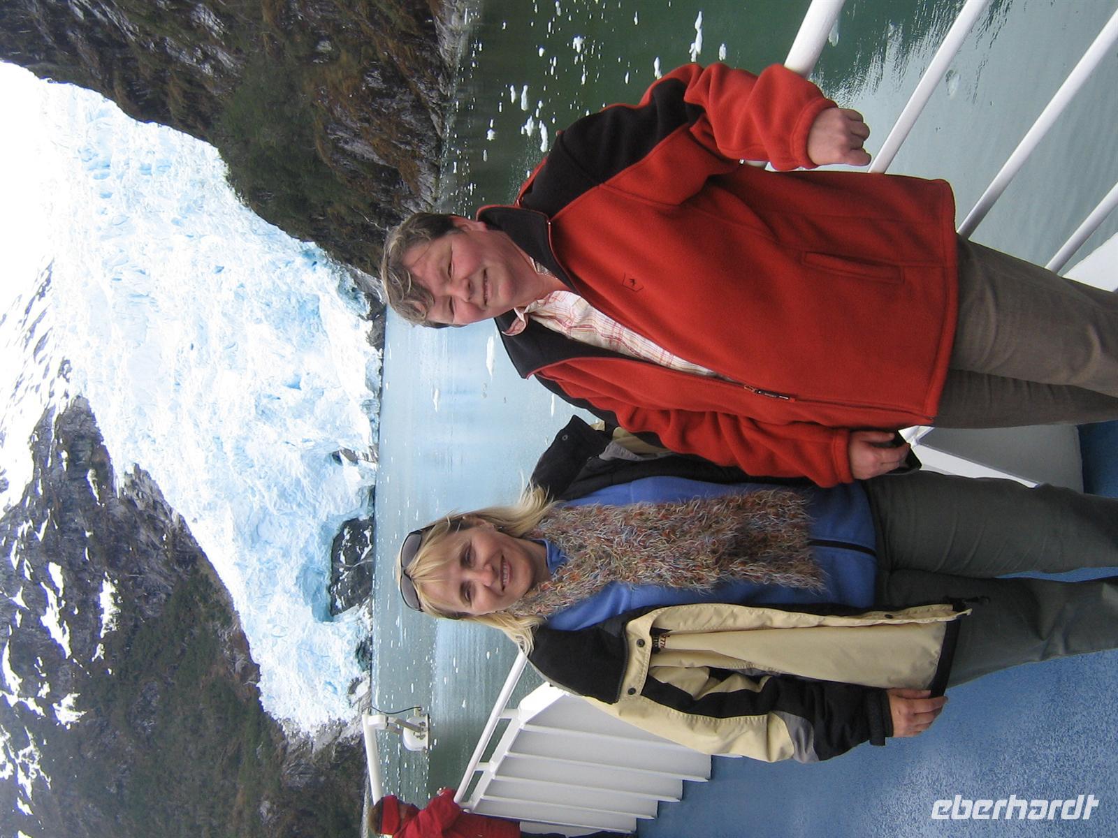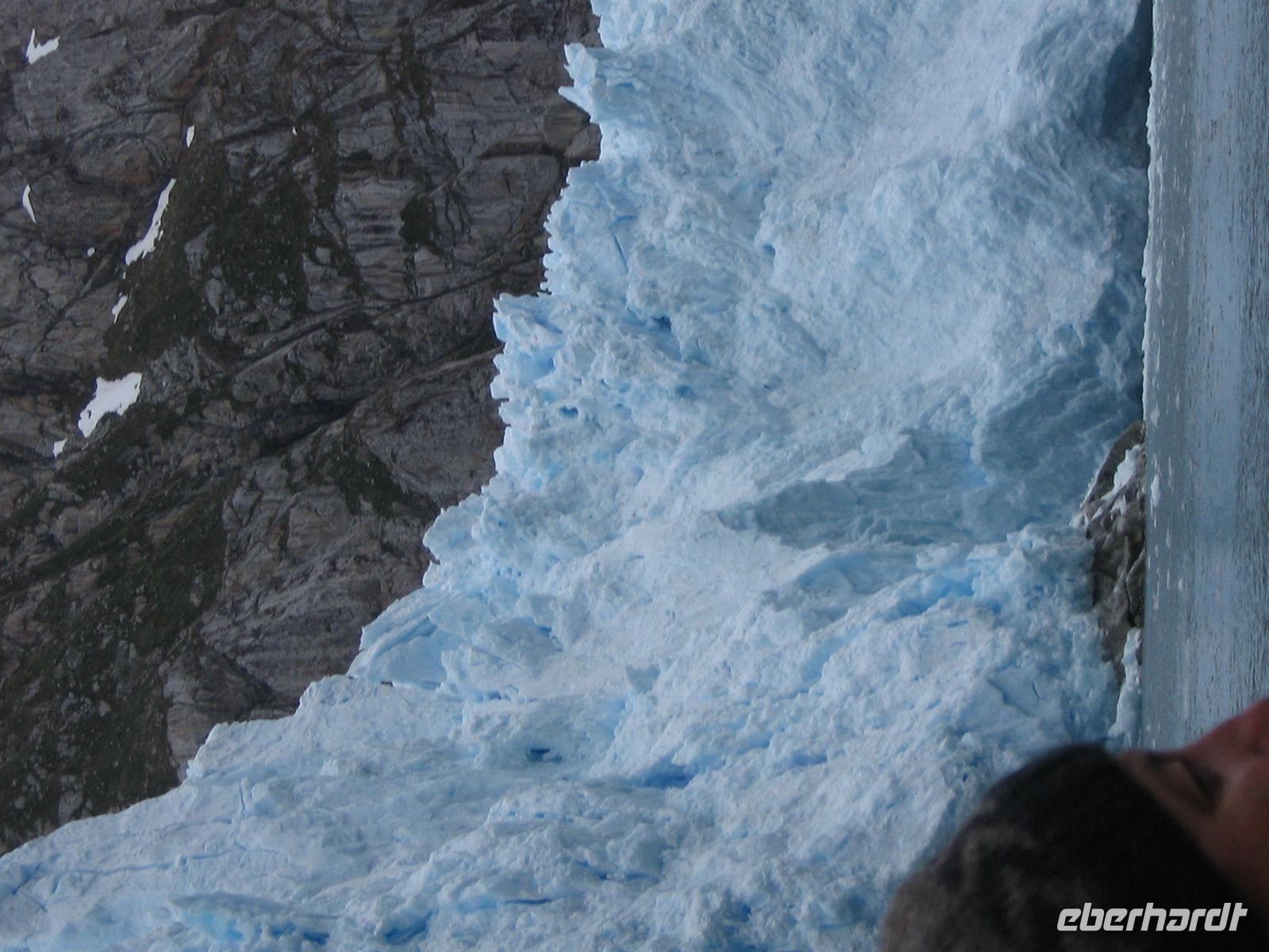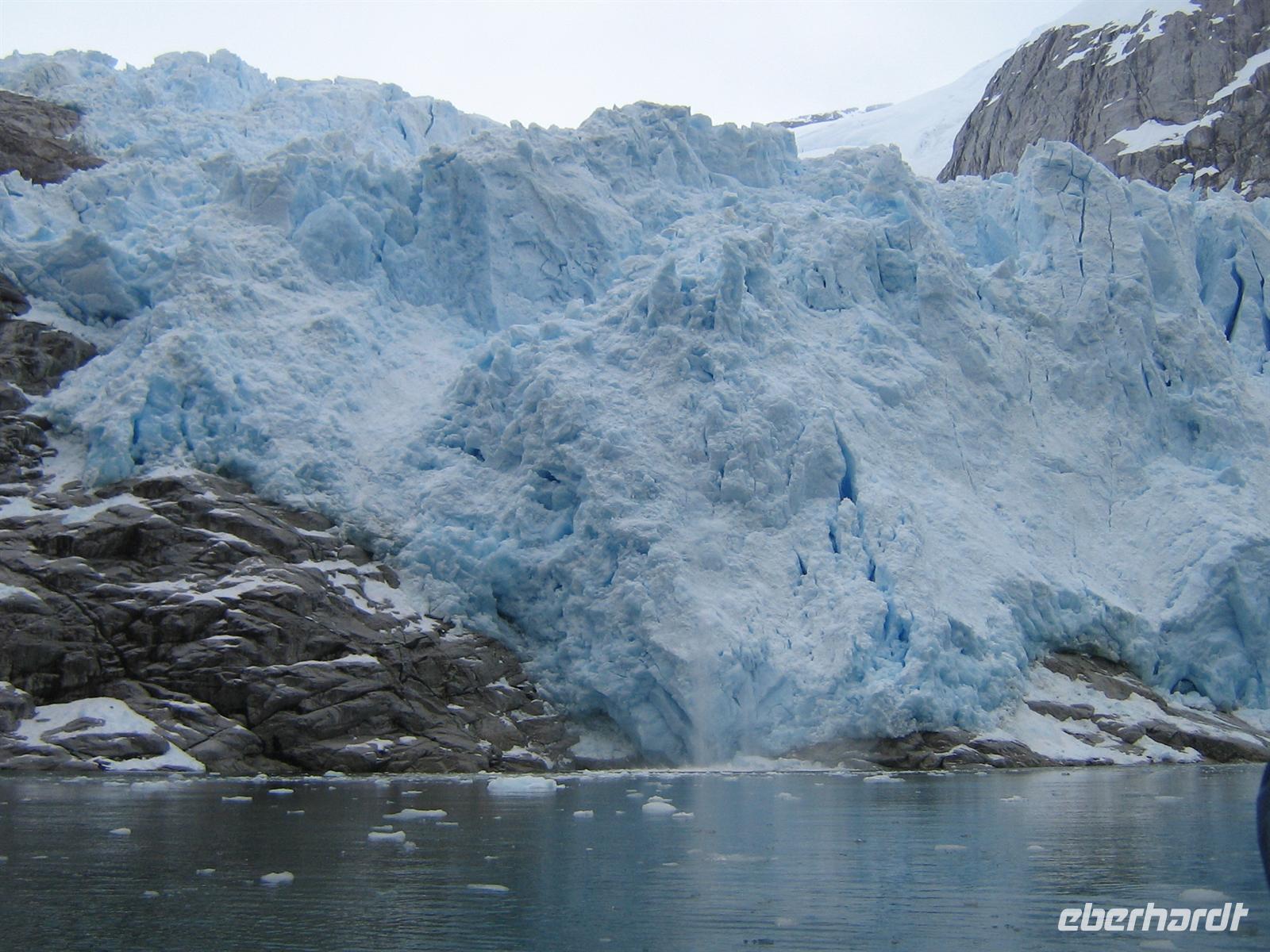 Ein etwas trüber Tag konnte uns die Laune nicht verderben. Wir erreichten den Günter-Plüschow- Gletscher und fuhren mit dem Schiff sehr nah heran. Die Kameras klickten ohne Ende. Jeder wollte das beste Motiv erhaschen. Der Bootsmann versuchte uns die Kunst der Schiffsknoten zu erlernen. Aber die Mühe war vergebens ... Mit vielen Verrenkungen gelang uns zwar der eine oder andere ... Am Nachmittag lauschten wir einem Vortrag über Flora und Fauna Patagoniens und die Magelan-Straße. Der Höhepunkt des Tages war jedoch der Besuch des Piloto-Gletschers. Mit Schlauchbooten fuhren wir in eine Bucht und konnten Blauaugenscharben-Komerane beobachten. Je näher wir dem Gletscher kamen, umso faszinierender wurde der Anblick. Es war zwar bewölkt aber für unsere Fotomotive das ideale Wetter. Dadurch kam das Blau der Gletscher voll zur Geltung. Es war gerade ganz still und alle schauten auf diesen Anblick als wir ein Donnern vernahmen. Die Kameras gingen schnell in Stellung und wir konnten den Gletscher beim Kalben sehen. Eismassen lösten sich vom Gletscher und donnerten in den Fjord. Man konnte erahnen was für eine Wucht dahinter stand. Auch heute hatten wir wieder Glück mit dem Wetter, denn eigentlich regnet es hier fast immer. Zurück an Bord wartete ein Drink auf uns.