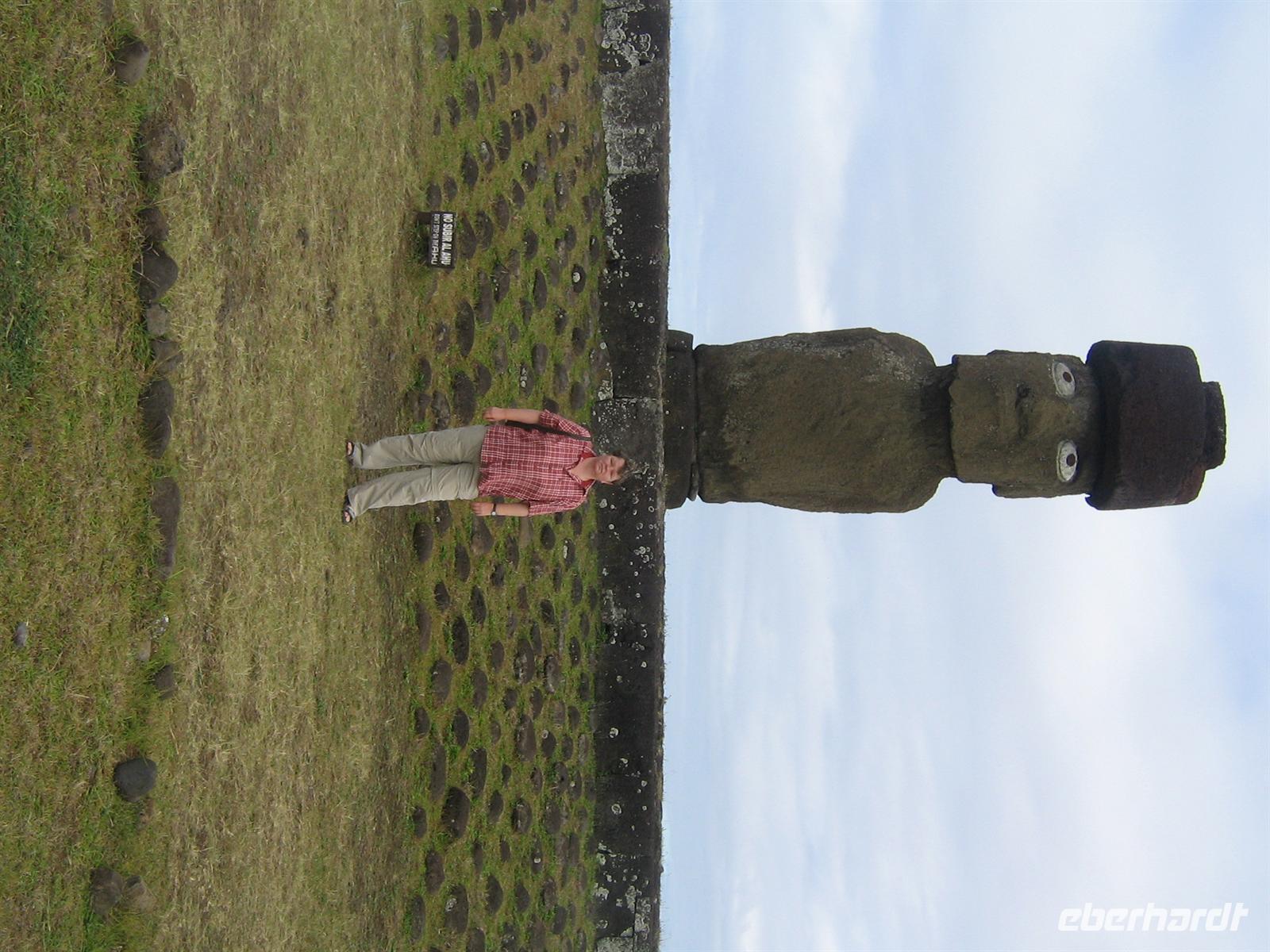 Hinter Ahu Hanga Tetenga fuhren wir zum Vulkankrater Rano Raruka. Auf dem Weg dahin begleiteten uns die gefallenen Riesen bis die wohl eindrucksvollste Fundstätte auftauchte. Die 70 Wächter, die bis zu den Schultern im Gras stehen, begleiteten uns bis zum Steinbruch. Wir besuchten den Steinbruch, wo die „moai“ aus dem Felsen geschlagen wurden. Einige Figuren waren noch nicht fertig gestellt und befanden sich noch im Felsen. Für uns unvorstellbar, wie diese Tonnen schweren Moai von hier transportiert wurden. Wir besichtigen danach den Vulkansee und konnten eine Pferdefamilie beobachten. Um eine noch bessere Aussicht zu bekommen, kletterten wir auf einen Hügel und konnten zwei Archäologinnen bei der Arbeit zu sehen. Auch hier wurden noch weitere Moai gefunden, die jetzt freigelegt werden. Wir konnten feststellen, das ca. 1 Drittel der Moai sich noch in der Erde befinden. Anschließend hatten wir ein Picknick direkt am Steinbruch. Zur Verdauung reichte ich einen Whisky. Der nächste Höhepunkt wartete auf uns, der Ahu Tongariki mit 15 Moai, die direkt am Meer stehen. Durch eine Seebeben waren Sie in den sechziger Jahren alle umgefallen, zum Teil weit weg gespült und zerstört. Erst 1993 wurden sie mit einem Spezialkran aus Japan aufgerichtet. Ein kurzer Abstecher führte uns nach Vinapu. Alle freuten sich schon auf ein kühles Bad im Pazifik. Am weißen Strand von Anakena nutzten wir die Gelegenheit. Ein gutes Abendessen in einem Fisch-Restaurant direkt am Pazifik rundete diesen Tag ab.