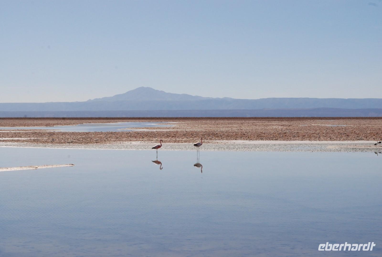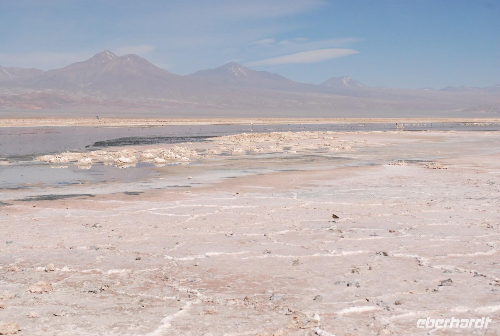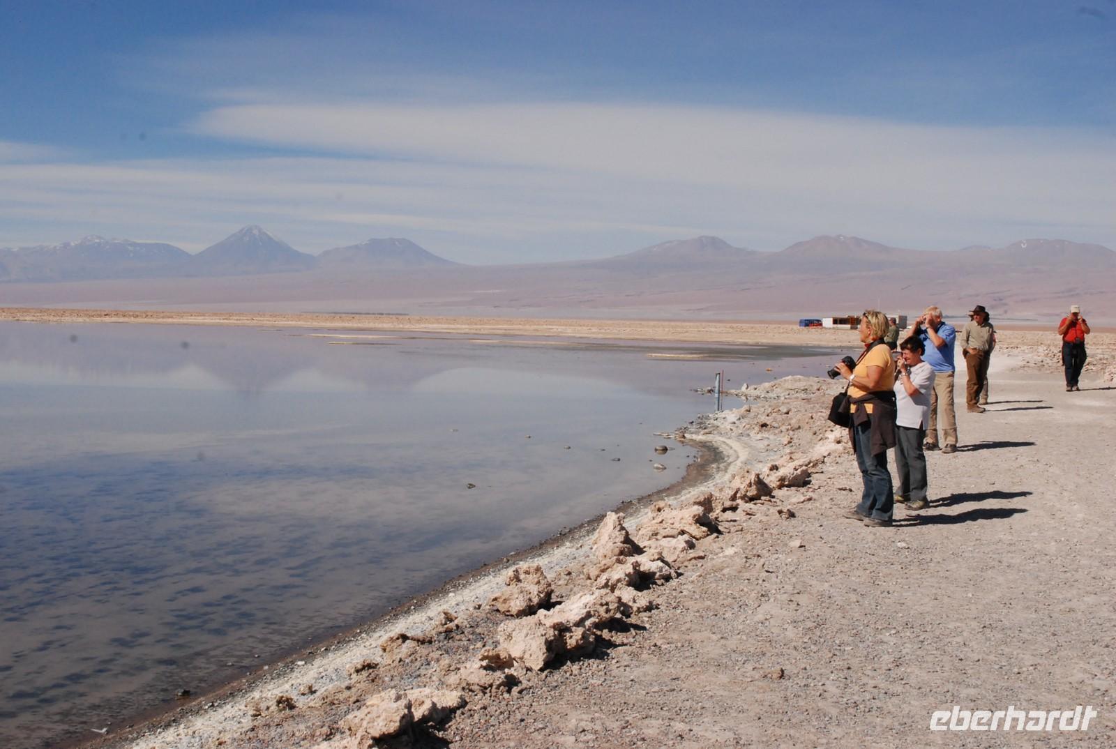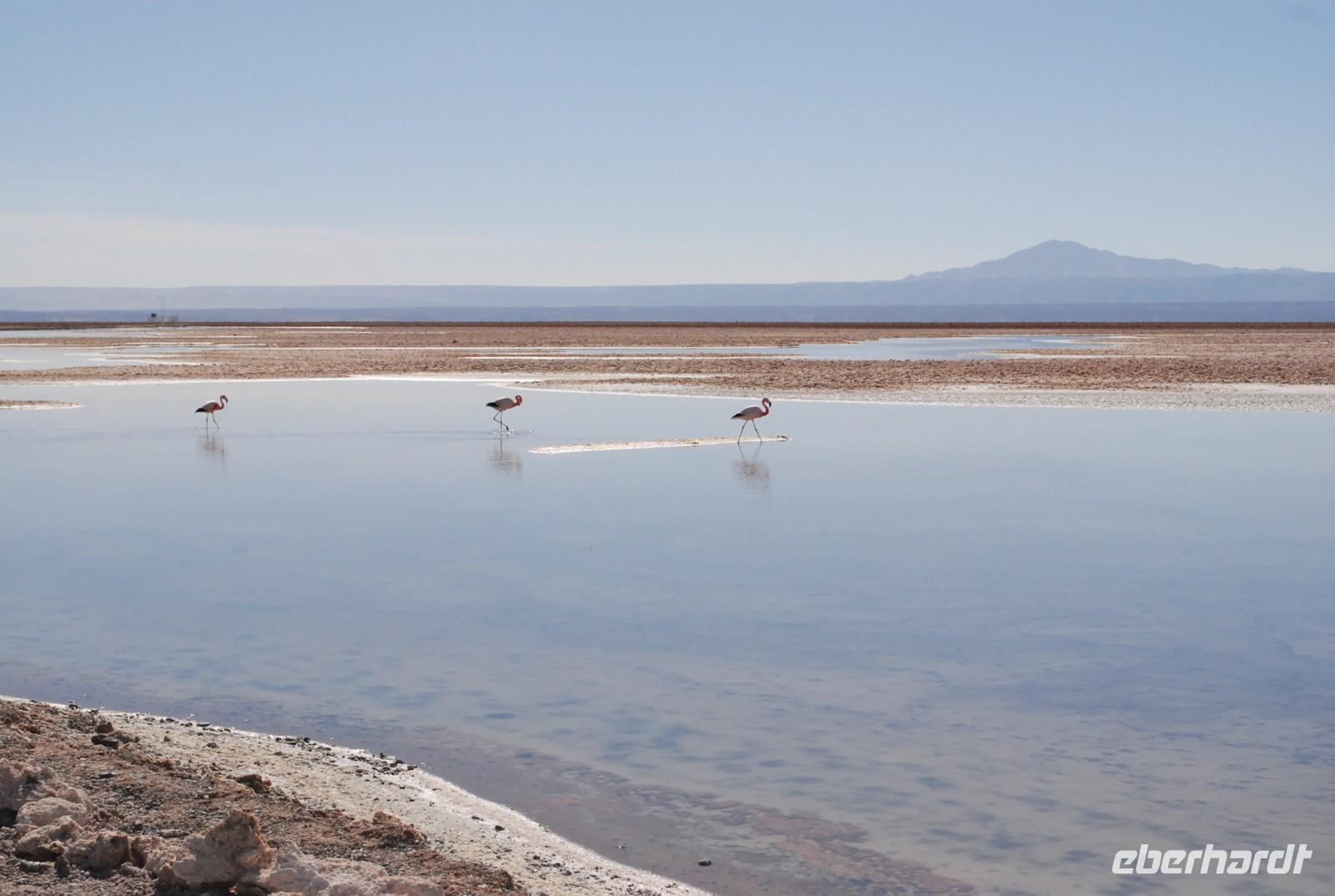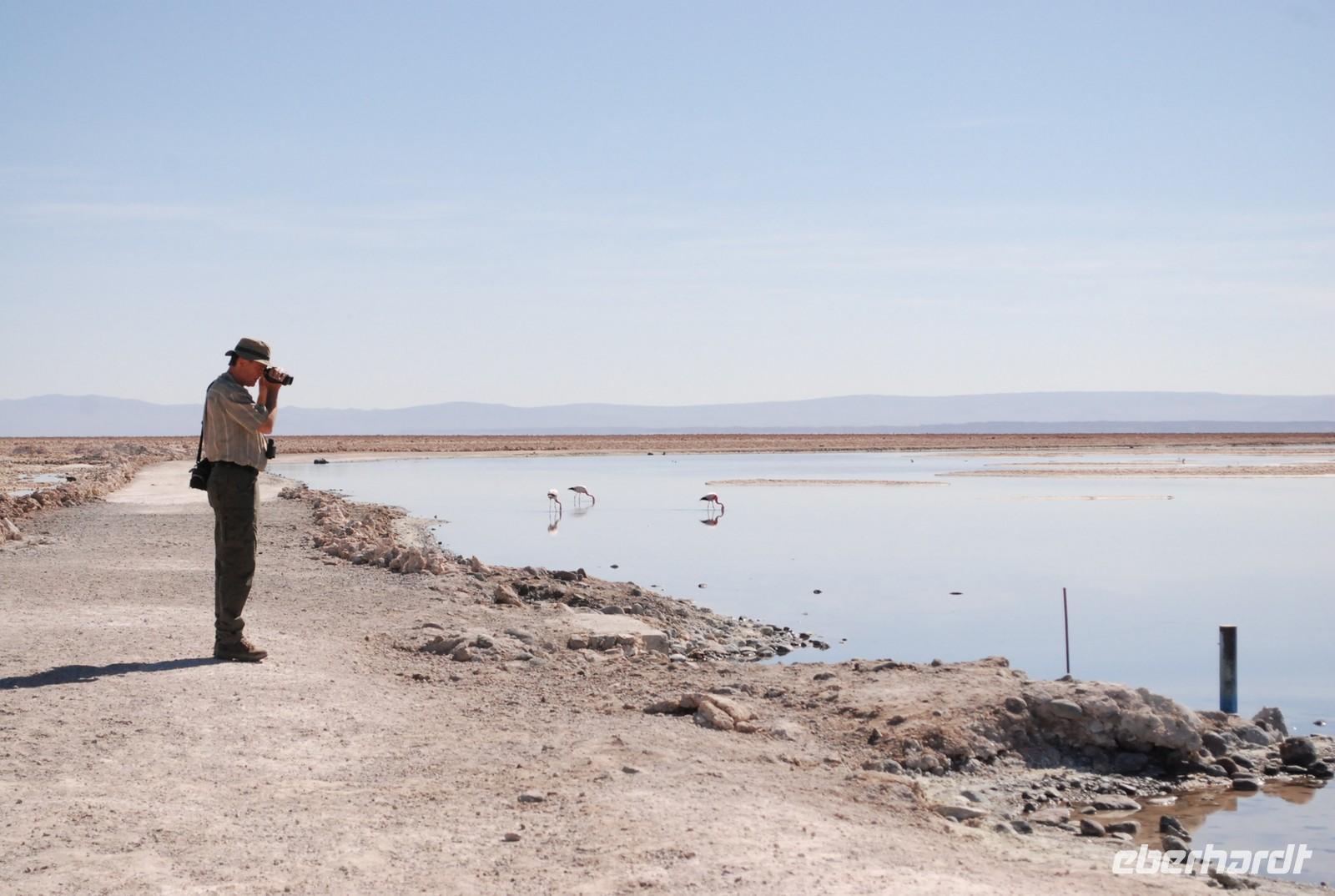 Heute beginnen wir unseren Tag mit einem Rundgang in San Pedro. Wir besichtigen die Kirche, deren Dachkonstruktion aus Kakteenholz angefertigt wurde, und wir "stürmen" die Post. Wir reisen nun in Richtung Süden und passieren als erstes das Dorf Socaire, wo wir in der Schlucht allerhand Blühendes entdecken und einen Gottesdienst zu Ehren San Lucas auf dem Marktplatz erleben. Über Socaire fahren wir nun auf 4000 Meter Höhe und werden hier von den letzten Überresten des Schnees überrascht. Die blau schimmernden Lagunen Miscanti und Miniques liegen wunderschön zwischen den gleichnamigen Vulkanen. Wir laufen bei circa 7 Grad Celsius dick eingepackt in Richtung Picknickplatz und werden zu einem gesunden Buffet mit Salaten, Pebre und frischer Lasagne und Braten eingeladen. Dazu ein Schlückchen Rotwein und die Höhe lässt sich ganz gut aushalten. Am Nachmittag befinden wir uns dann wieder auf circa 2400 Metern Höhe und besuchen die Lagune Chaxa inmitten des Atacama-Salzsees. Die Lagunen, die Flamingos, die unwirkliche Umgebung des Salzsees und die Andengipfel im Hintergrund - ein einmaliges Erlebnis! Wieder zurück in San Pedro lassen wir den Abend gemütlich ausklingen!