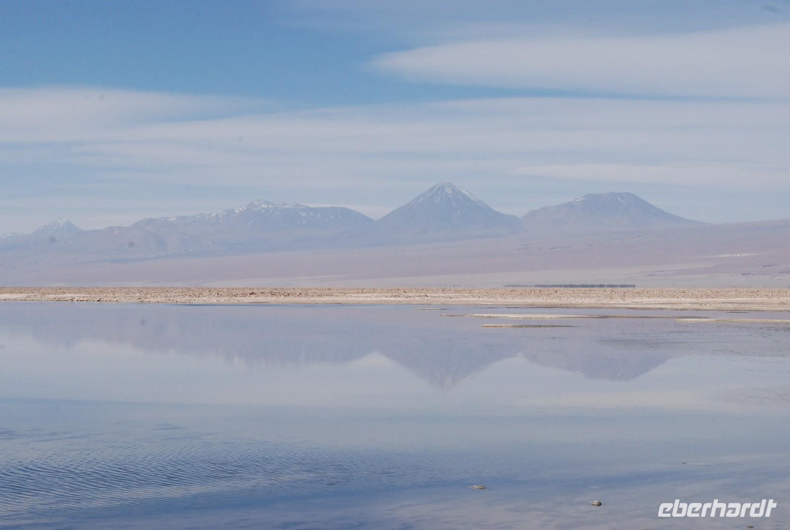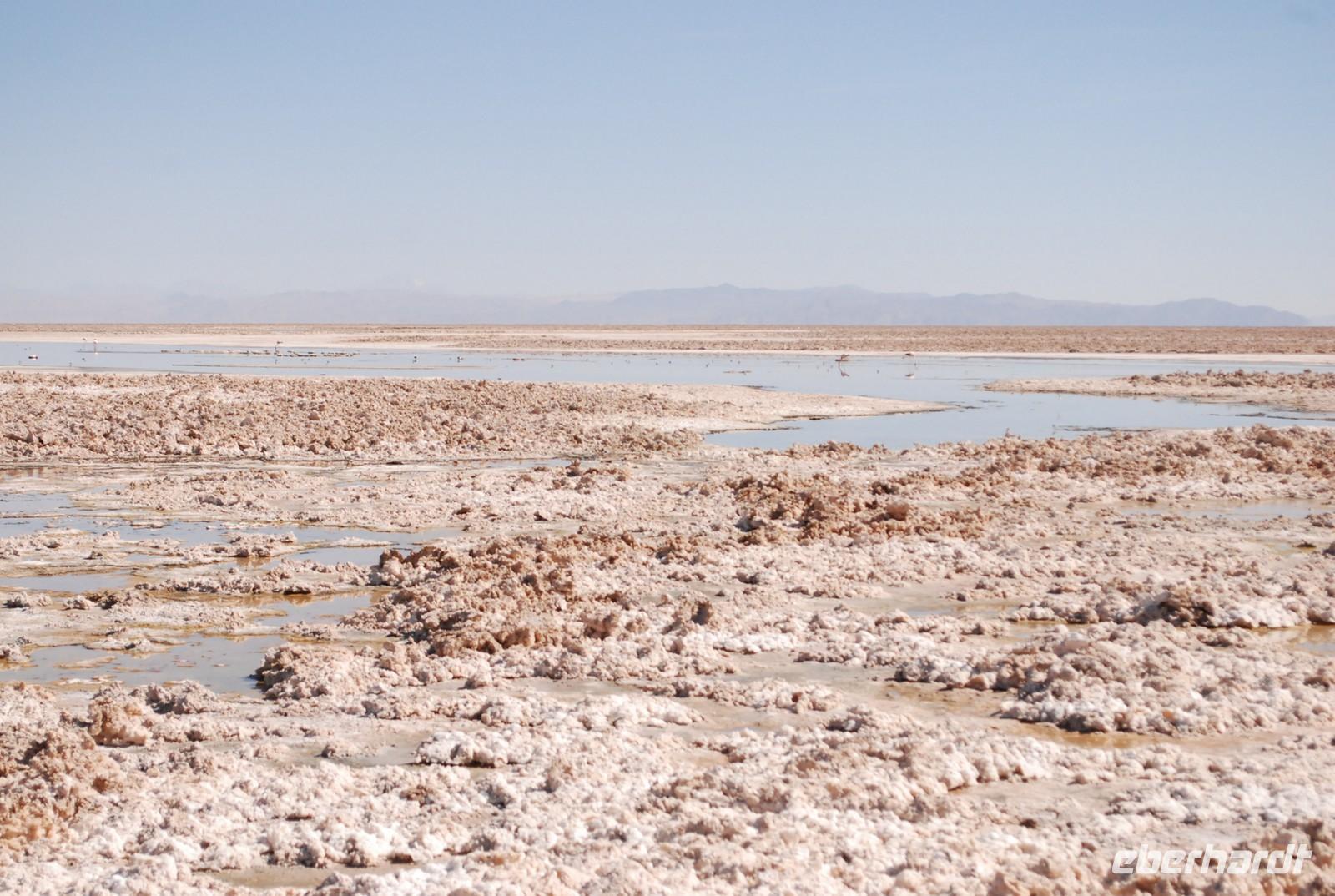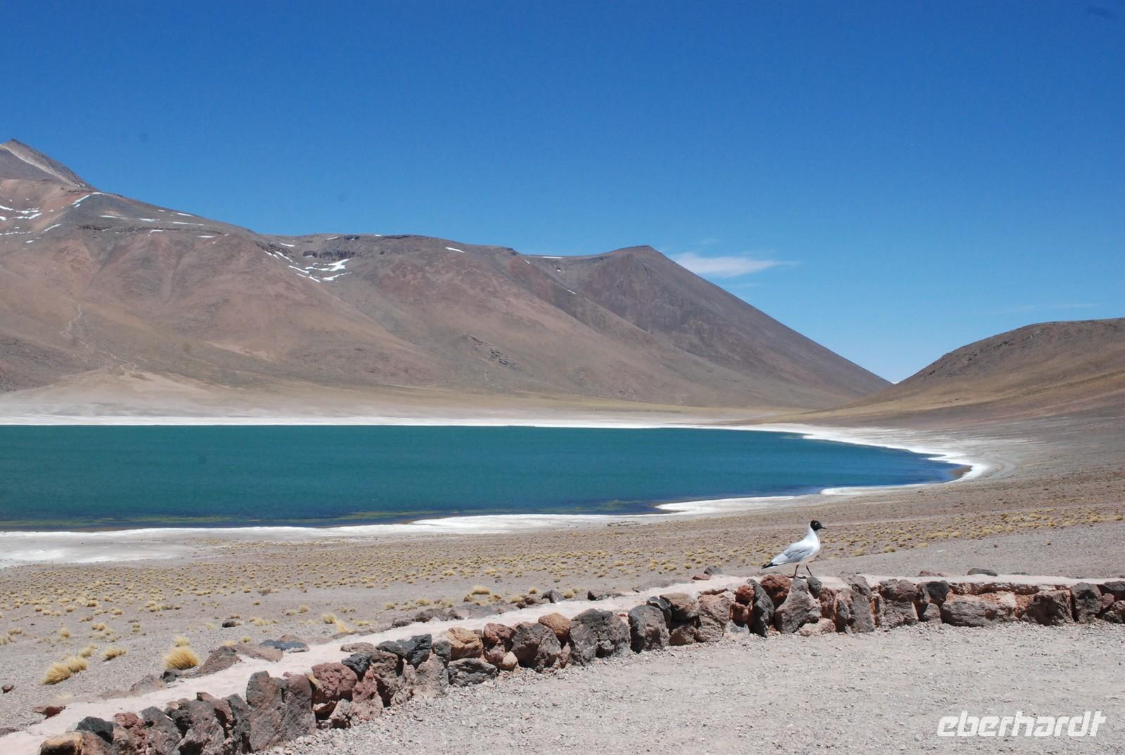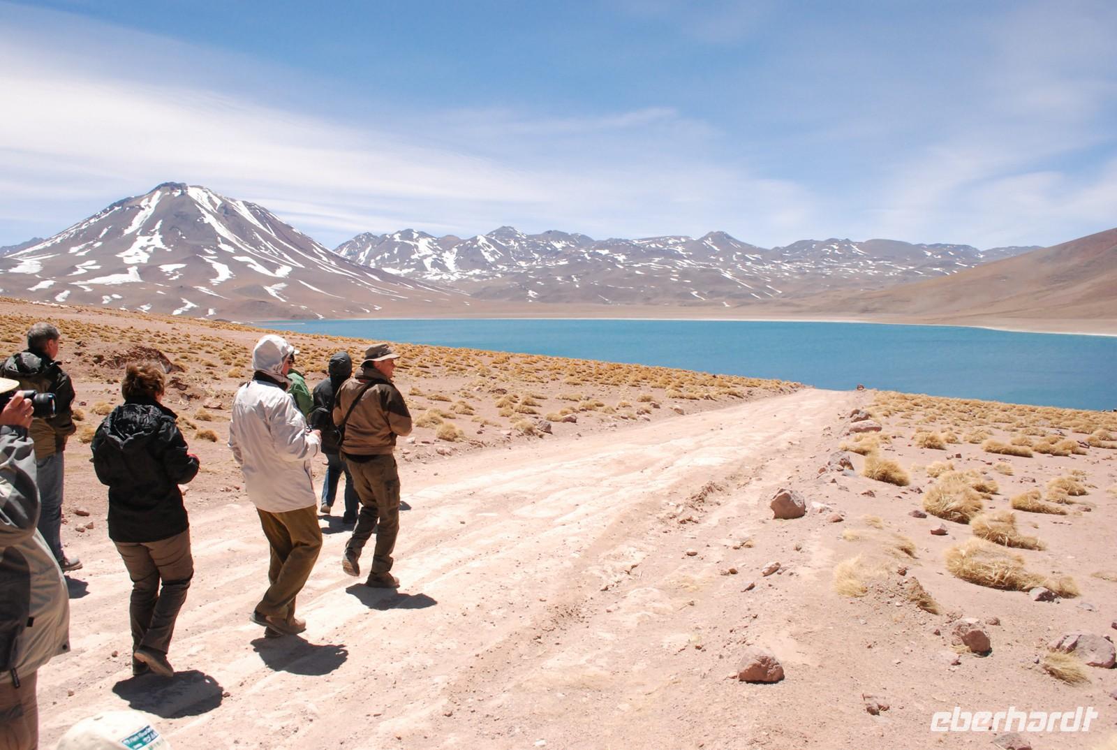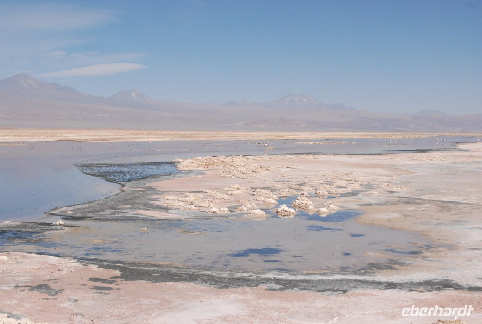 Heute beginnen wir unseren Tag mit einem Rundgang in San Pedro. Wir besichtigen die Kirche, deren Dachkonstruktion aus Kakteenholz angefertigt wurde, und wir "stürmen" die Post. Wir reisen nun in Richtung Süden und passieren als erstes das Dorf Socaire, wo wir in der Schlucht allerhand Blühendes entdecken und einen Gottesdienst zu Ehren San Lucas auf dem Marktplatz erleben. Über Socaire fahren wir nun auf 4000 Meter Höhe und werden hier von den letzten Überresten des Schnees überrascht. Die blau schimmernden Lagunen Miscanti und Miniques liegen wunderschön zwischen den gleichnamigen Vulkanen. Wir laufen bei circa 7 Grad Celsius dick eingepackt in Richtung Picknickplatz und werden zu einem gesunden Buffet mit Salaten, Pebre und frischer Lasagne und Braten eingeladen. Dazu ein Schlückchen Rotwein und die Höhe lässt sich ganz gut aushalten. Am Nachmittag befinden wir uns dann wieder auf circa 2400 Metern Höhe und besuchen die Lagune Chaxa inmitten des Atacama-Salzsees. Die Lagunen, die Flamingos, die unwirkliche Umgebung des Salzsees und die Andengipfel im Hintergrund - ein einmaliges Erlebnis! Wieder zurück in San Pedro lassen wir den Abend gemütlich ausklingen!
