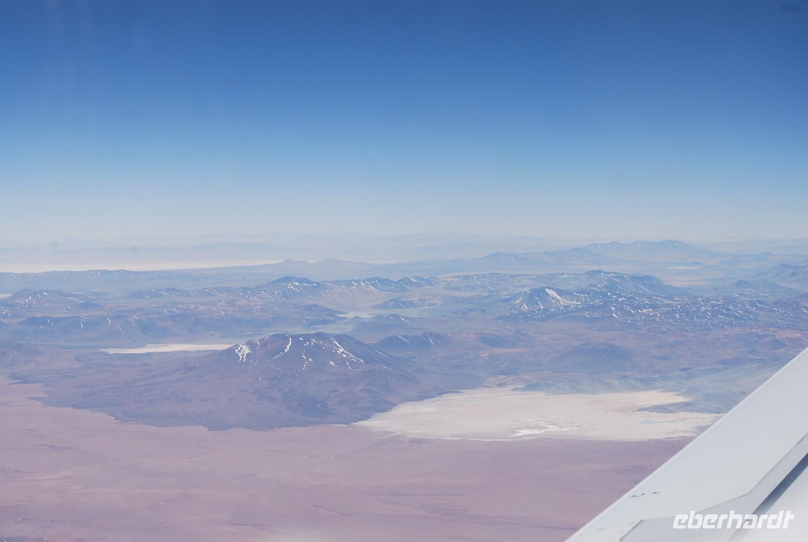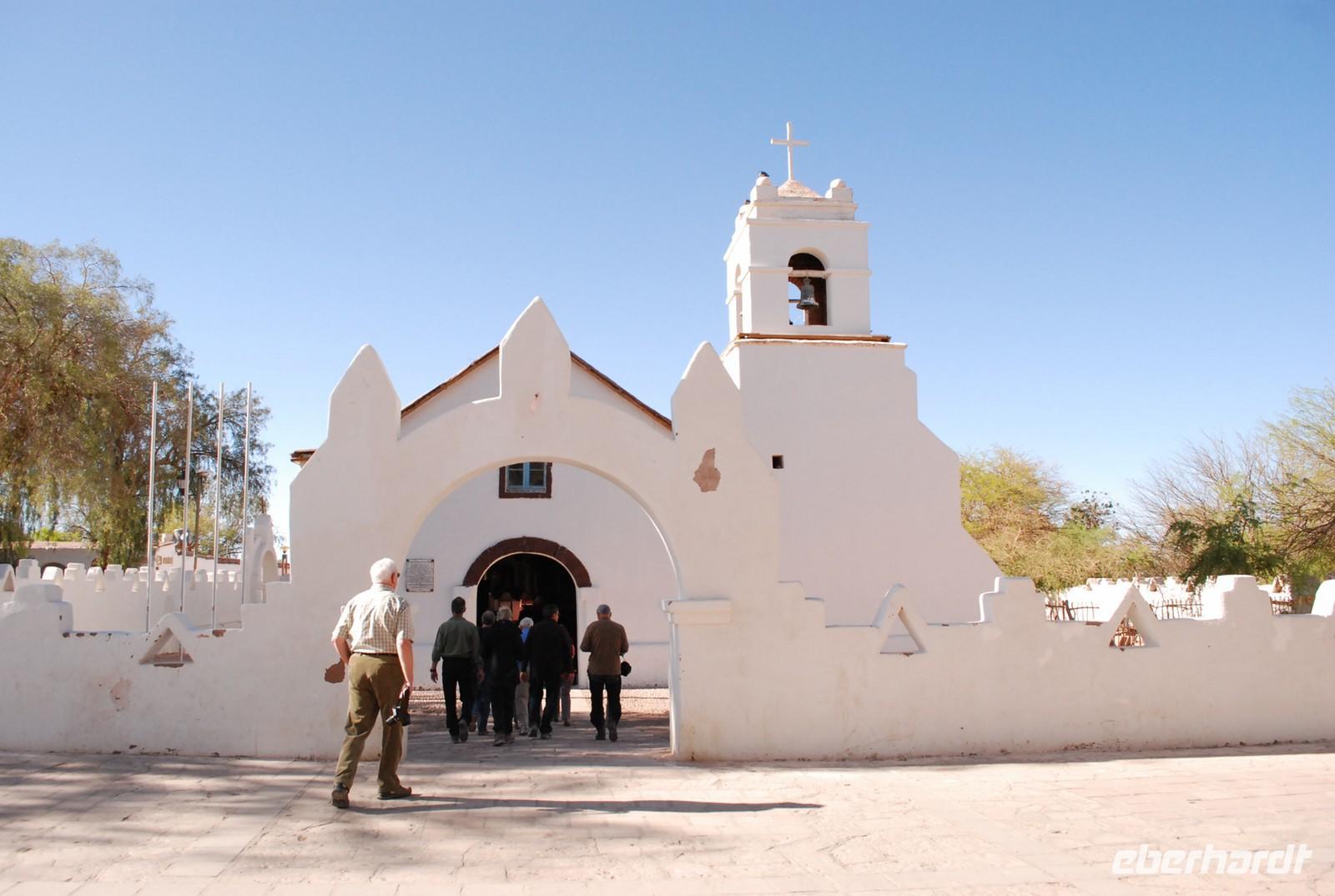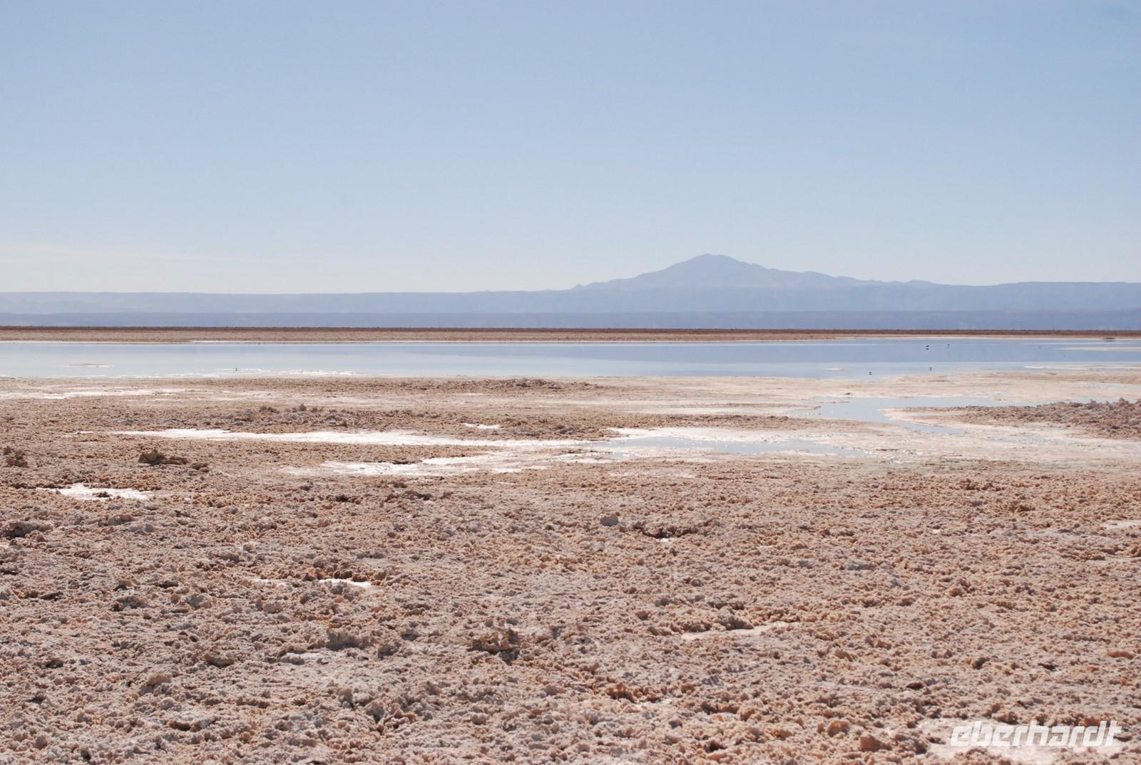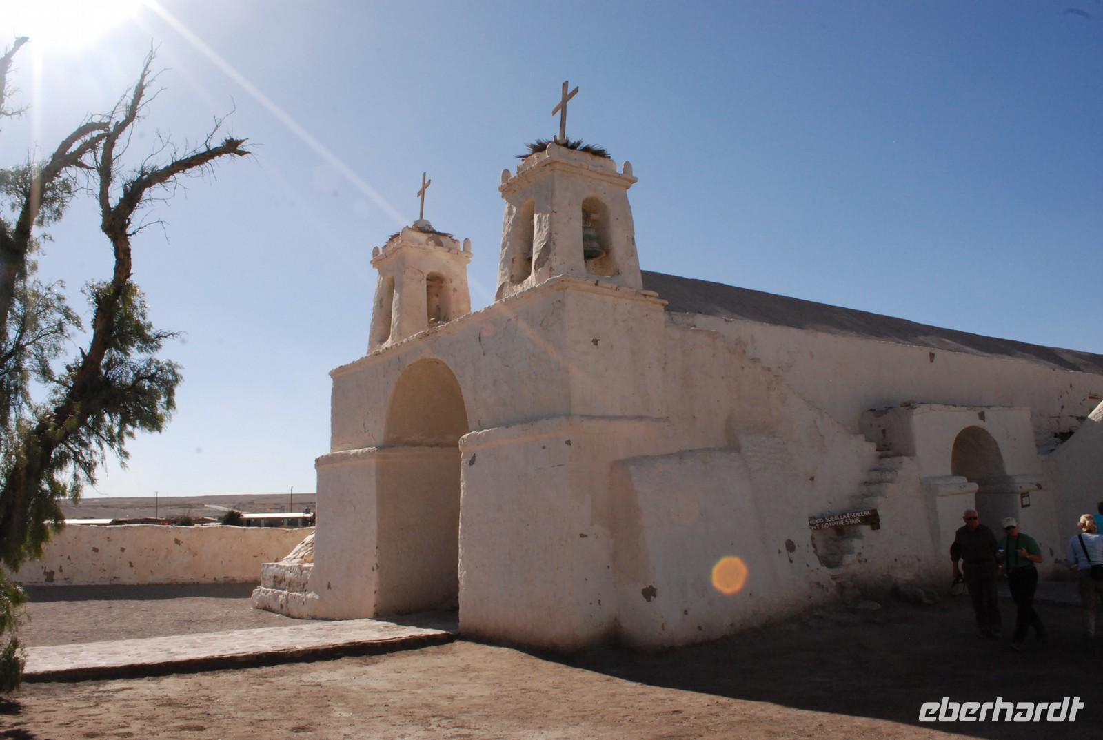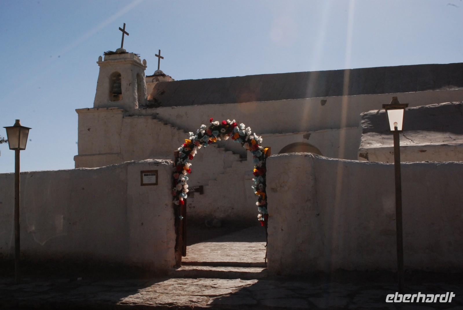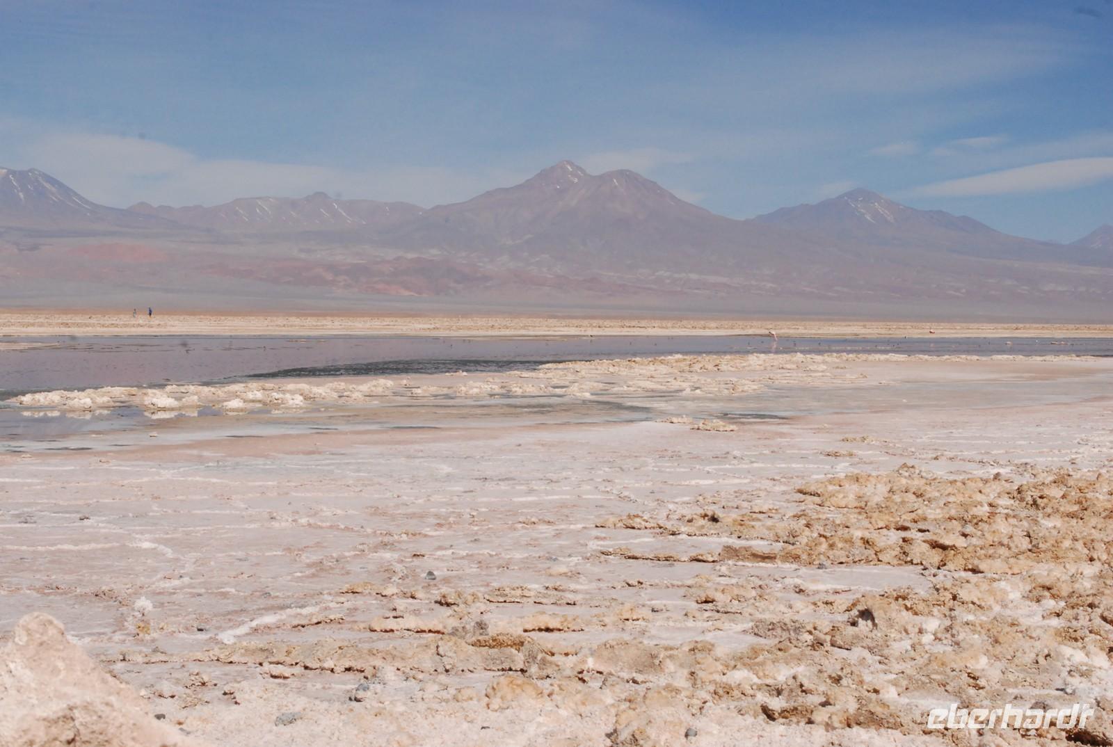 Heute beginnen wir unseren Tag mit einem Rundgang in San Pedro. Wir besichtigen die Kirche, deren Dachkonstruktion aus Kakteenholz angefertigt wurde, und wir "stürmen" die Post. Wir reisen nun in Richtung Süden und passieren als erstes das Dorf Socaire, wo wir in der Schlucht allerhand Blühendes entdecken und einen Gottesdienst zu Ehren San Lucas auf dem Marktplatz erleben. Über Socaire fahren wir nun auf 4000 Meter Höhe und werden hier von den letzten Überresten des Schnees überrascht. Die blau schimmernden Lagunen Miscanti und Miniques liegen wunderschön zwischen den gleichnamigen Vulkanen. Wir laufen bei circa 7 Grad Celsius dick eingepackt in Richtung Picknickplatz und werden zu einem gesunden Buffet mit Salaten, Pebre und frischer Lasagne und Braten eingeladen. Dazu ein Schlückchen Rotwein und die Höhe lässt sich ganz gut aushalten. Am Nachmittag befinden wir uns dann wieder auf circa 2400 Metern Höhe und besuchen die Lagune Chaxa inmitten des Atacama-Salzsees. Die Lagunen, die Flamingos, die unwirkliche Umgebung des Salzsees und die Andengipfel im Hintergrund - ein einmaliges Erlebnis! Wieder zurück in San Pedro lassen wir den Abend gemütlich ausklingen!