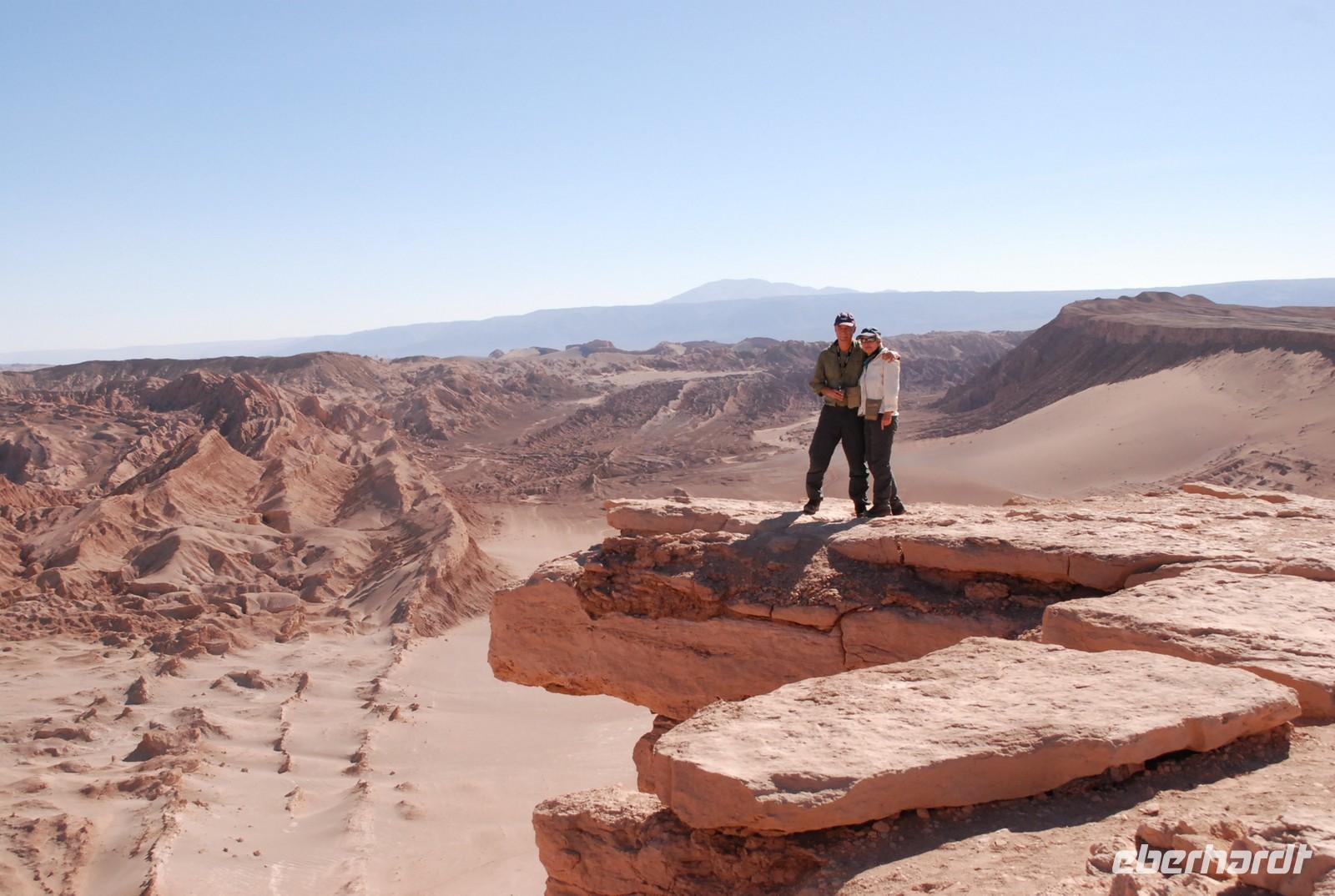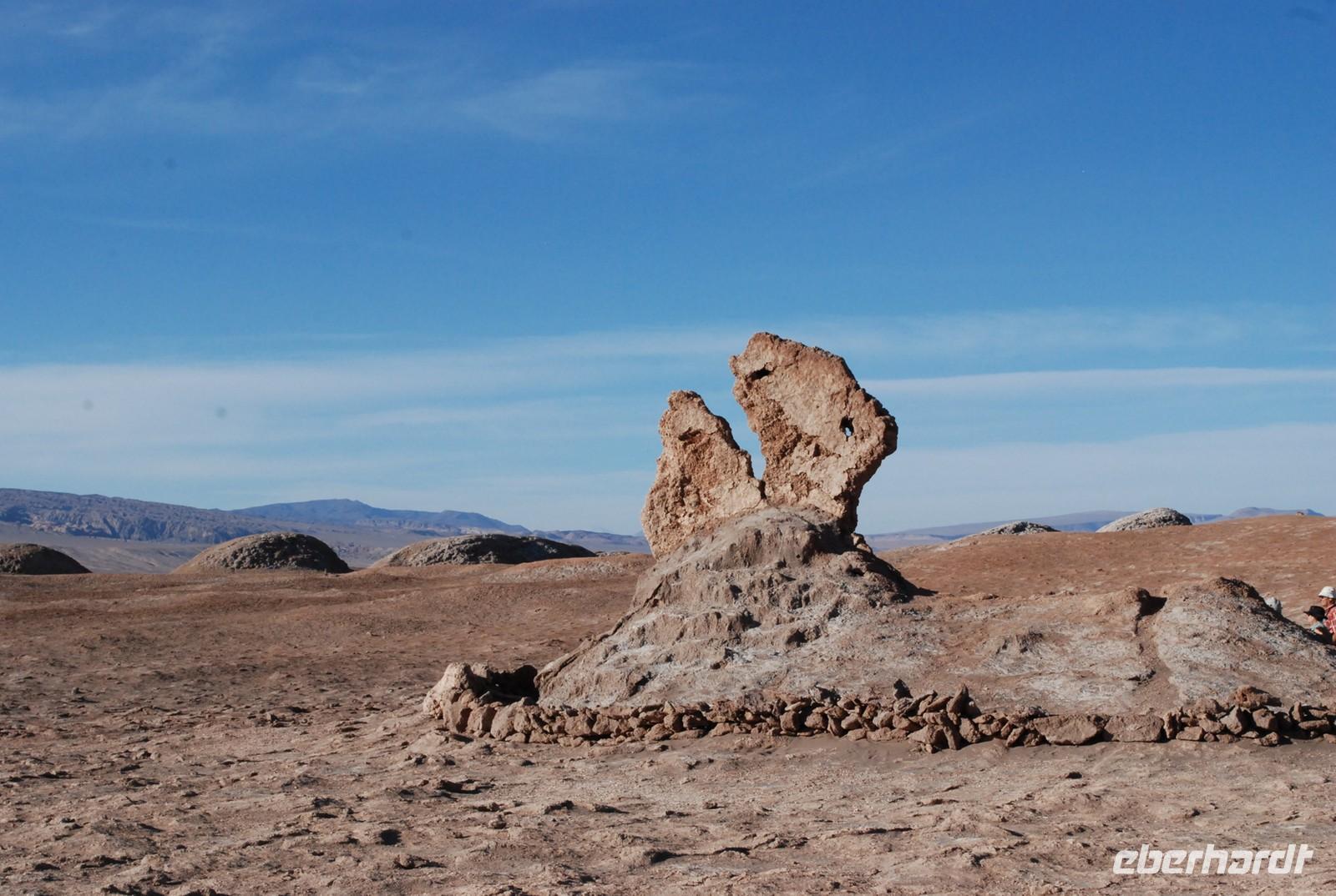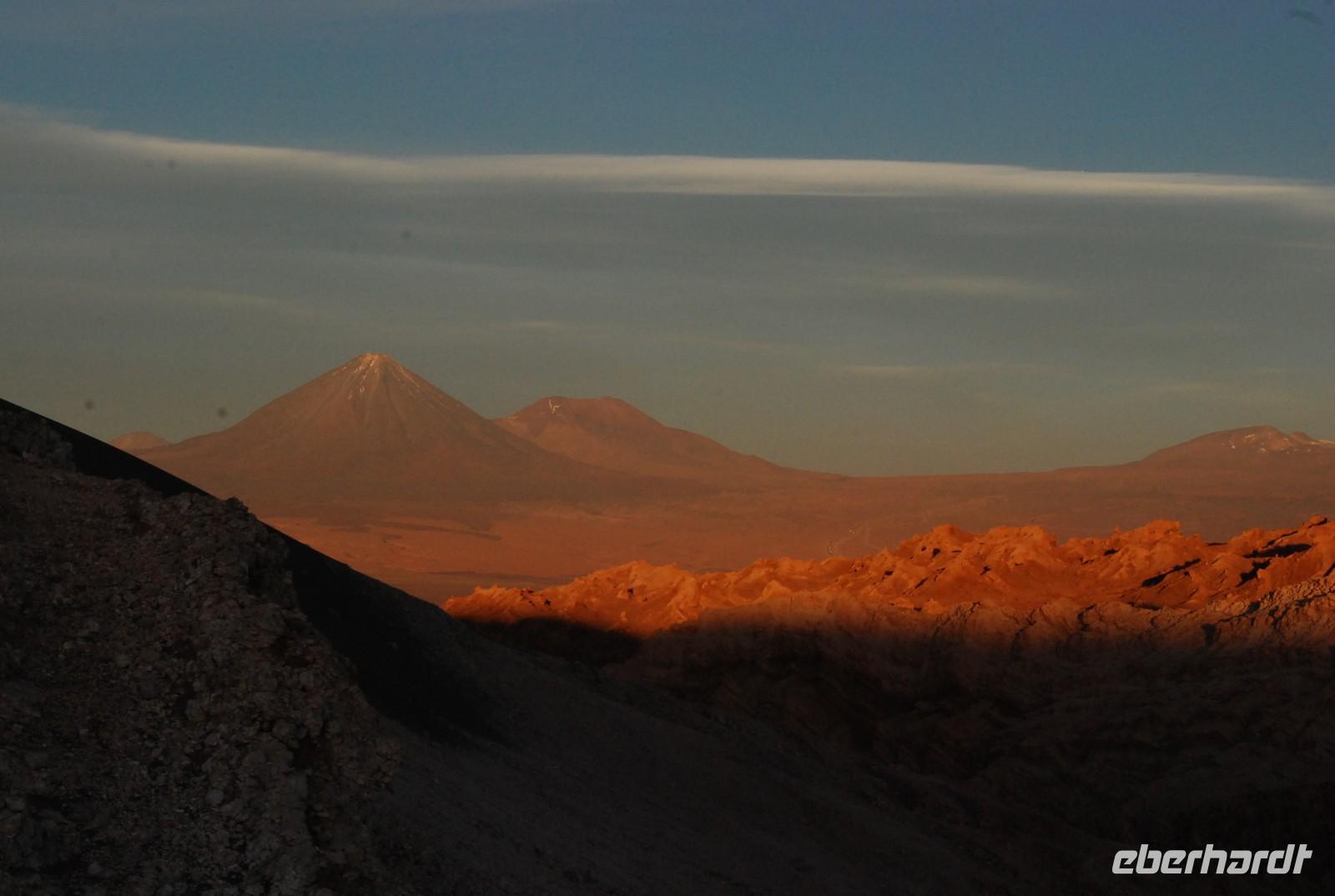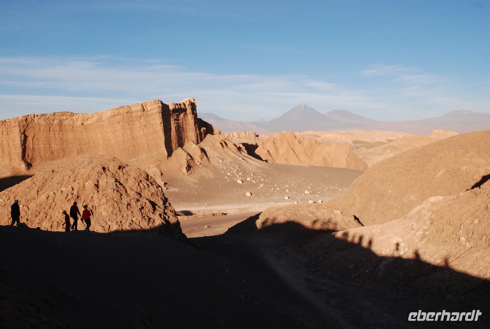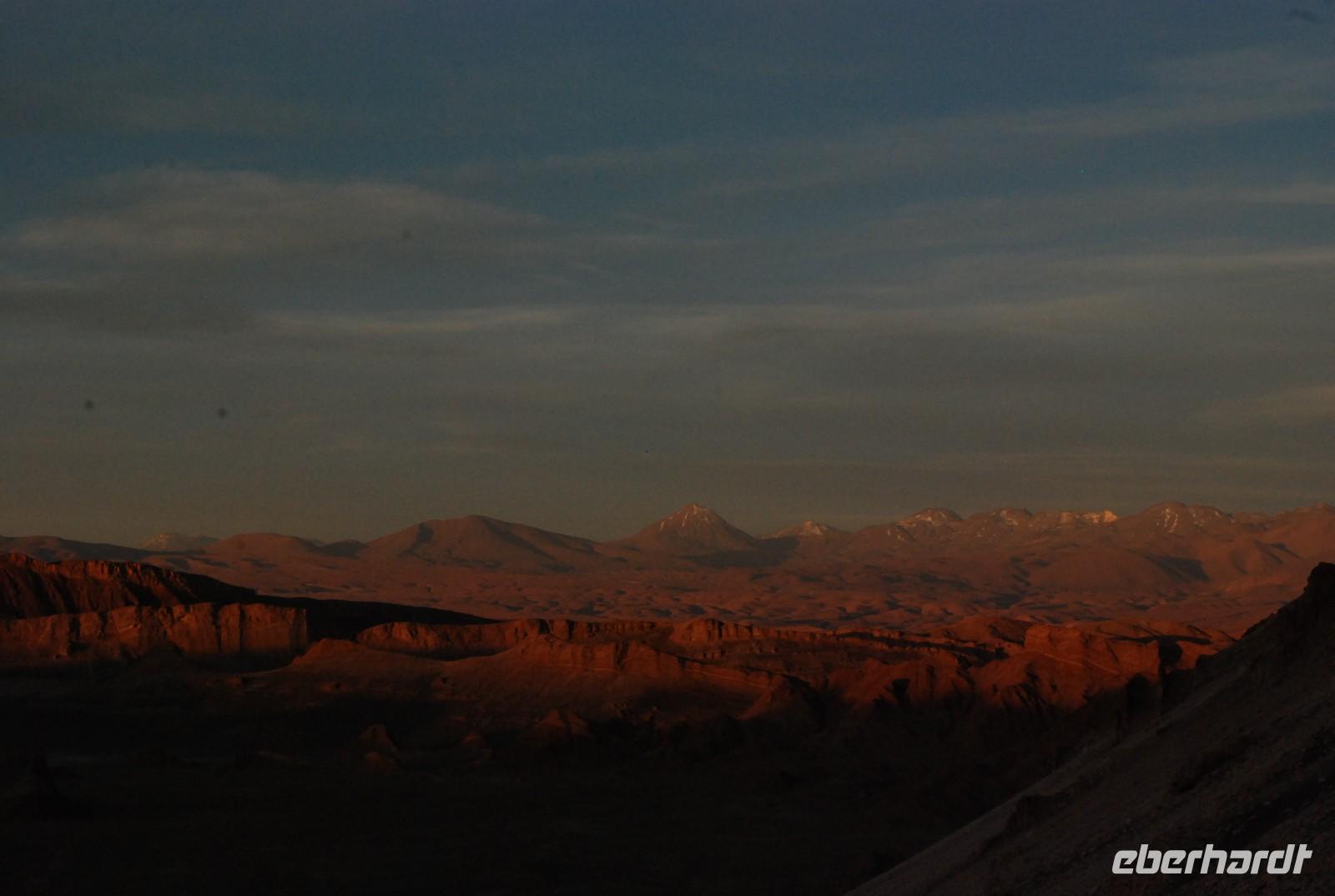 Santiago - kaum angekommen und wir verabschieden uns schon wieder gen Norden. Nach einem kleinen Zwischenfall mit Geduldsprobe am Check-In startet das Flugzeug wie erwartet und wir landen kurz nach Mittag am Flughafen von Calama in der zweiten Region von Chile. Von hier aus überqueren wir die Kordillere von Domaiko mit einer Höhe von 3.700 Metern. Nach einer mittäglichen Stärkung in einem urigen Lokal treffen wir uns für den Ausflug ins Mars- und Mondtal. Zuerst haben wir einen fantastischen Blick auf die Salz-Kordillere. Anschließend spazieren wir ein Stück im Marstal, wo man fantastisch die verschiedenen Ablagerungen sehen kann. Im Mondtal bestaunen wir die tres marias, ein "Salz-Bergwerk" und wir erklimmen zum Sonnenuntergang einen Aussichtspunkt. Von hier hat man einen tollen Blick auf die Anden, die sich in der Dämmerung rosa bis lila färben. Zurück im Hotel erwartet uns schon ein Begrüßungsgetränk auf der Terrasse - ein Pisco Sour. Dazu werden kleine Häppchen und Snacks gereicht - eine gelungene Überraschung!
