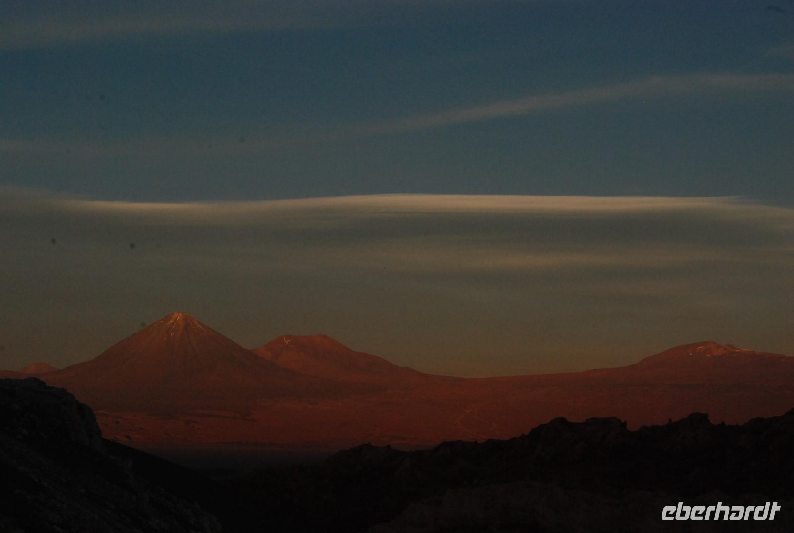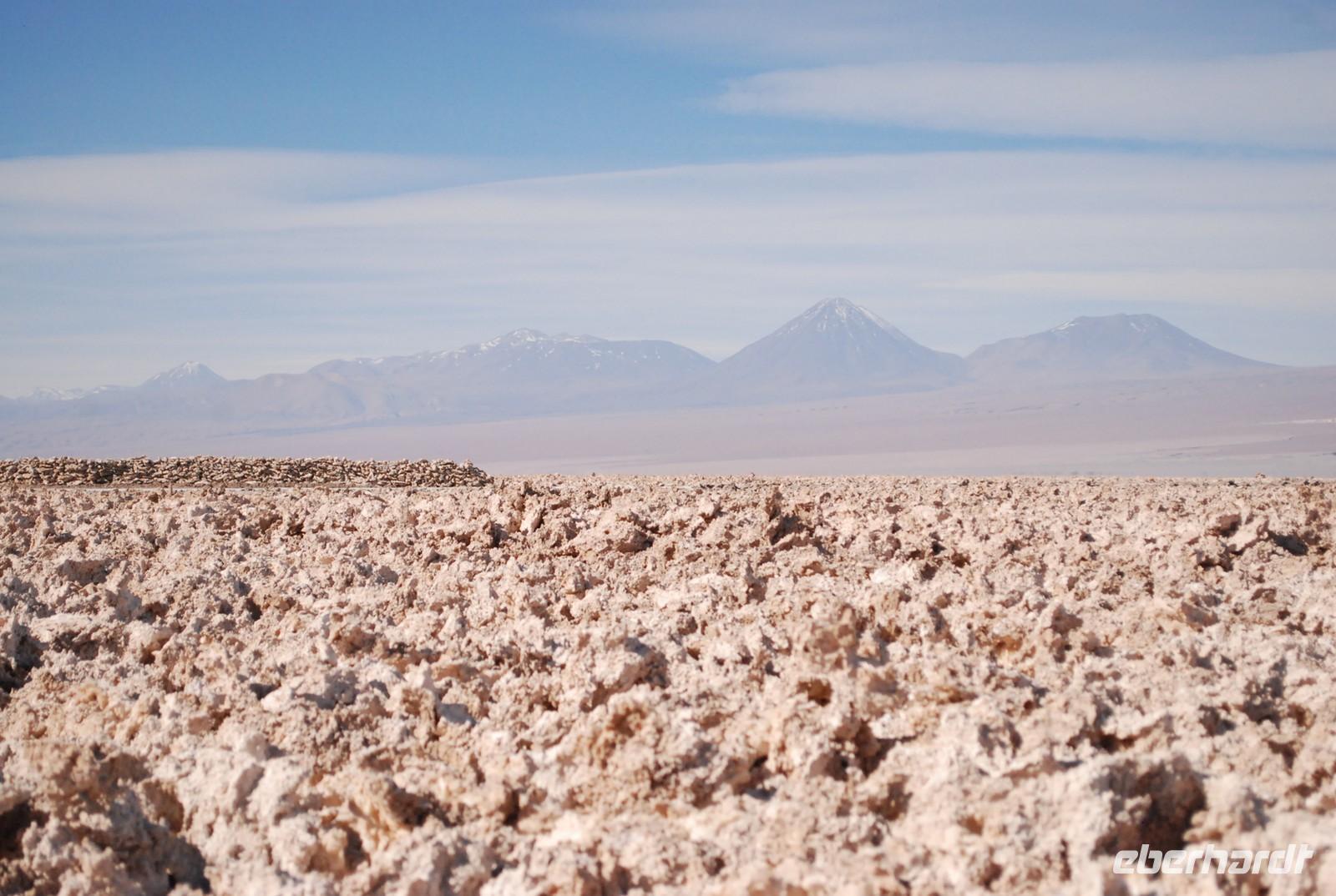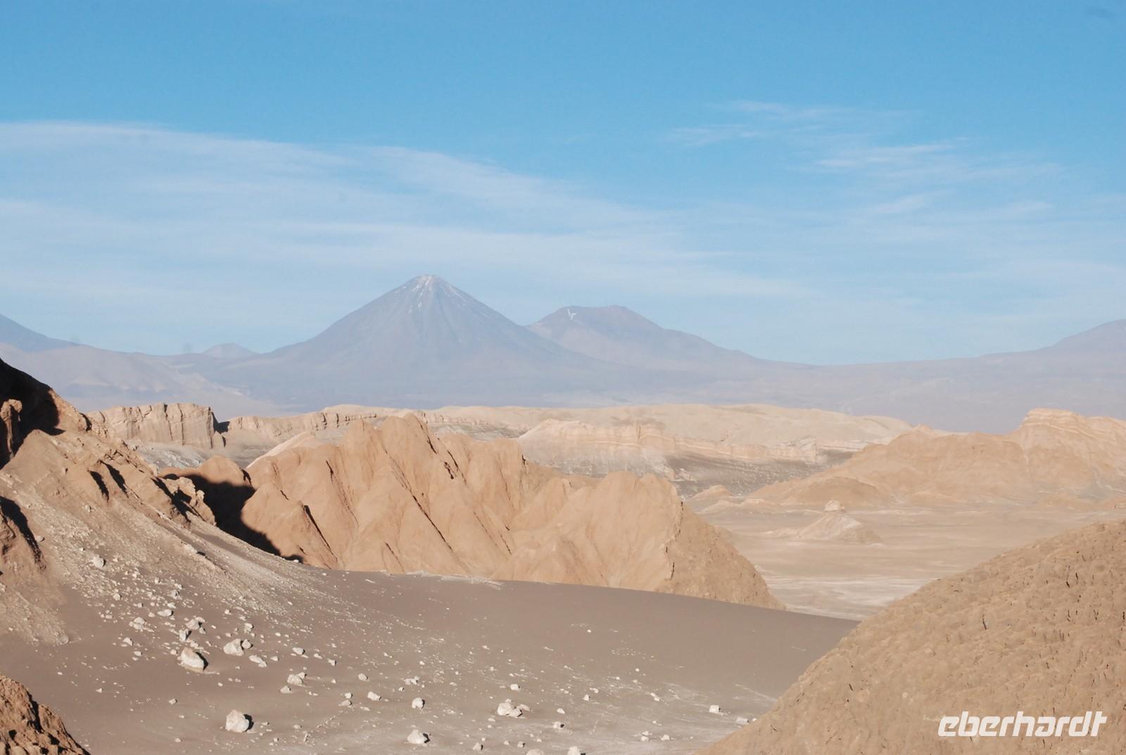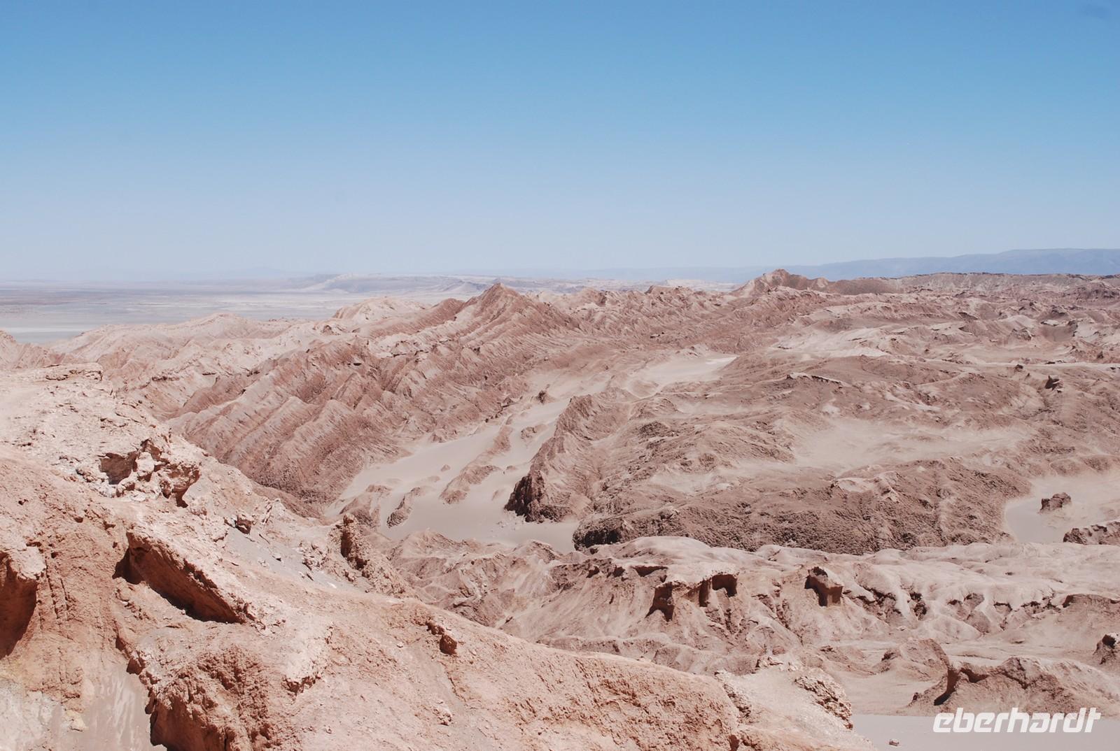 Santiago - kaum angekommen und wir verabschieden uns schon wieder gen Norden. Nach einem kleinen Zwischenfall mit Geduldsprobe am Check-In startet das Flugzeug wie erwartet und wir landen kurz nach Mittag am Flughafen von Calama in der zweiten Region von Chile. Von hier aus überqueren wir die Kordillere von Domaiko mit einer Höhe von 3.700 Metern. Nach einer mittäglichen Stärkung in einem urigen Lokal treffen wir uns für den Ausflug ins Mars- und Mondtal. Zuerst haben wir einen fantastischen Blick auf die Salz-Kordillere. Anschließend spazieren wir ein Stück im Marstal, wo man fantastisch die verschiedenen Ablagerungen sehen kann. Im Mondtal bestaunen wir die tres marias, ein "Salz-Bergwerk" und wir erklimmen zum Sonnenuntergang einen Aussichtspunkt. Von hier hat man einen tollen Blick auf die Anden, die sich in der Dämmerung rosa bis lila färben. Zurück im Hotel erwartet uns schon ein Begrüßungsgetränk auf der Terrasse - ein Pisco Sour. Dazu werden kleine Häppchen und Snacks gereicht - eine gelungene Überraschung!