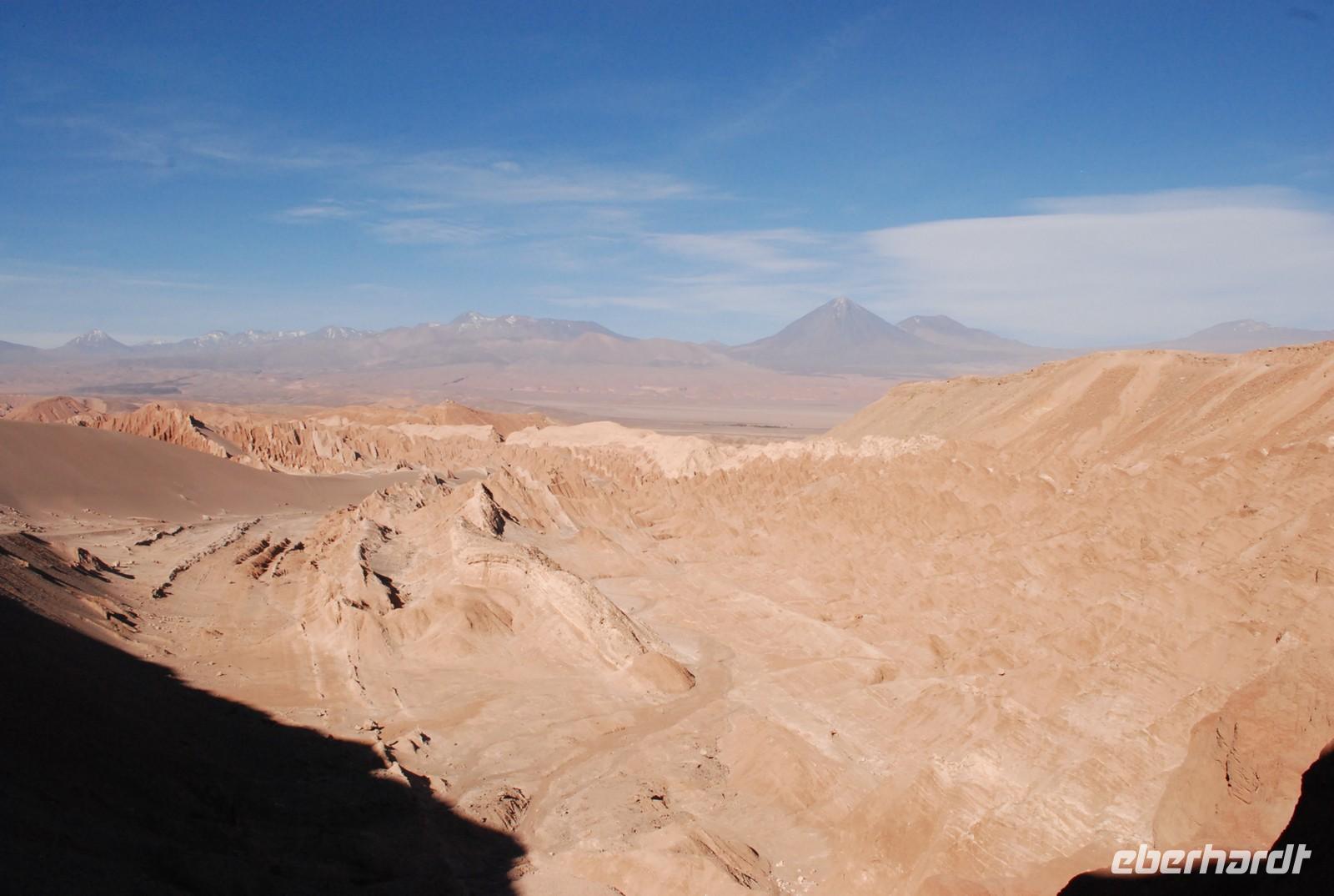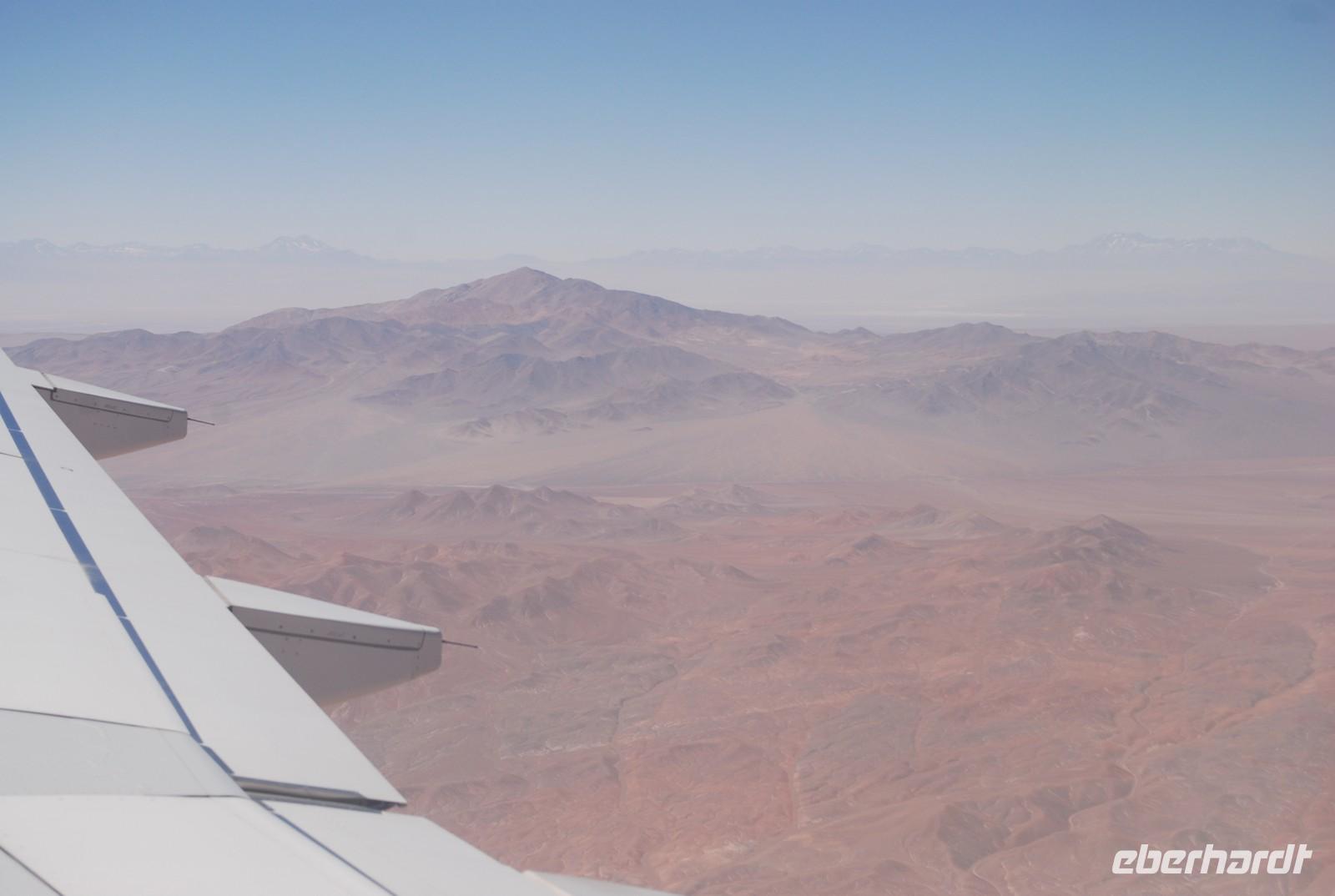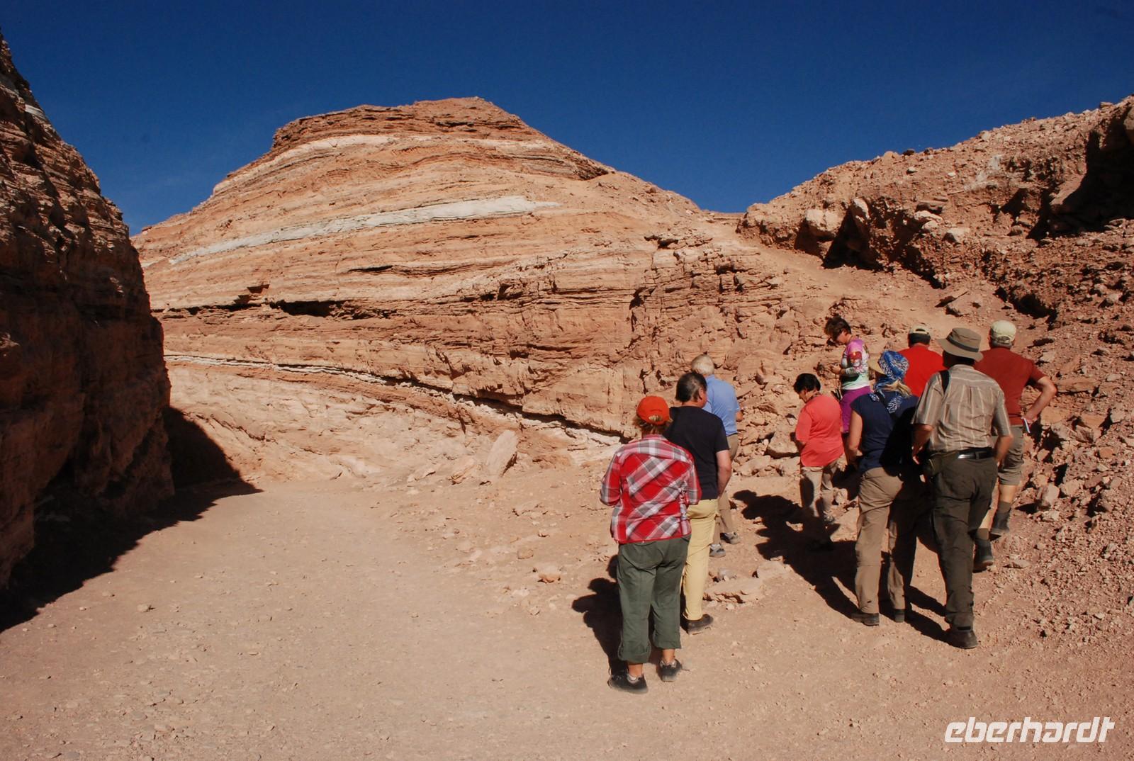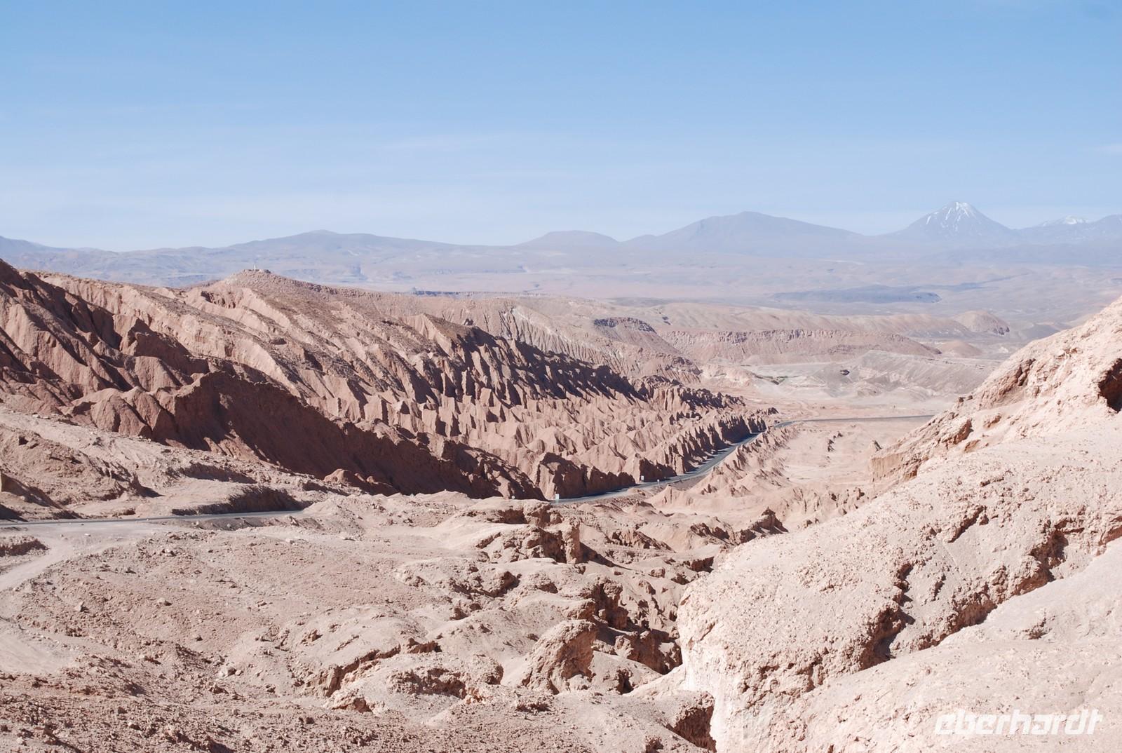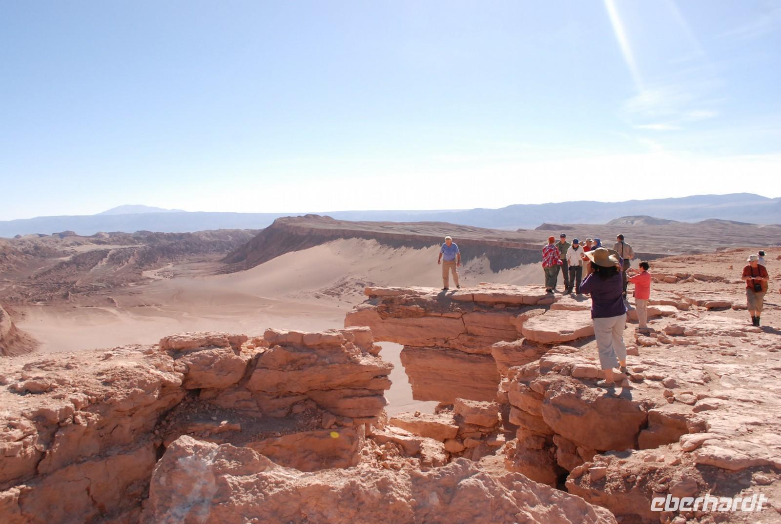 Santiago - kaum angekommen und wir verabschieden uns schon wieder gen Norden. Nach einem kleinen Zwischenfall mit Geduldsprobe am Check-In startet das Flugzeug wie erwartet und wir landen kurz nach Mittag am Flughafen von Calama in der zweiten Region von Chile. Von hier aus überqueren wir die Kordillere von Domaiko mit einer Höhe von 3.700 Metern. Nach einer mittäglichen Stärkung in einem urigen Lokal treffen wir uns für den Ausflug ins Mars- und Mondtal. Zuerst haben wir einen fantastischen Blick auf die Salz-Kordillere. Anschließend spazieren wir ein Stück im Marstal, wo man fantastisch die verschiedenen Ablagerungen sehen kann. Im Mondtal bestaunen wir die tres marias, ein "Salz-Bergwerk" und wir erklimmen zum Sonnenuntergang einen Aussichtspunkt. Von hier hat man einen tollen Blick auf die Anden, die sich in der Dämmerung rosa bis lila färben. Zurück im Hotel erwartet uns schon ein Begrüßungsgetränk auf der Terrasse - ein Pisco Sour. Dazu werden kleine Häppchen und Snacks gereicht - eine gelungene Überraschung!