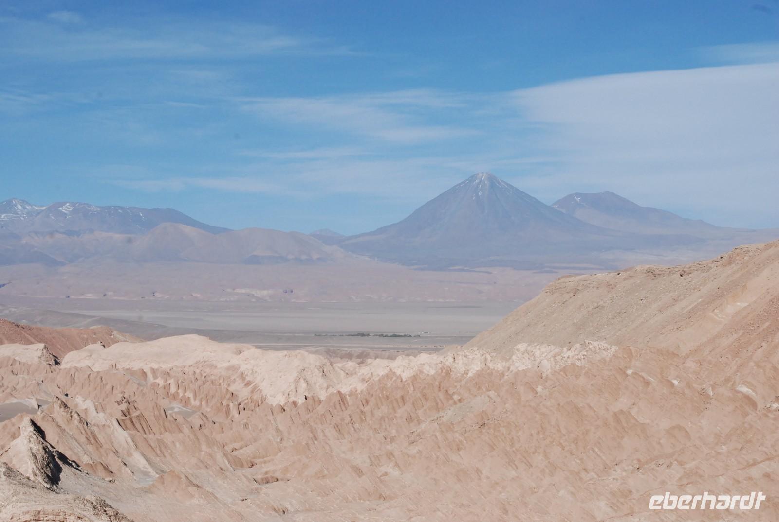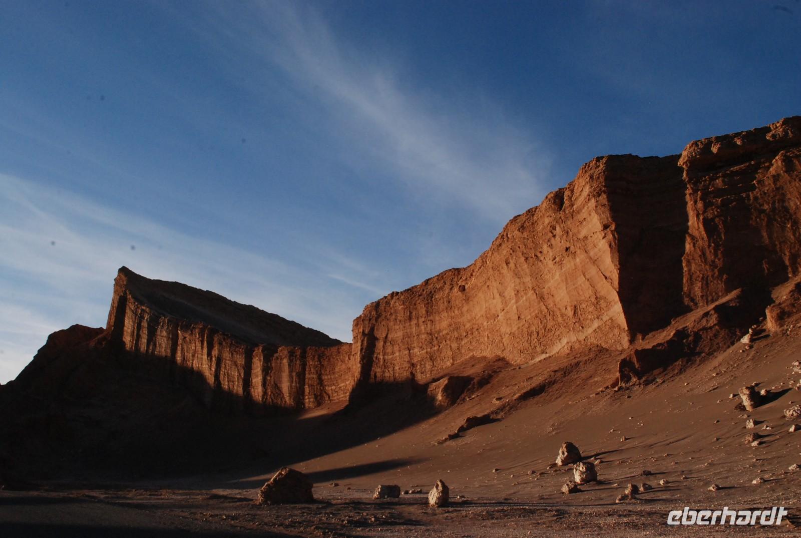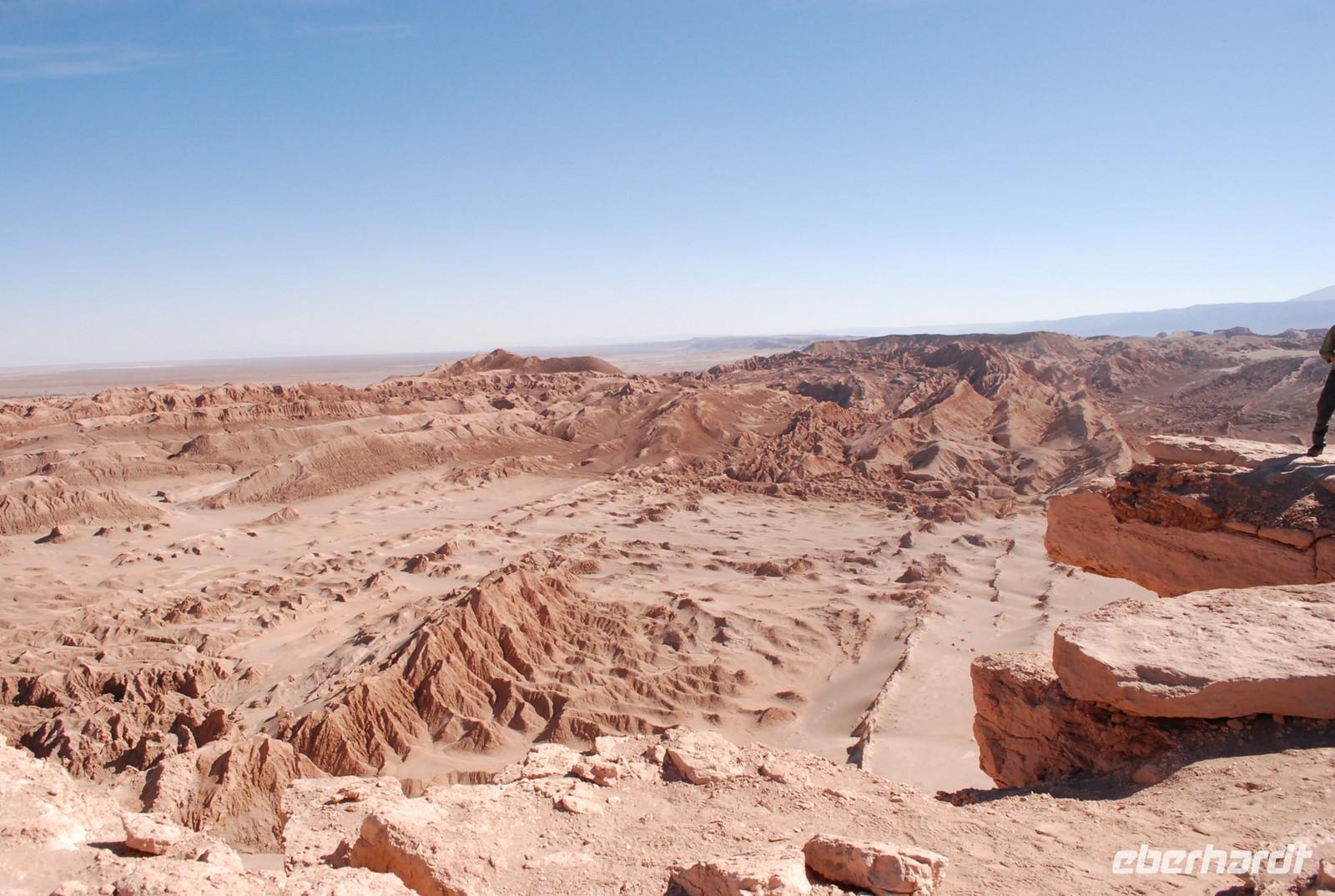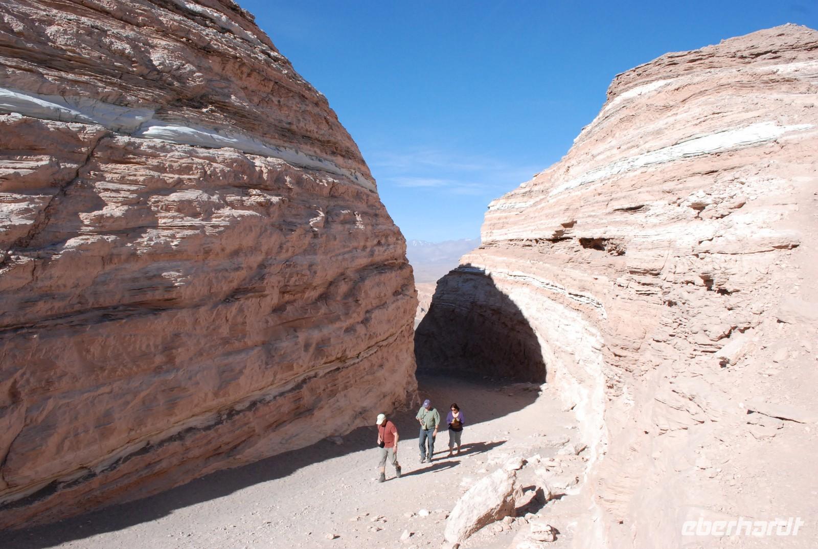 Santiago - kaum angekommen und wir verabschieden uns schon wieder gen Norden. Nach einem kleinen Zwischenfall mit Geduldsprobe am Check-In startet das Flugzeug wie erwartet und wir landen kurz nach Mittag am Flughafen von Calama in der zweiten Region von Chile. Von hier aus überqueren wir die Kordillere von Domaiko mit einer Höhe von 3.700 Metern. Nach einer mittäglichen Stärkung in einem urigen Lokal treffen wir uns für den Ausflug ins Mars- und Mondtal. Zuerst haben wir einen fantastischen Blick auf die Salz-Kordillere. Anschließend spazieren wir ein Stück im Marstal, wo man fantastisch die verschiedenen Ablagerungen sehen kann. Im Mondtal bestaunen wir die tres marias, ein "Salz-Bergwerk" und wir erklimmen zum Sonnenuntergang einen Aussichtspunkt. Von hier hat man einen tollen Blick auf die Anden, die sich in der Dämmerung rosa bis lila färben. Zurück im Hotel erwartet uns schon ein Begrüßungsgetränk auf der Terrasse - ein Pisco Sour. Dazu werden kleine Häppchen und Snacks gereicht - eine gelungene Überraschung!