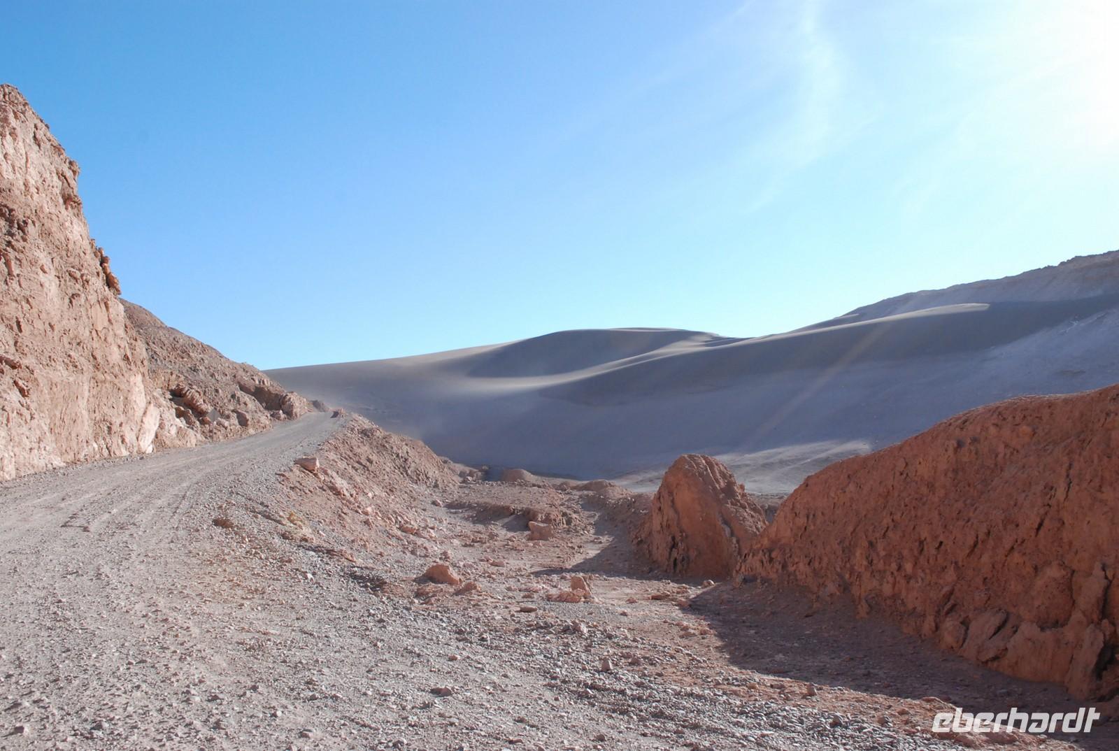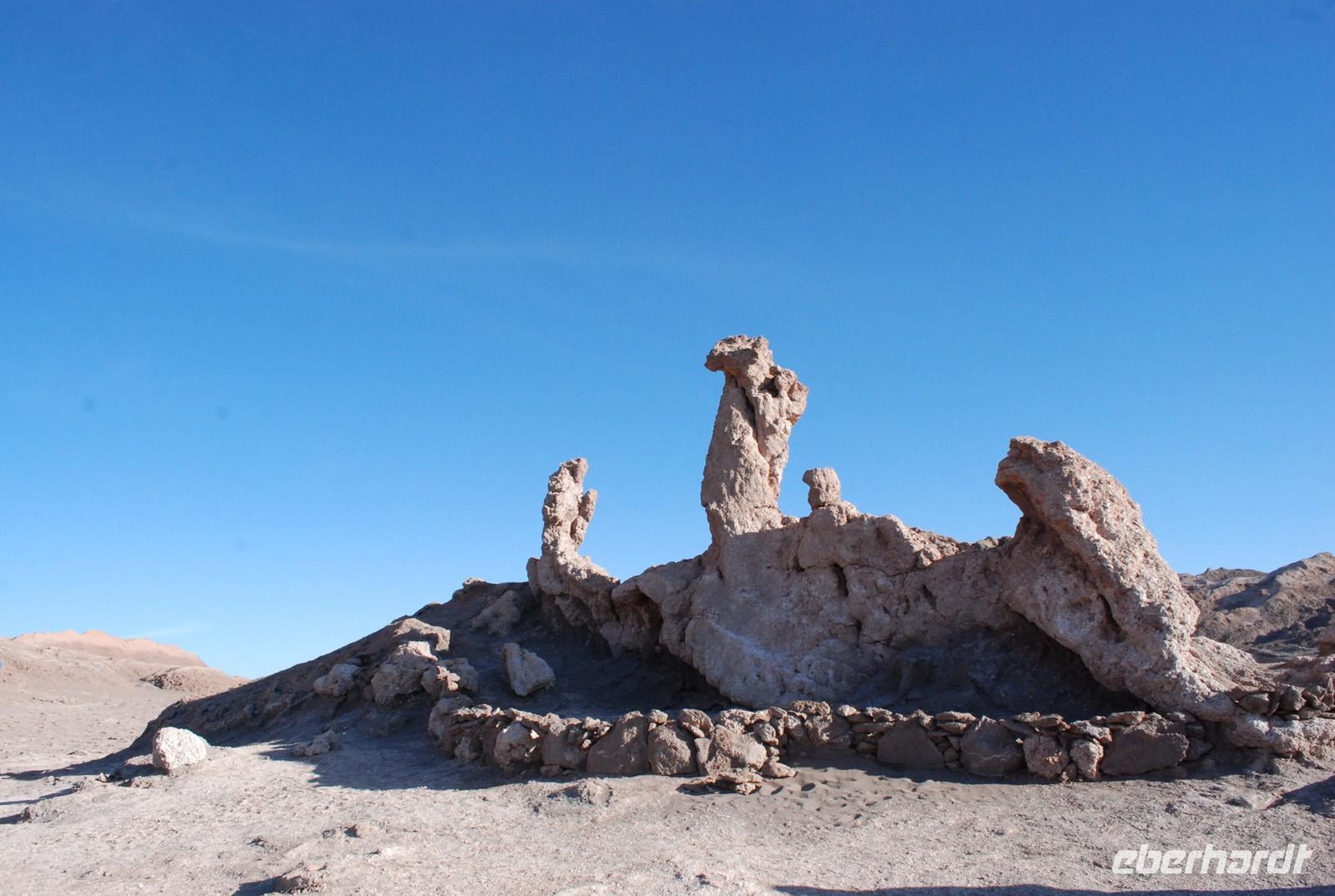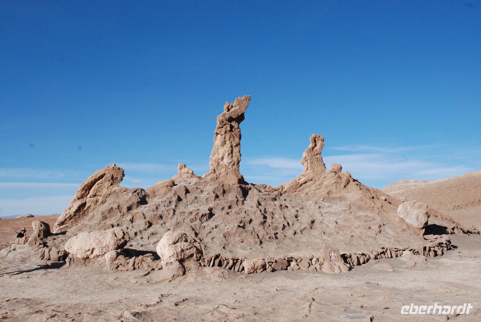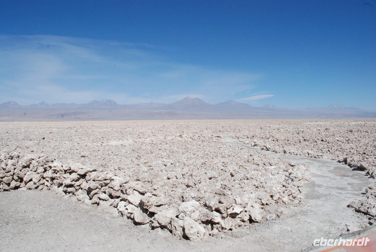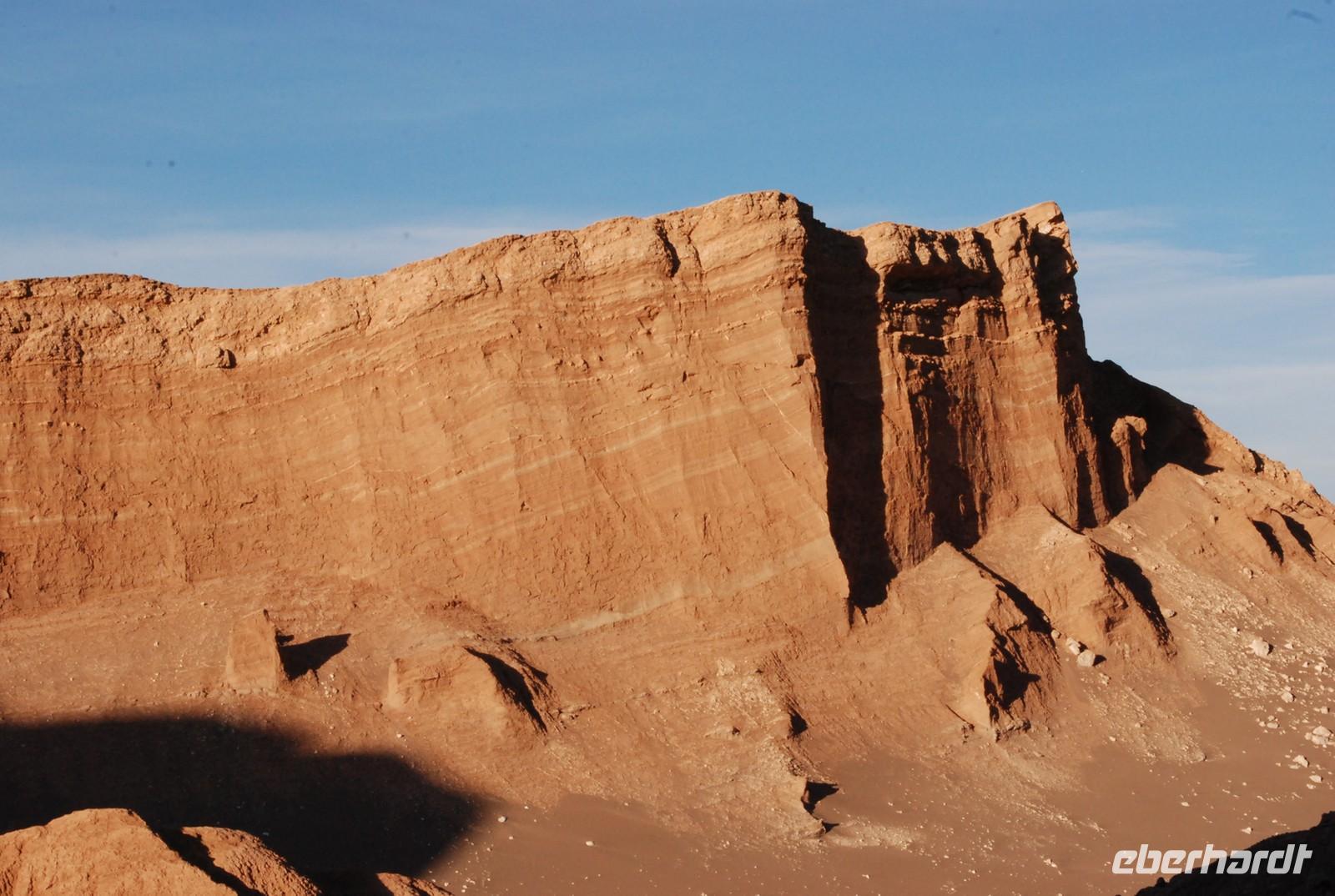Santiago - kaum angekommen und wir verabschieden uns schon wieder gen Norden. Nach einem kleinen Zwischenfall mit Geduldsprobe am Check-In startet das Flugzeug wie erwartet und wir landen kurz nach Mittag am Flughafen von Calama in der zweiten Region von Chile. Von hier aus überqueren wir die Kordillere von Domaiko mit einer Höhe von 3.700 Metern. Nach einer mittäglichen Stärkung in einem urigen Lokal treffen wir uns für den Ausflug ins Mars- und Mondtal. Zuerst haben wir einen fantastischen Blick auf die Salz-Kordillere. Anschließend spazieren wir ein Stück im Marstal, wo man fantastisch die verschiedenen Ablagerungen sehen kann. Im Mondtal bestaunen wir die tres marias, ein "Salz-Bergwerk" und wir erklimmen zum Sonnenuntergang einen Aussichtspunkt. Von hier hat man einen tollen Blick auf die Anden, die sich in der Dämmerung rosa bis lila färben. Zurück im Hotel erwartet uns schon ein Begrüßungsgetränk auf der Terrasse - ein Pisco Sour. Dazu werden kleine Häppchen und Snacks gereicht - eine gelungene Überraschung!