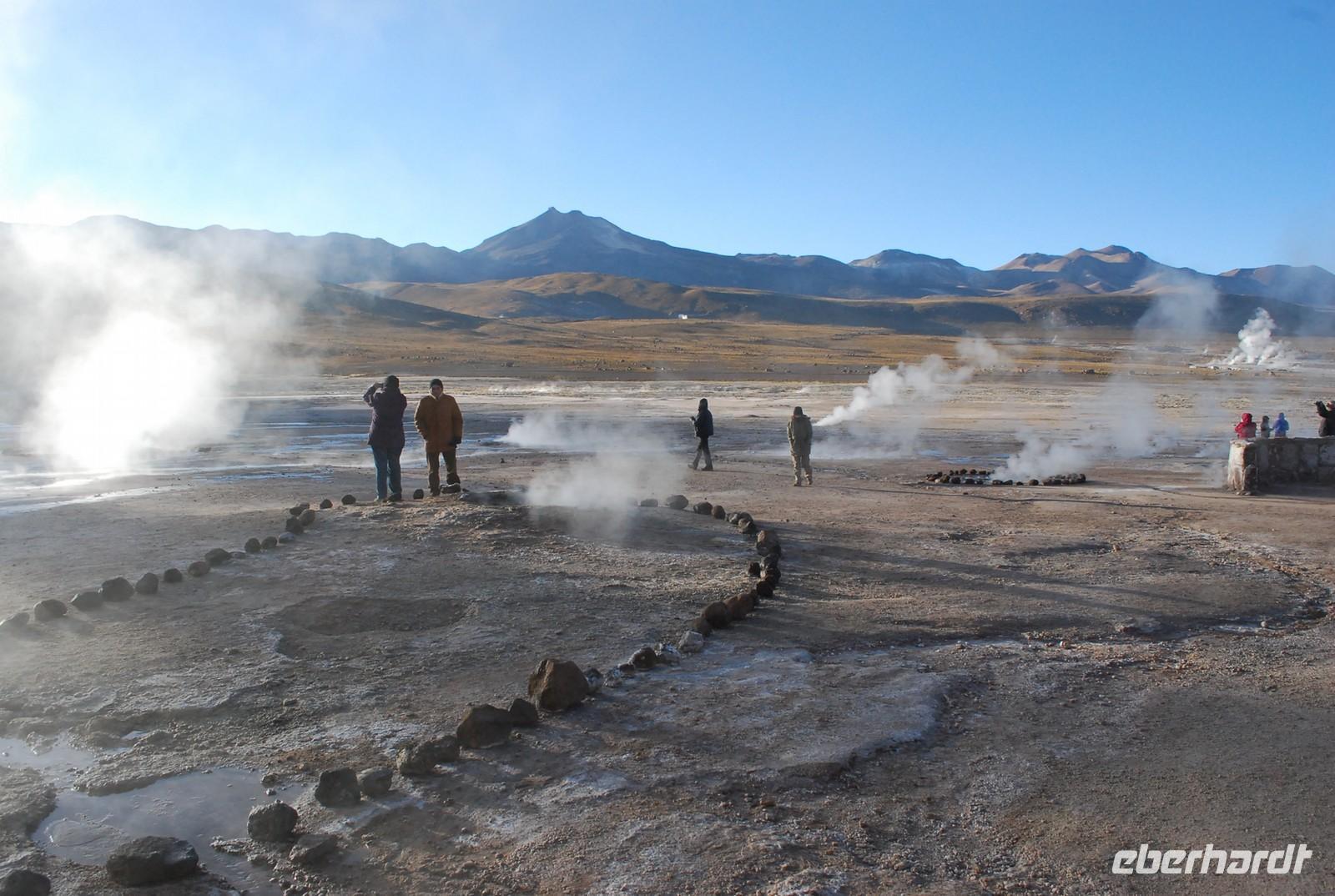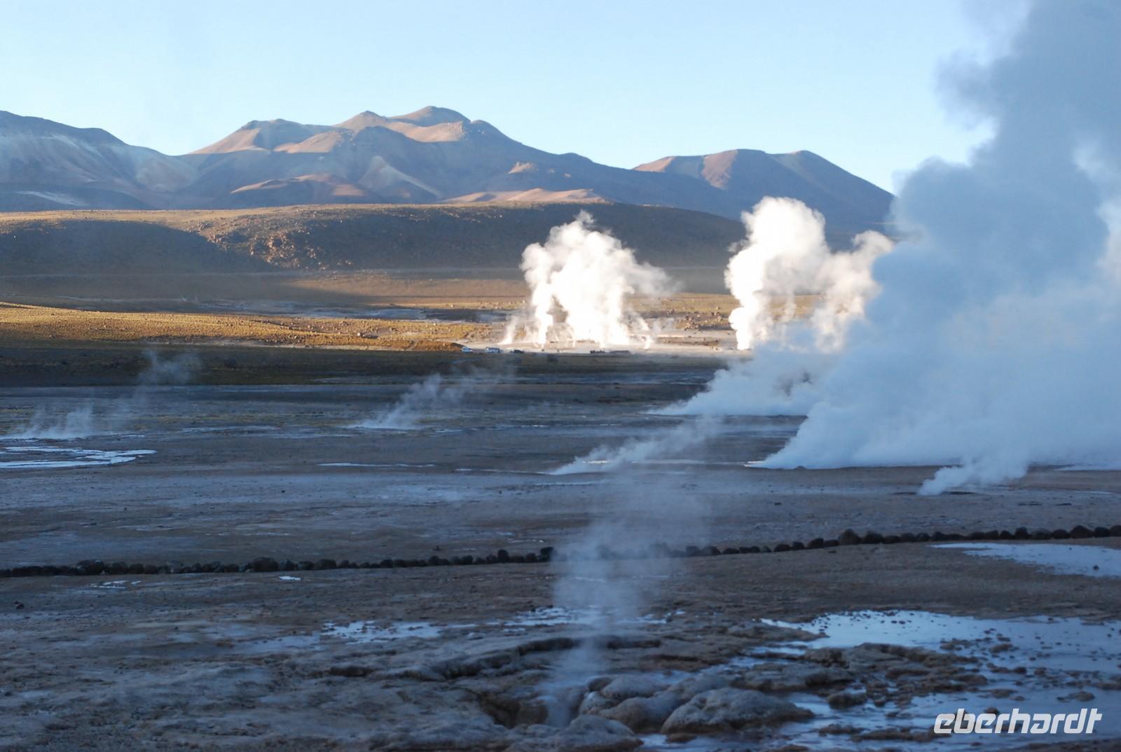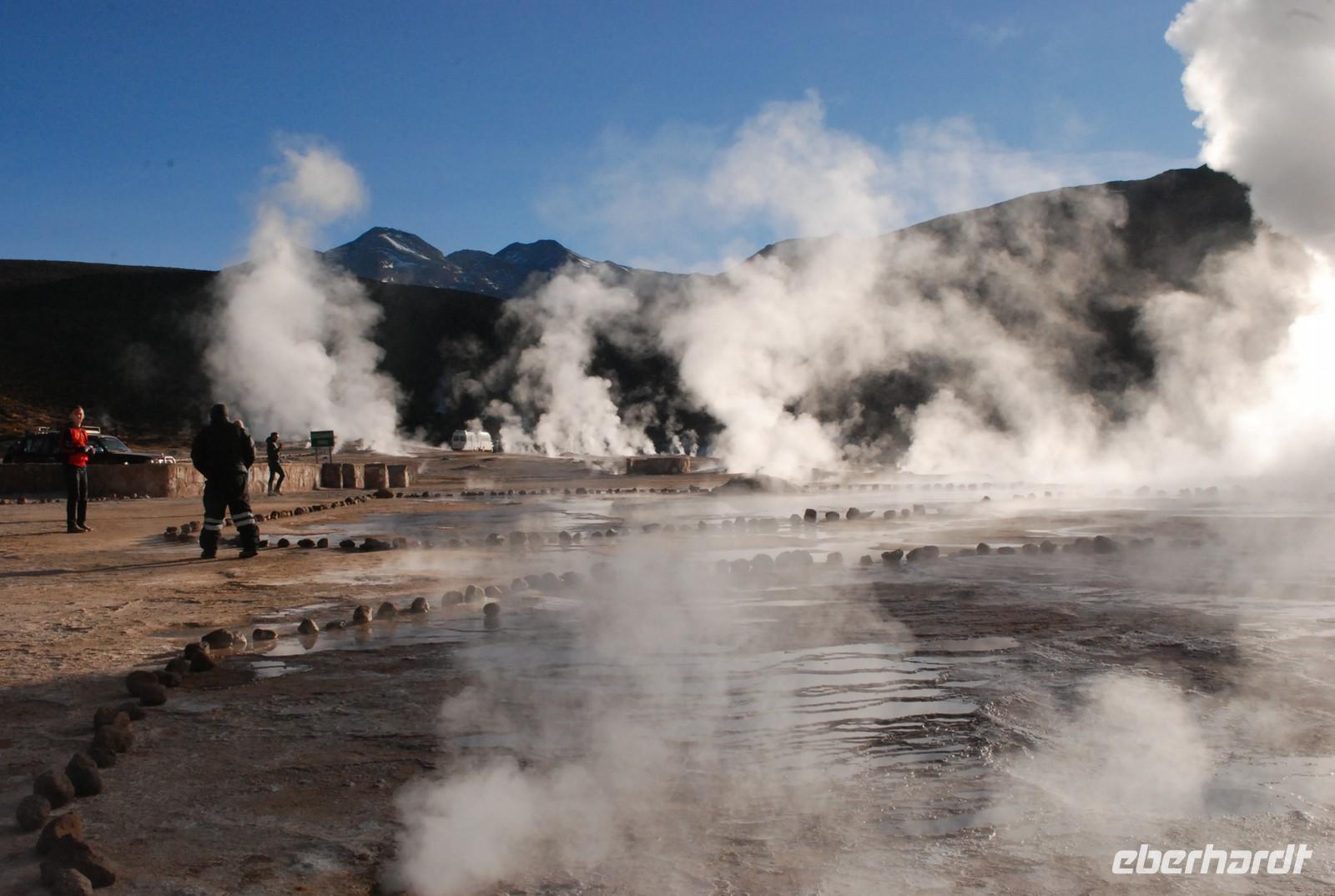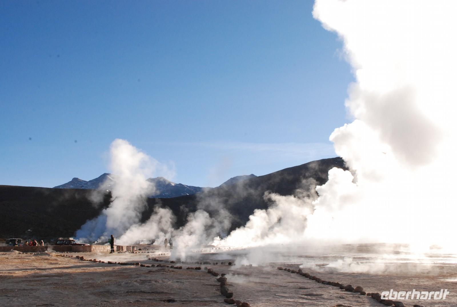 Ein langer, erlebnisreicher Tag erwartet uns, als um vier der Wecker klingelt. Nach einem warmen Tee starten wir die zweistündige Fahrt zu dem höchstgelegenen Geysirfeld der Welt - El Tatio. Schon im Bus müssen wir uns warm anziehen, denn auf 4300 Metern Höhe sind klirrend kalte 12 Grad Minus. Mit Handschuhen und Mütze bewaffnet wandern wir zwischen den Fumarolen während die Sonne über die Berge steigt. Wir beobachten das Naturschauspiel aus nächster Nähe! In der Zwischenzeit werden die Milch und die Eier gekocht und rasch haben Carolina und unser Fahrer Wilson den Frühstückstisch gedeckt. Hier am Geysirfeld können wir auch die scheuen Vicuñas und Vizcachas beobachten. Unsere Reise führt uns nun wieder auf niedrigere Höhen wo wir Guanakos und Lamas sehen. Wir unternehmen einen Spaziergang durch Caspana, welches in einem grünen Tal inmitten der Wüste liegt. In Lasana sind wir zum Essen in einem einheimischen Lokal eingeladen und lassen uns einen Maiseintopf schmecken. Anschließend besichtigen wir noch die Ruine der Atacamena-Siedlung und die älteste Kirche der Region in Chui Chui. Von Calama und der Atacama-Wüste heißt es nun Abschied nehmen, denn wir fliegen zurück nach Santiago de Chile.
