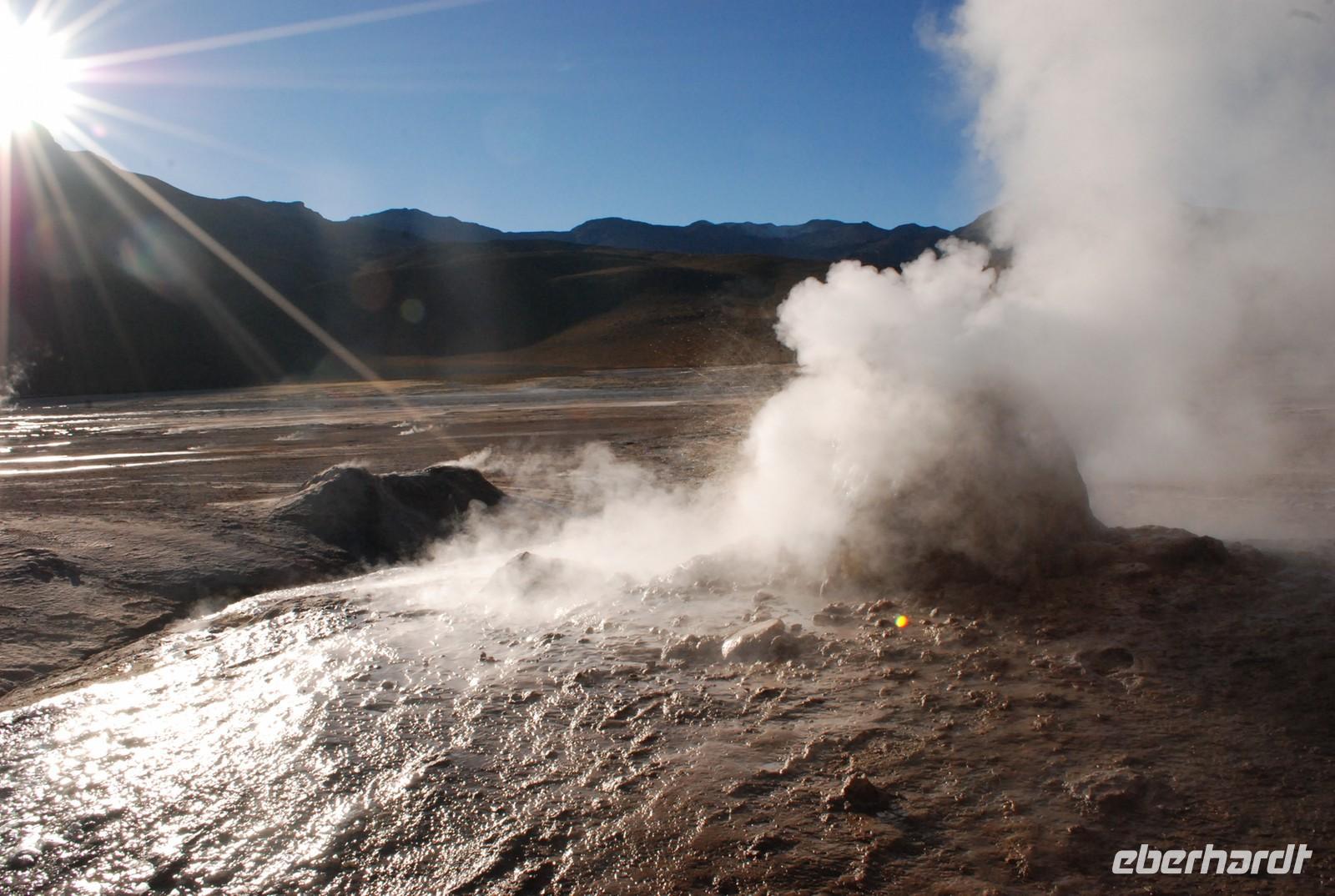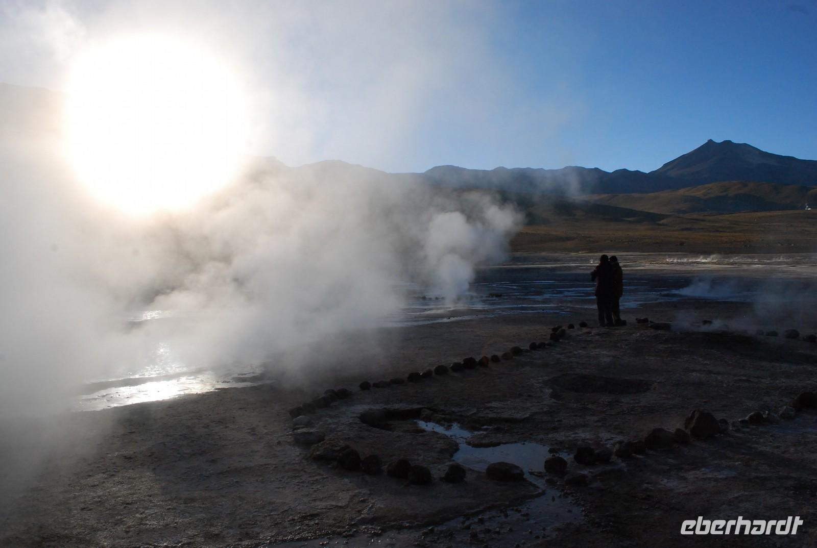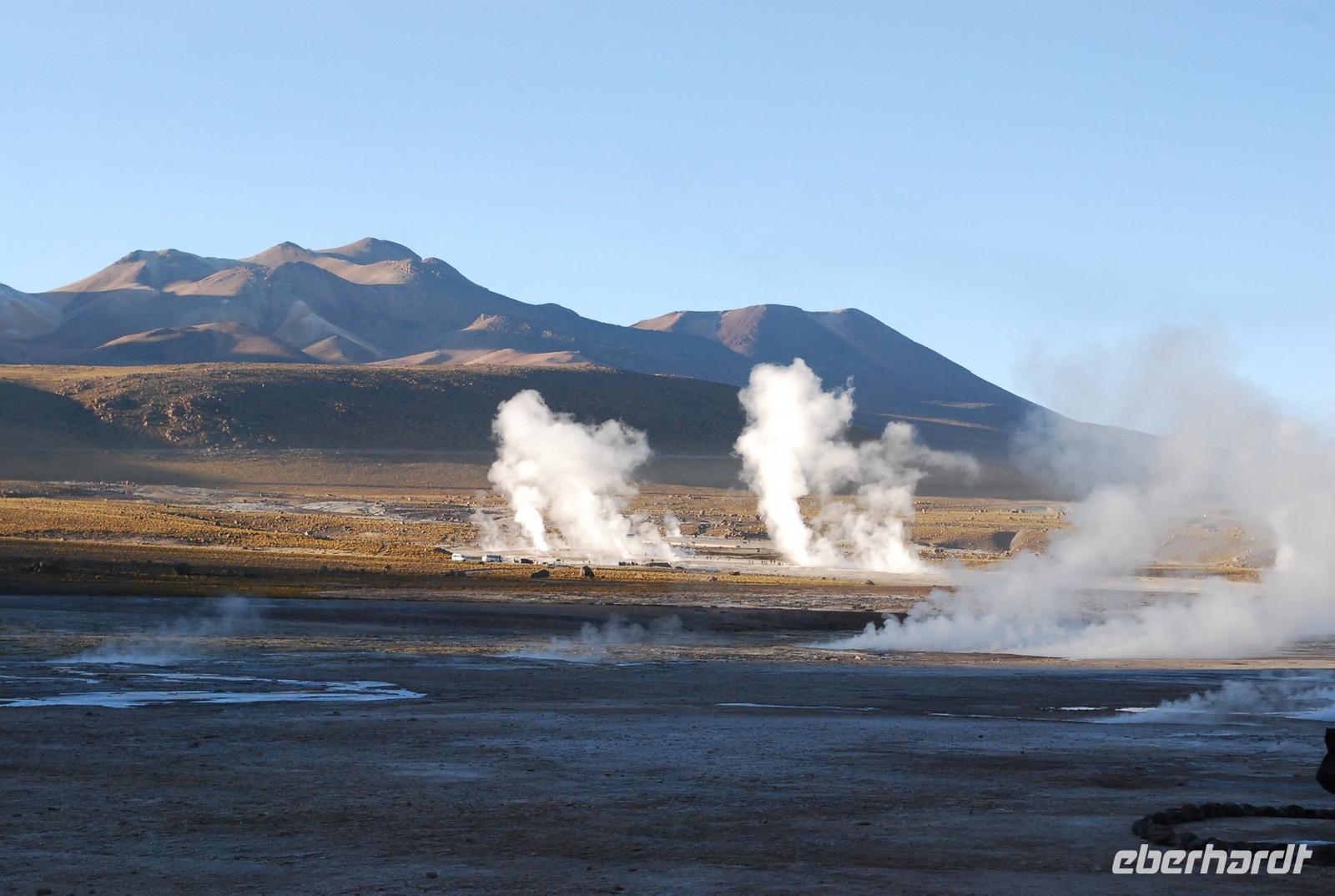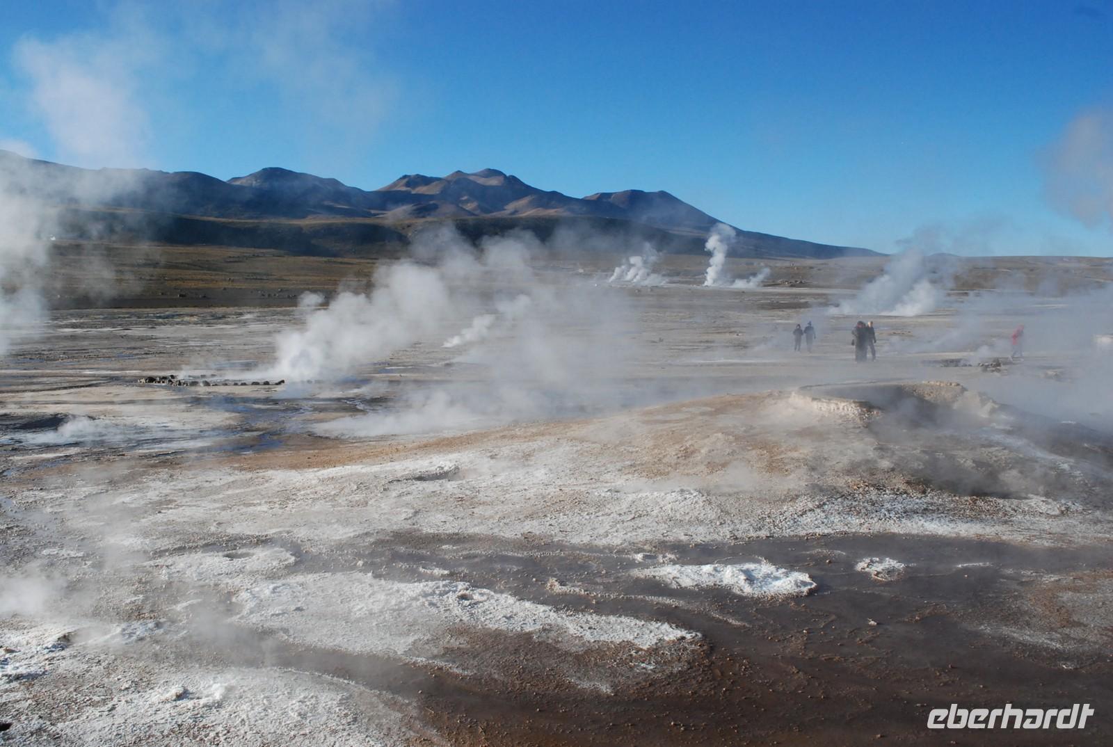 Ein langer, erlebnisreicher Tag erwartet uns, als um vier der Wecker klingelt. Nach einem warmen Tee starten wir die zweistündige Fahrt zu dem höchstgelegenen Geysirfeld der Welt - El Tatio. Schon im Bus müssen wir uns warm anziehen, denn auf 4300 Metern Höhe sind klirrend kalte 12 Grad Minus. Mit Handschuhen und Mütze bewaffnet wandern wir zwischen den Fumarolen während die Sonne über die Berge steigt. Wir beobachten das Naturschauspiel aus nächster Nähe! In der Zwischenzeit werden die Milch und die Eier gekocht und rasch haben Carolina und unser Fahrer Wilson den Frühstückstisch gedeckt. Hier am Geysirfeld können wir auch die scheuen Vicuñas und Vizcachas beobachten. Unsere Reise führt uns nun wieder auf niedrigere Höhen wo wir Guanakos und Lamas sehen. Wir unternehmen einen Spaziergang durch Caspana, welches in einem grünen Tal inmitten der Wüste liegt. In Lasana sind wir zum Essen in einem einheimischen Lokal eingeladen und lassen uns einen Maiseintopf schmecken. Anschließend besichtigen wir noch die Ruine der Atacamena-Siedlung und die älteste Kirche der Region in Chui Chui. Von Calama und der Atacama-Wüste heißt es nun Abschied nehmen, denn wir fliegen zurück nach Santiago de Chile.