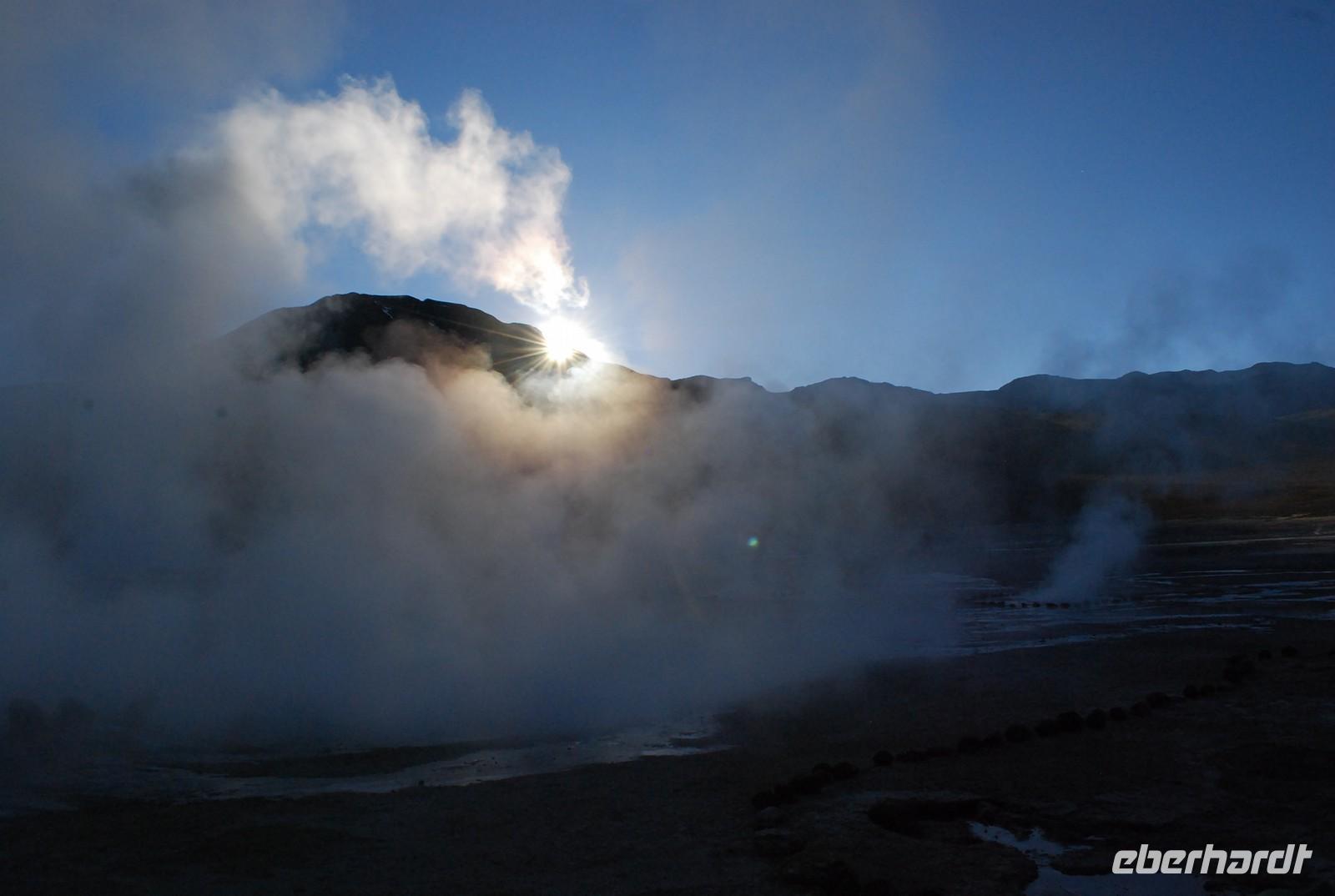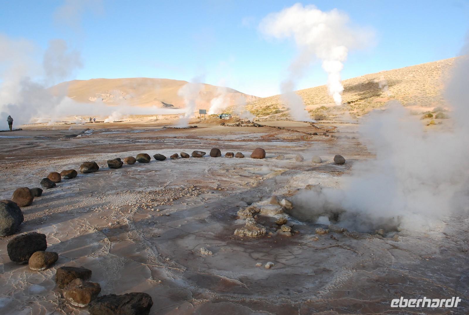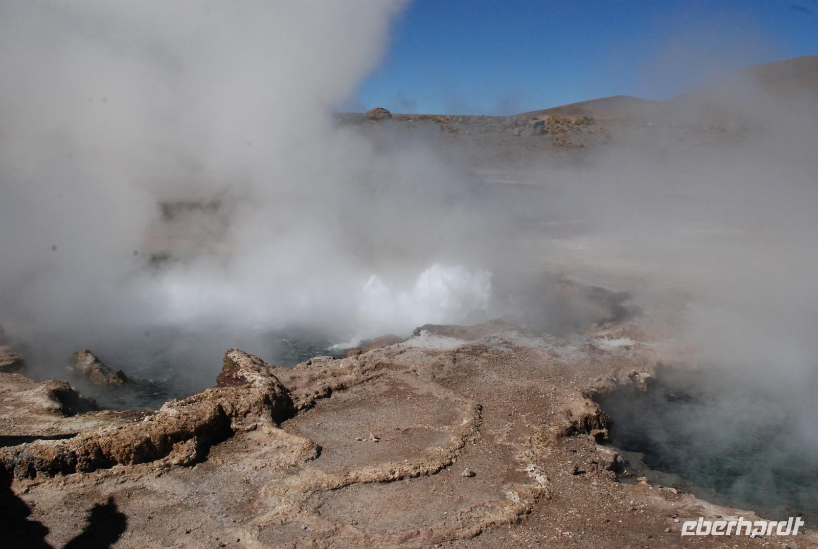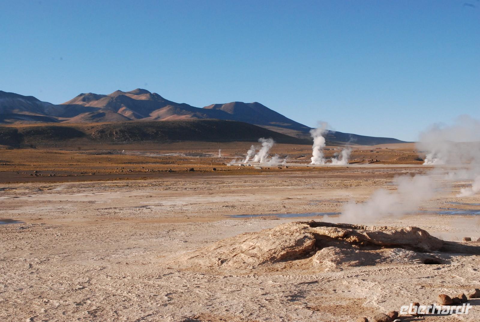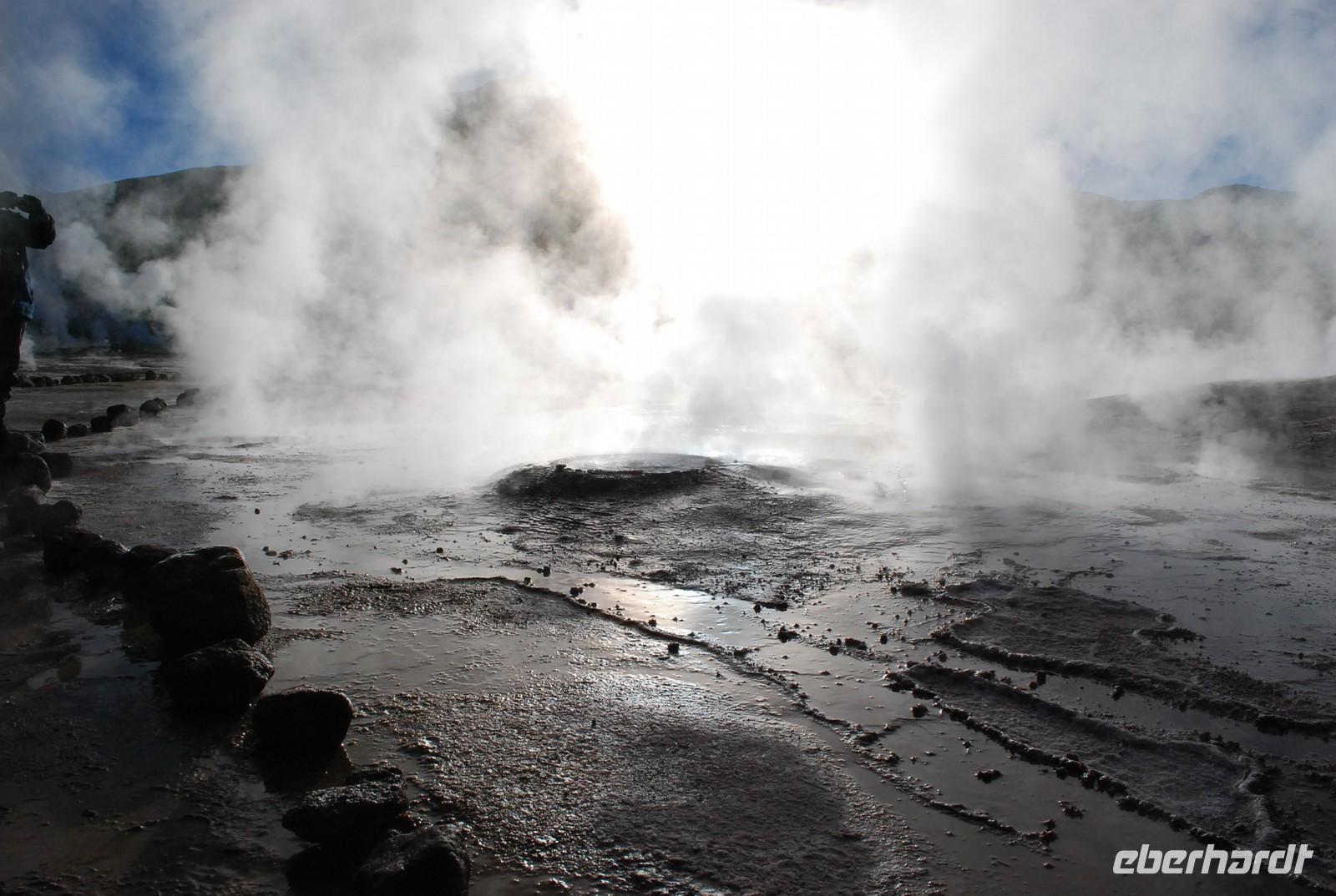 Ein langer, erlebnisreicher Tag erwartet uns, als um vier der Wecker klingelt. Nach einem warmen Tee starten wir die zweistündige Fahrt zu dem höchstgelegenen Geysirfeld der Welt - El Tatio. Schon im Bus müssen wir uns warm anziehen, denn auf 4300 Metern Höhe sind klirrend kalte 12 Grad Minus. Mit Handschuhen und Mütze bewaffnet wandern wir zwischen den Fumarolen während die Sonne über die Berge steigt. Wir beobachten das Naturschauspiel aus nächster Nähe! In der Zwischenzeit werden die Milch und die Eier gekocht und rasch haben Carolina und unser Fahrer Wilson den Frühstückstisch gedeckt. Hier am Geysirfeld können wir auch die scheuen Vicuñas und Vizcachas beobachten. Unsere Reise führt uns nun wieder auf niedrigere Höhen wo wir Guanakos und Lamas sehen. Wir unternehmen einen Spaziergang durch Caspana, welches in einem grünen Tal inmitten der Wüste liegt. In Lasana sind wir zum Essen in einem einheimischen Lokal eingeladen und lassen uns einen Maiseintopf schmecken. Anschließend besichtigen wir noch die Ruine der Atacamena-Siedlung und die älteste Kirche der Region in Chui Chui. Von Calama und der Atacama-Wüste heißt es nun Abschied nehmen, denn wir fliegen zurück nach Santiago de Chile.