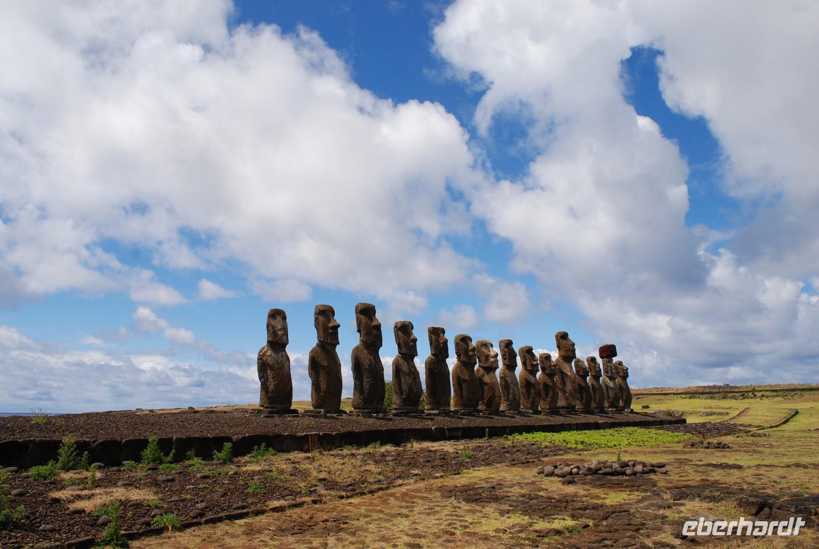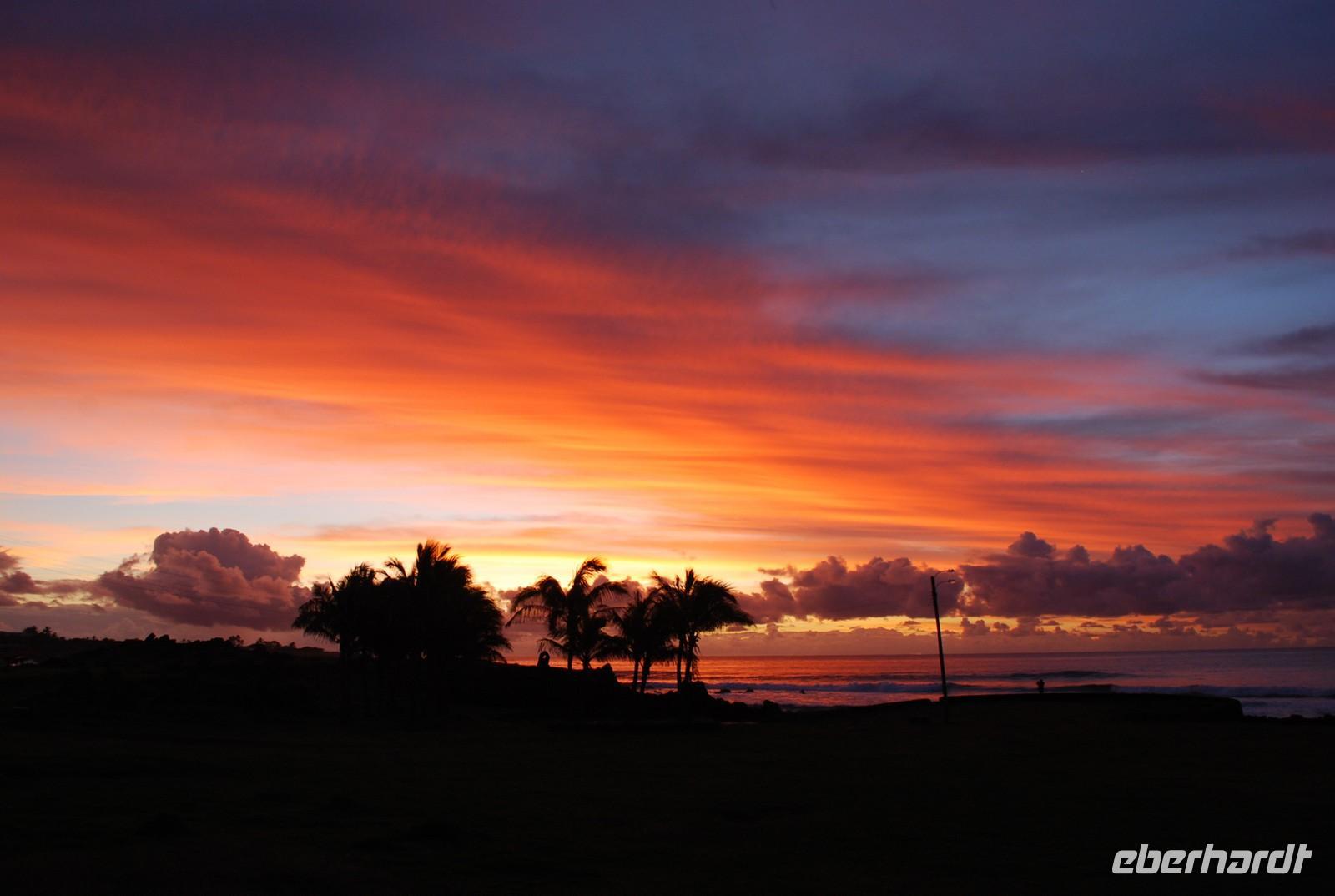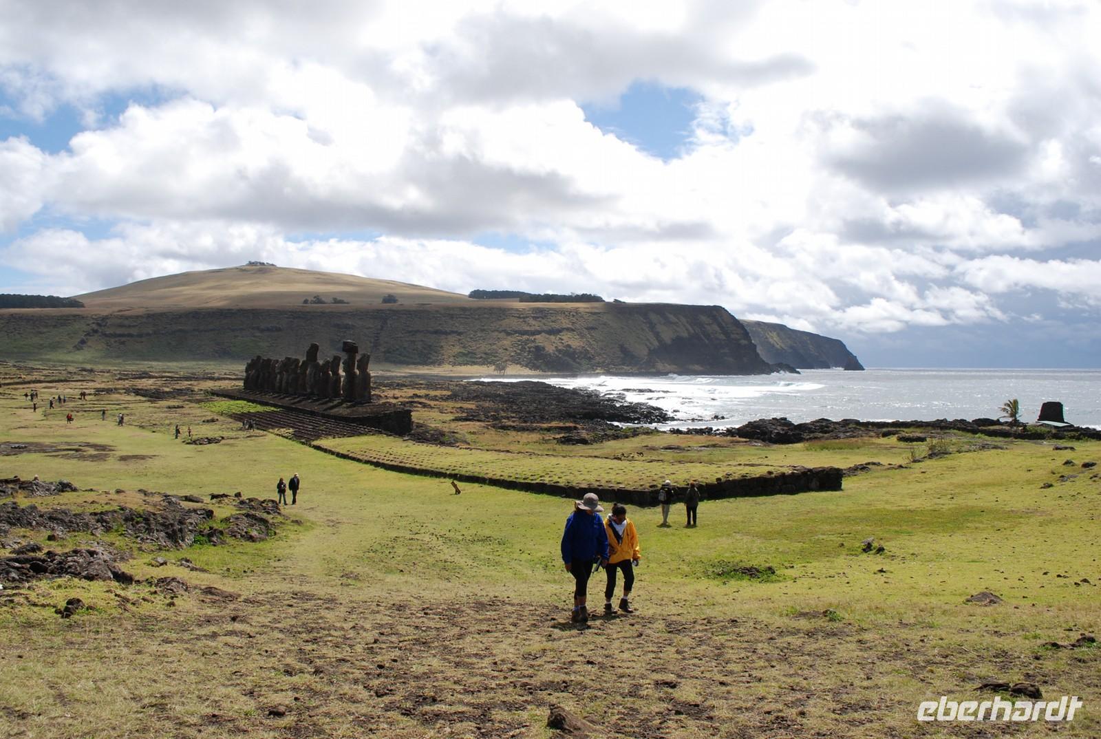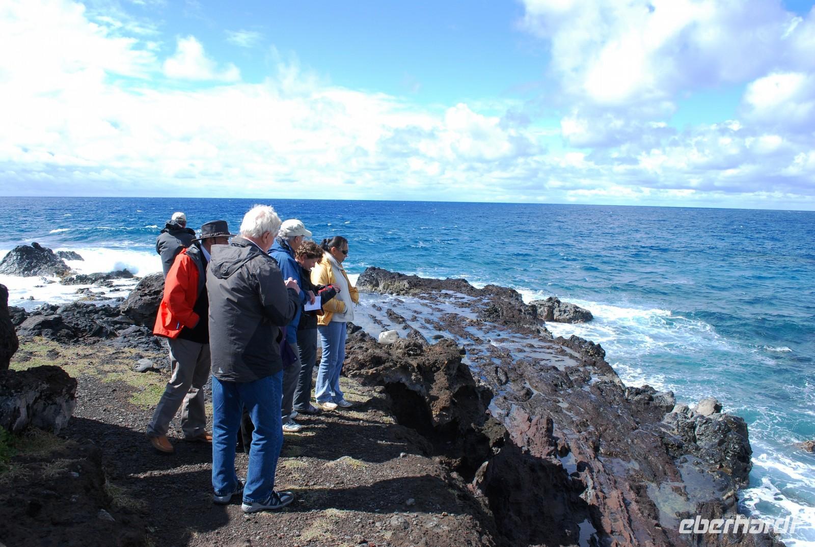 Und heute begrüßt uns wieder einmal ein regnerischer Morgen. Dennoch brechen wir frohen Mutes auf zu unserer Ganztagestour - schließlich hat die Wetterfee für den Nachmittag nur 10 Prozent Niederschlagswahrscheinlichkeit vorhergesagt. Also werden auch die Badesachen und die Strandhandtücher vom Hotel eingepackt. Wir beginnen unsere Besichtigungen an zwei archäologischen Plätzen an der Südküste der Insel: Vaihu und Akahanga. Die Moais wurden hier noch nicht wieder aufgerichtet aber man kann sich schön die Siedlungen der Bewohner der Osterinsel, die Rapa Nui, in der Bucht vorstellen. Der beeindruckende Ahu (ein Altar) mit 15 Moai "Tongariki" wurde durch das Seebeben und die Flutwelle 1960 zerstört aber durch eine japanische Forschergruppe wieder aufgerichtet. Von hier sieht man den Vulkan Rano Raraku, wo die Moai gefertigt wurden. Hier unternehmen wir einen Spaziergang am Hang des Vulkans entlang, der als Steinbruch diente. Man sieht die Moai, wie sie noch verbunden mit dem Fels sind und wie sie bereits für die Feinarbeiten aufgerichtet wurden. Nach dem Mittagessen im Freien spazieren wir zum Kraterrand des Vulkans. Ein Süßwassersee hat sich hier vom Regenwasser gebildet, man sieht Pferde grasen und die unbeendeten Moai-Figuren. Bei der Besichtigung des magnetischen Nabels der Welt sammeln wir Kräfte bevor wir uns am weißen Sandstrand Anakena in die Fluten werfen. Anschließend besuchen wir Ahu Akivi, wo wir unsere Besichtigung gestern abbrechen mussten. Am Vulkan Puna Pau sehen wir wie die Hutbedeckungen der Moai gefertigt wurden und haben einen schönen Ausblick über Hanga Roa und den Osten der Insel. Den schönen und letztendlich doch sonnigen Tag lassen wir wieder bei einem typischen Abendessen im Restaurant ausklingen.