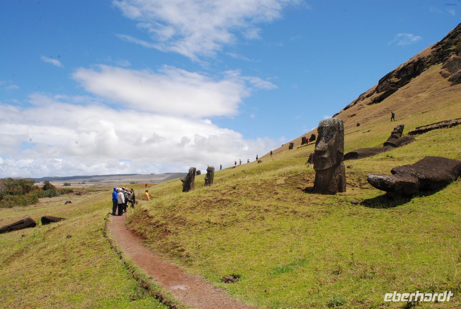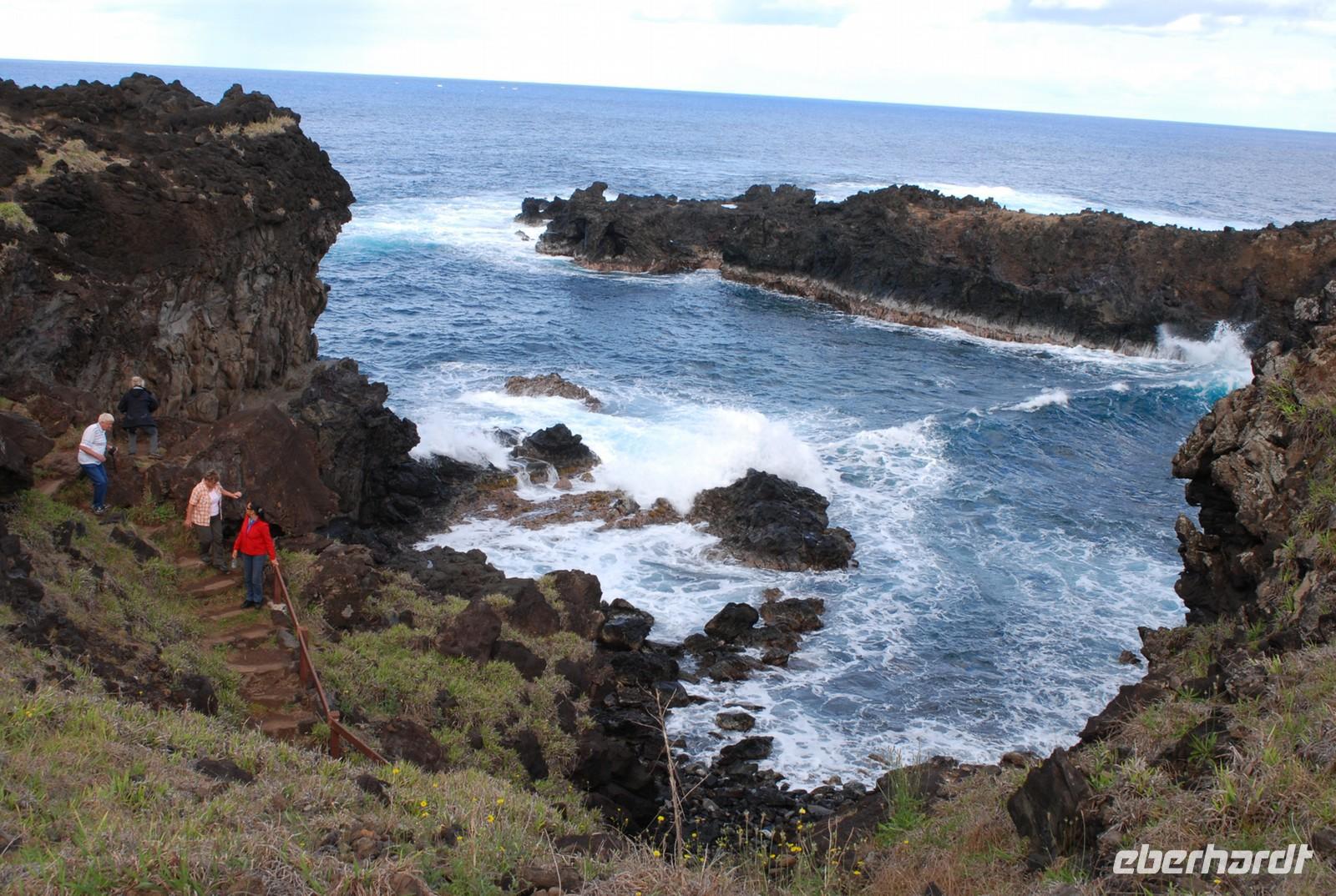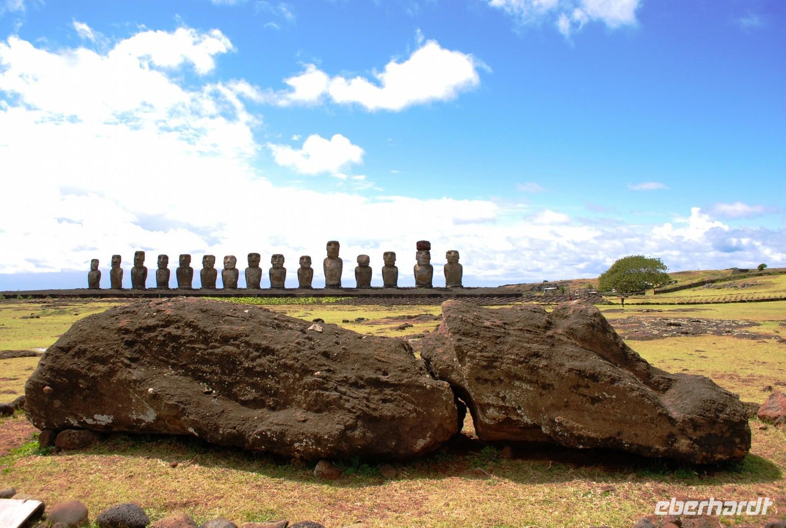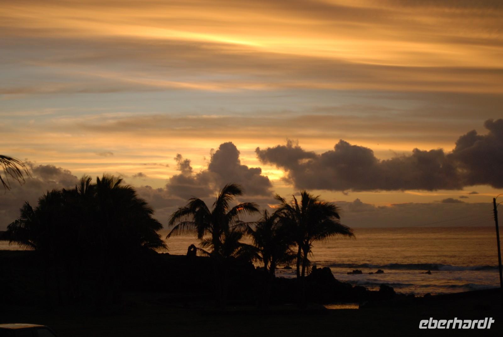 Und heute begrüßt uns wieder einmal ein regnerischer Morgen. Dennoch brechen wir frohen Mutes auf zu unserer Ganztagestour - schließlich hat die Wetterfee für den Nachmittag nur 10 Prozent Niederschlagswahrscheinlichkeit vorhergesagt. Also werden auch die Badesachen und die Strandhandtücher vom Hotel eingepackt. Wir beginnen unsere Besichtigungen an zwei archäologischen Plätzen an der Südküste der Insel: Vaihu und Akahanga. Die Moais wurden hier noch nicht wieder aufgerichtet aber man kann sich schön die Siedlungen der Bewohner der Osterinsel, die Rapa Nui, in der Bucht vorstellen. Der beeindruckende Ahu (ein Altar) mit 15 Moai "Tongariki" wurde durch das Seebeben und die Flutwelle 1960 zerstört aber durch eine japanische Forschergruppe wieder aufgerichtet. Von hier sieht man den Vulkan Rano Raraku, wo die Moai gefertigt wurden. Hier unternehmen wir einen Spaziergang am Hang des Vulkans entlang, der als Steinbruch diente. Man sieht die Moai, wie sie noch verbunden mit dem Fels sind und wie sie bereits für die Feinarbeiten aufgerichtet wurden. Nach dem Mittagessen im Freien spazieren wir zum Kraterrand des Vulkans. Ein Süßwassersee hat sich hier vom Regenwasser gebildet, man sieht Pferde grasen und die unbeendeten Moai-Figuren. Bei der Besichtigung des magnetischen Nabels der Welt sammeln wir Kräfte bevor wir uns am weißen Sandstrand Anakena in die Fluten werfen. Anschließend besuchen wir Ahu Akivi, wo wir unsere Besichtigung gestern abbrechen mussten. Am Vulkan Puna Pau sehen wir wie die Hutbedeckungen der Moai gefertigt wurden und haben einen schönen Ausblick über Hanga Roa und den Osten der Insel. Den schönen und letztendlich doch sonnigen Tag lassen wir wieder bei einem typischen Abendessen im Restaurant ausklingen.