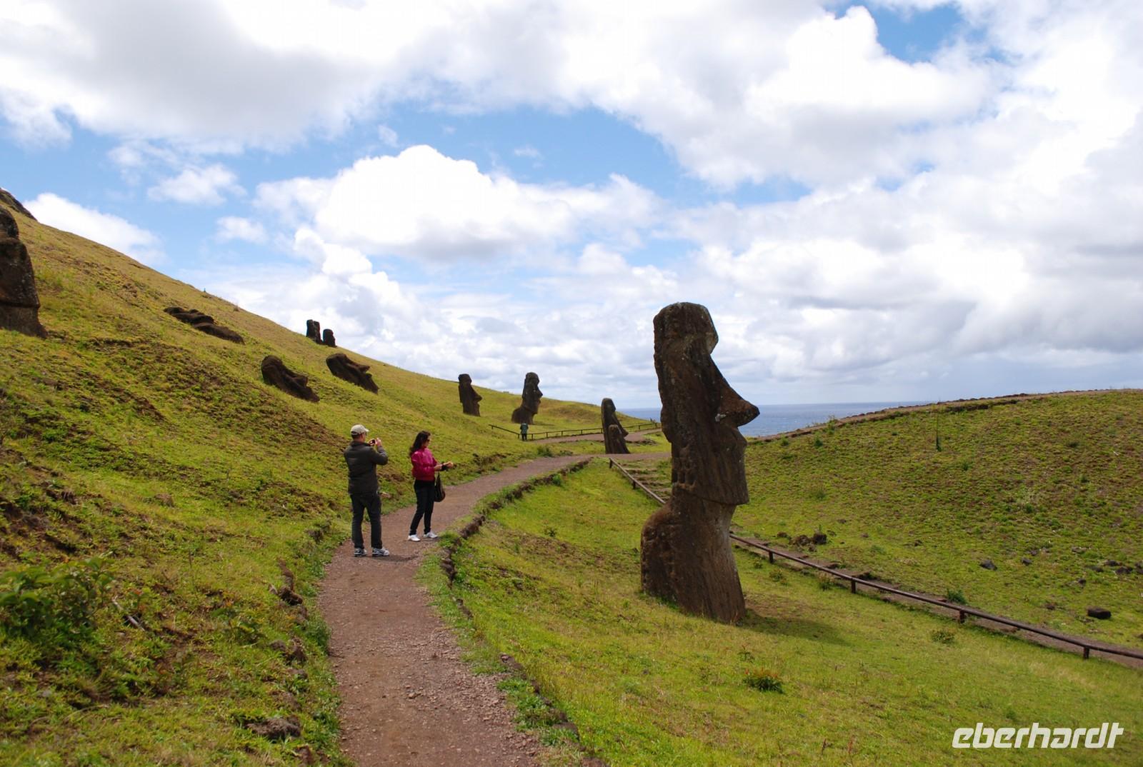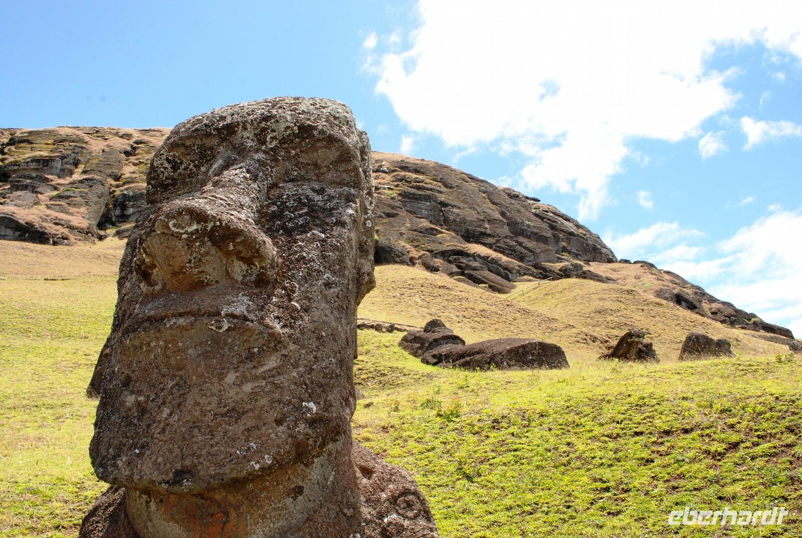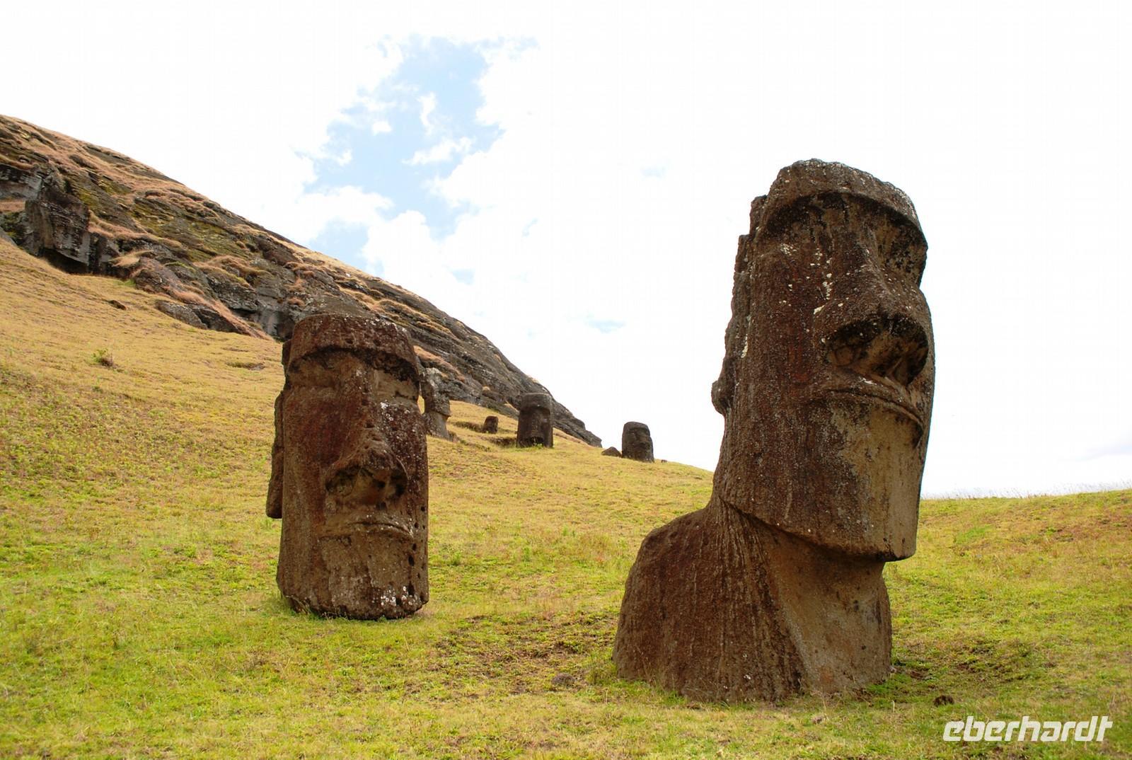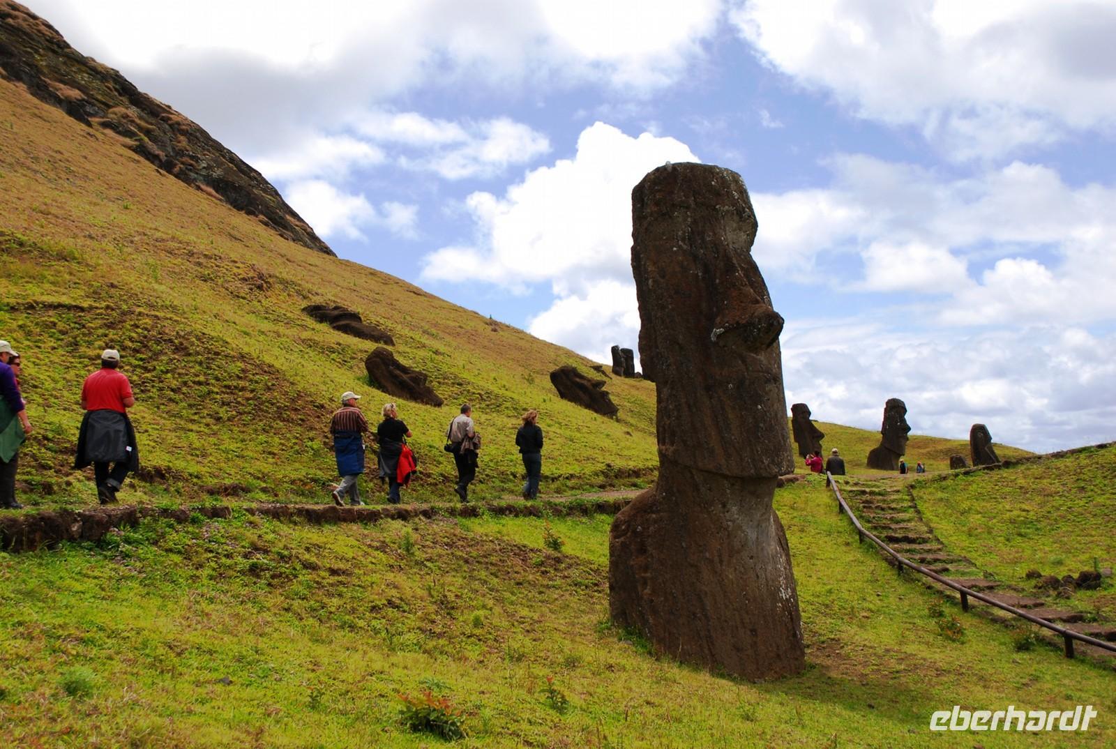 Und heute begrüßt uns wieder einmal ein regnerischer Morgen. Dennoch brechen wir frohen Mutes auf zu unserer Ganztagestour - schließlich hat die Wetterfee für den Nachmittag nur 10 Prozent Niederschlagswahrscheinlichkeit vorhergesagt. Also werden auch die Badesachen und die Strandhandtücher vom Hotel eingepackt. Wir beginnen unsere Besichtigungen an zwei archäologischen Plätzen an der Südküste der Insel: Vaihu und Akahanga. Die Moais wurden hier noch nicht wieder aufgerichtet aber man kann sich schön die Siedlungen der Bewohner der Osterinsel, die Rapa Nui, in der Bucht vorstellen. Der beeindruckende Ahu (ein Altar) mit 15 Moai "Tongariki" wurde durch das Seebeben und die Flutwelle 1960 zerstört aber durch eine japanische Forschergruppe wieder aufgerichtet. Von hier sieht man den Vulkan Rano Raraku, wo die Moai gefertigt wurden. Hier unternehmen wir einen Spaziergang am Hang des Vulkans entlang, der als Steinbruch diente. Man sieht die Moai, wie sie noch verbunden mit dem Fels sind und wie sie bereits für die Feinarbeiten aufgerichtet wurden. Nach dem Mittagessen im Freien spazieren wir zum Kraterrand des Vulkans. Ein Süßwassersee hat sich hier vom Regenwasser gebildet, man sieht Pferde grasen und die unbeendeten Moai-Figuren. Bei der Besichtigung des magnetischen Nabels der Welt sammeln wir Kräfte bevor wir uns am weißen Sandstrand Anakena in die Fluten werfen. Anschließend besuchen wir Ahu Akivi, wo wir unsere Besichtigung gestern abbrechen mussten. Am Vulkan Puna Pau sehen wir wie die Hutbedeckungen der Moai gefertigt wurden und haben einen schönen Ausblick über Hanga Roa und den Osten der Insel. Den schönen und letztendlich doch sonnigen Tag lassen wir wieder bei einem typischen Abendessen im Restaurant ausklingen.