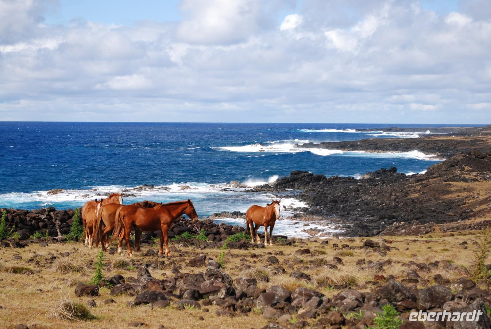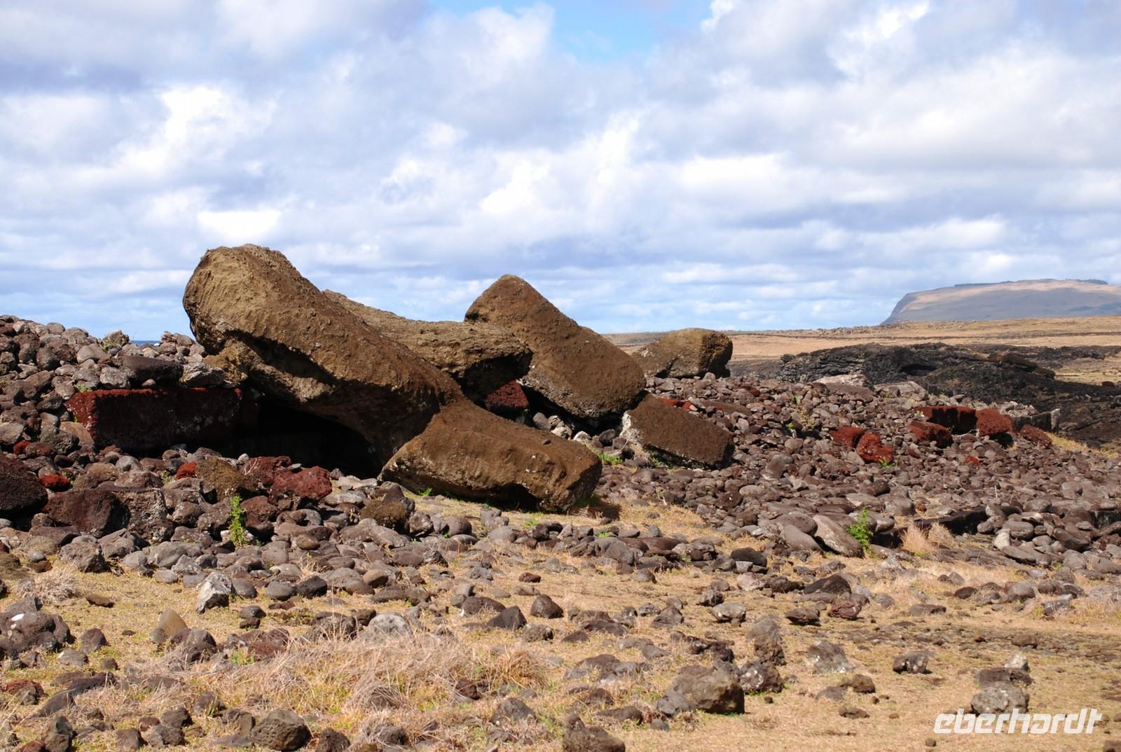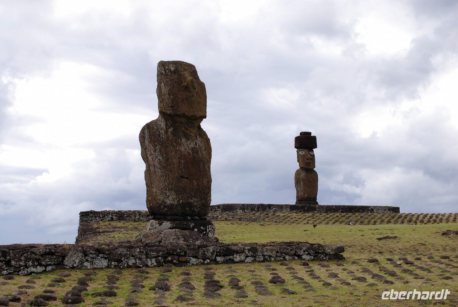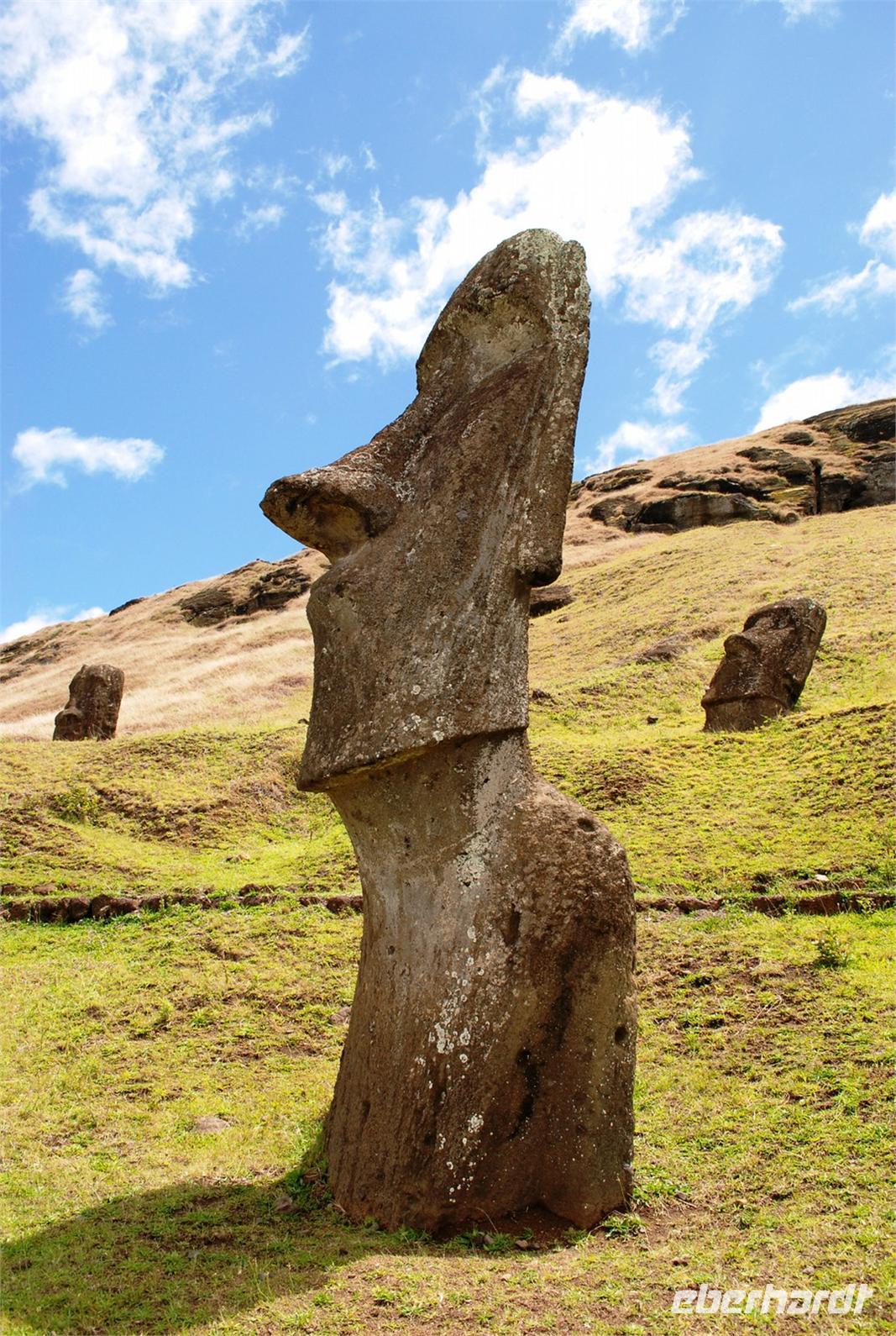 Und heute begrüßt uns wieder einmal ein regnerischer Morgen. Dennoch brechen wir frohen Mutes auf zu unserer Ganztagestour - schließlich hat die Wetterfee für den Nachmittag nur 10 Prozent Niederschlagswahrscheinlichkeit vorhergesagt. Also werden auch die Badesachen und die Strandhandtücher vom Hotel eingepackt. Wir beginnen unsere Besichtigungen an zwei archäologischen Plätzen an der Südküste der Insel: Vaihu und Akahanga. Die Moais wurden hier noch nicht wieder aufgerichtet aber man kann sich schön die Siedlungen der Bewohner der Osterinsel, die Rapa Nui, in der Bucht vorstellen. Der beeindruckende Ahu (ein Altar) mit 15 Moai "Tongariki" wurde durch das Seebeben und die Flutwelle 1960 zerstört aber durch eine japanische Forschergruppe wieder aufgerichtet. Von hier sieht man den Vulkan Rano Raraku, wo die Moai gefertigt wurden. Hier unternehmen wir einen Spaziergang am Hang des Vulkans entlang, der als Steinbruch diente. Man sieht die Moai, wie sie noch verbunden mit dem Fels sind und wie sie bereits für die Feinarbeiten aufgerichtet wurden. Nach dem Mittagessen im Freien spazieren wir zum Kraterrand des Vulkans. Ein Süßwassersee hat sich hier vom Regenwasser gebildet, man sieht Pferde grasen und die unbeendeten Moai-Figuren. Bei der Besichtigung des magnetischen Nabels der Welt sammeln wir Kräfte bevor wir uns am weißen Sandstrand Anakena in die Fluten werfen. Anschließend besuchen wir Ahu Akivi, wo wir unsere Besichtigung gestern abbrechen mussten. Am Vulkan Puna Pau sehen wir wie die Hutbedeckungen der Moai gefertigt wurden und haben einen schönen Ausblick über Hanga Roa und den Osten der Insel. Den schönen und letztendlich doch sonnigen Tag lassen wir wieder bei einem typischen Abendessen im Restaurant ausklingen.