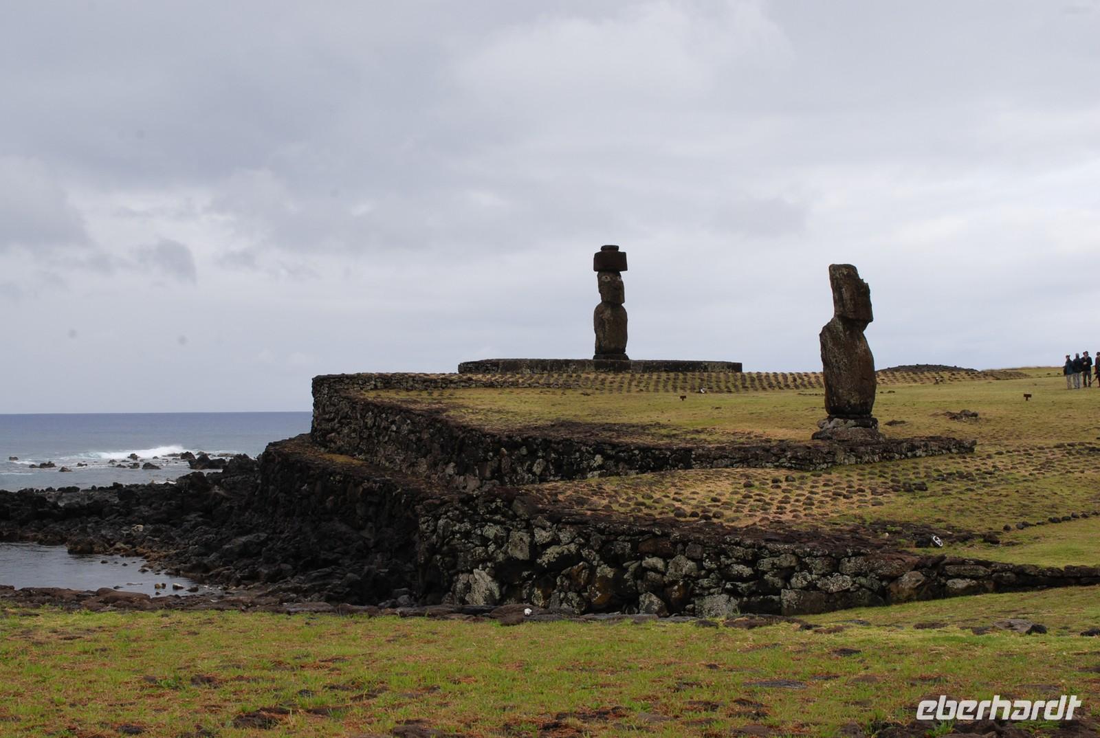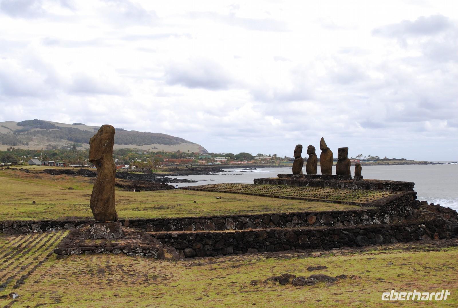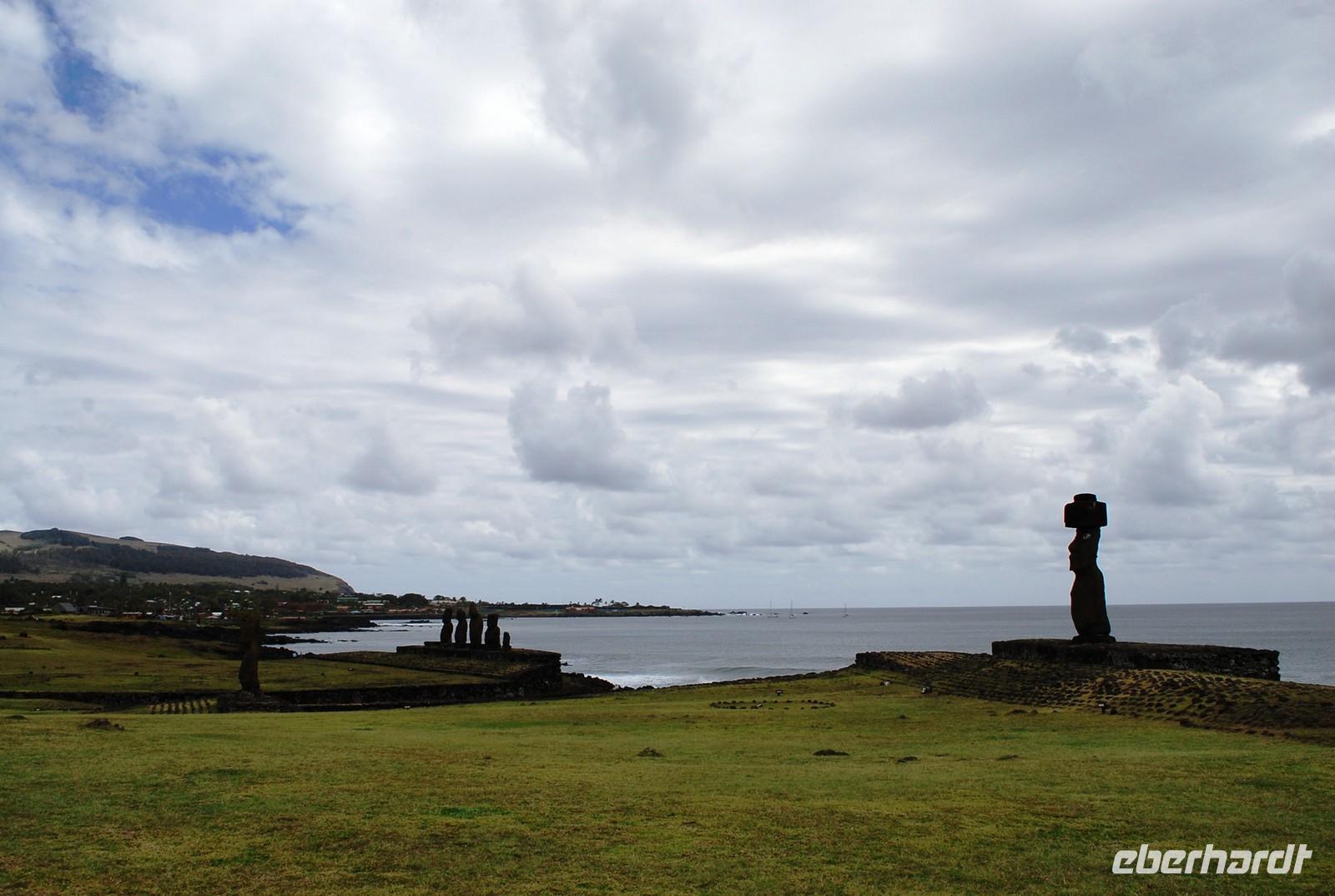 Nach einem heftigen Regenguss in der Nacht begrüßt uns Claudia heute Morgen am Hotel. Wir fahren zum archäologischen Platz Ahu Tahai, der sich ganz in der Nähe des Hotels befindet. Hier sehen wir einen Hühnerstall, den Grundriss eines Bootshauses und drei verschiedene Ahus mit wiederaufgestellten Moai-Figuren. Leider fängt es wieder an zu regnen so dass wir uns in den Bus flüchten. Bei der nächsten Besichtigung Ahu Akivi regnet es leider immer noch so stark dass wir beim Umkehrmanöver des Busses alle pitschnass werden. Wir beschließen dass wir unser Programm am nächsten oder am übernächsten Tag fortsetzen werden wenn auch die Straßenbedingungen für den Bus wieder besser sind. Mit trockenen Kleidern spazieren wir nachmittags durch den Ort und besuchen das Museum der Osterinsel, welches sich mit den verschiedenen Theorien zur Besiedelung und zur Ausübung der Moai-Fertigung beschäftigt.