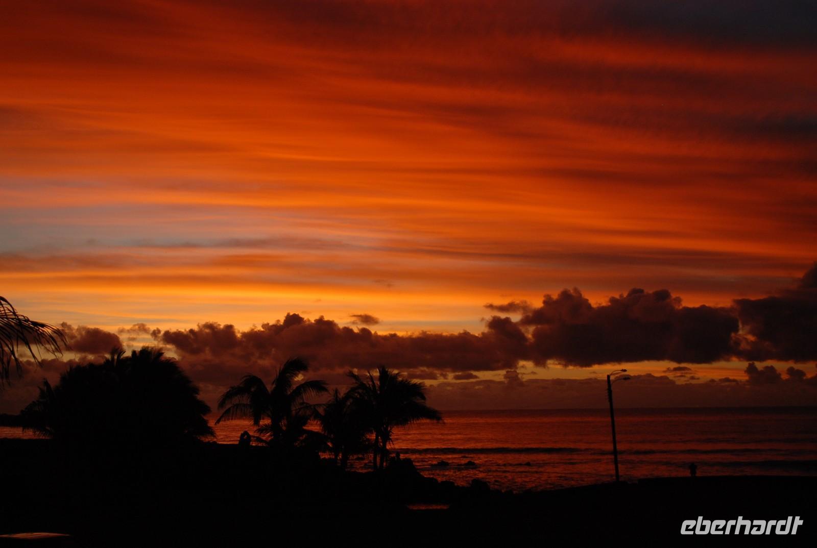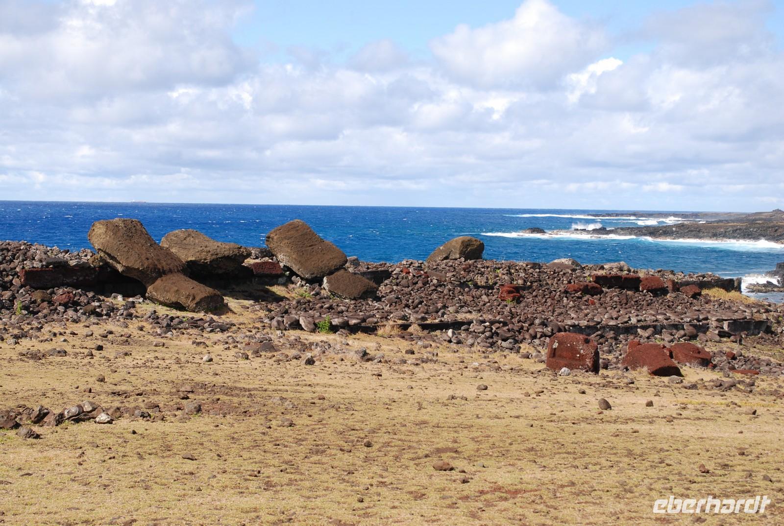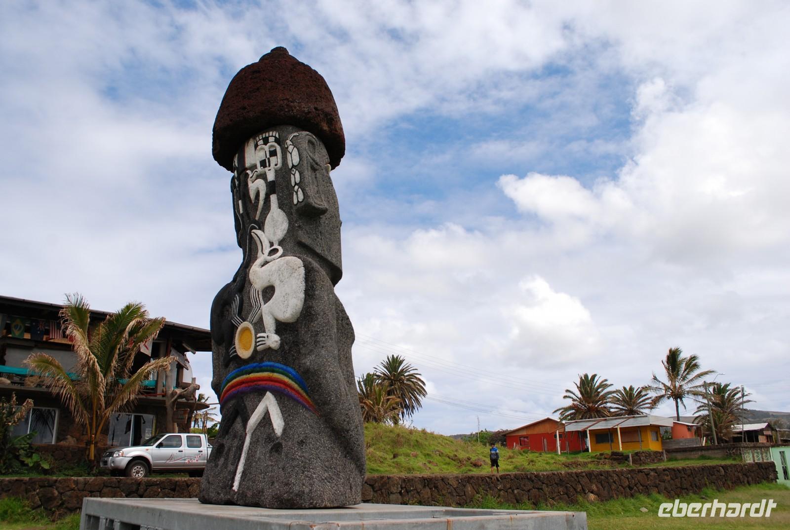 Nach einem heftigen Regenguss in der Nacht begrüßt uns Claudia heute Morgen am Hotel. Wir fahren zum archäologischen Platz Ahu Tahai, der sich ganz in der Nähe des Hotels befindet. Hier sehen wir einen Hühnerstall, den Grundriss eines Bootshauses und drei verschiedene Ahus mit wiederaufgestellten Moai-Figuren. Leider fängt es wieder an zu regnen so dass wir uns in den Bus flüchten. Bei der nächsten Besichtigung Ahu Akivi regnet es leider immer noch so stark dass wir beim Umkehrmanöver des Busses alle pitschnass werden. Wir beschließen dass wir unser Programm am nächsten oder am übernächsten Tag fortsetzen werden wenn auch die Straßenbedingungen für den Bus wieder besser sind. Mit trockenen Kleidern spazieren wir nachmittags durch den Ort und besuchen das Museum der Osterinsel, welches sich mit den verschiedenen Theorien zur Besiedelung und zur Ausübung der Moai-Fertigung beschäftigt.
