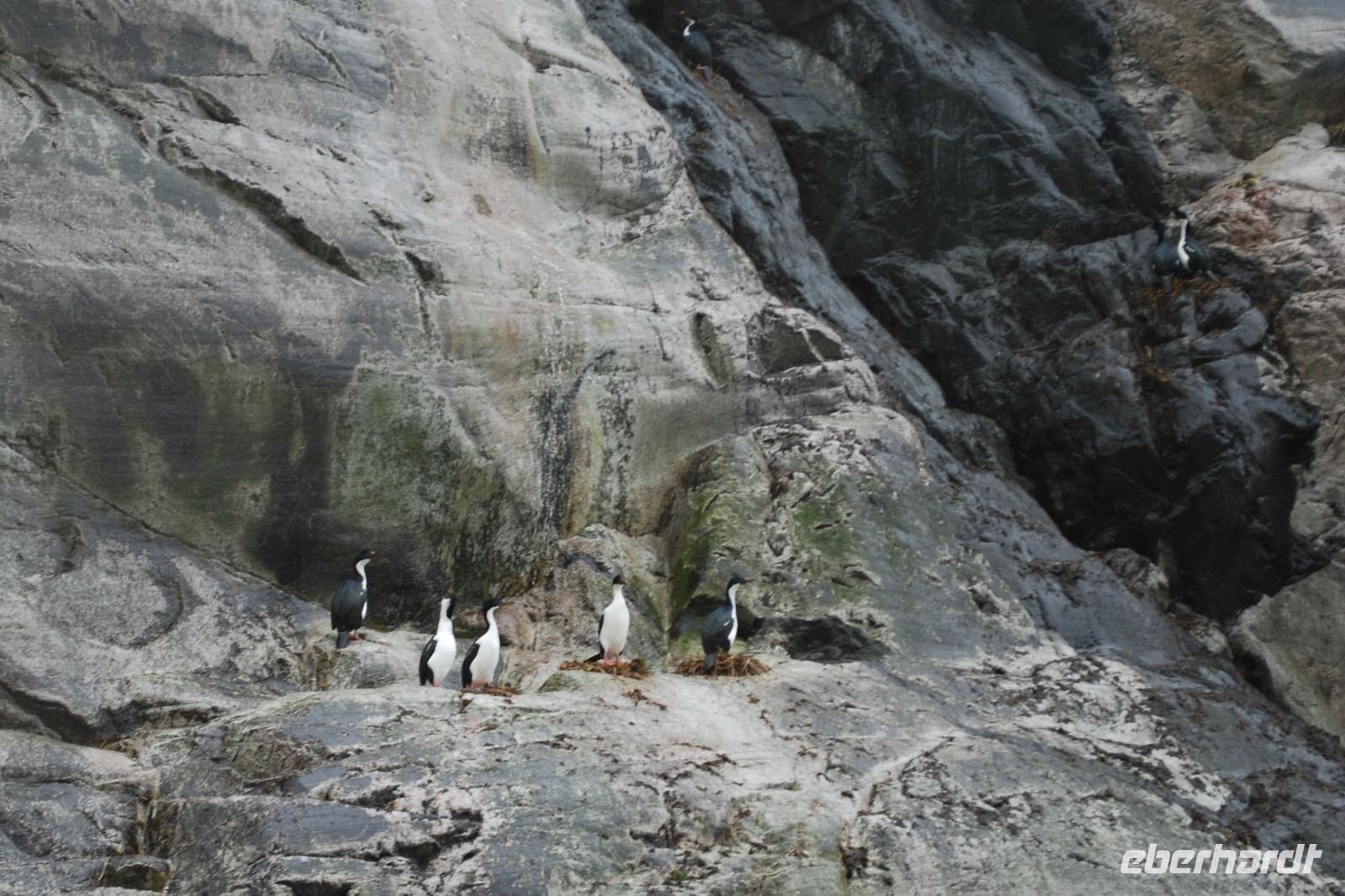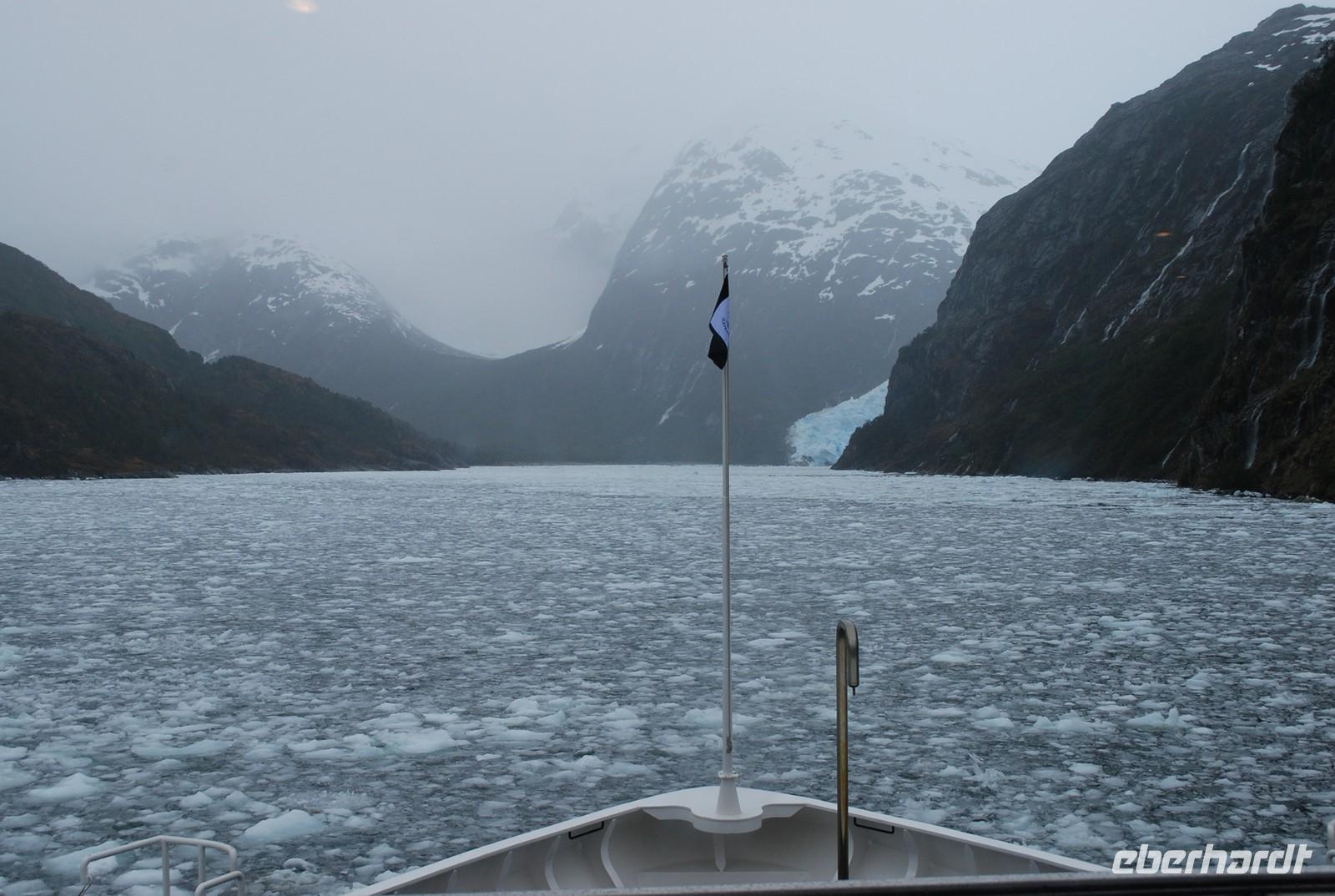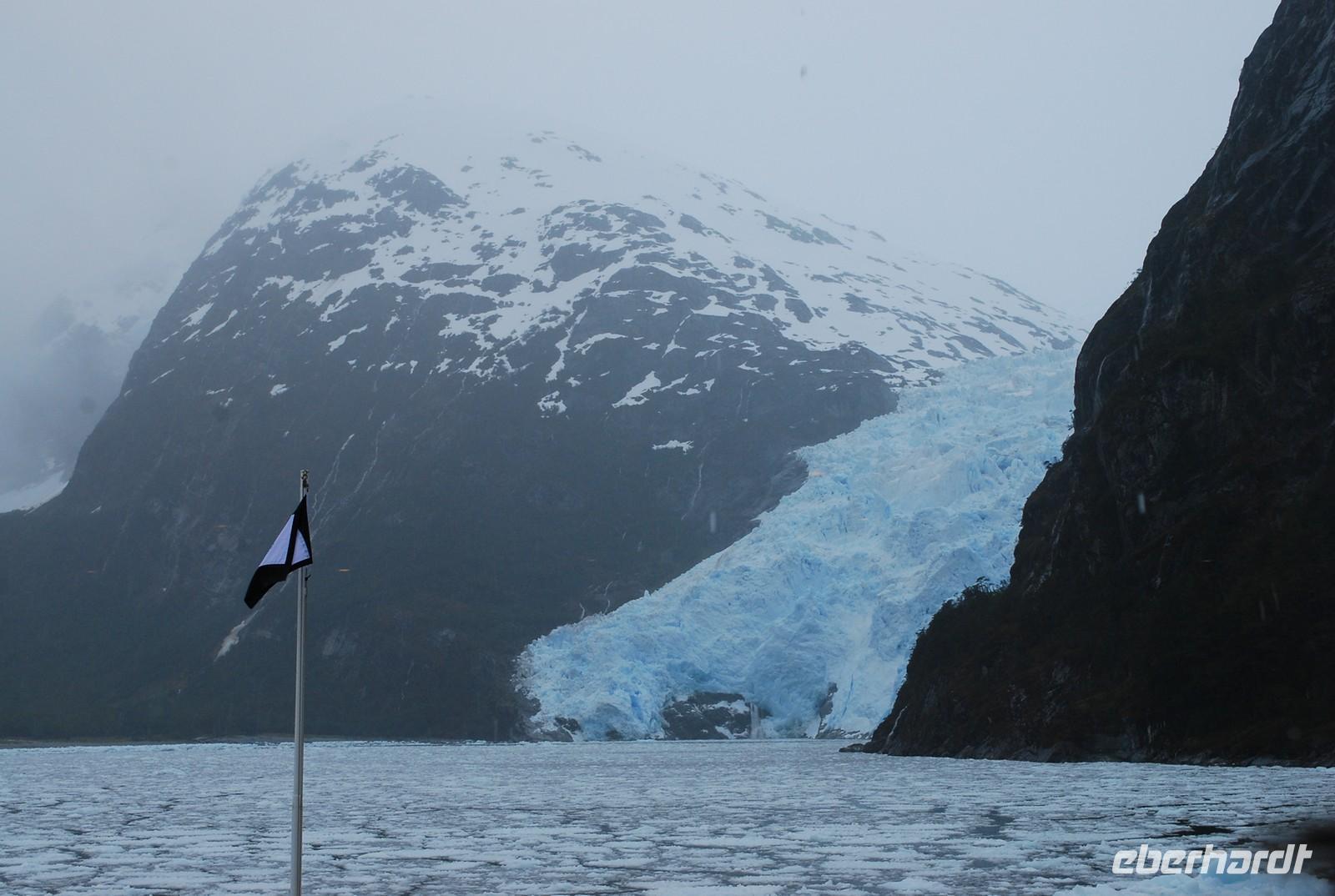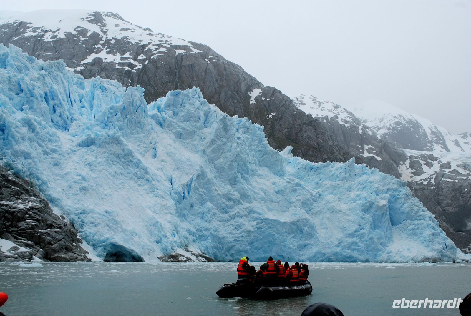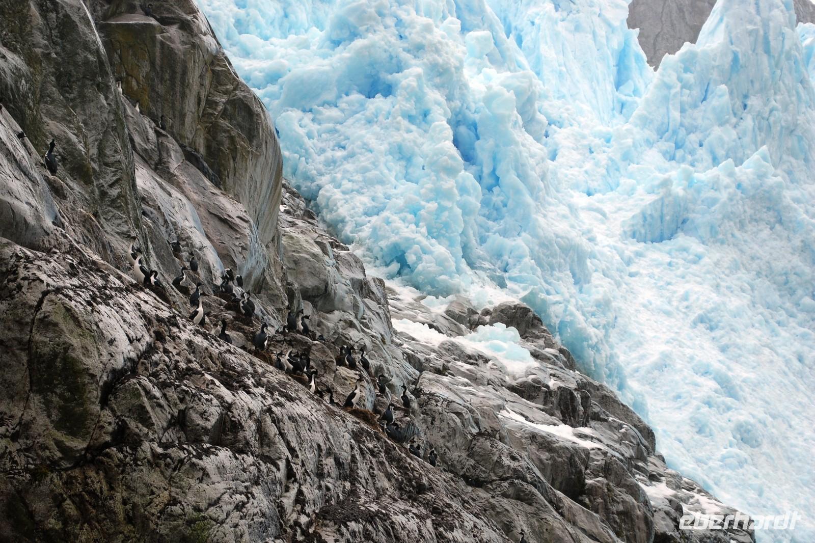 Es regnet beständig aber wir unternehmen dennoch die beeindruckende Fahrt im Zodiak in den Fjord hinein. Ganz am Ende hängt der Gletscher Piloto steil nach unten und mündet im Wasser. Wir werden Zeuge, wie plötzlich mehrere Brocken Eis zusammen wie in einem Wasserfall von oben abrutschen und nach unten donnern. Sehr spektakulär! Neben dem Gletscher nisten in den steilen Felsen Kormorane - Felsen- und Blauaugenkormorane. Unbeeindruckt von unserem Besuch behüten Sie ihre Nester. Die Bootsführer "drohen" uns eine Eis-Dusche unter dem Wasserfall an falls wir Beschwerden zur Kreuzfahrt vorbringen. An Bord haben wir kurz Zeit uns aufzuwärmen, bevor der Gletscher Günter Plüschow angekündigt wird. Das Kreuzfahrtschiff ist ans Ende des Seno Chico gefahren, wo sich der Gletscher befindet. Vom Deck bestaunen wir auch dieses blau-weiße Wunder bevor das Schiff Kurs auf die Magellan-Straße nimmt. Wir lassen den letzten Abend an Bord wieder bei einem köstlichen 4-Gänge-Menü ausklingen und werden vom Kapitän verabschiedet.