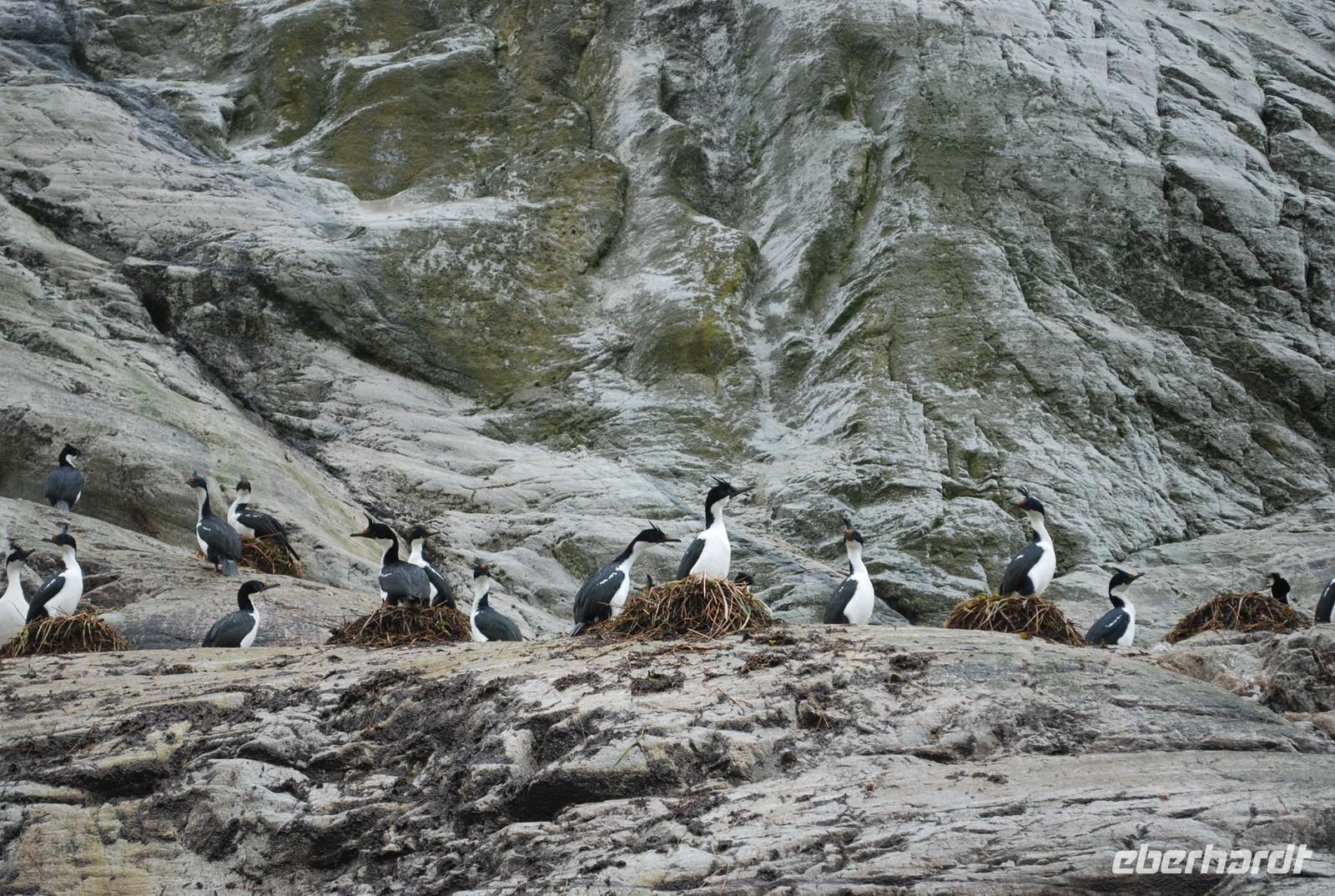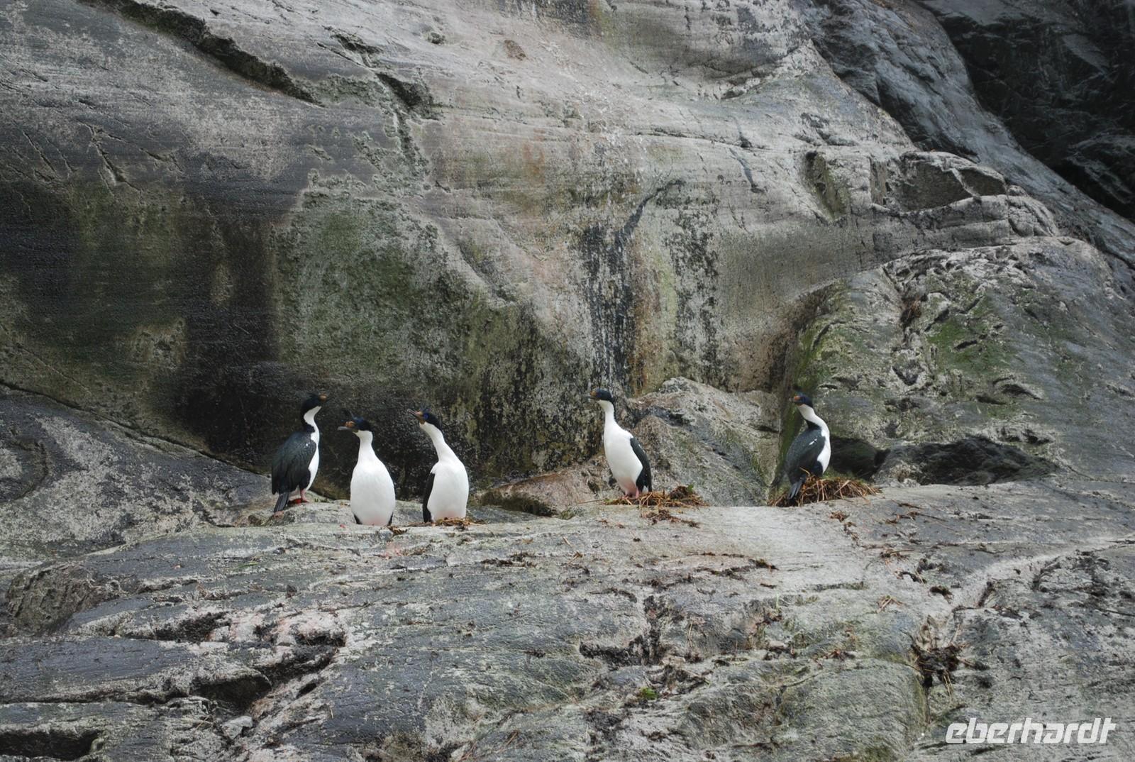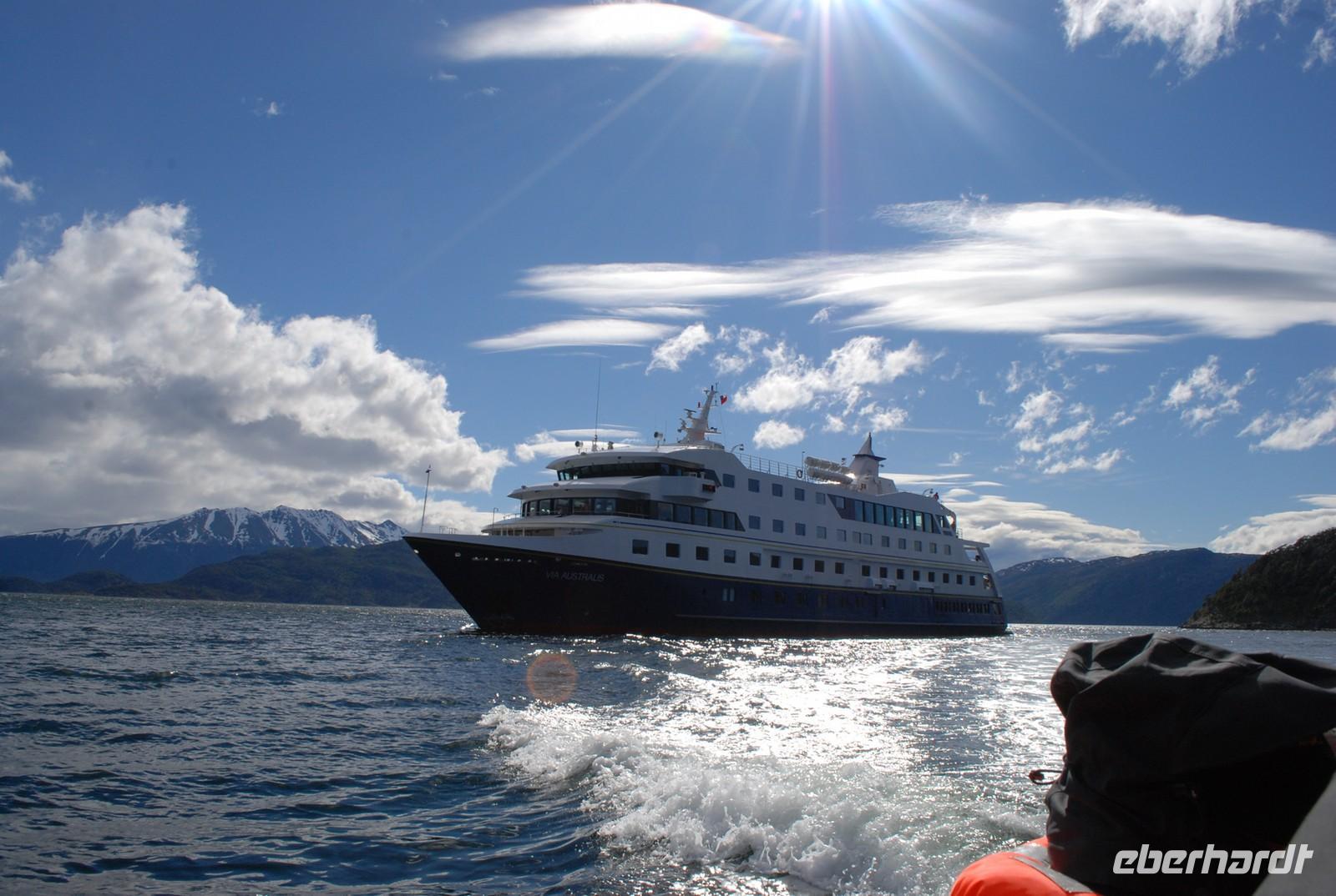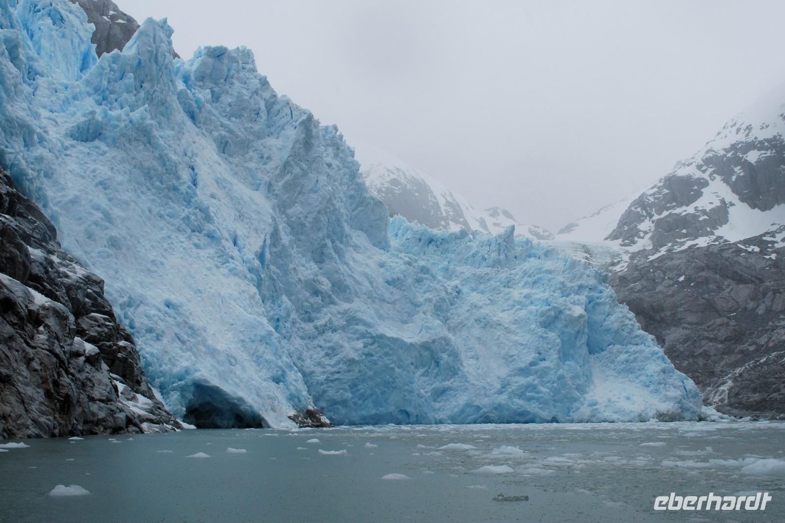 Es regnet beständig aber wir unternehmen dennoch die beeindruckende Fahrt im Zodiak in den Fjord hinein. Ganz am Ende hängt der Gletscher Piloto steil nach unten und mündet im Wasser. Wir werden Zeuge, wie plötzlich mehrere Brocken Eis zusammen wie in einem Wasserfall von oben abrutschen und nach unten donnern. Sehr spektakulär! Neben dem Gletscher nisten in den steilen Felsen Kormorane - Felsen- und Blauaugenkormorane. Unbeeindruckt von unserem Besuch behüten Sie ihre Nester. Die Bootsführer "drohen" uns eine Eis-Dusche unter dem Wasserfall an falls wir Beschwerden zur Kreuzfahrt vorbringen. An Bord haben wir kurz Zeit uns aufzuwärmen, bevor der Gletscher Günter Plüschow angekündigt wird. Das Kreuzfahrtschiff ist ans Ende des Seno Chico gefahren, wo sich der Gletscher befindet. Vom Deck bestaunen wir auch dieses blau-weiße Wunder bevor das Schiff Kurs auf die Magellan-Straße nimmt. Wir lassen den letzten Abend an Bord wieder bei einem köstlichen 4-Gänge-Menü ausklingen und werden vom Kapitän verabschiedet.