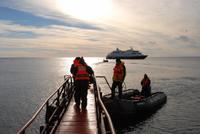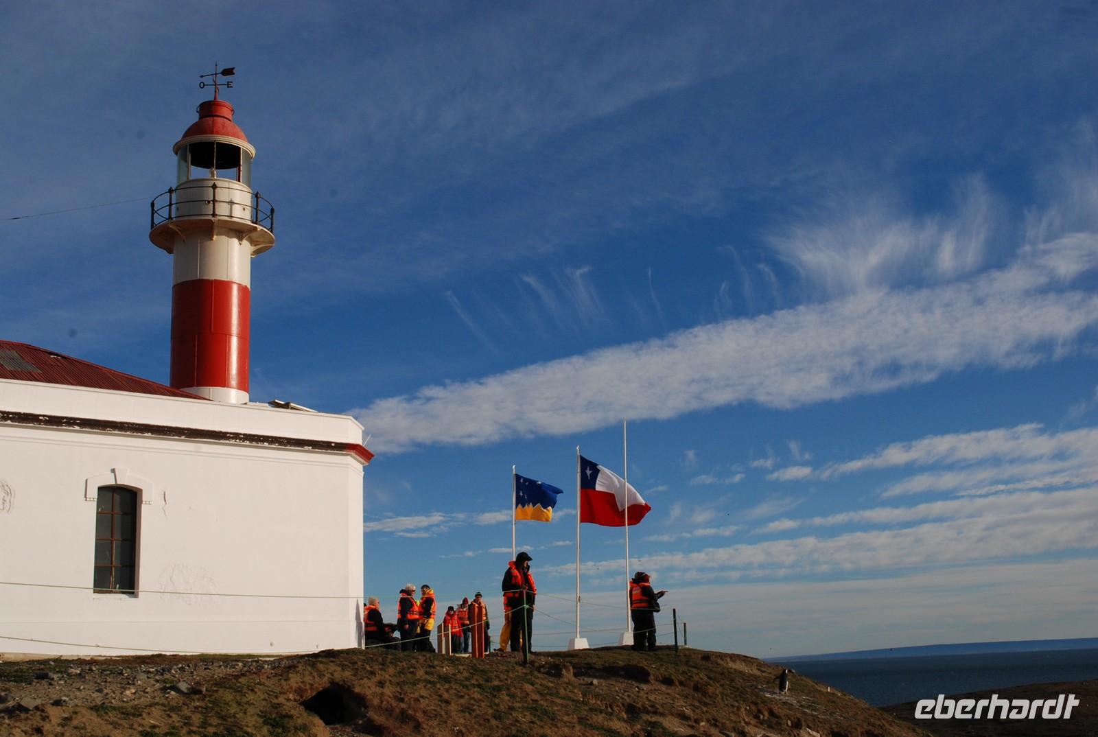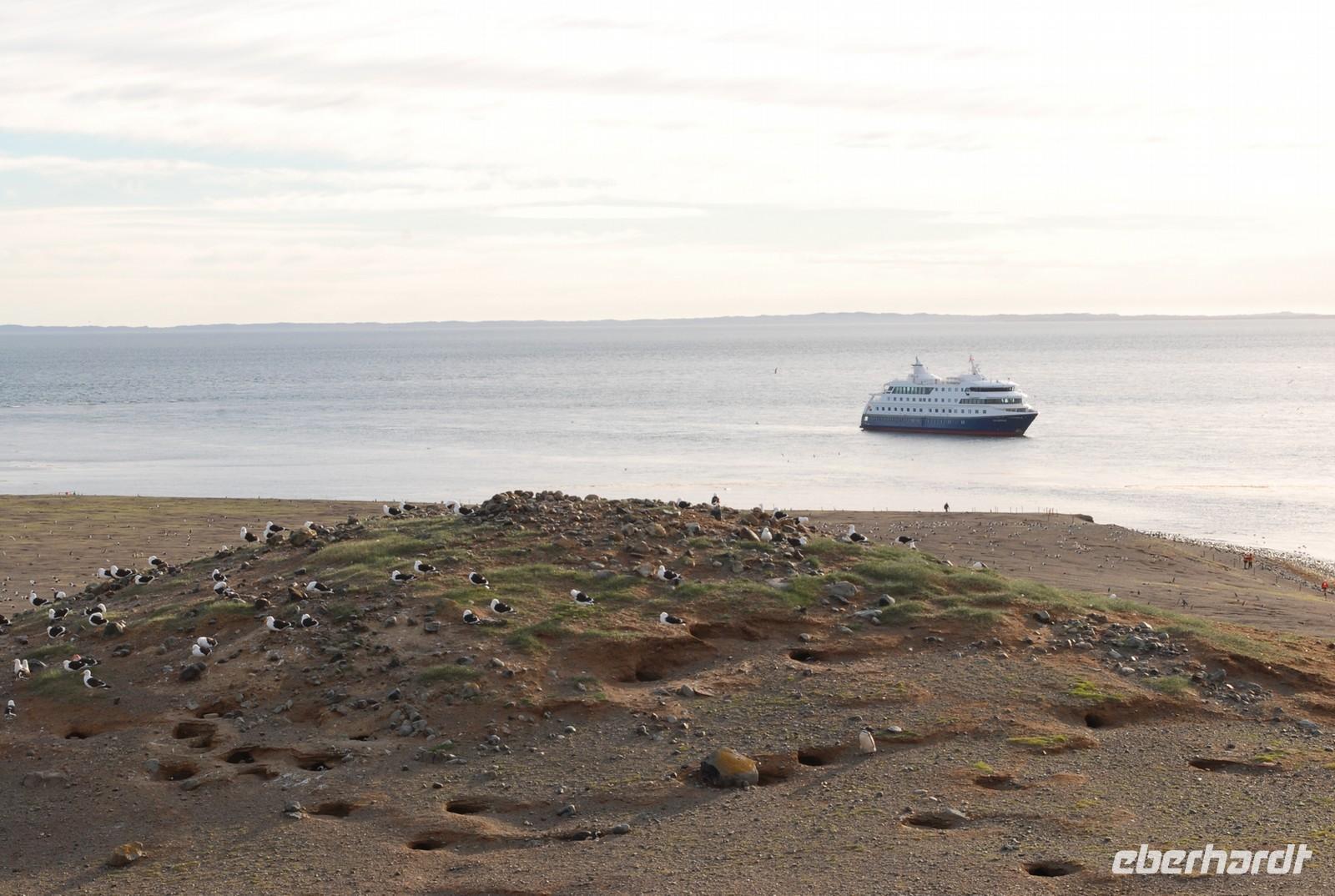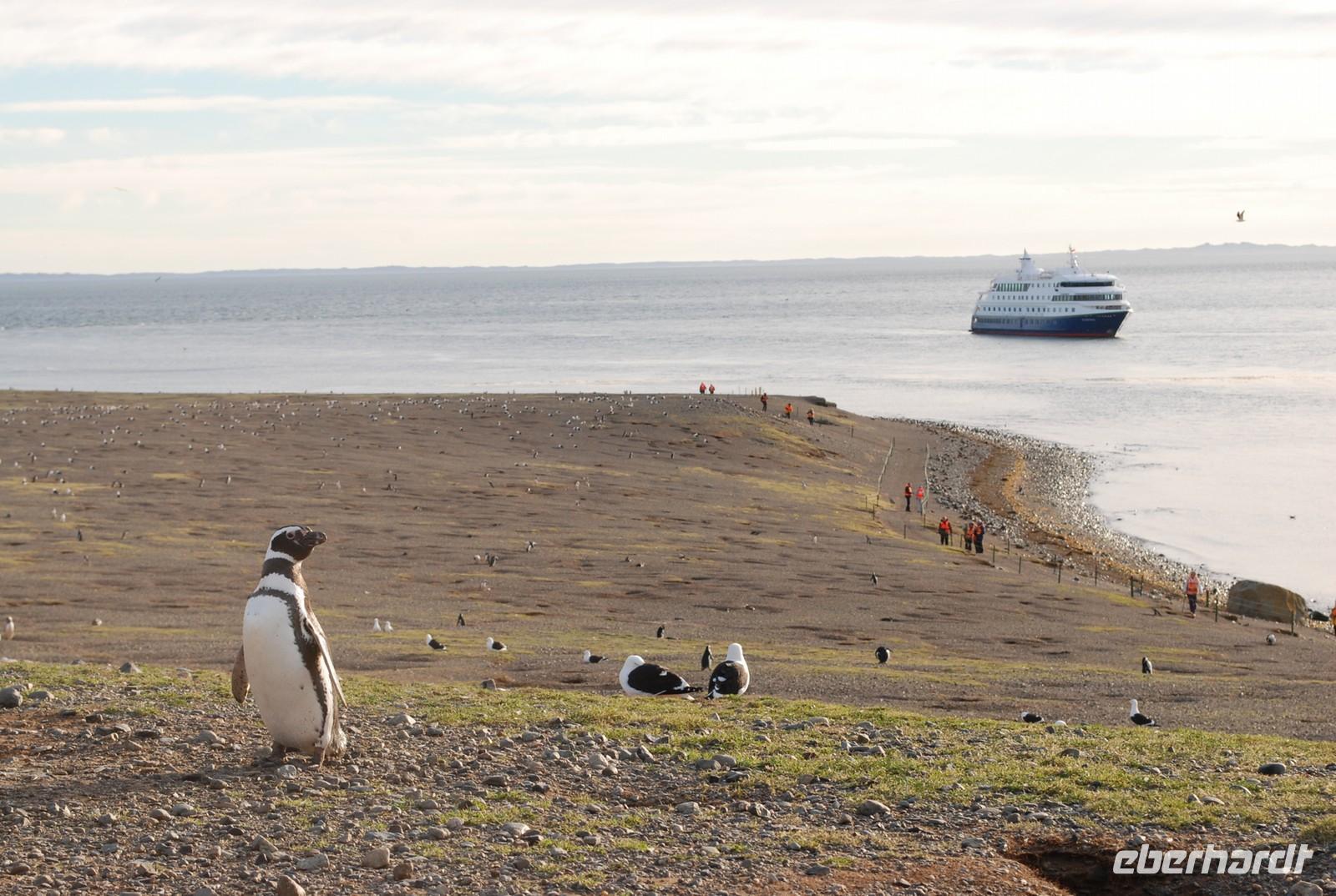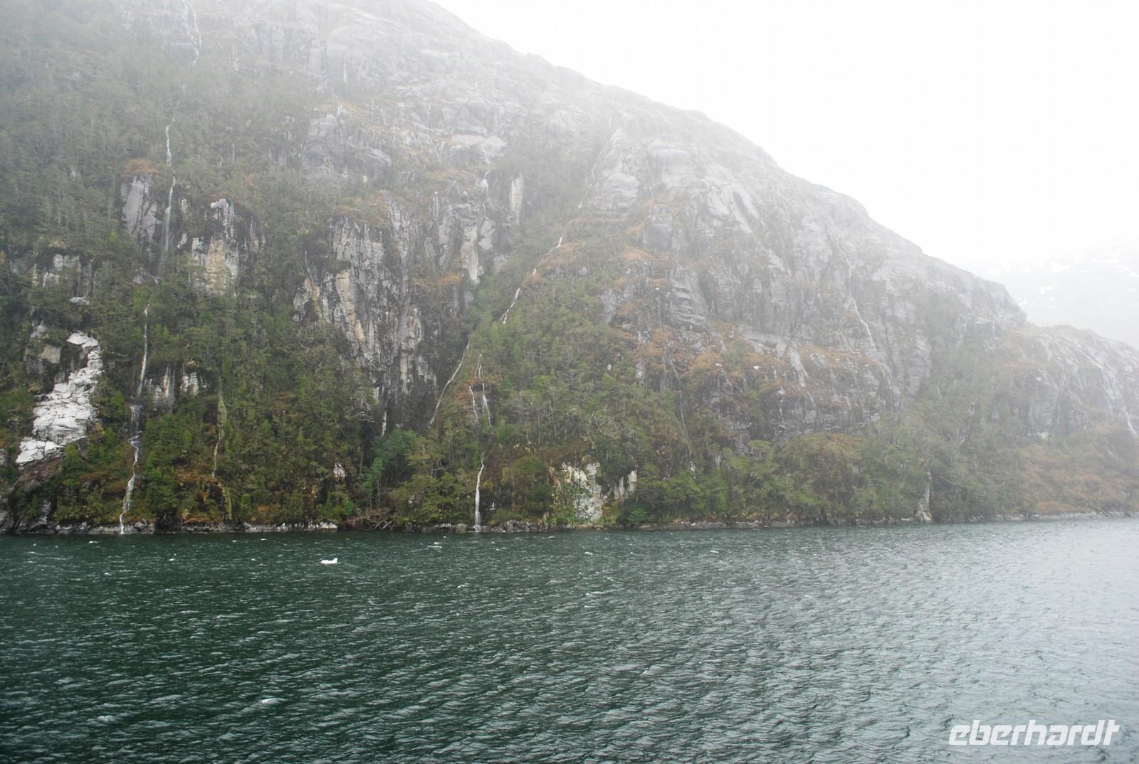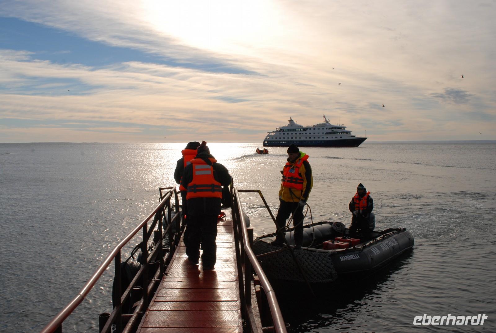 Es regnet beständig aber wir unternehmen dennoch die beeindruckende Fahrt im Zodiak in den Fjord hinein. Ganz am Ende hängt der Gletscher Piloto steil nach unten und mündet im Wasser. Wir werden Zeuge, wie plötzlich mehrere Brocken Eis zusammen wie in einem Wasserfall von oben abrutschen und nach unten donnern. Sehr spektakulär! Neben dem Gletscher nisten in den steilen Felsen Kormorane - Felsen- und Blauaugenkormorane. Unbeeindruckt von unserem Besuch behüten Sie ihre Nester. Die Bootsführer "drohen" uns eine Eis-Dusche unter dem Wasserfall an falls wir Beschwerden zur Kreuzfahrt vorbringen. An Bord haben wir kurz Zeit uns aufzuwärmen, bevor der Gletscher Günter Plüschow angekündigt wird. Das Kreuzfahrtschiff ist ans Ende des Seno Chico gefahren, wo sich der Gletscher befindet. Vom Deck bestaunen wir auch dieses blau-weiße Wunder bevor das Schiff Kurs auf die Magellan-Straße nimmt. Wir lassen den letzten Abend an Bord wieder bei einem köstlichen 4-Gänge-Menü ausklingen und werden vom Kapitän verabschiedet.
