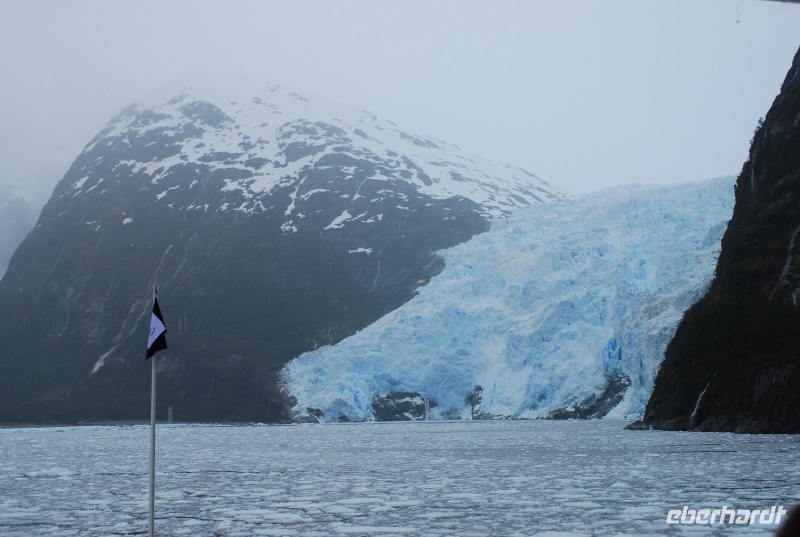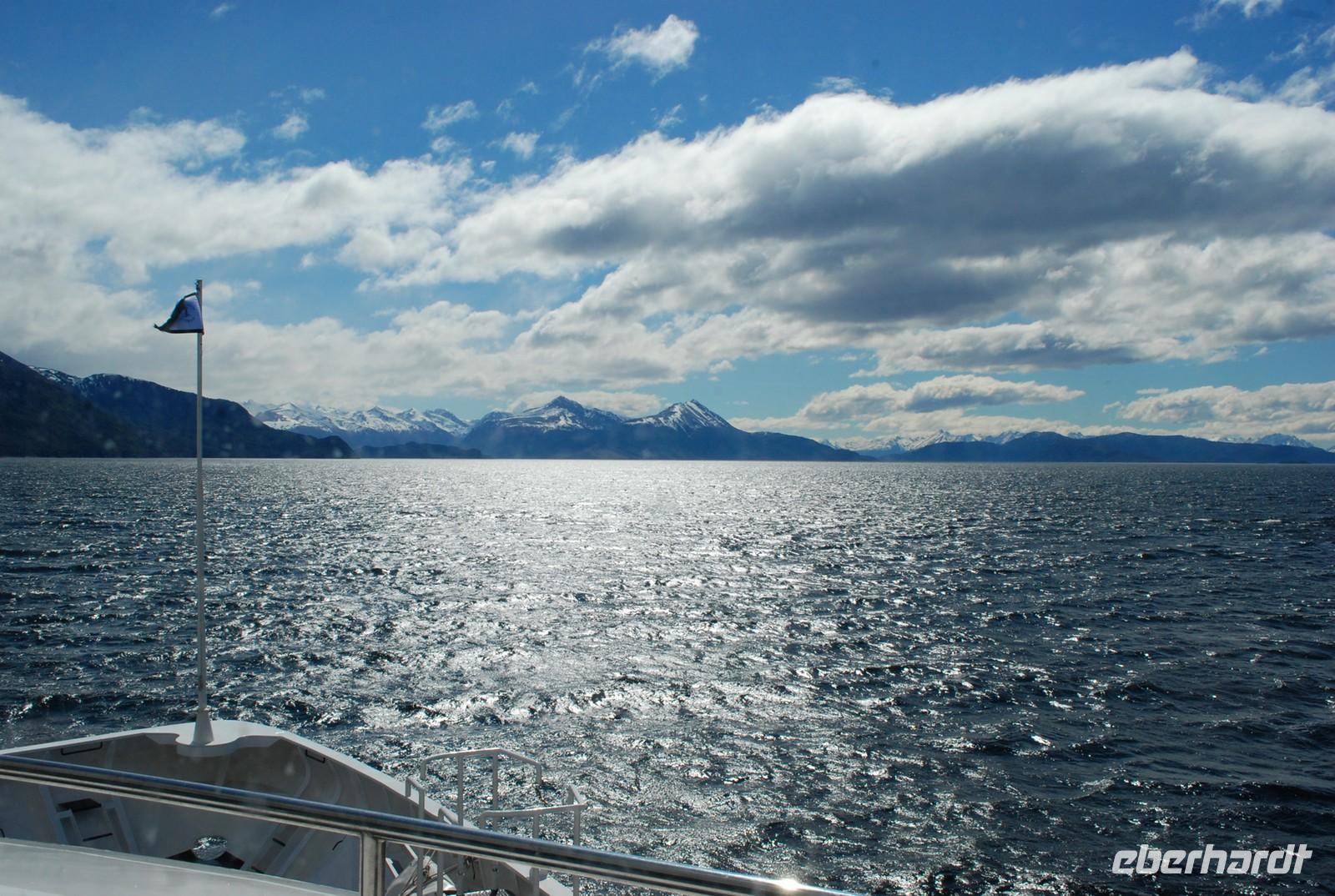 Der Tag beginnt heute mit einem ausgedehnten Frühstück. Langsam verlassen wir den Beagle-Kanal und nähern uns dem Pazifik. Der Wind und auch die Wellen nehmen nun zu und spielen mit dem Schiff ausgelassen für fast eine Stunde. Wir versuchen an Deck dem Wind Stand zu halten und einige Gäste besuchen den Seemannsknoten- und Wein-Lehrgang. Am Nachmittag können wir den Maschinenraum besichtigen und dann heißt es warm anziehen für die Zodiak-Fahrt zum Gletscher Piloto und Nena im Alacalufe-Fjord.
