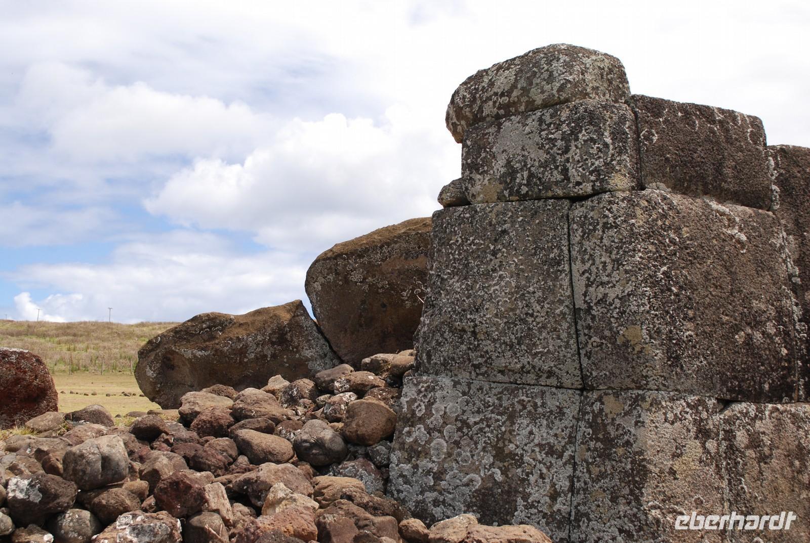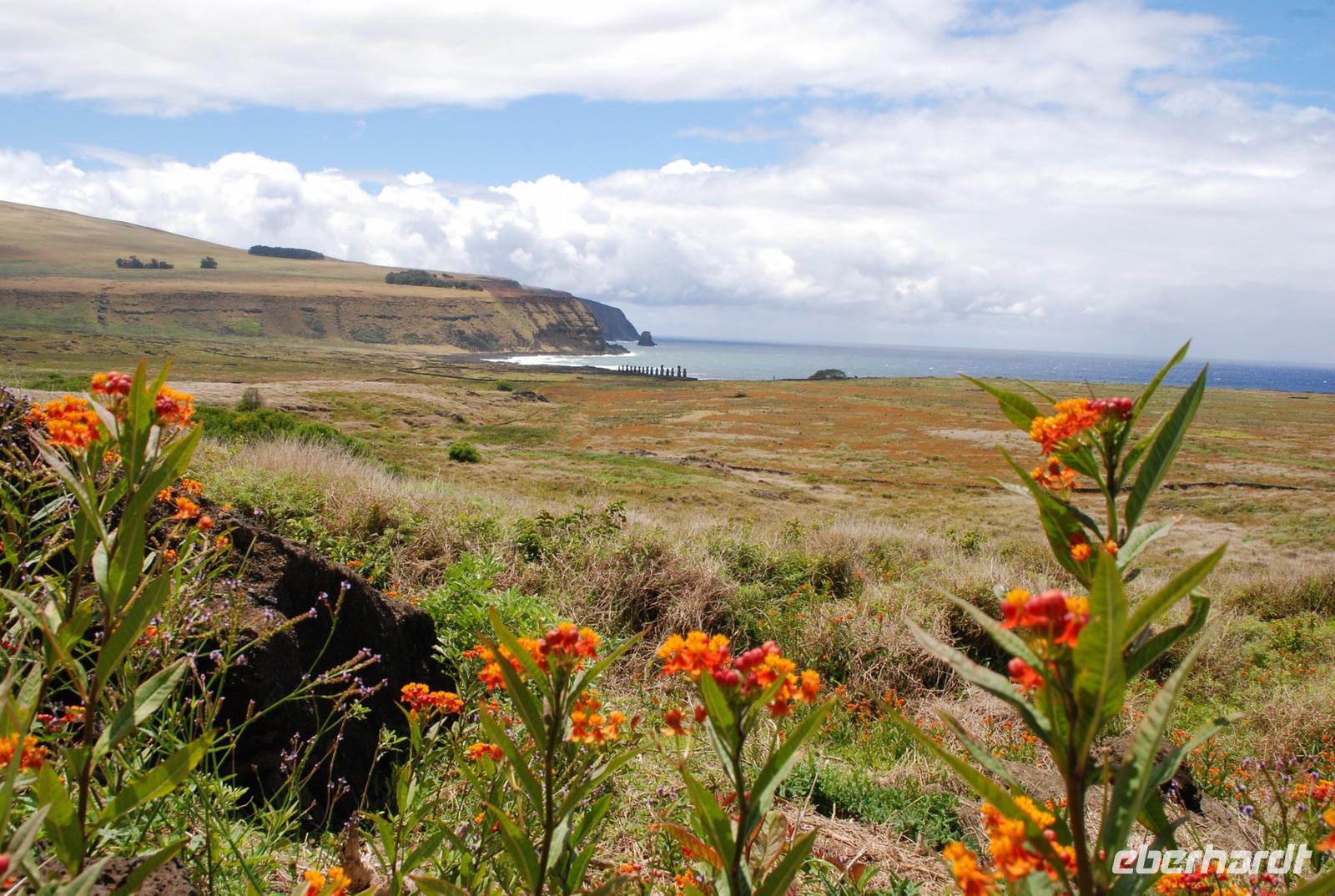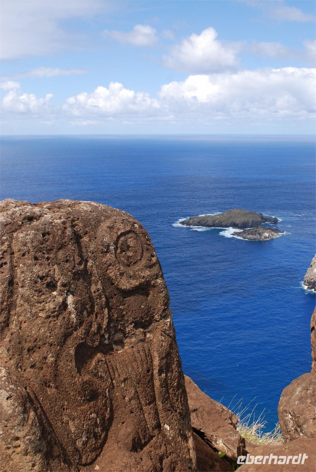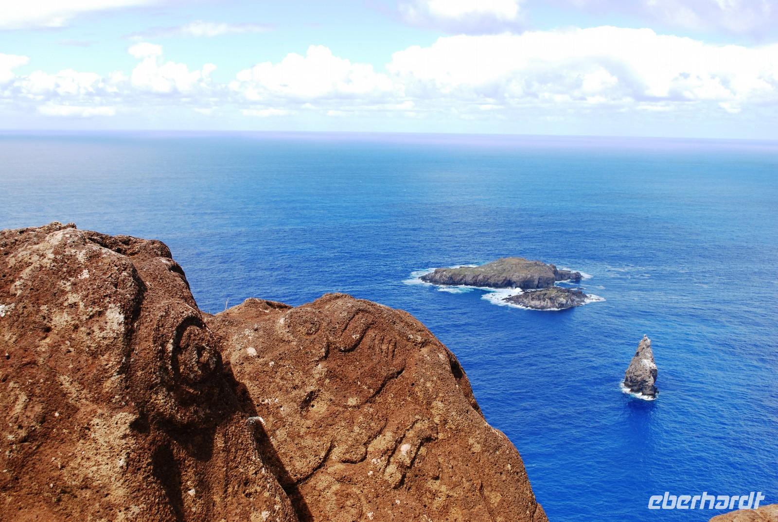 Zur Abwechslung scheint heute die Sonne zum Frühstück für unseren Ausflug zum Südteil der Insel. Zuerst besuchen wir die Höhle Ana Kai Tangata mit Felsmalereien, die direkt in der vulkanischen Steilküste liegt. Wir fahren nun zum Krater Rano Kau. Vom Kraterrand haben wir bei sonnigem Wetter einen fantastischen Blick in den Krater hinein wo sich wieder ein Süßwassersee befindet. Von der Zeremonialstätte Orongo sieht man die drei vorgelagerten Inselchen und Claudia erklärt uns den Kult des Vogelmannes. Hier sieht man die Behausungen, die nur temporär genutzt wurden und gut erhaltene Petroglyphen. Zum Abschluss des Tages besuchen wir Ahu Vinapu, dessen Bauweise stark an die Inkamauern in Cusco erinnert. Am Abend besuchen wir als Überraschung eine polynesische Tanzshow. Wir haben Plätze in der ersten Reihe und können so das Spektakel hautnah mitverfolgen.
