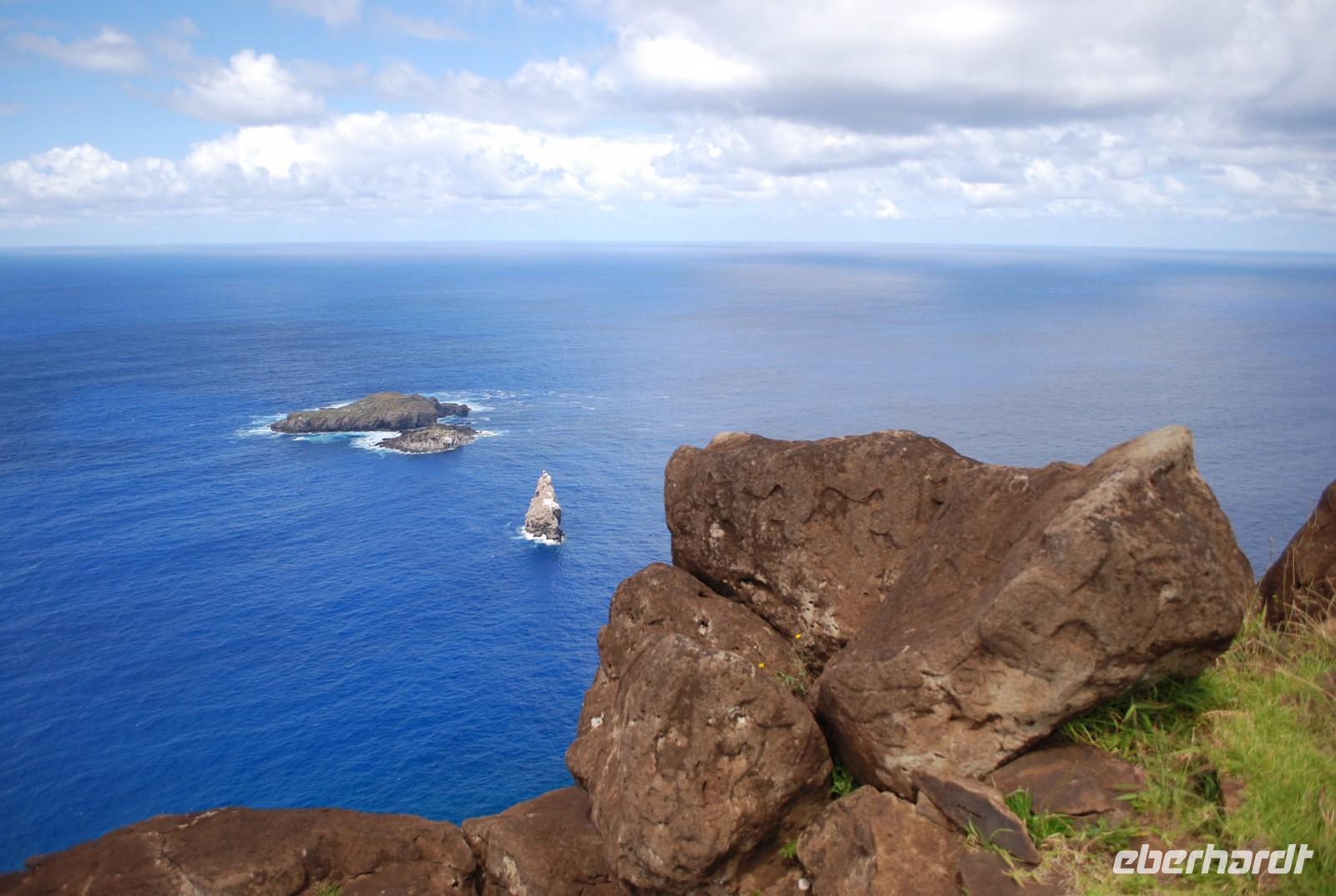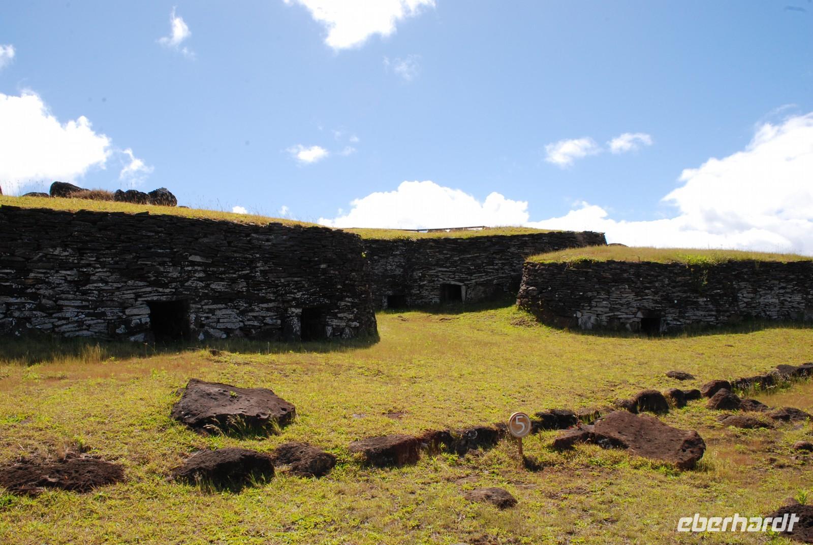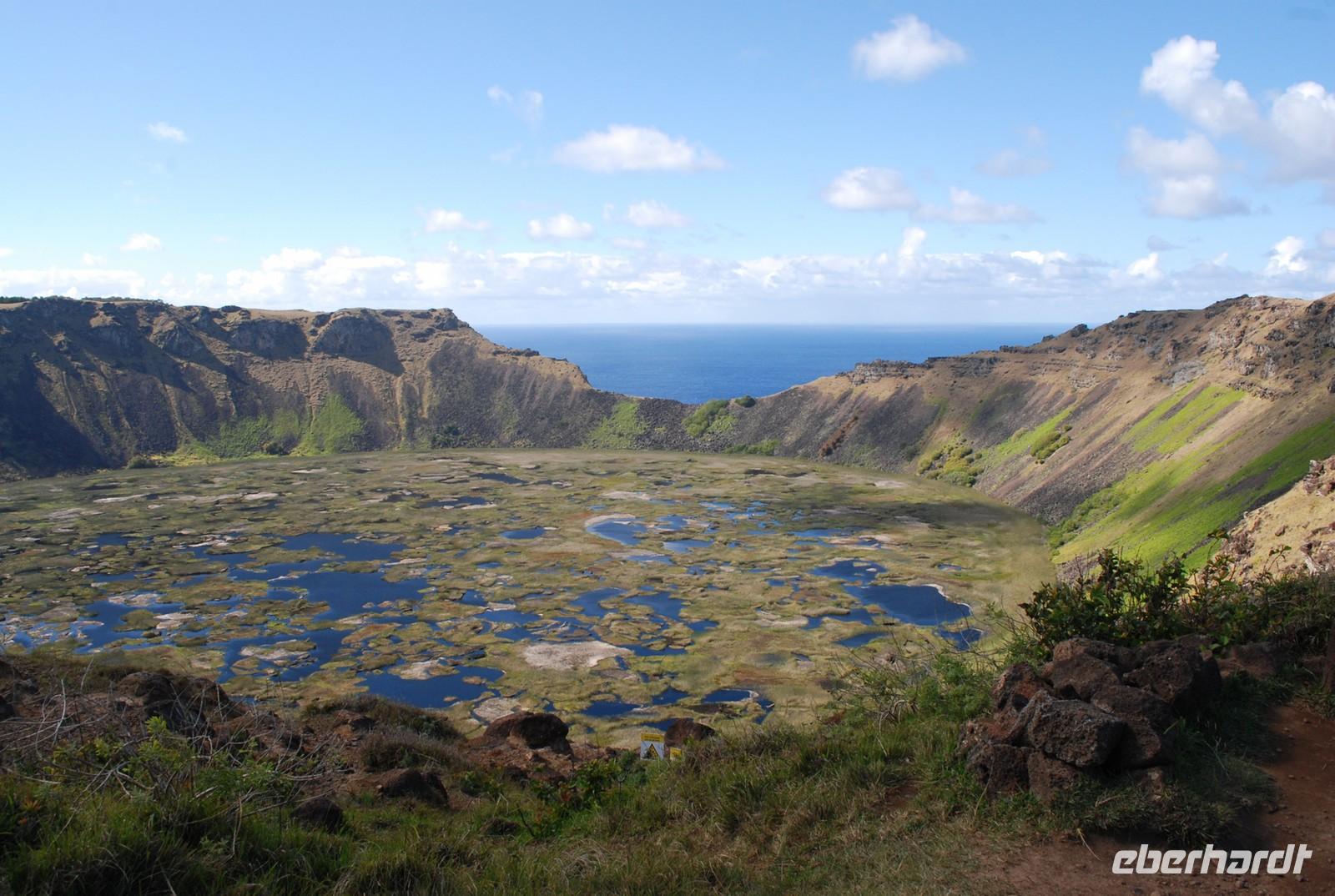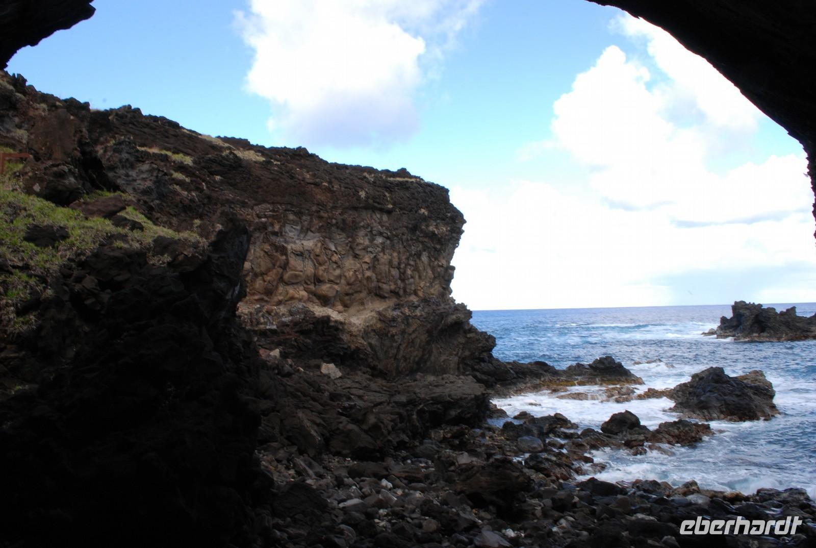 Zur Abwechslung scheint heute die Sonne zum Frühstück für unseren Ausflug zum Südteil der Insel. Zuerst besuchen wir die Höhle Ana Kai Tangata mit Felsmalereien, die direkt in der vulkanischen Steilküste liegt. Wir fahren nun zum Krater Rano Kau. Vom Kraterrand haben wir bei sonnigem Wetter einen fantastischen Blick in den Krater hinein wo sich wieder ein Süßwassersee befindet. Von der Zeremonialstätte Orongo sieht man die drei vorgelagerten Inselchen und Claudia erklärt uns den Kult des Vogelmannes. Hier sieht man die Behausungen, die nur temporär genutzt wurden und gut erhaltene Petroglyphen. Zum Abschluss des Tages besuchen wir Ahu Vinapu, dessen Bauweise stark an die Inkamauern in Cusco erinnert. Am Abend besuchen wir als Überraschung eine polynesische Tanzshow. Wir haben Plätze in der ersten Reihe und können so das Spektakel hautnah mitverfolgen.