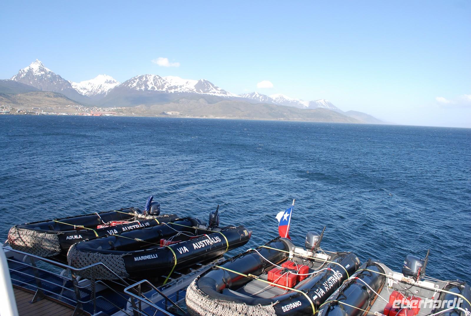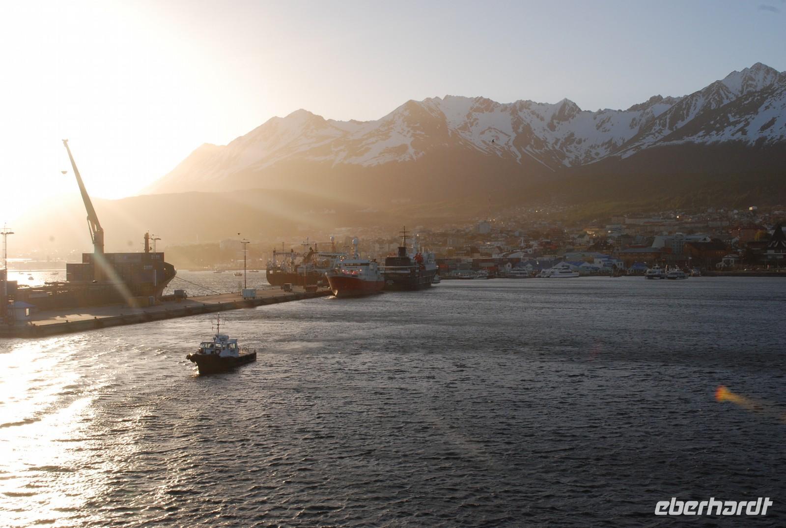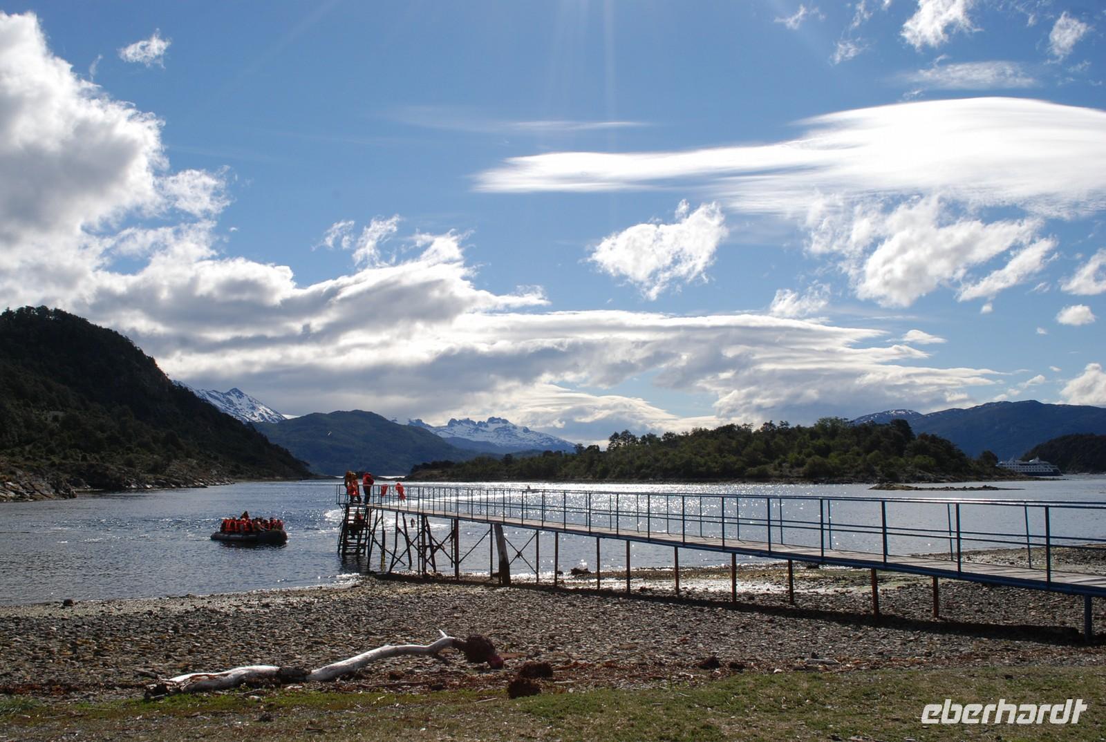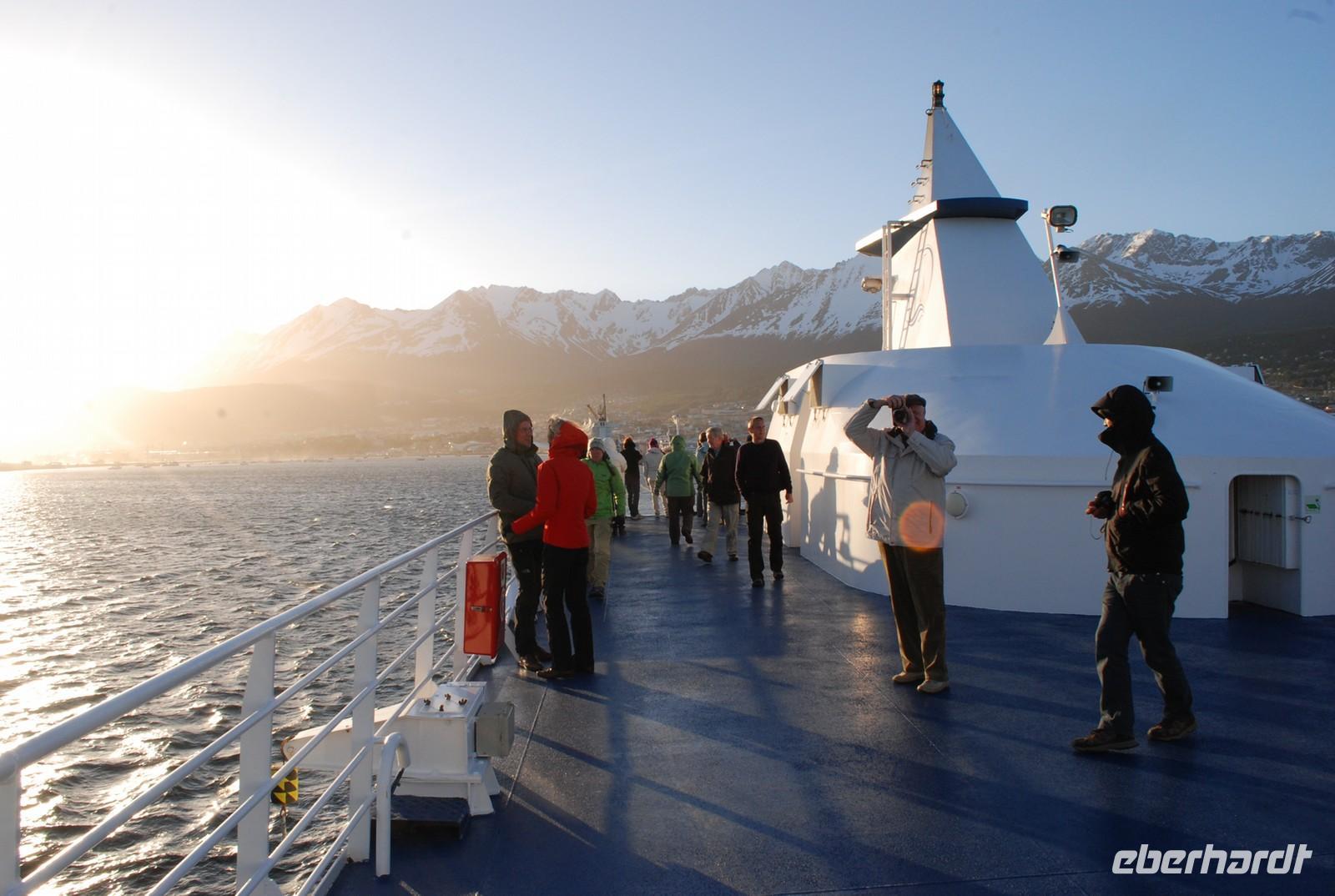 Am Nachmittag treffen wir uns frohen Mutes für den Ausflug in die Wulaia-Bucht. Wir haben die Möglichkeit, eine Küsten- oder eine Bergwanderung zu unternehmen. Nach dem Spaziergang mit deutschen Erklärungen von den Reiseleitern Yazon oder Diane wärmen wir uns bei einer heißen Schokolade und oder einem Whisky. Das Schiff steuert nun durch den Beagle-Kanal und wir können einen Blick auf einen Gletscher bei Nacht werfen.